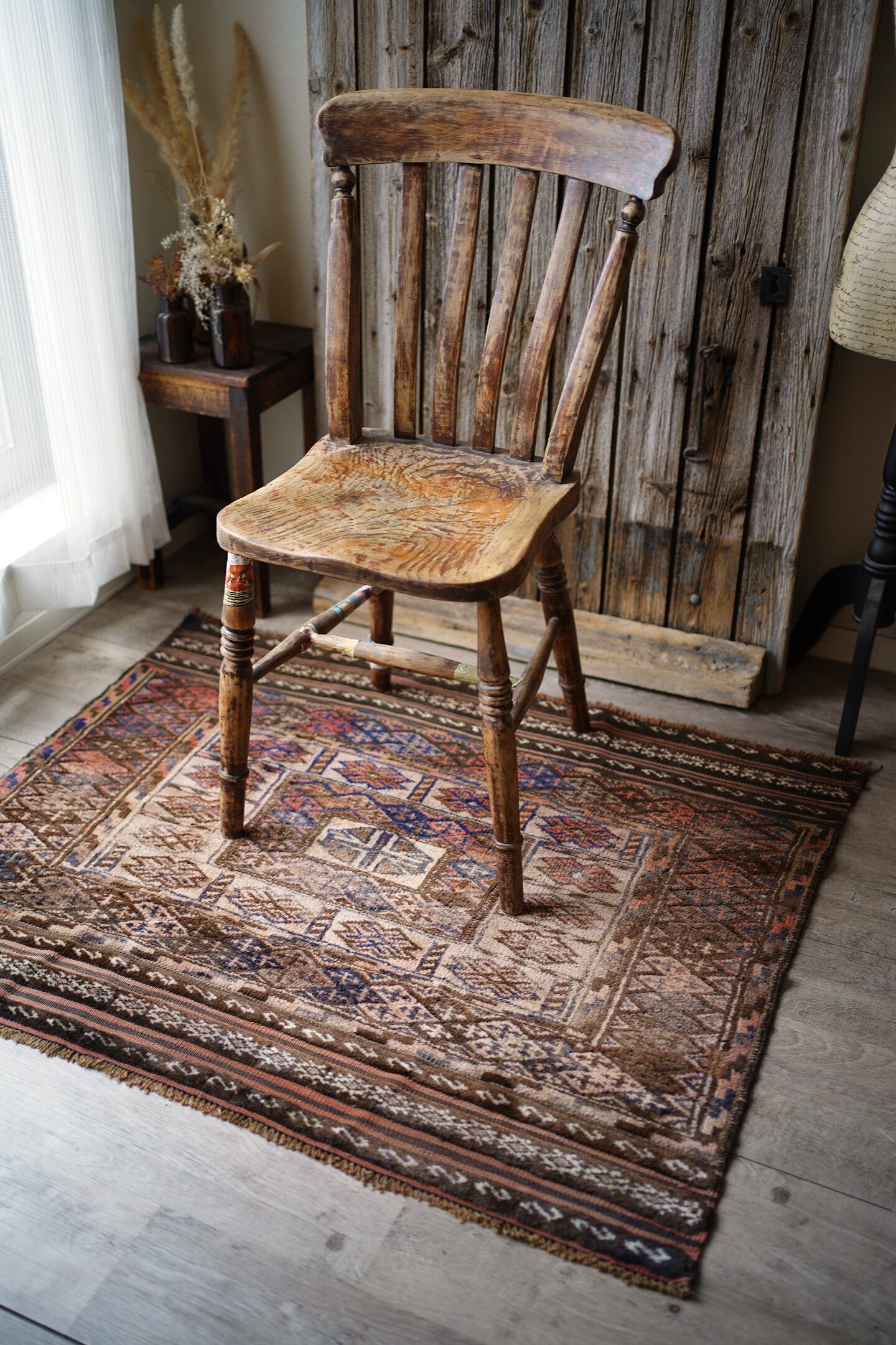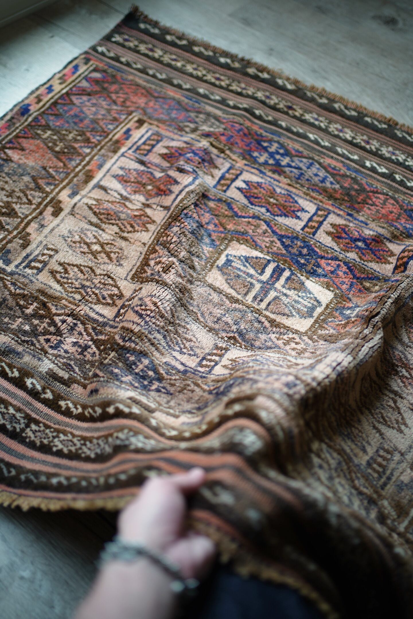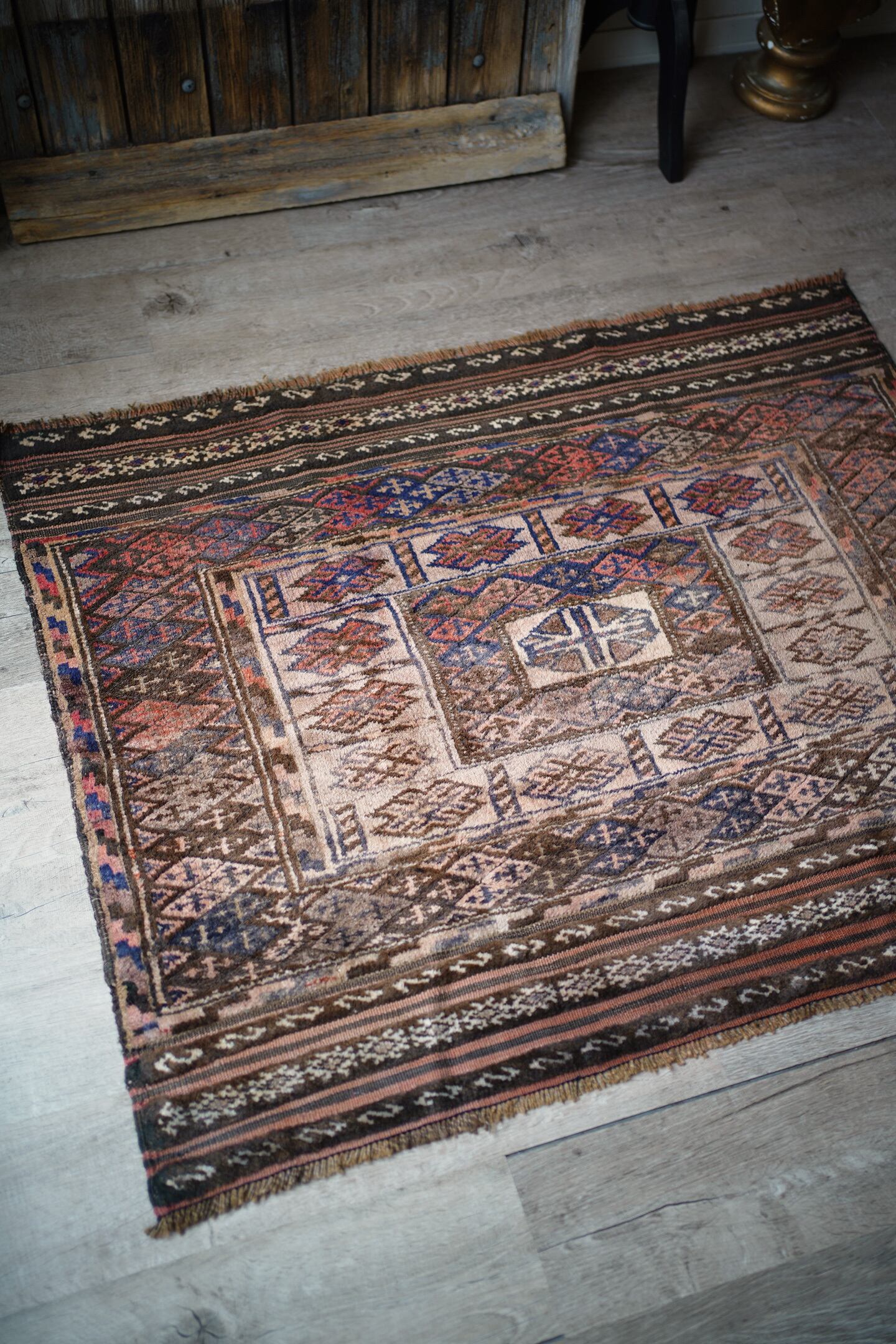 不思議な色合いが魅力の経年約45年のバルーチラグ。退色したブラウンと焦茶色の渋いカラーをベースに、濃紺・薄い赤がグラデーションのように織り込まれています。敷かれる向きによって色味の見え方がやや変わります。ソフトウールで、フワフワとした大変気持ちの良い肌触り。6mm〜8mm程度の厚みです。フリンジ近辺はキリムとパイルの凹凸の差がありますが、それ以外は全体的に平面な質感となっています。目立った補修跡もなく、状態も良好です。スクエアに近いサイズ感で、小さいデスク下に敷いたり、寒い時期は暖房器具と合わせたりしても良さそうです。