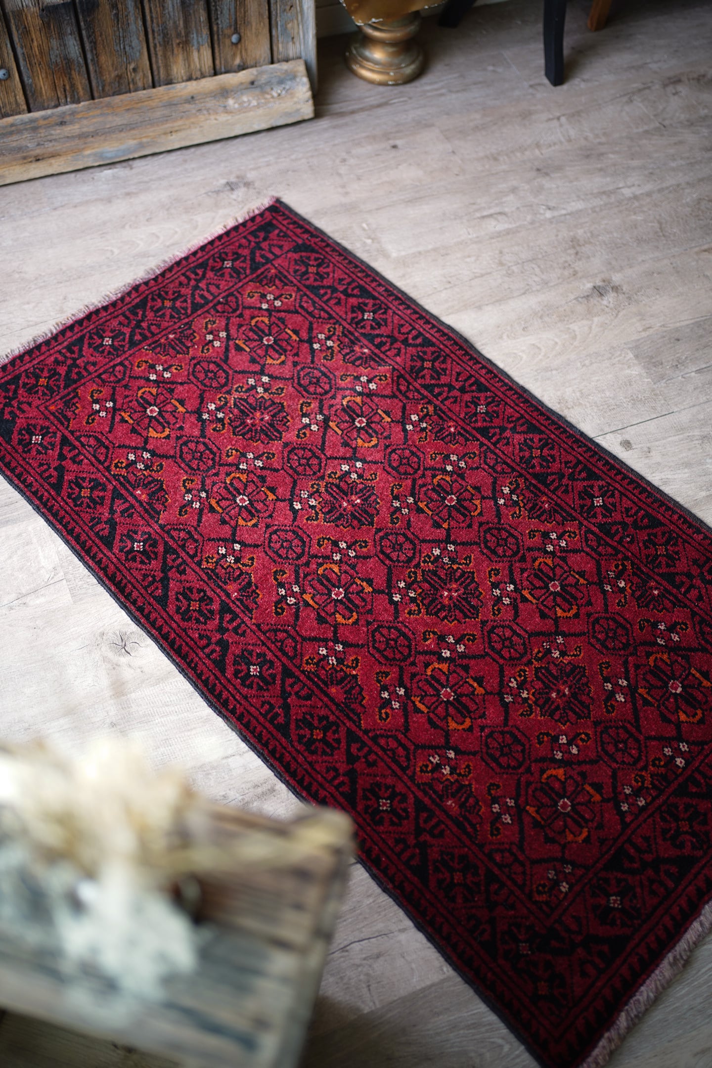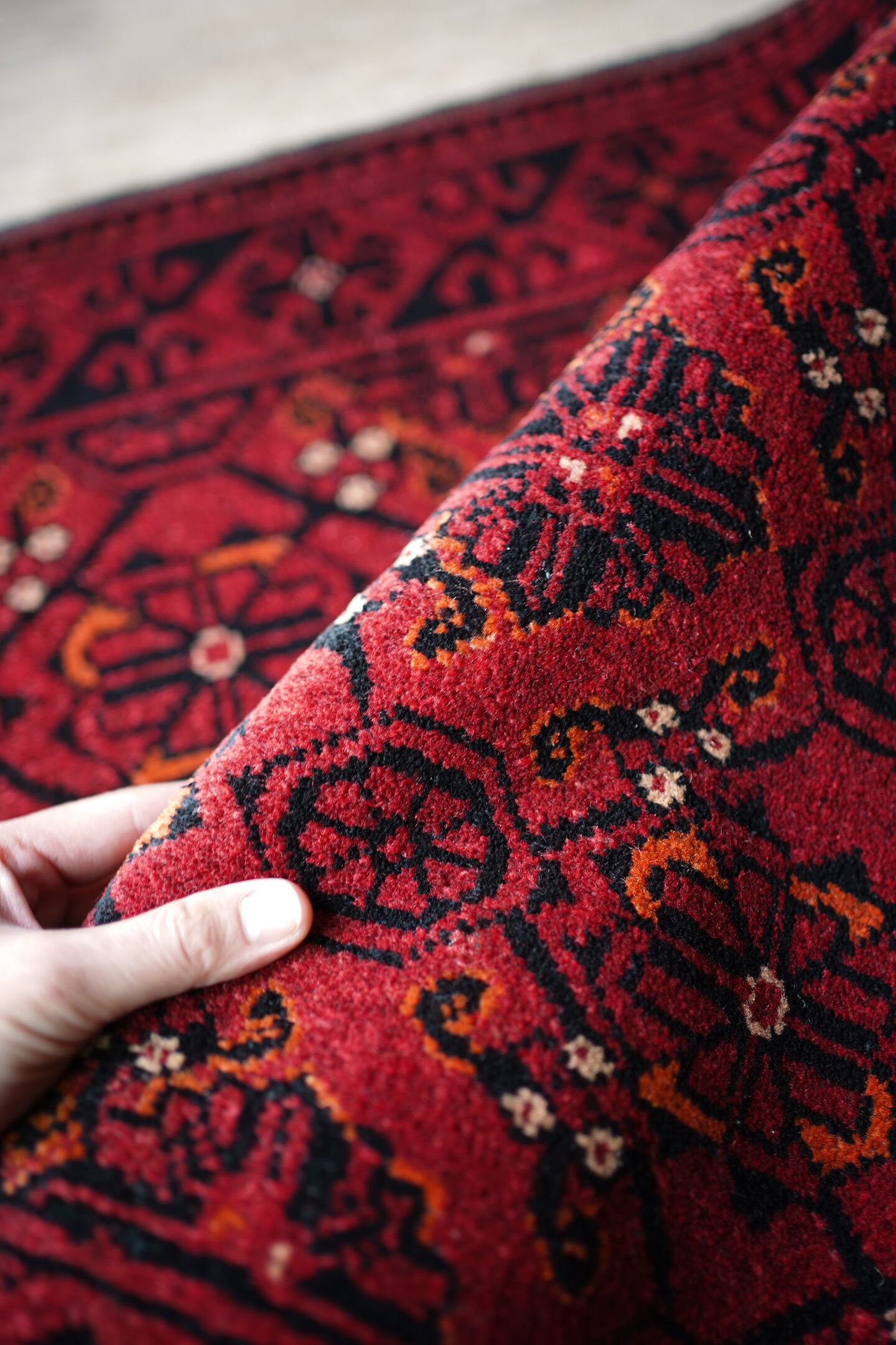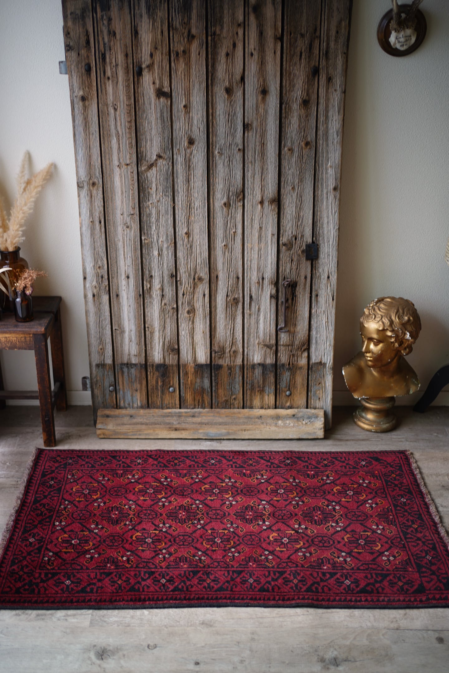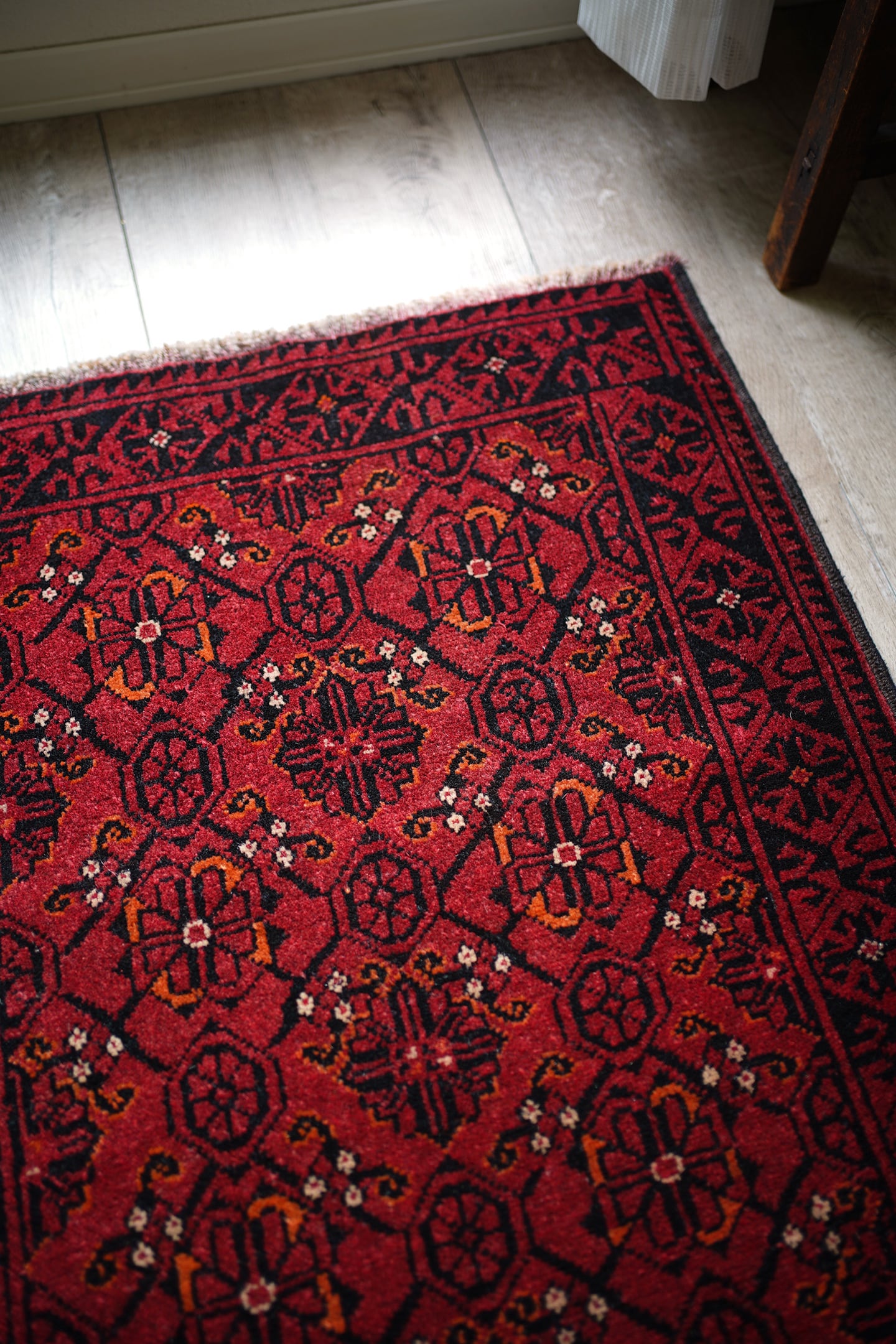 約40年前にトルクメン系の部族によってアフガニスタンで織られた"ベシール"と呼ばれるラグです。落ち着きのある深い赤がとても素敵な色合いで、アルマギュルというリンゴの花柄紋様が織り込まれています。ふわサラッと優しい肌触りで、厚みは7mmほど。重みのある耐久性を感じる作りをしています。コンディションは言うことなしのパーフェクト。状態が非常に良く、大変オススメの一枚です。