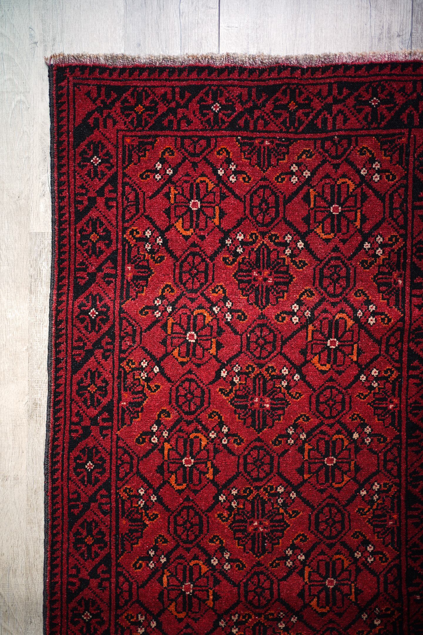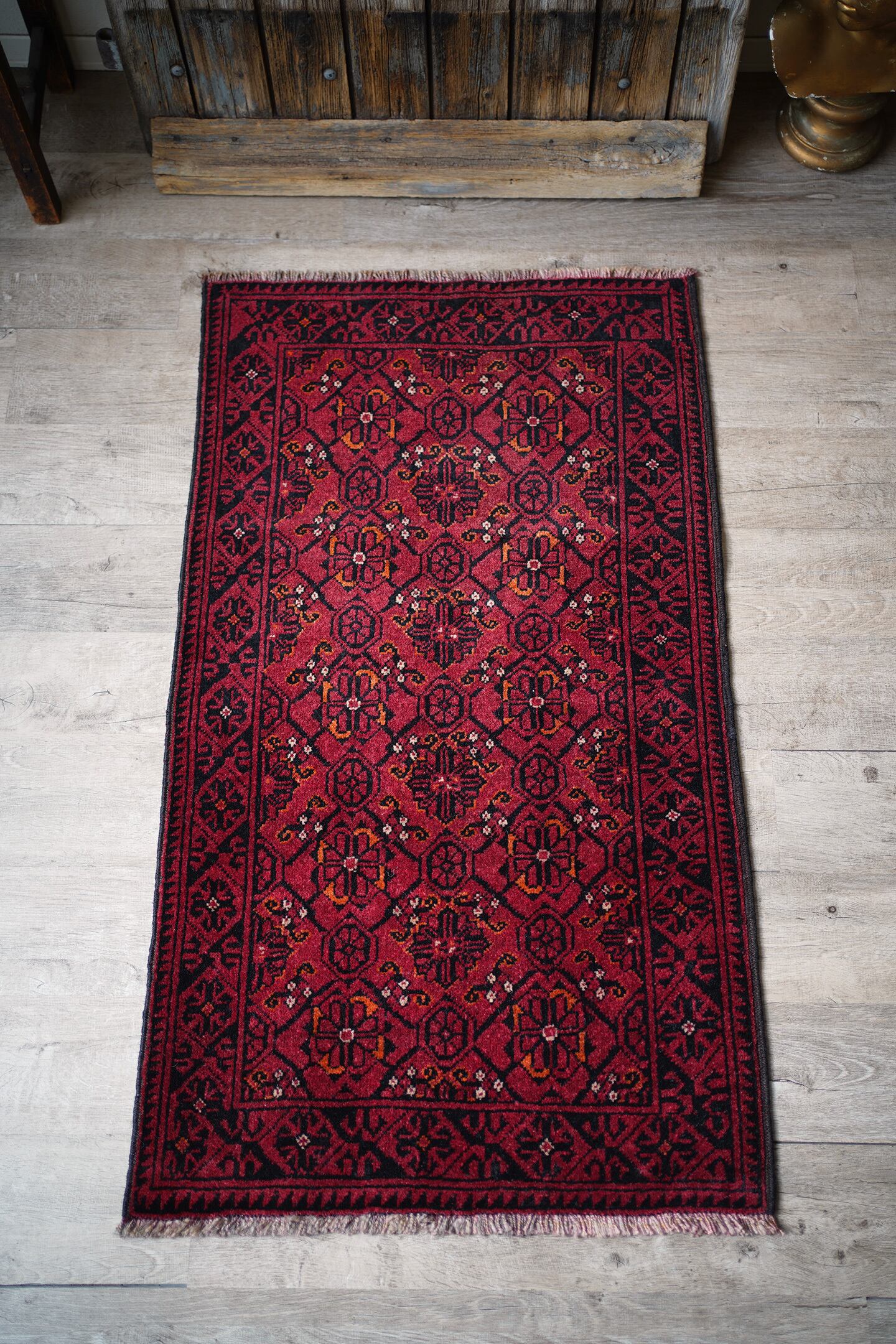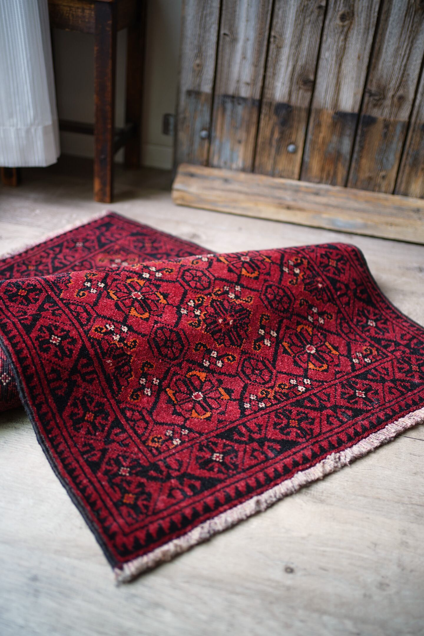 約40年前にトルクメン系の部族によってアフガニスタンで織られた"ベシール"と呼ばれるラグです。落ち着きのある深い赤がとても素敵な色合いで、アルマギュルというリンゴの花柄紋様が織り込まれています。ふわサラッと優しい肌触りで、厚みは7mmほど。重みのある耐久性を感じる作りをしています。コンディションは言うことなしのパーフェクト。状態が非常に良く、大変オススメの一枚です。