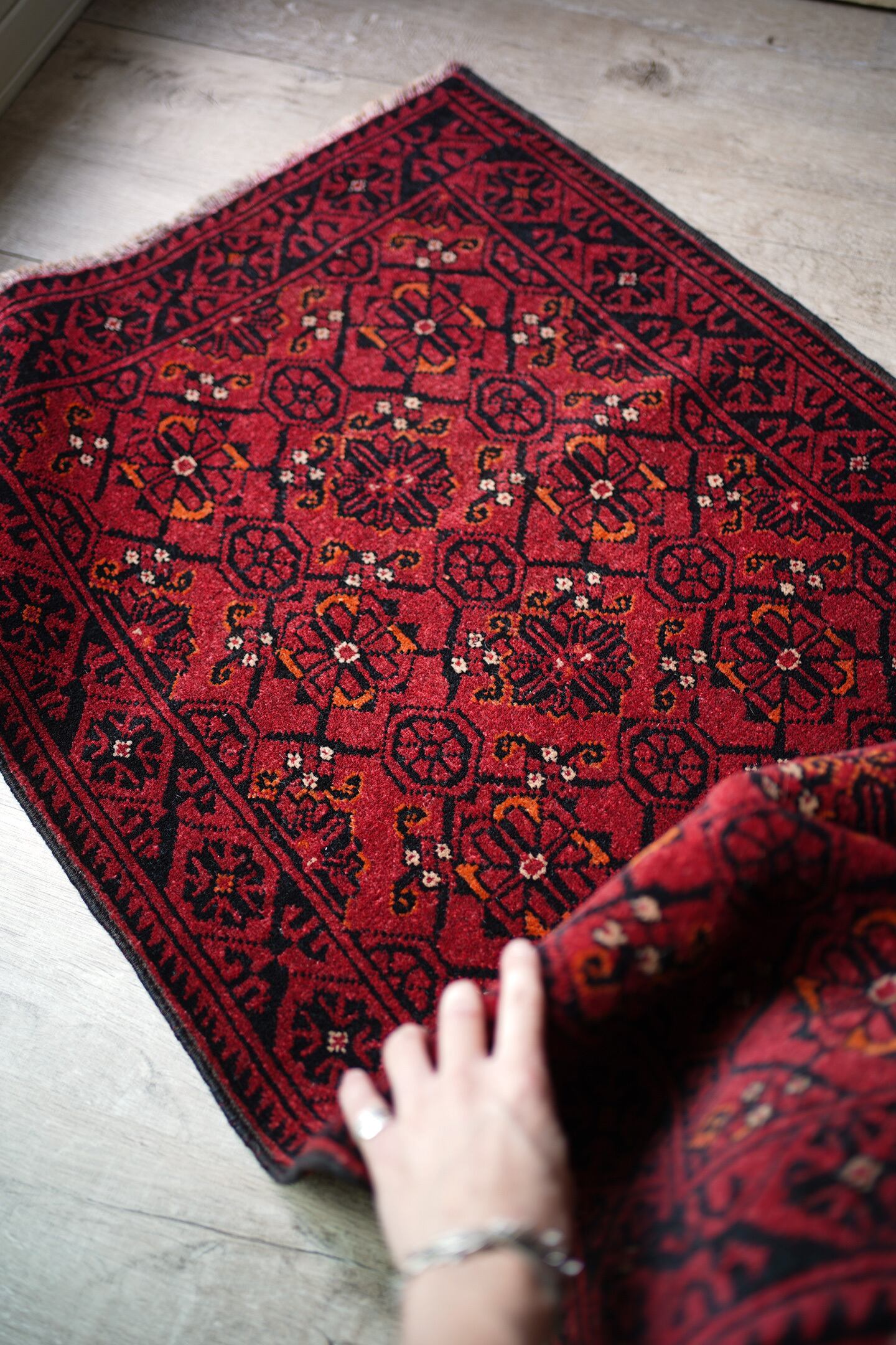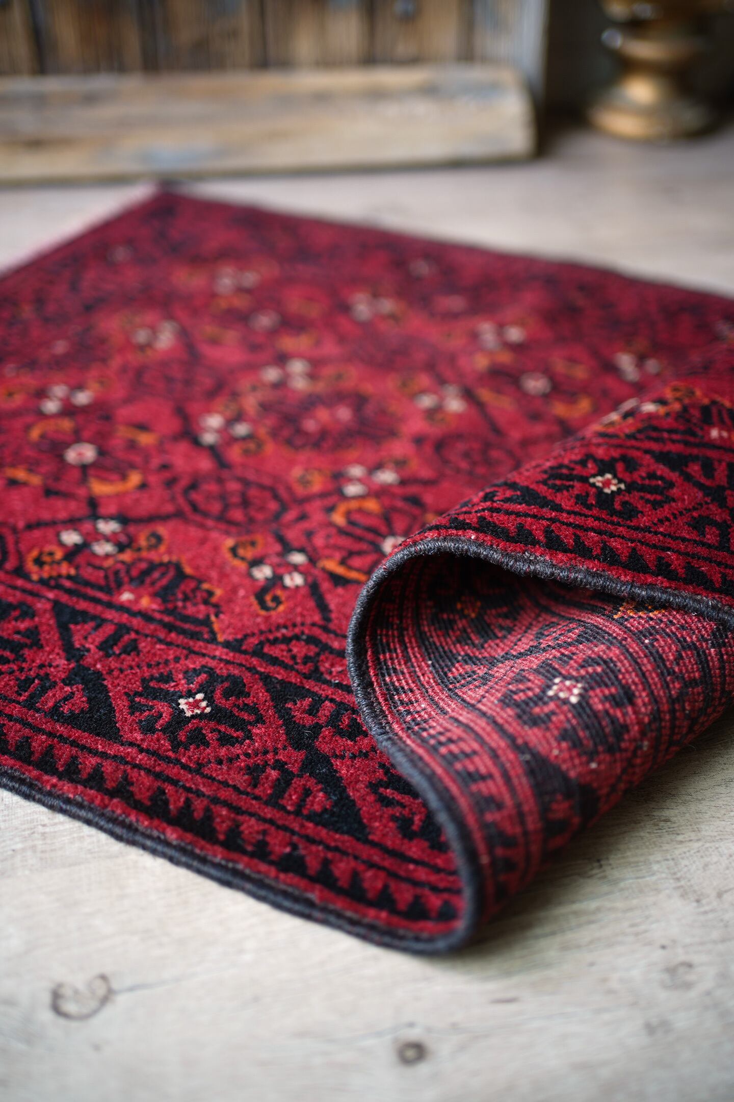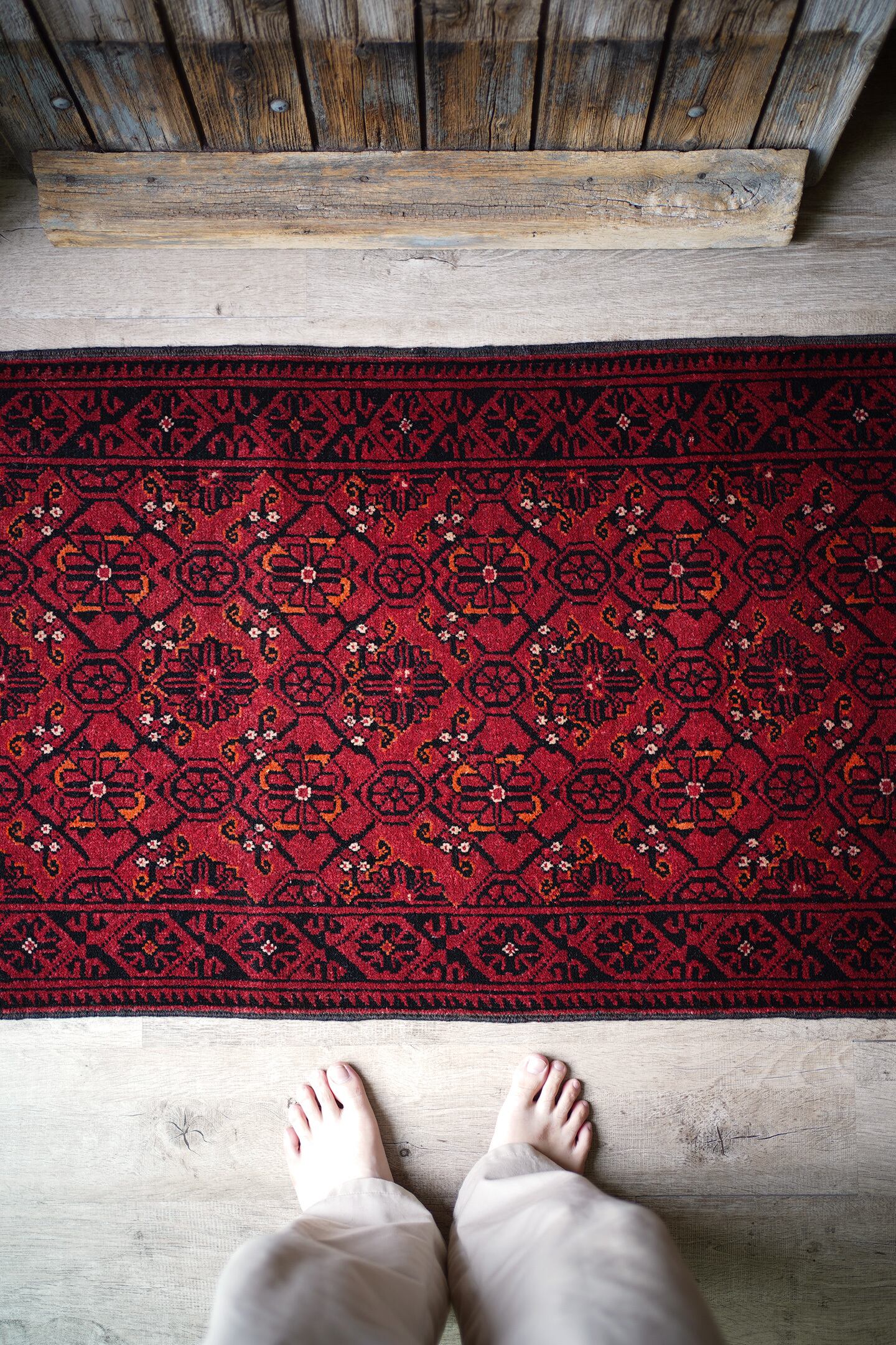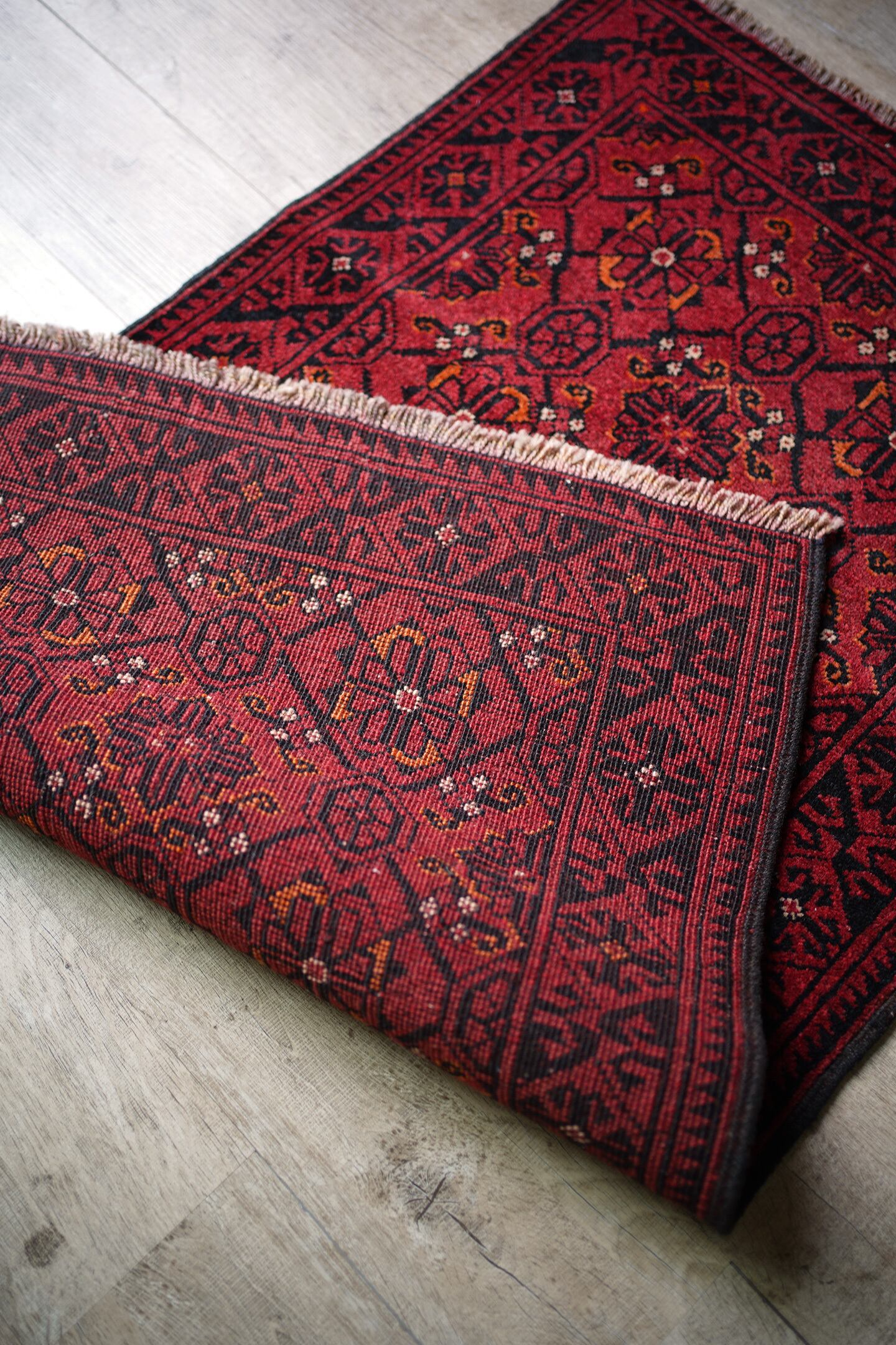 約40年前にトルクメン系の部族によってアフガニスタンで織られた"ベシール"と呼ばれるラグです。落ち着きのある深い赤がとても素敵な色合いで、アルマギュルというリンゴの花柄紋様が織り込まれています。ふわサラッと優しい肌触りで、厚みは7mmほど。重みのある耐久性を感じる作りをしています。コンディションは言うことなしのパーフェクト。状態が非常に良く、大変オススメの一枚です。
