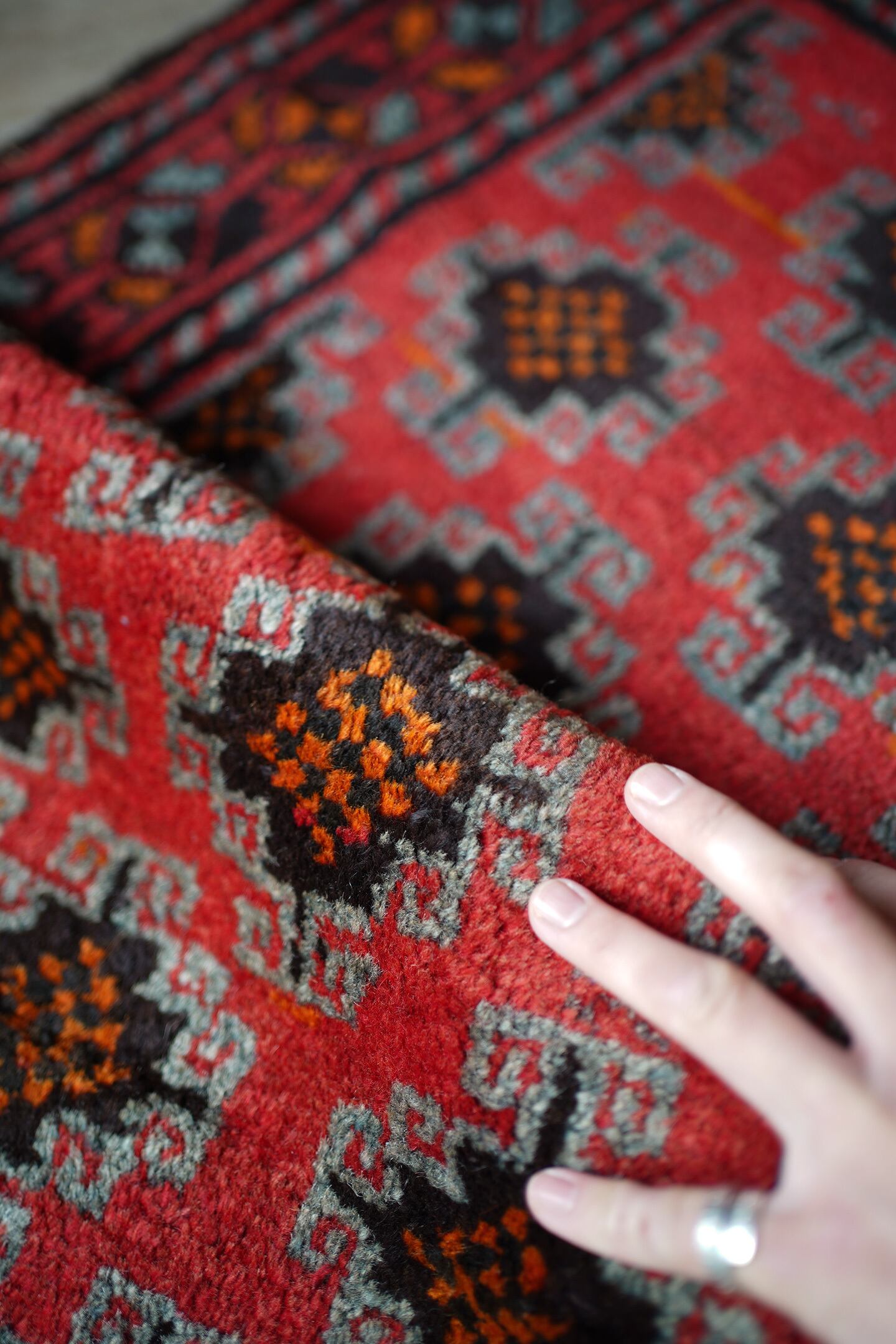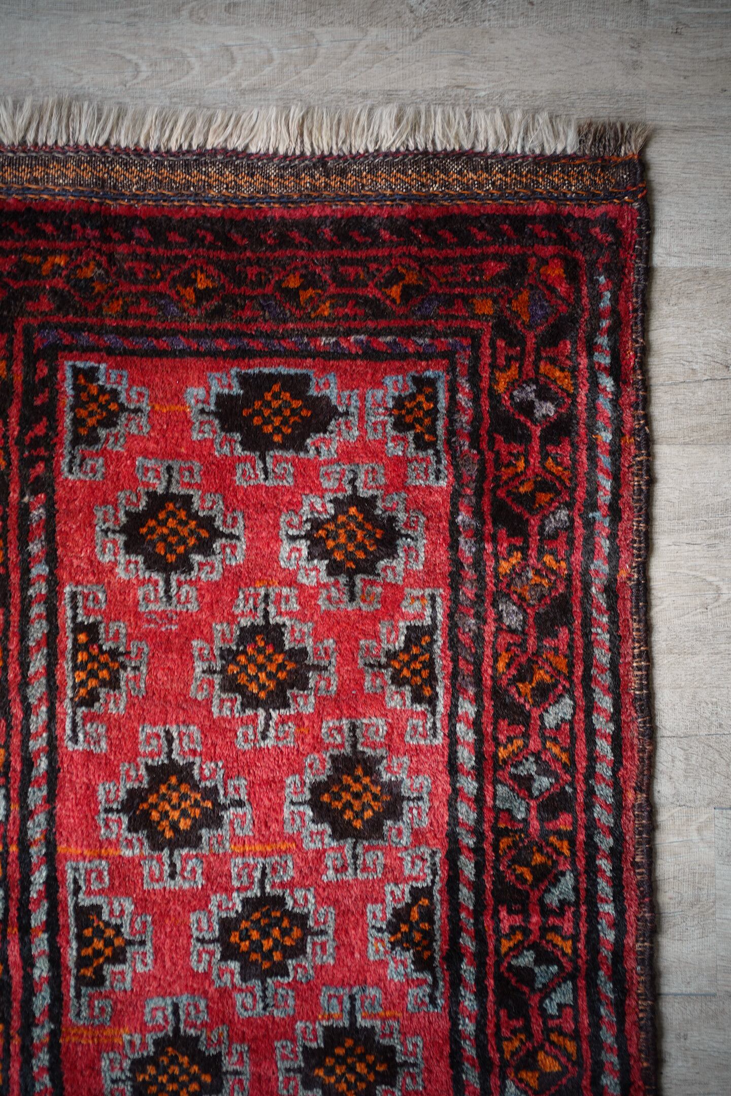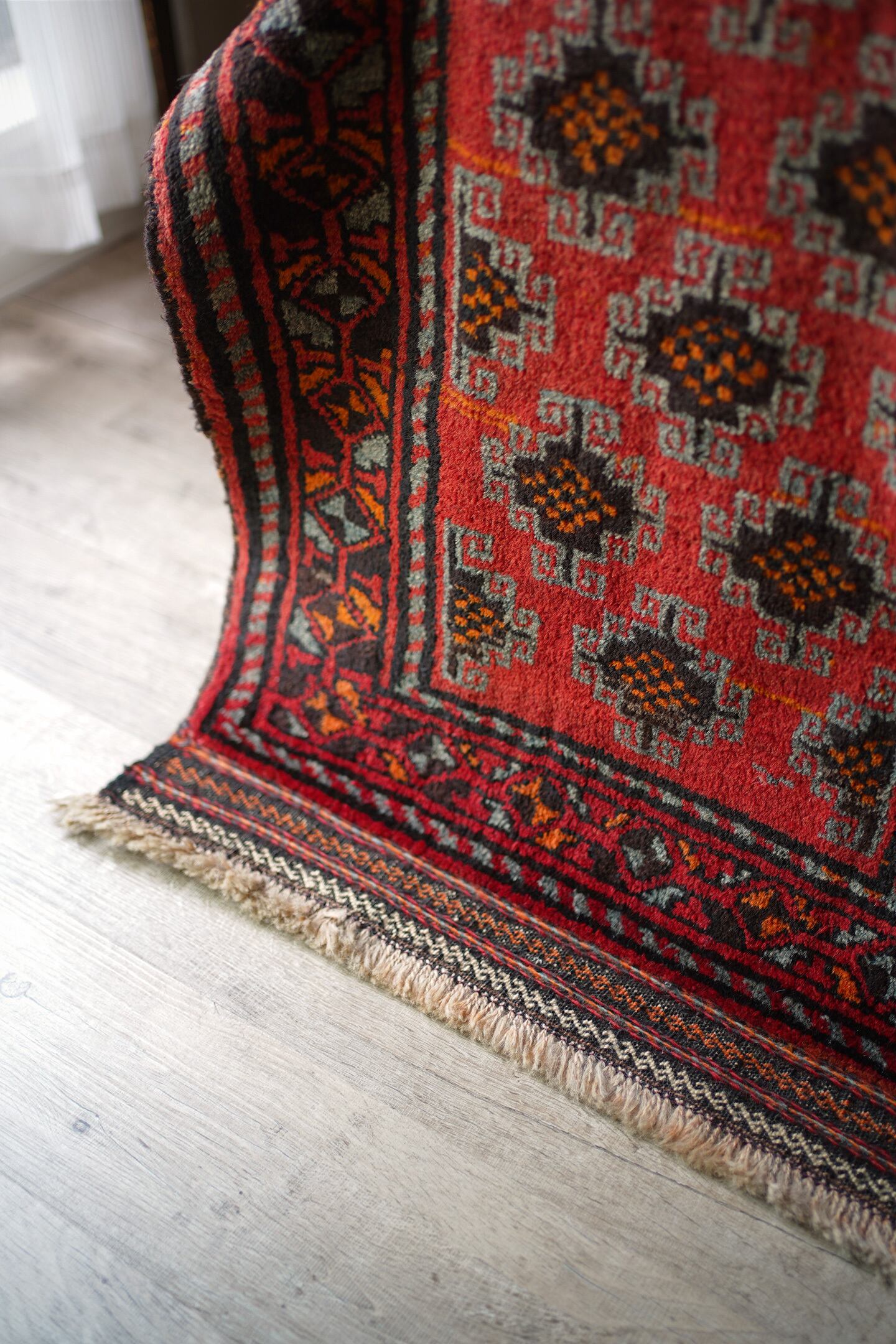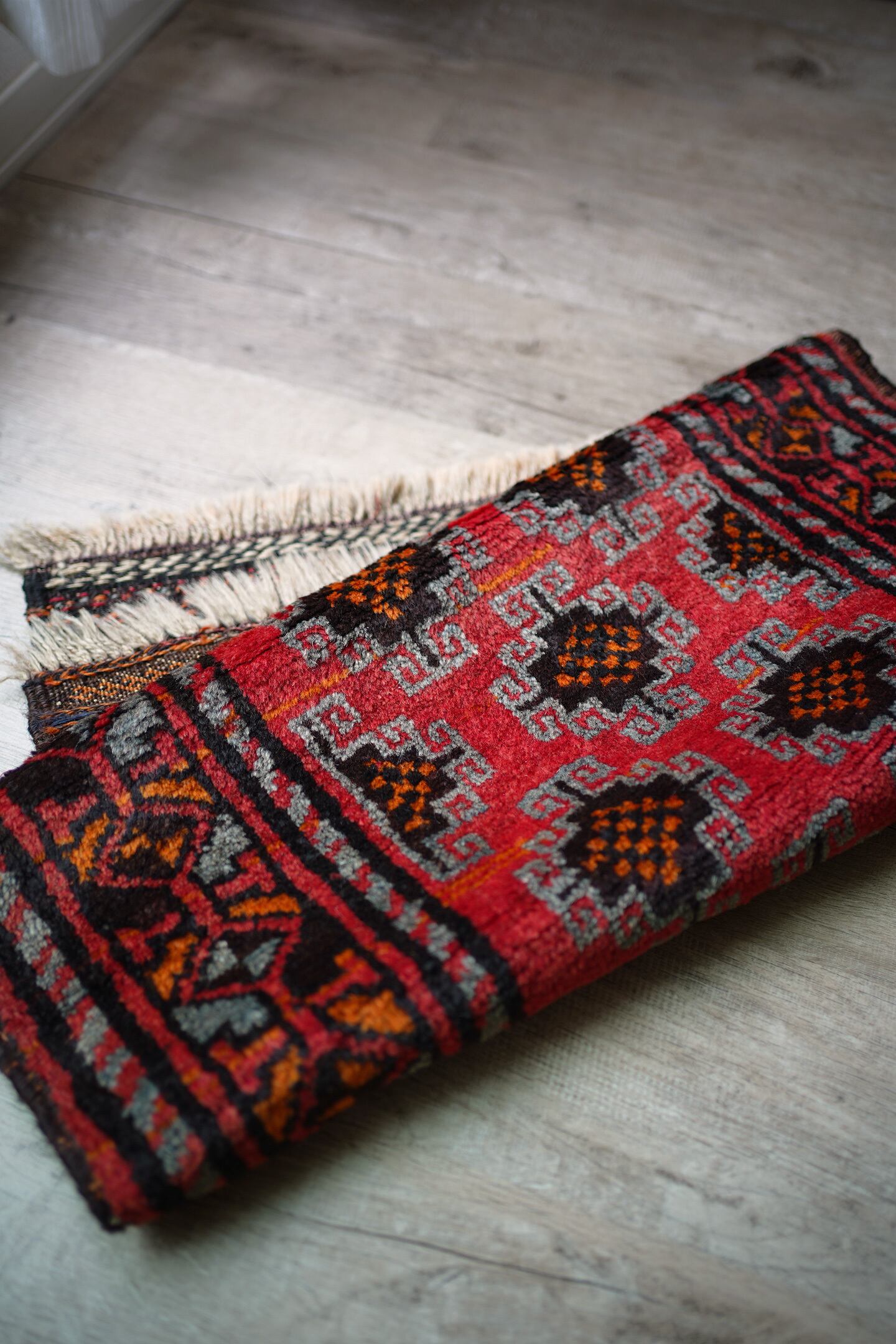 経年約40年のアフガンバルーチラグ。"バーリシト"と呼ばれる遊牧民が家財道具や食材を入れる袋状のものを表面のみに加工して作られています。メムリンク紋様と呼ばれる模様が織り込まれたデザインで、レッド・ブラック・オレンジ・グレー・少し青が混じったようなグレーの配色です。フリンジ部分はキリムエンド。ふわっと優しい肌触りで、厚みは7mm程度です。ダメージや補修跡も見られず、状態良好。玄関をはじめ、洗面スペースなど、色んな場所で活躍してくれるかと思います。