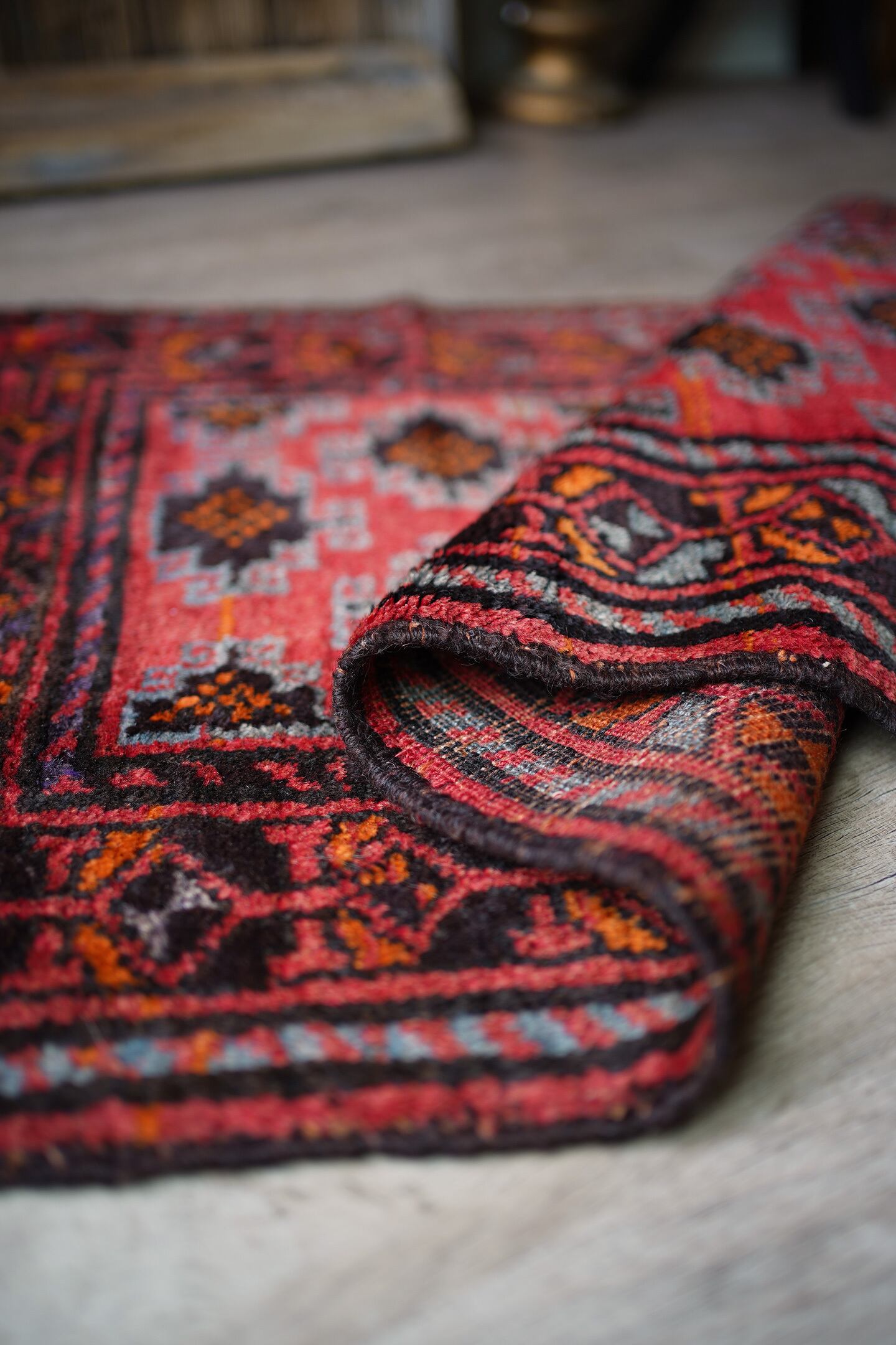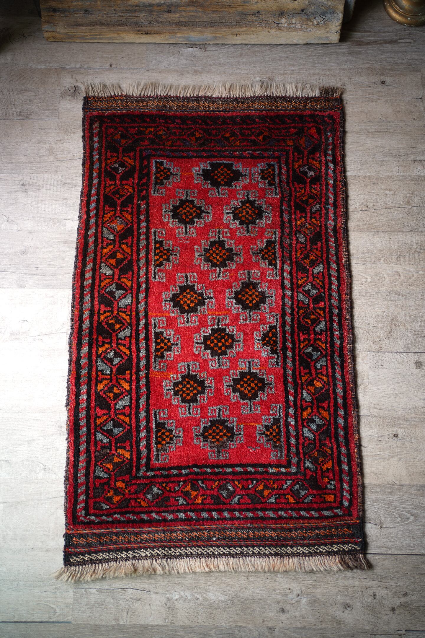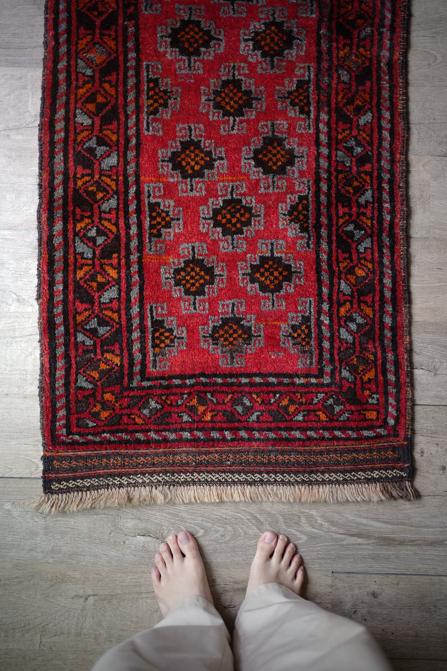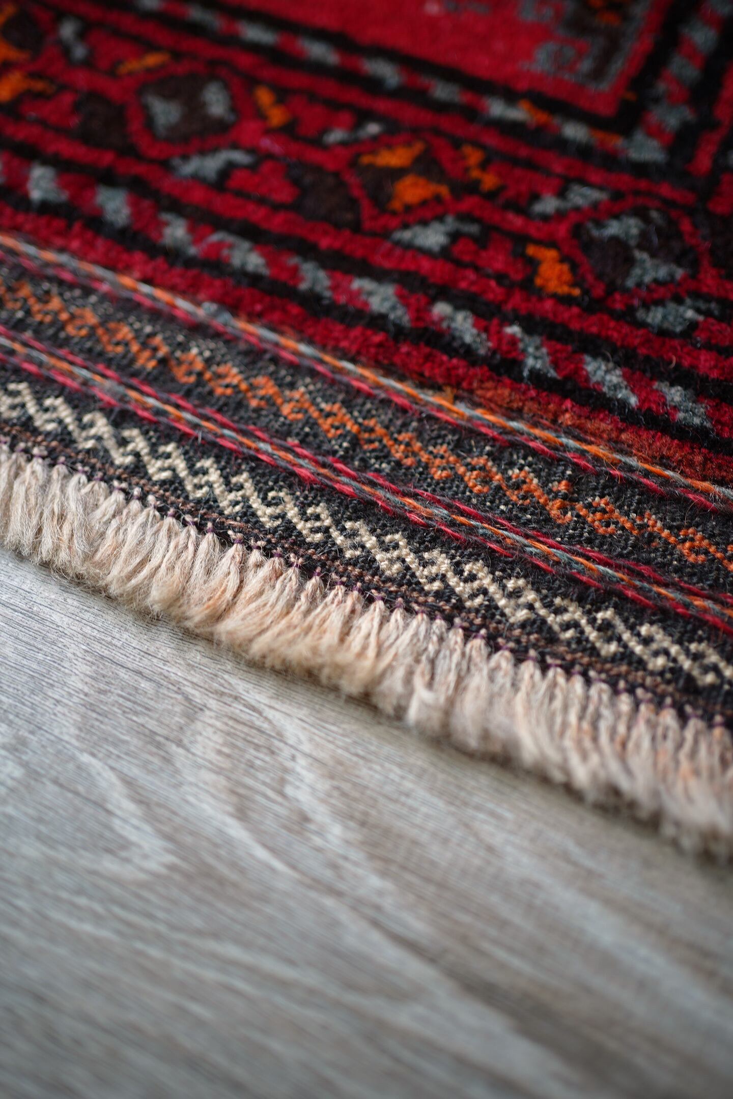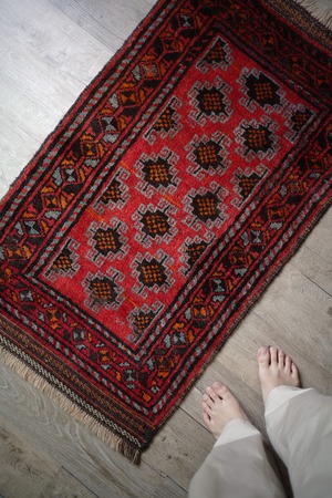経年約40年のアフガンバルーチラグ。"バーリシト"と呼ばれる遊牧民が家財道具や食材を入れる袋状のものを表面のみに加工して作られています。メムリンク紋様と呼ばれる模様が織り込まれたデザインで、レッド・ブラック・オレンジ・グレー・少し青が混じったようなグレーの配色です。フリンジ部分はキリムエンド。ふわっと優しい肌触りで、厚みは7mm程度です。ダメージや補修跡も見られず、状態良好。玄関をはじめ、洗面スペースなど、色んな場所で活躍してくれるかと思います。