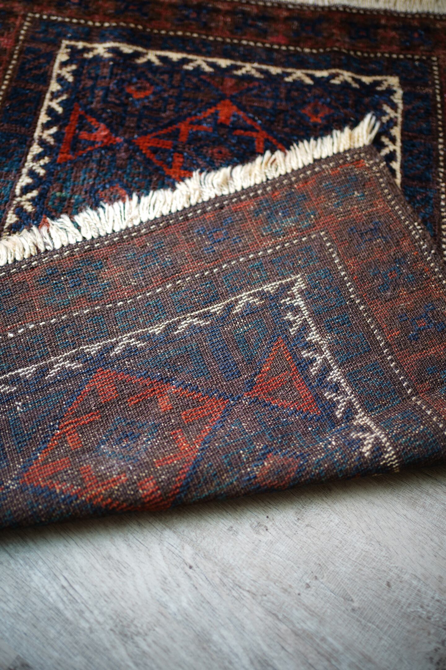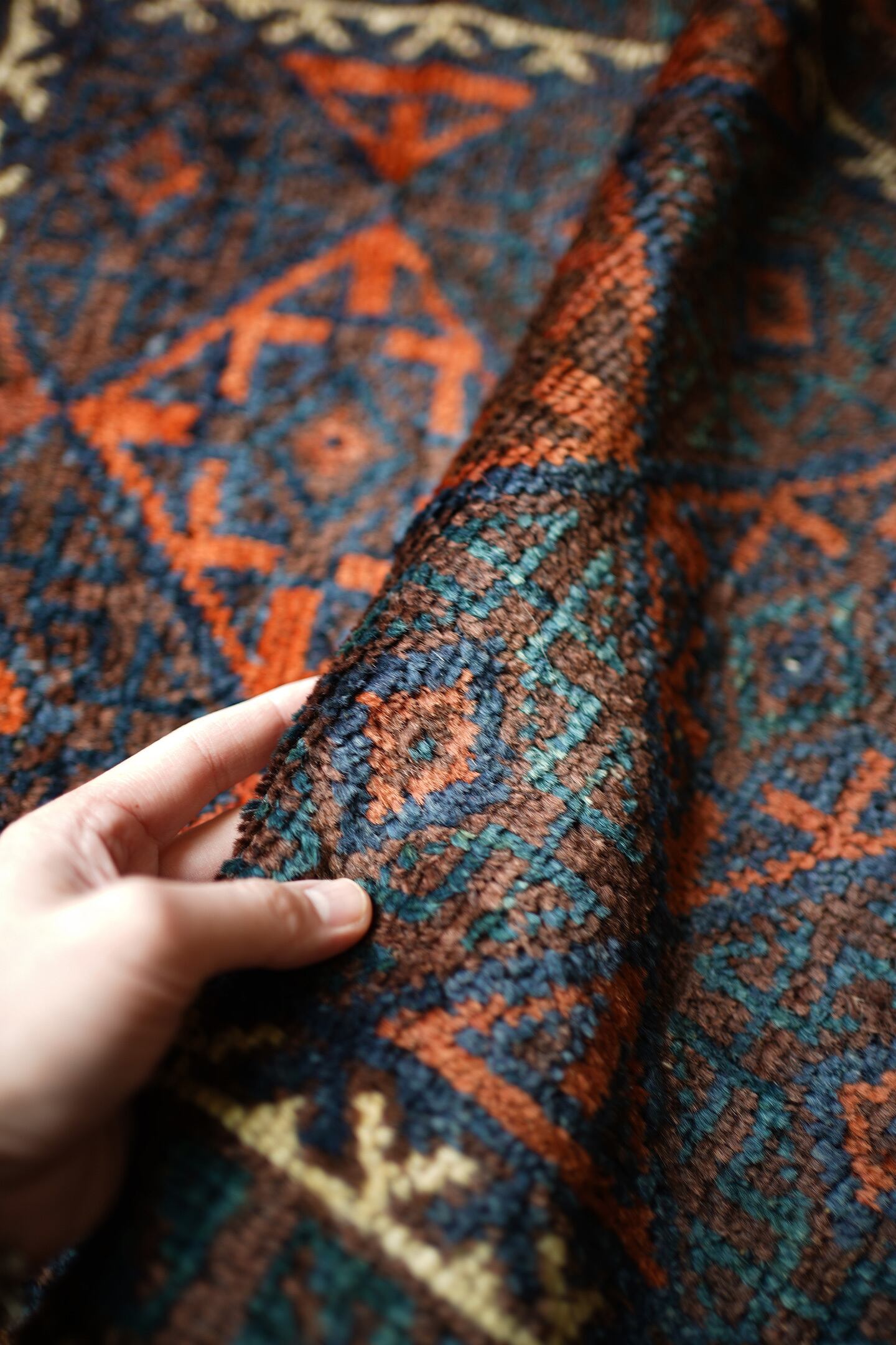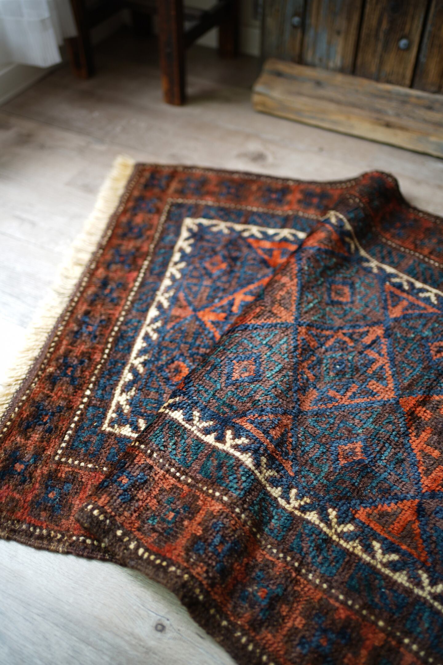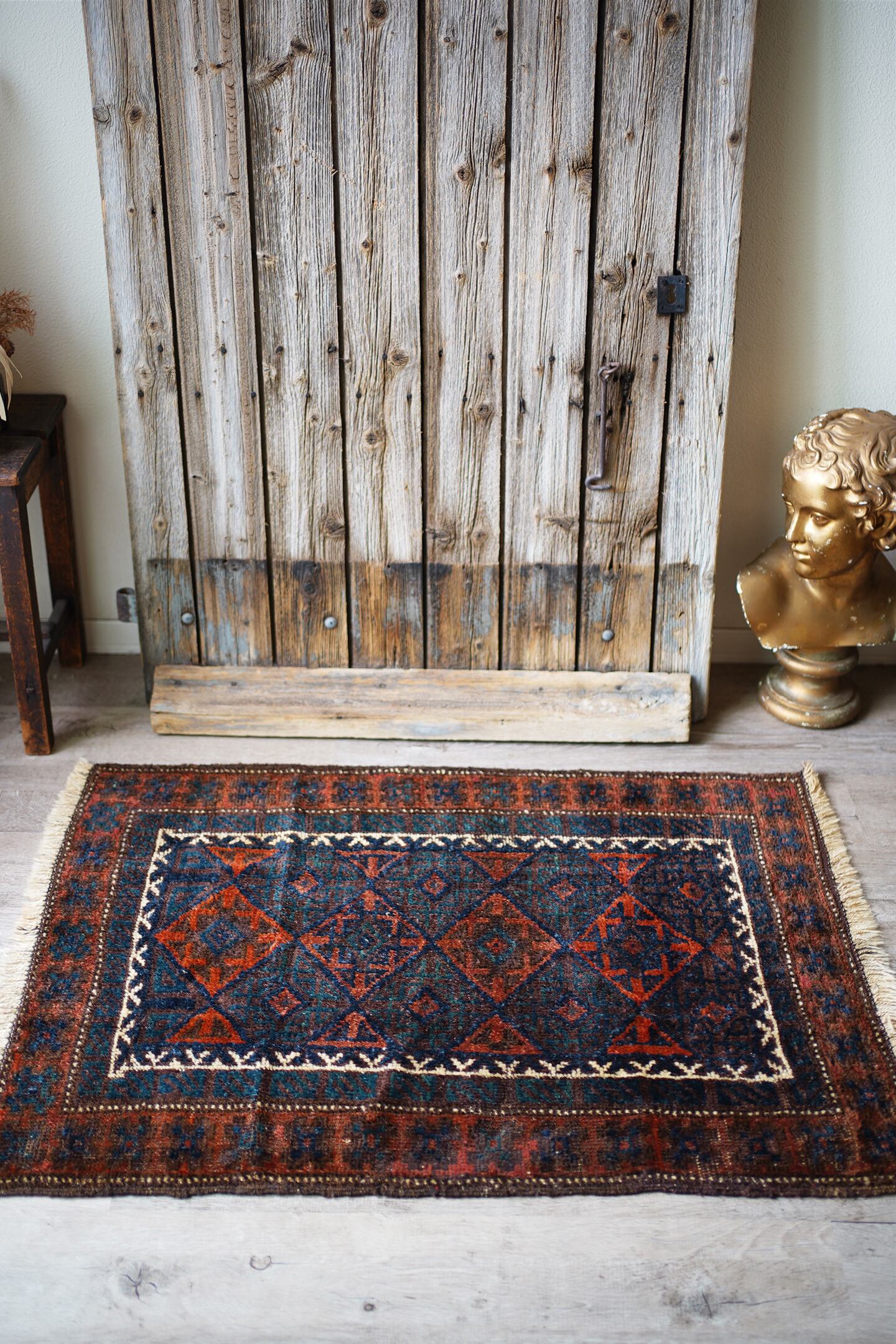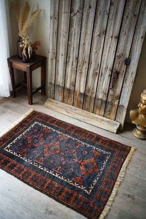 おおよそ85年前にイラン南東部のシスターン地方で織られたセミアンティークのバルーチラグ。"バーリシト"と呼ばれる遊牧民が家財道具や食材を入れる袋状のものを表面のみに加工して作られたお品。焦茶・暗いオレンジ・暗いブルーグリーン・ホワイトの配色で、バランスの取れた菱形紋様のデザイン。暗めなラグながらパイル全体に艶があり、光が差し込むと美しい輝きを放ちます。表面はふわっとしつつ、滑らかなパイルを感じる気持ちの良い肌触り。厚みは4mm〜5mm程度です。パイルが薄くなっている箇所がありますが、補修跡はなく全体的にグッドコンディション。チーク材の家具との相性も良さそうです♫