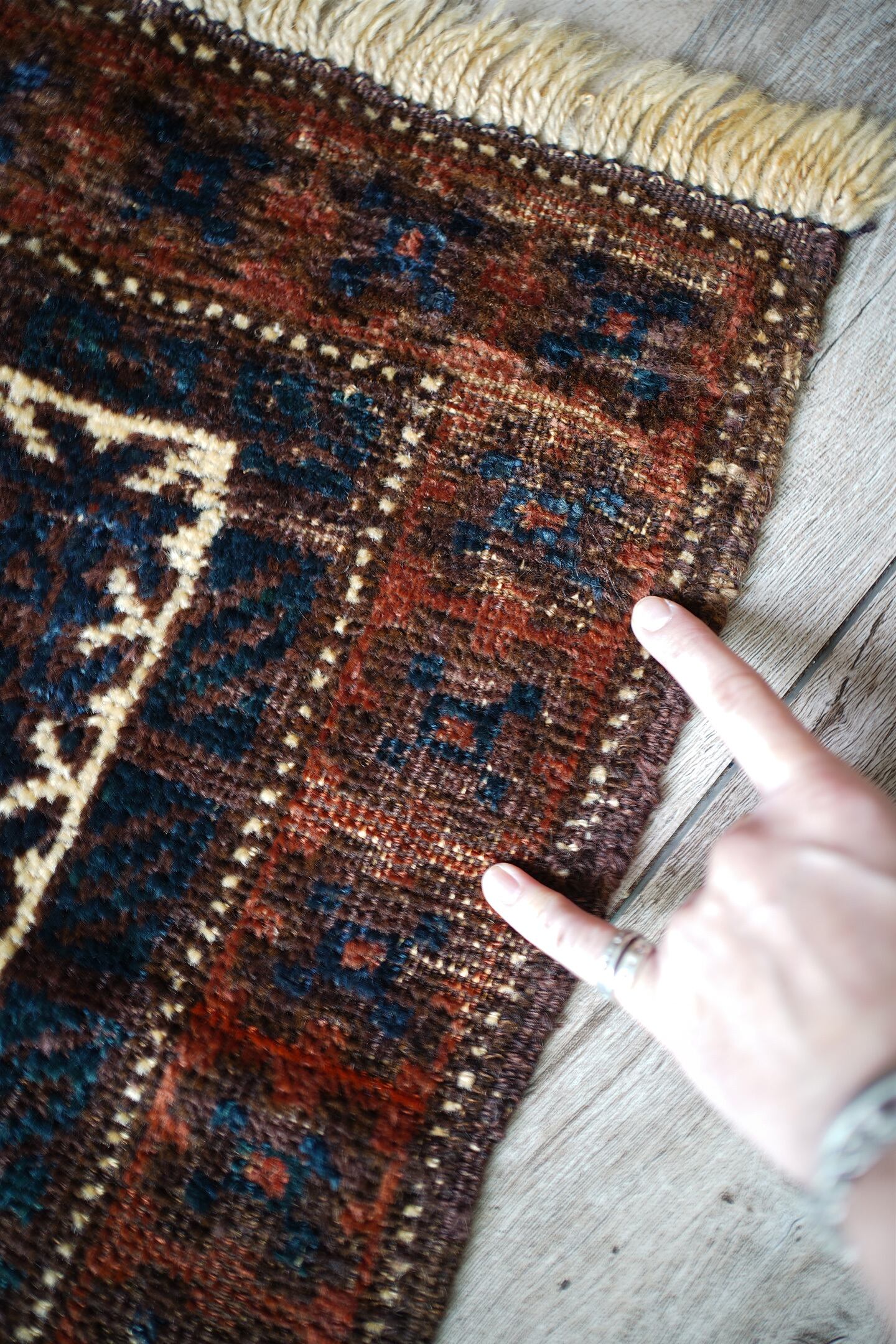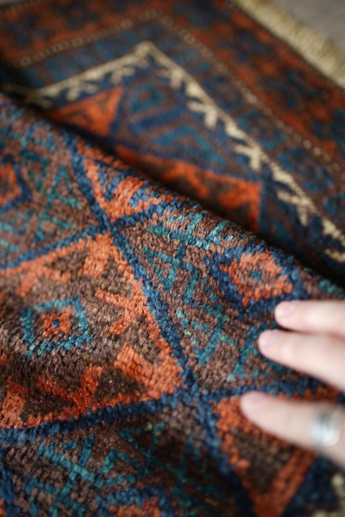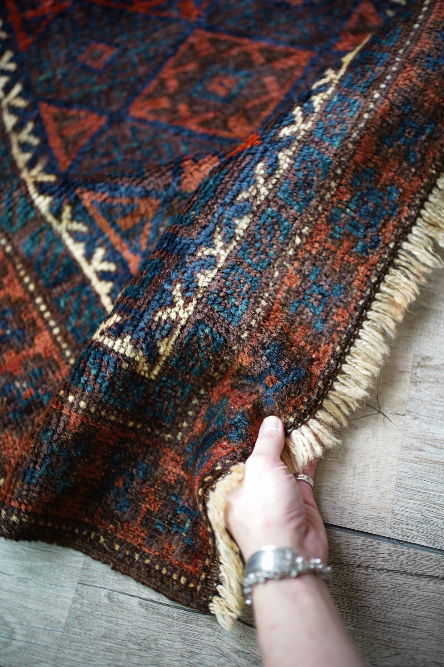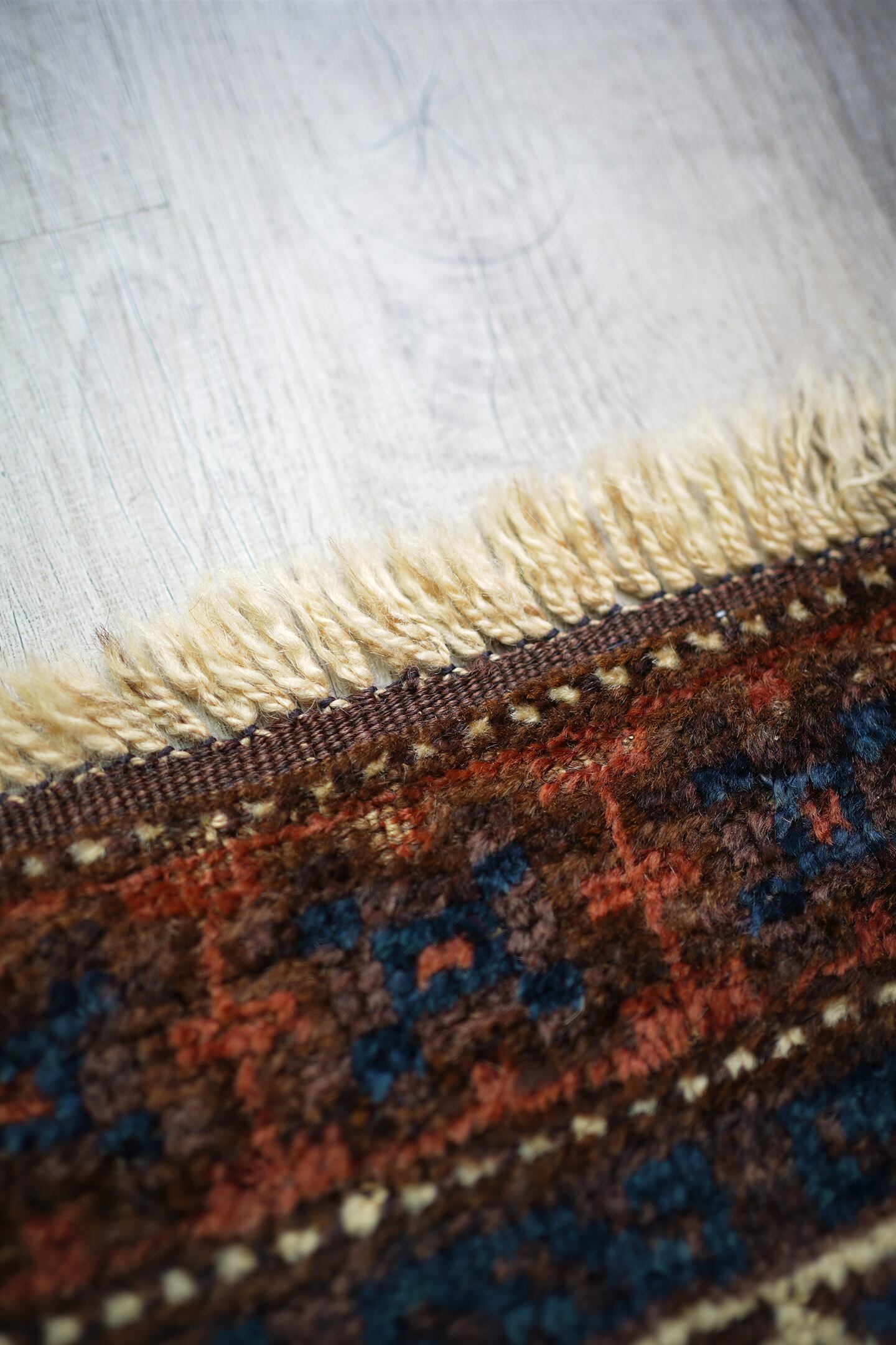 おおよそ85年前にイラン南東部のシスターン地方で織られたセミアンティークのバルーチラグ。"バーリシト"と呼ばれる遊牧民が家財道具や食材を入れる袋状のものを表面のみに加工して作られたお品。焦茶・暗いオレンジ・暗いブルーグリーン・ホワイトの配色で、バランスの取れた菱形紋様のデザイン。暗めなラグながらパイル全体に艶があり、光が差し込むと美しい輝きを放ちます。表面はふわっとしつつ、滑らかなパイルを感じる気持ちの良い肌触り。厚みは4mm〜5mm程度です。パイルが薄くなっている箇所がありますが、補修跡はなく全体的にグッドコンディション。チーク材の家具との相性も良さそうです♫