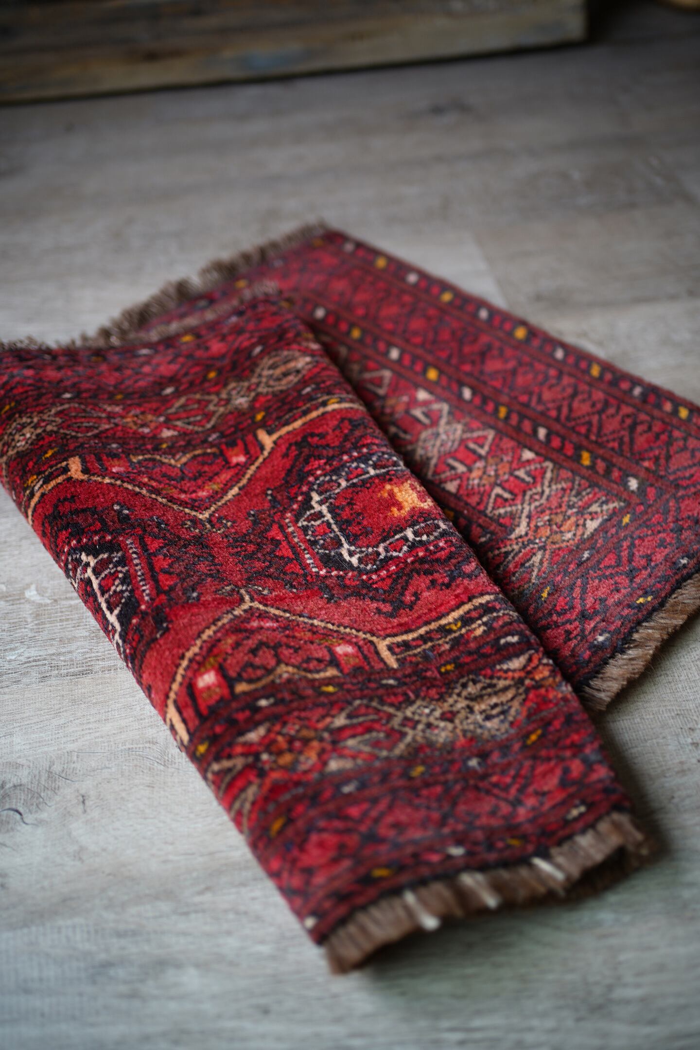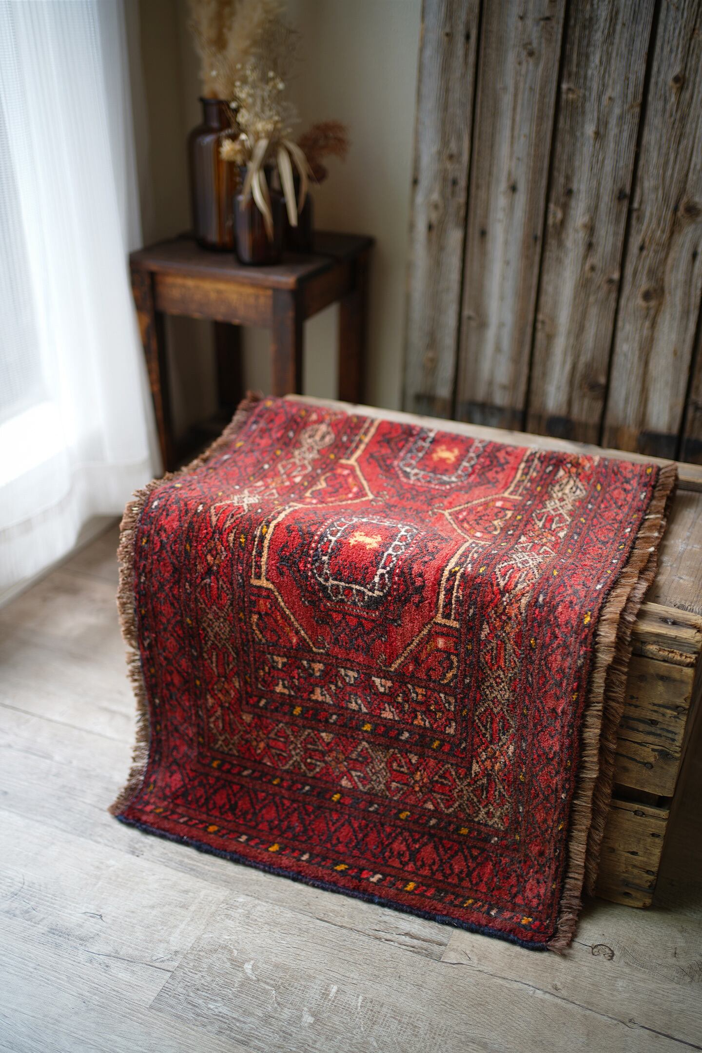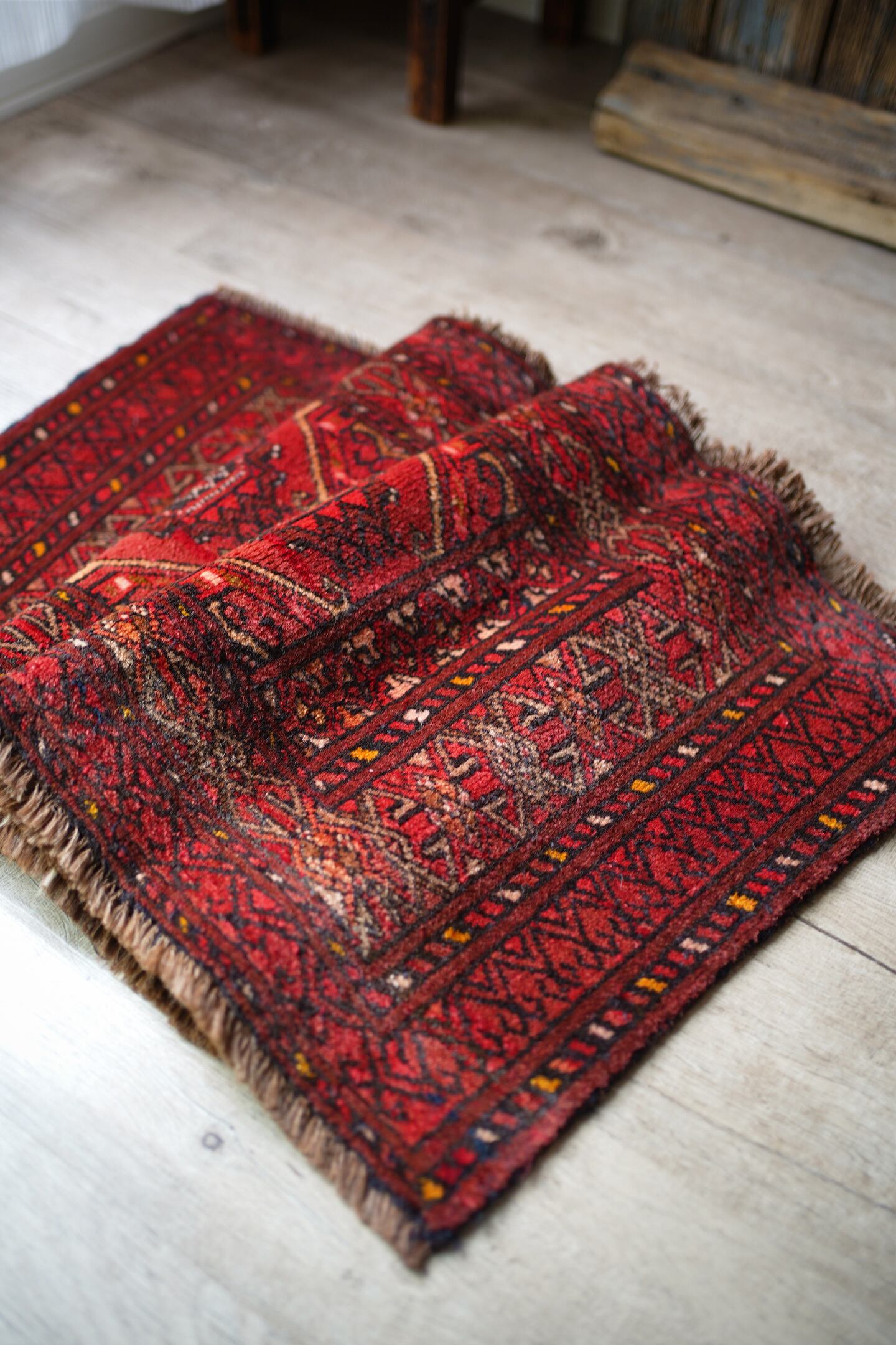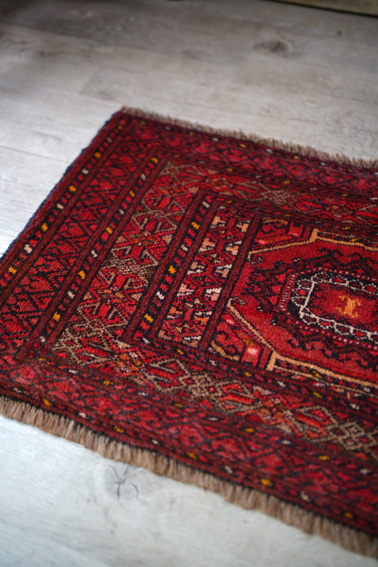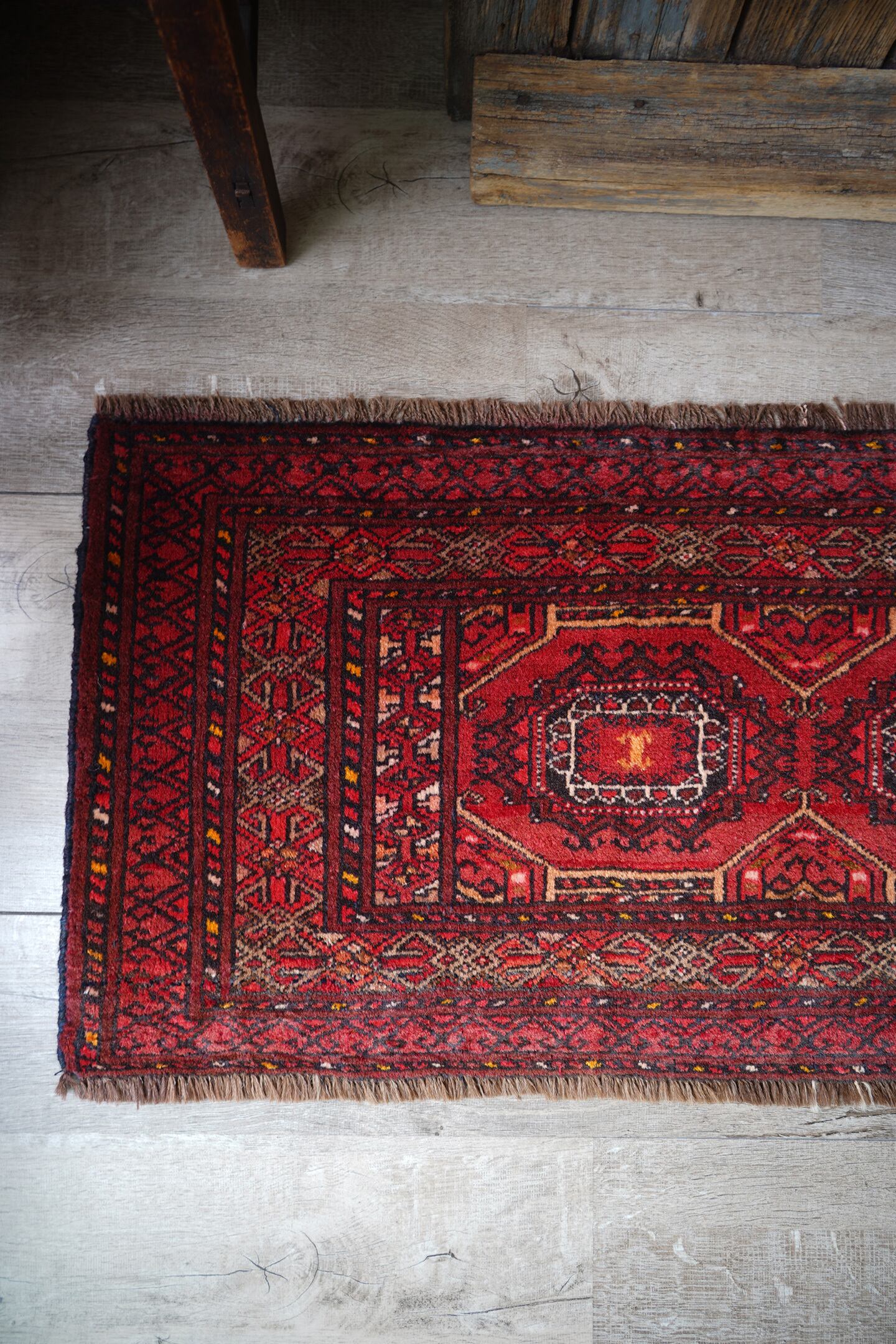おおよそ70年前にトルクメン・テッケ支族によって織られたジャラーの装飾部分をカットして作成したラグです。ジャラーとは細長い絨毯の袋で嫁入り道具や衣装などを詰め込むトルクメン特有の毛織物。デザインはトルクメン・サロール支族が織っていた家紋である"サロールギュル"が使われています。落ち着いた赤をベースにブラック、薄いオレンジ、ブラウンの配色。表面はフワっと柔らかく優しい肌触り。厚みは6mm〜7mmほど。目立ったダメージや補修跡もなく、状態も大変良好です。サイドボードの前などに敷いたりすると、とても素敵かと思います♫