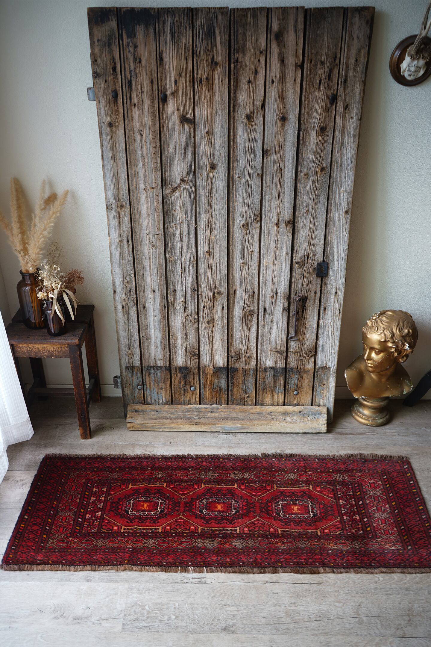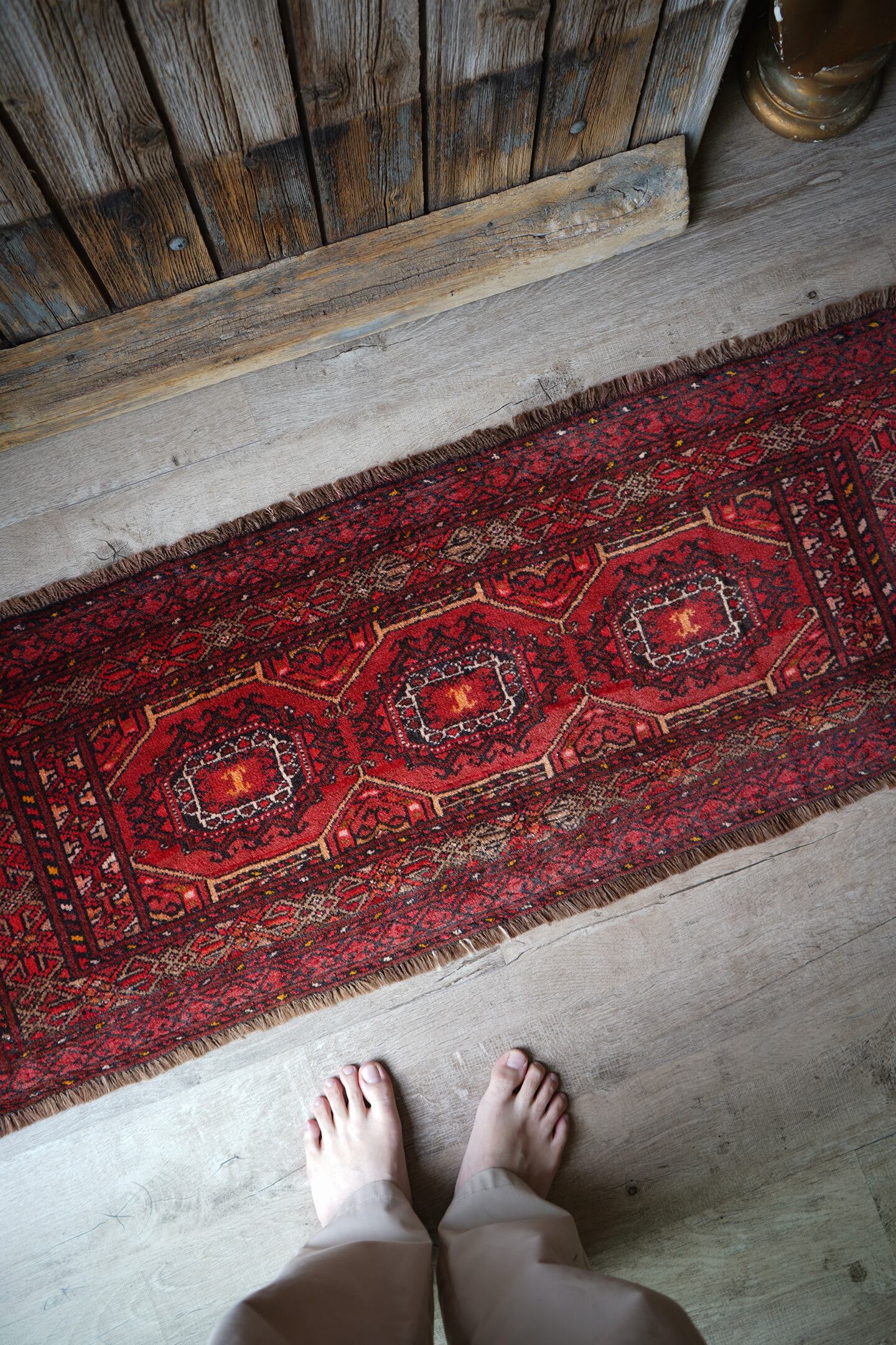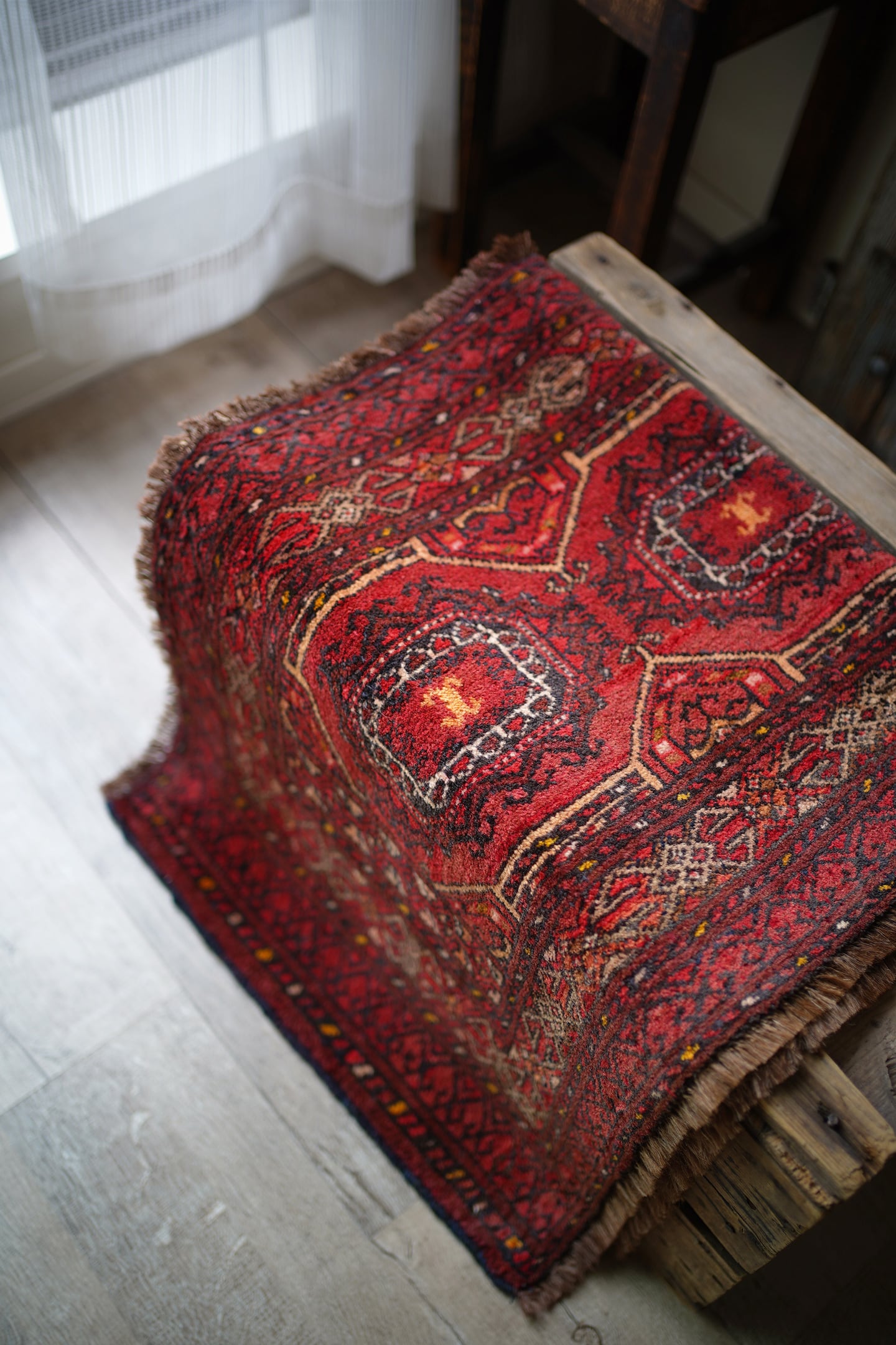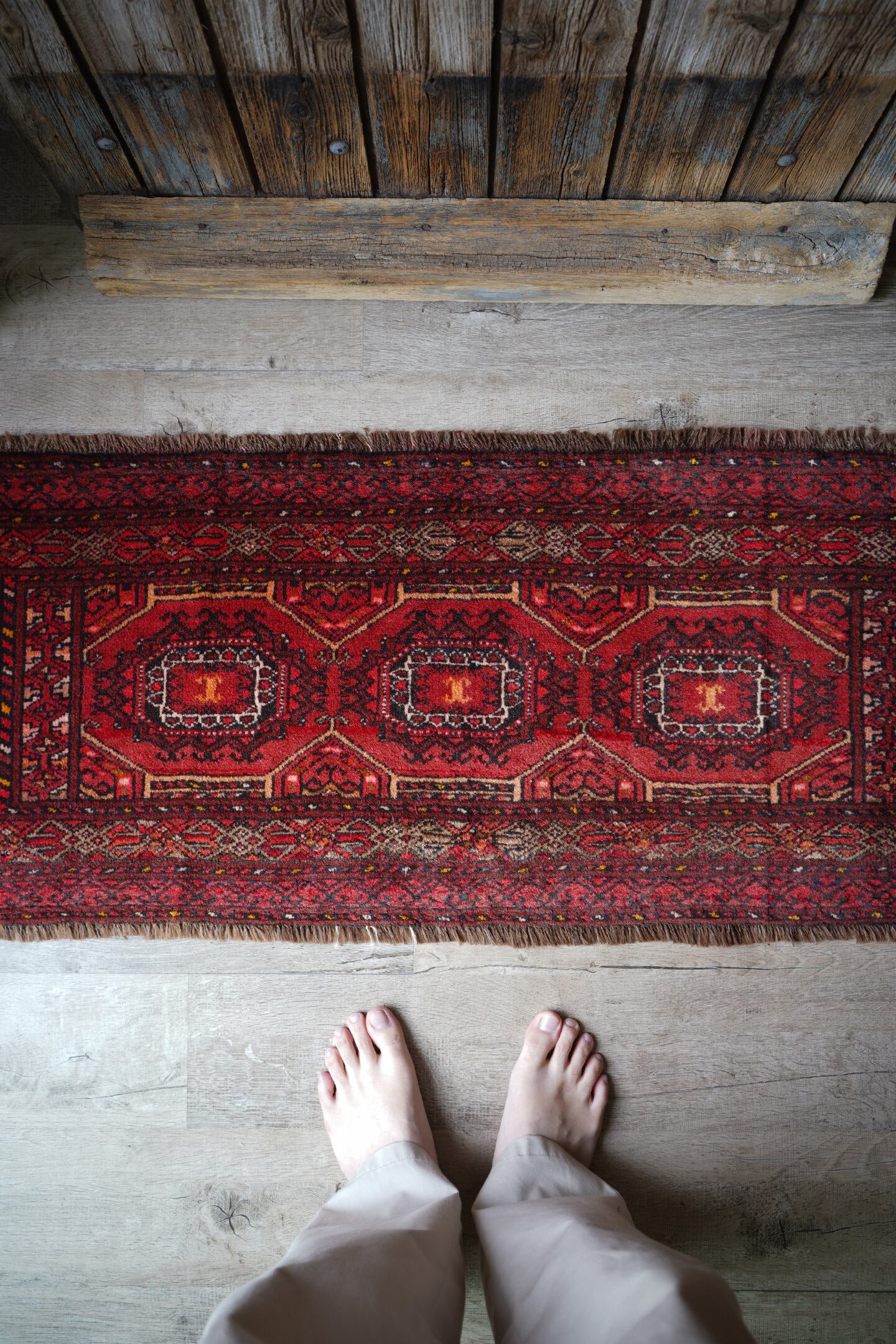 おおよそ70年前にトルクメン・テッケ支族によって織られたジャラーの装飾部分をカットして作成したラグです。ジャラーとは細長い絨毯の袋で嫁入り道具や衣装などを詰め込むトルクメン特有の毛織物。デザインはトルクメン・サロール支族が織っていた家紋である"サロールギュル"が使われています。落ち着いた赤をベースにブラック、薄いオレンジ、ブラウンの配色。表面はフワっと柔らかく優しい肌触り。厚みは6mm〜7mmほど。目立ったダメージや補修跡もなく、状態も大変良好です。サイドボードの前などに敷いたりすると、とても素敵かと思います♫