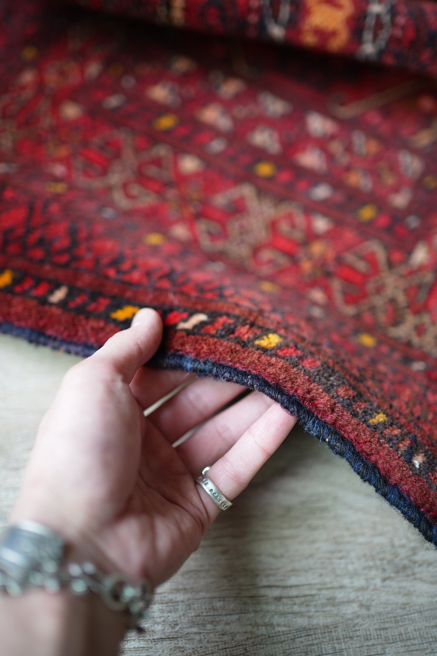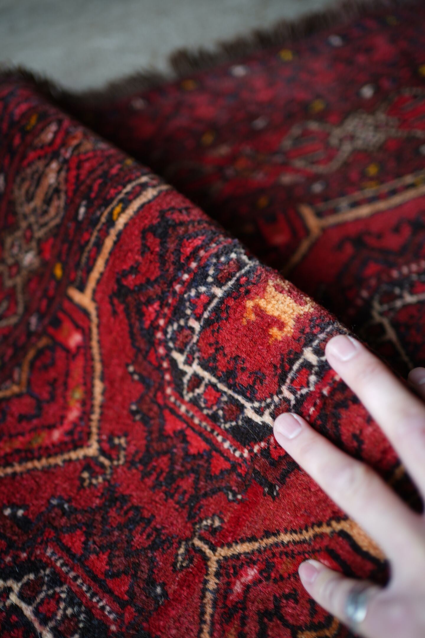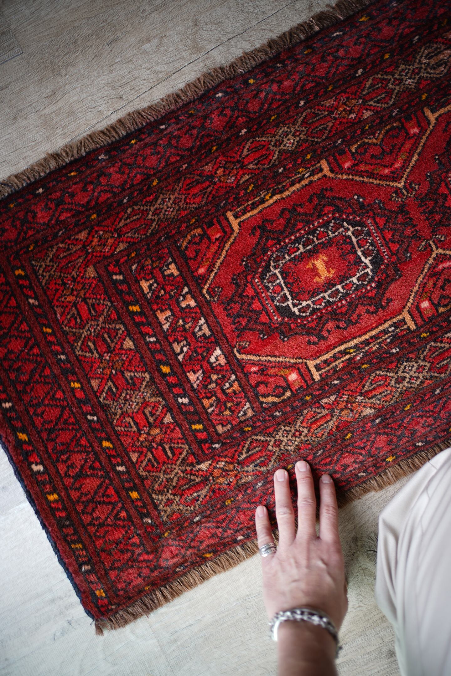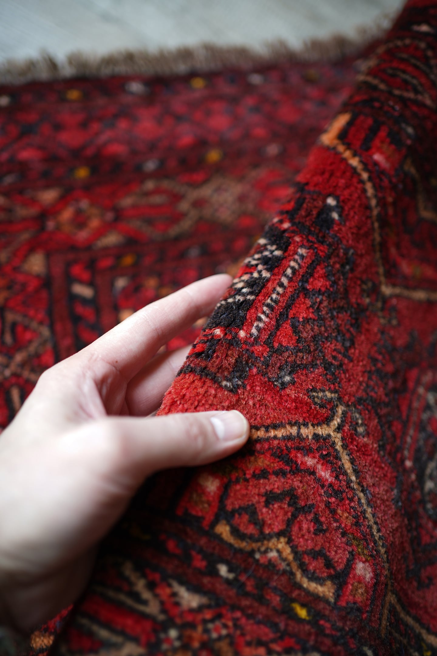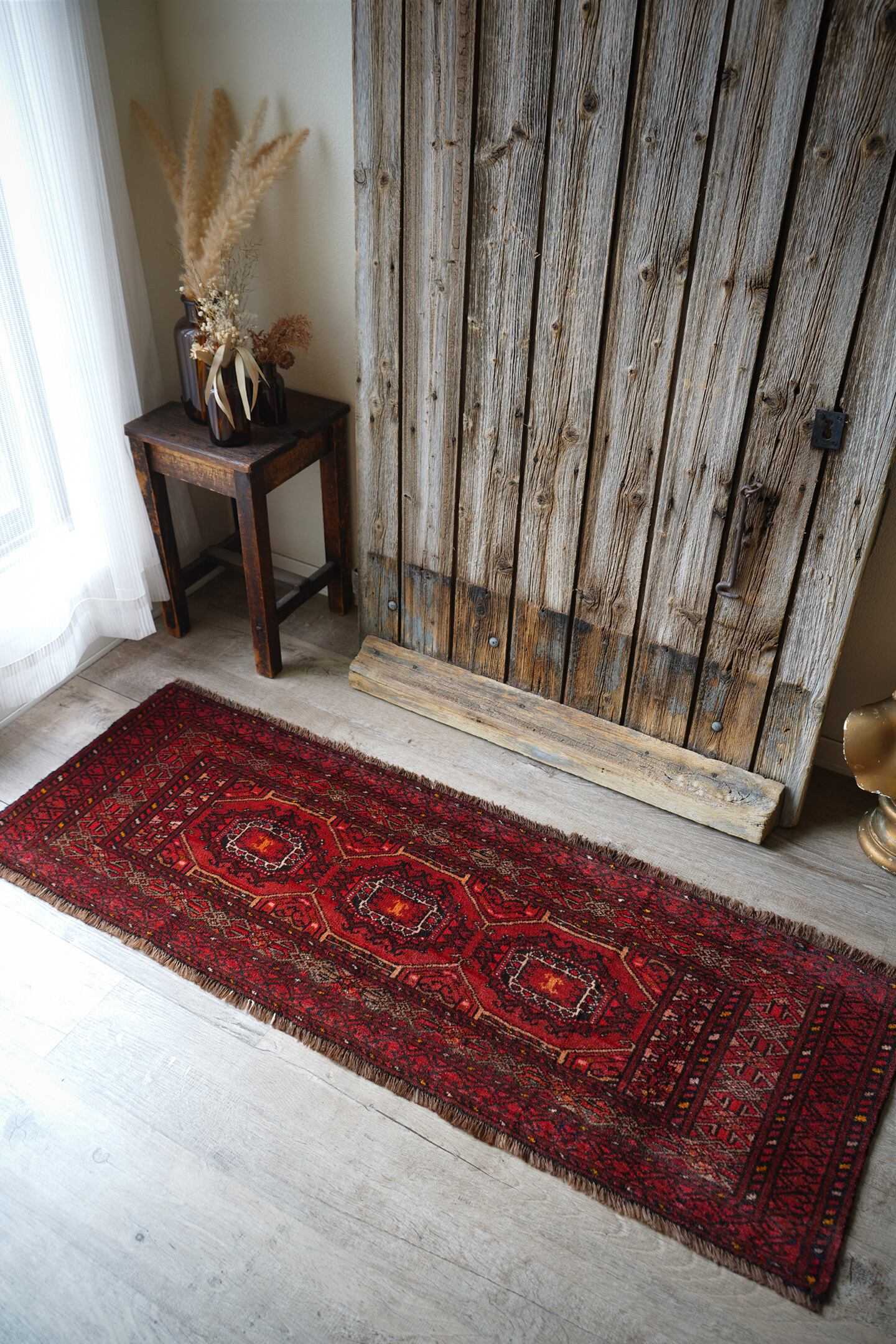 おおよそ70年前にトルクメン・テッケ支族によって織られたジャラーの装飾部分をカットして作成したラグです。ジャラーとは細長い絨毯の袋で嫁入り道具や衣装などを詰め込むトルクメン特有の毛織物。デザインはトルクメン・サロール支族が織っていた家紋である"サロールギュル"が使われています。落ち着いた赤をベースにブラック、薄いオレンジ、ブラウンの配色。表面はフワっと柔らかく優しい肌触り。厚みは6mm〜7mmほど。目立ったダメージや補修跡もなく、状態も大変良好です。サイドボードの前などに敷いたりすると、とても素敵かと思います♫