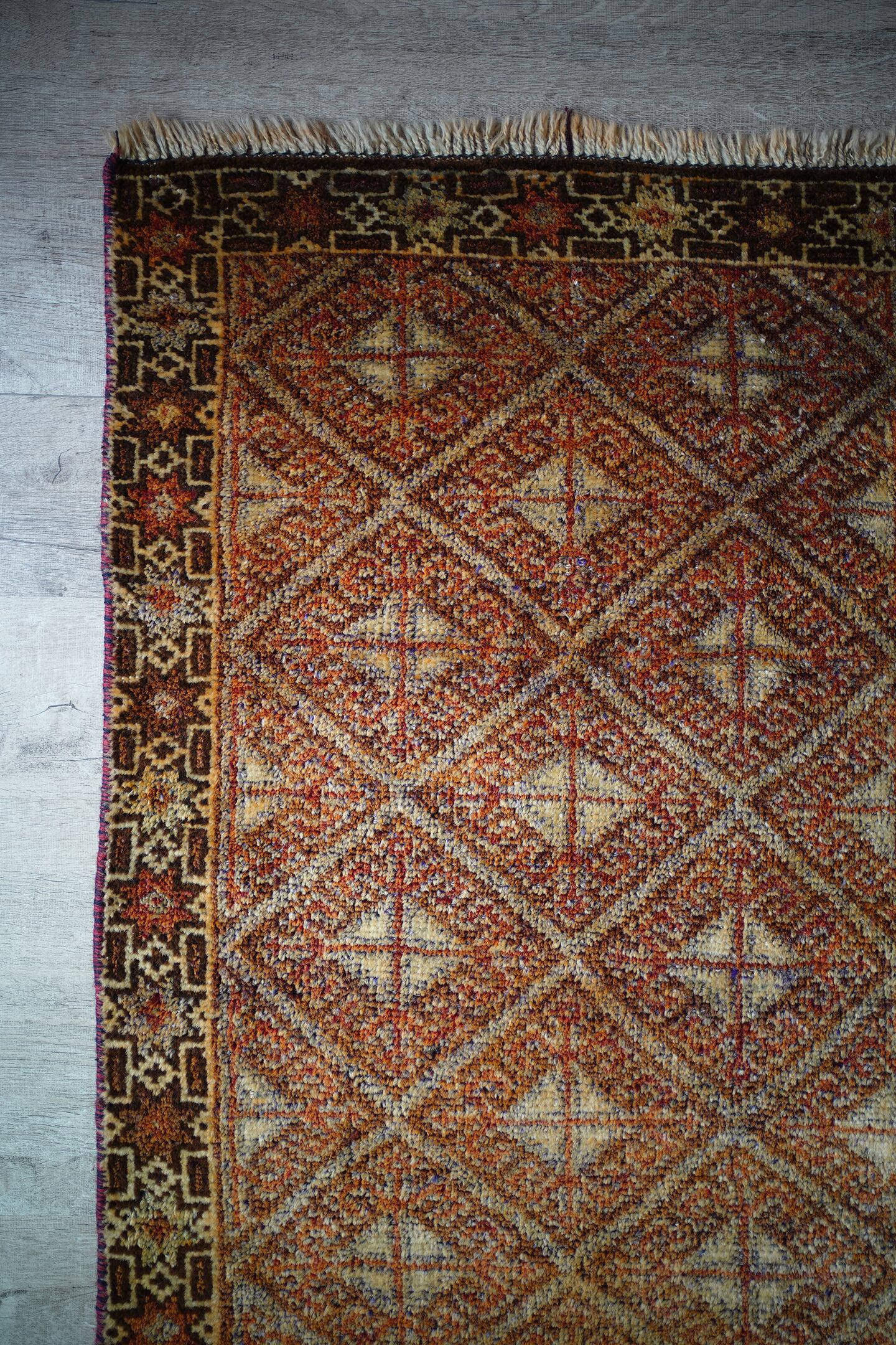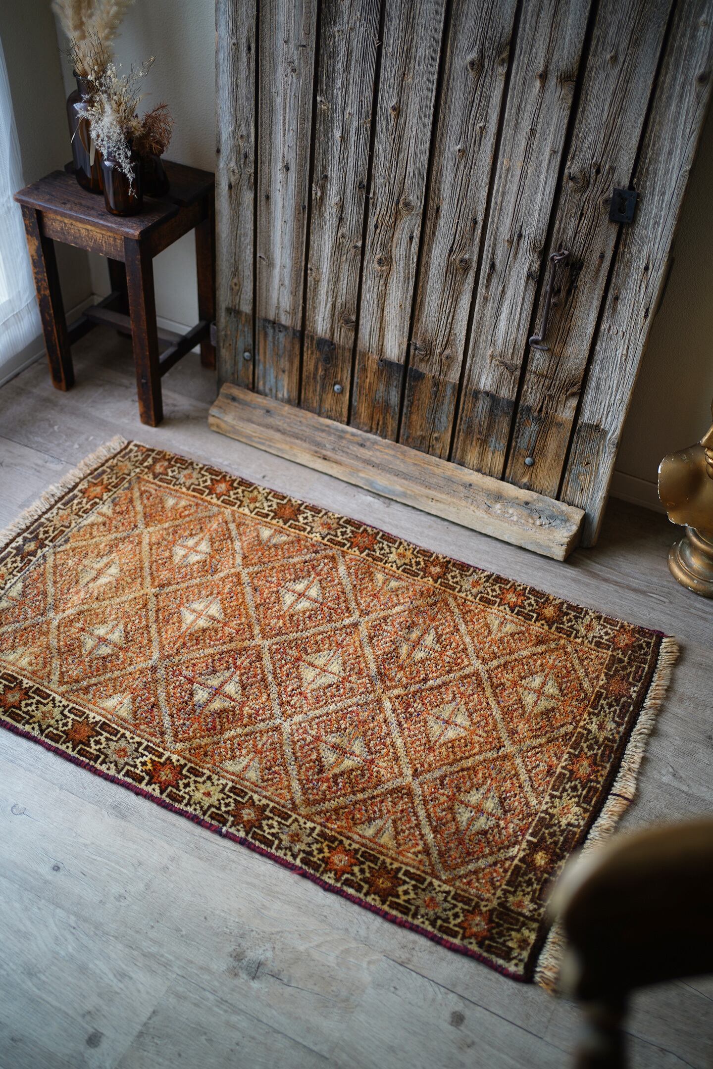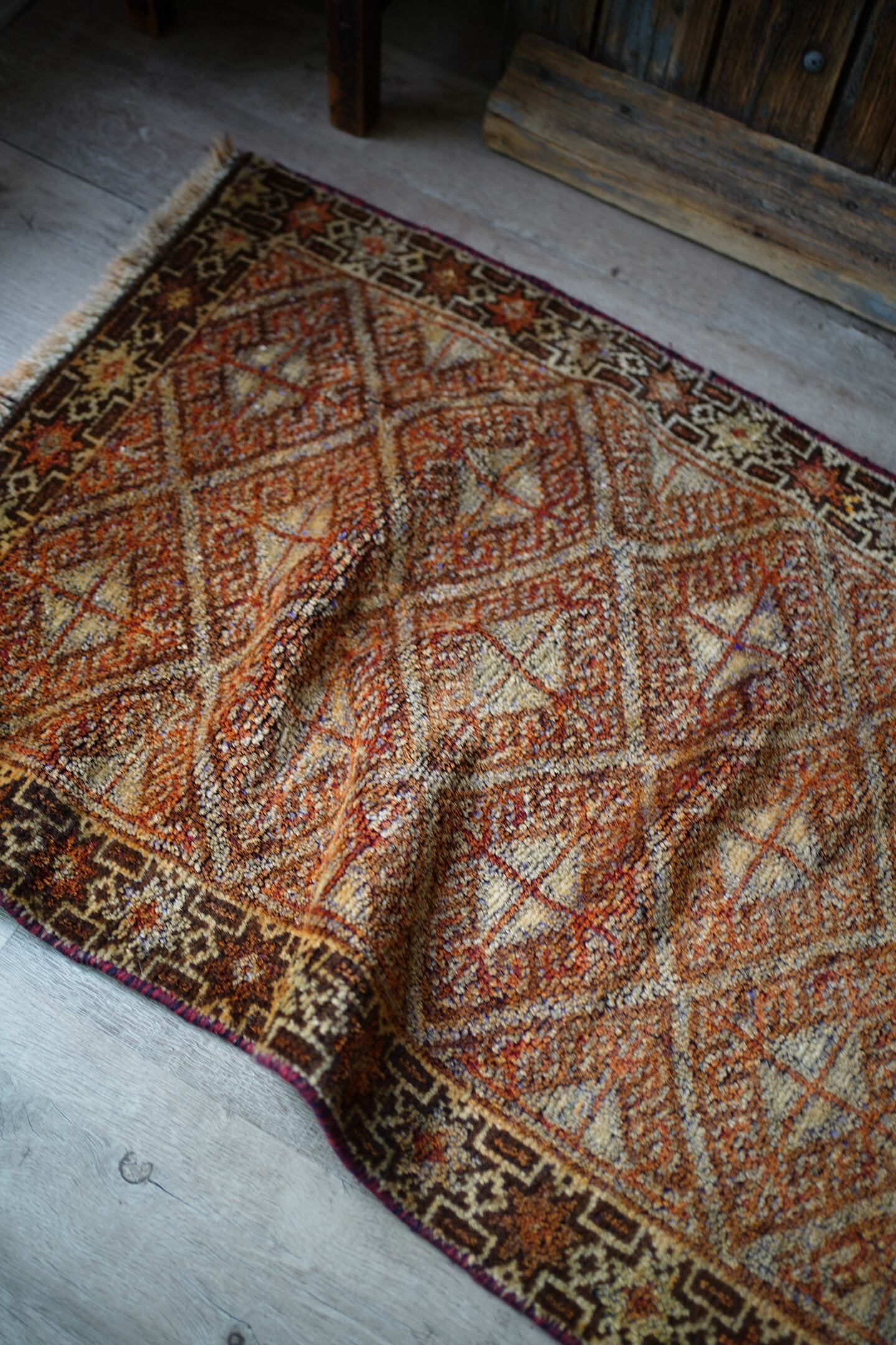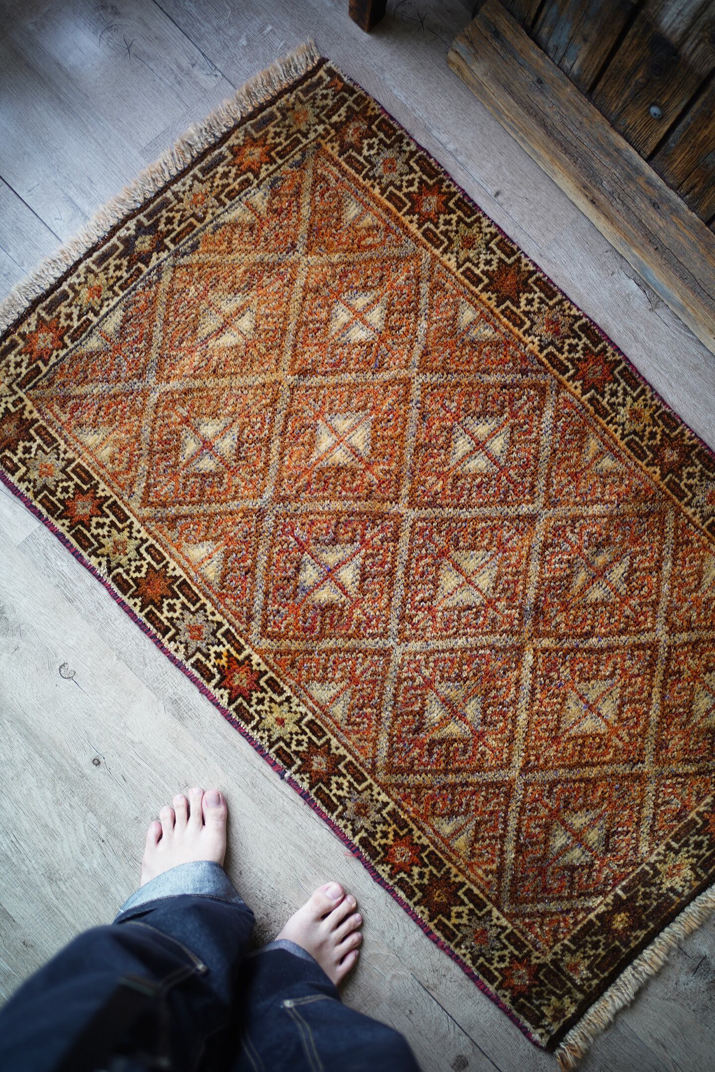 約70年前にアフガニスタンのバルーチ族によって織られたラグです。表面と裏面のパイル色味にかなり違いがあったため、現地セラーに染めて変色したラグかどうか確認したところ、元々はクッションカバーとして使われていたものらしく、経年や日焼けにより変色したものと見られます。バランスの取れた菱形模様のデザインで、近くで見るとくっきりした見栄えではなく、少しぼやけたような柔らかい見た目をしています。ボーダーには連続して織り込まれた八角星の紋様。焦茶、ブラウン、薄いオレンジ、ベージュの優しい色合いが素敵です。毛並みはフワっと滑らかな優しい肌触りで、厚みは7mm程度。補修跡やダメージも見受けられず、状態良好です。敷かれる向きによって色味に差がありますのでお写真にてご確認ください。玄関をはじめ、キャビネットの前などにどうぞ♫