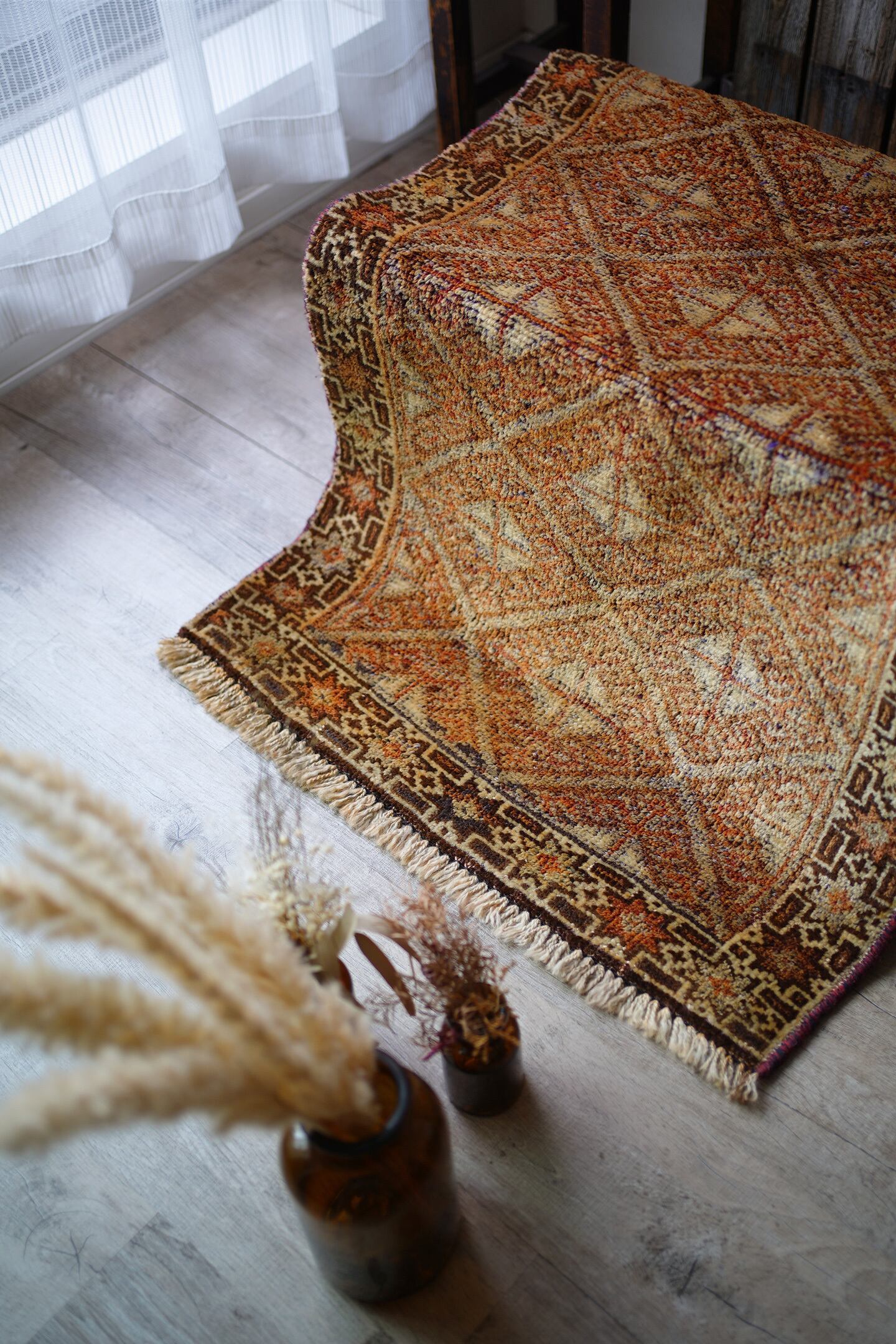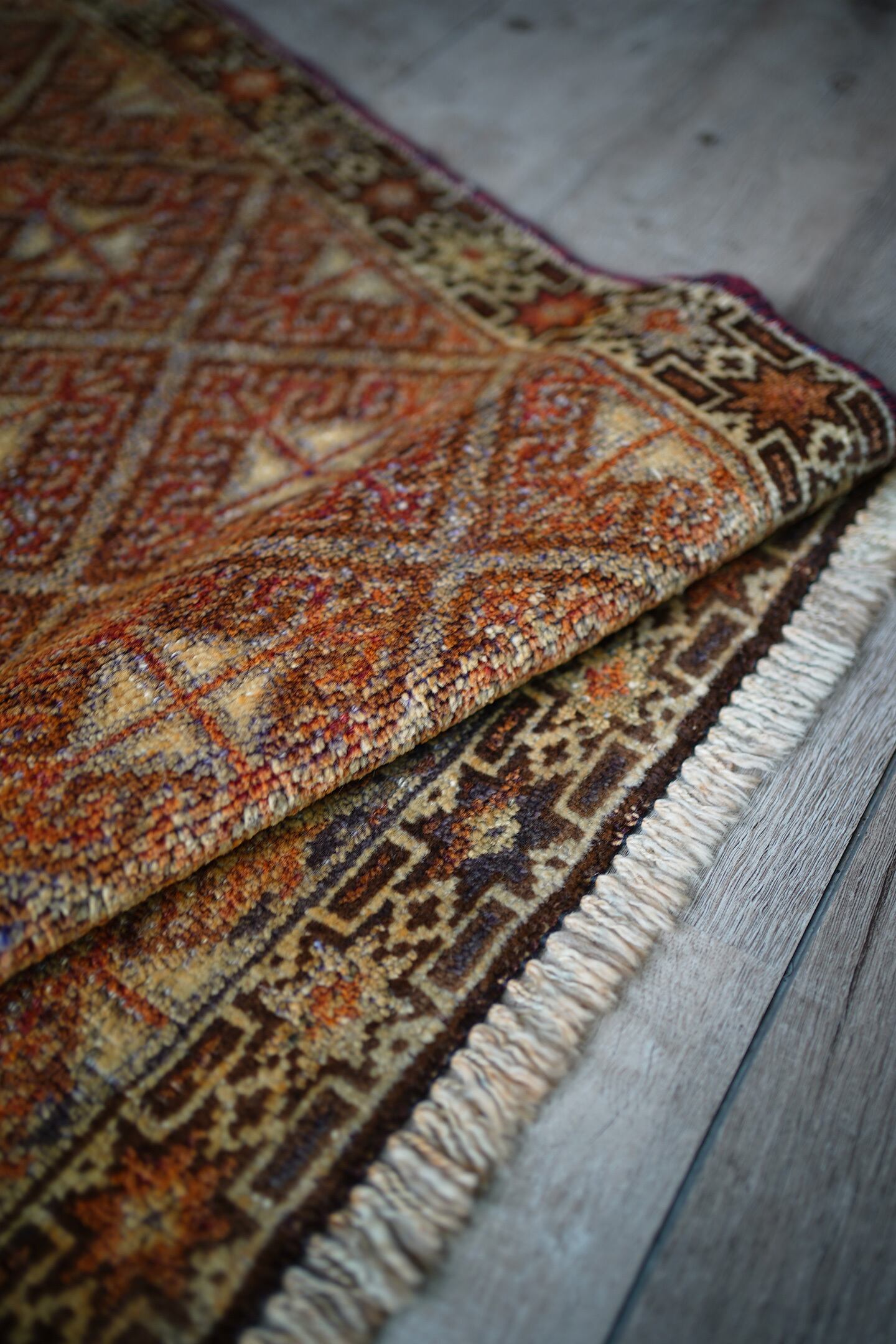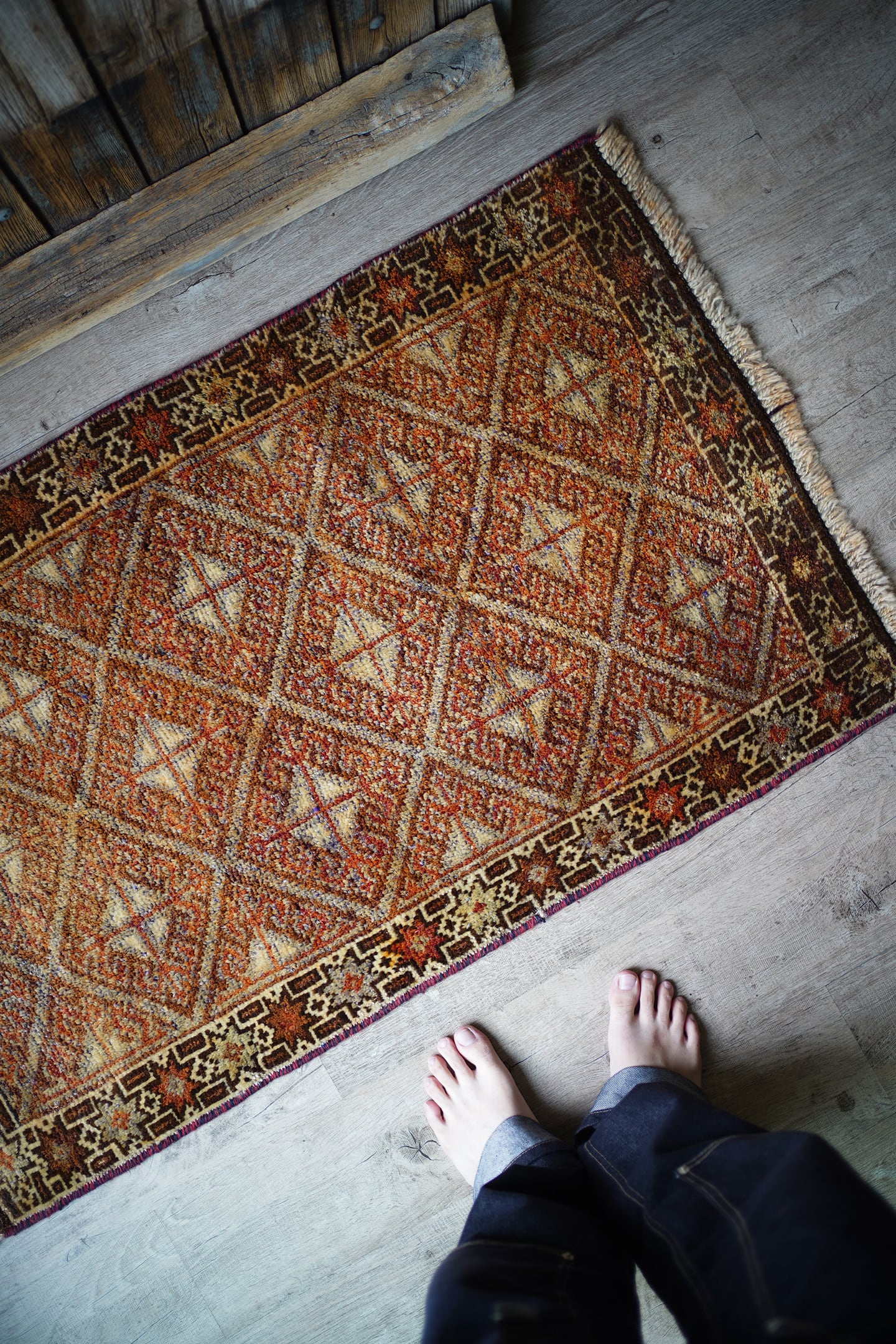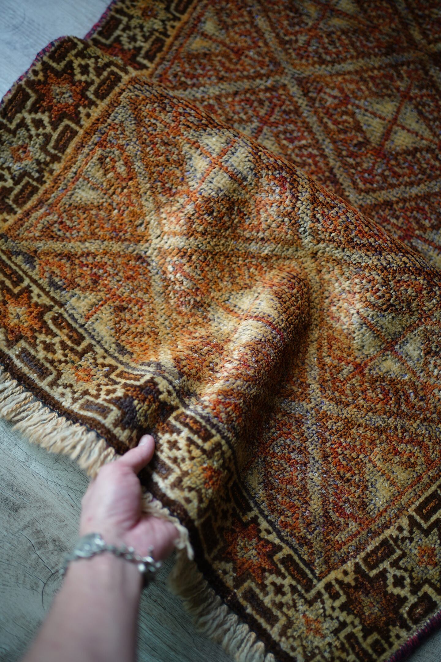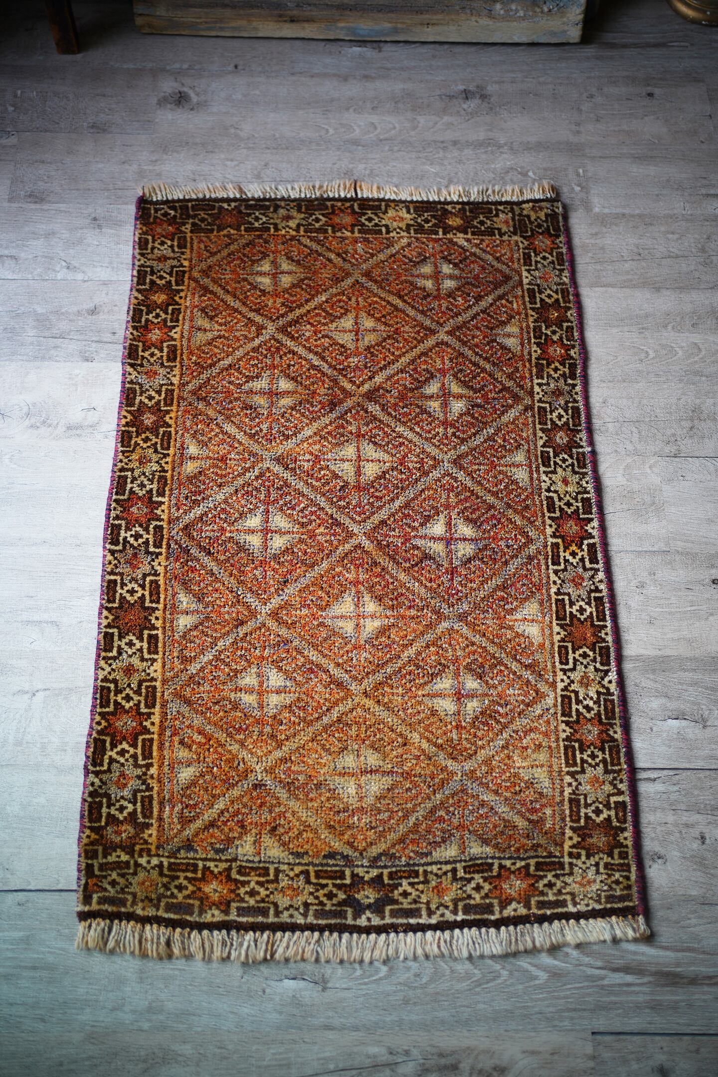 約70年前にアフガニスタンのバルーチ族によって織られたラグです。表面と裏面のパイル色味にかなり違いがあったため、現地セラーに染めて変色したラグかどうか確認したところ、元々はクッションカバーとして使われていたものらしく、経年や日焼けにより変色したものと見られます。バランスの取れた菱形模様のデザインで、近くで見るとくっきりした見栄えではなく、少しぼやけたような柔らかい見た目をしています。ボーダーには連続して織り込まれた八角星の紋様。焦茶、ブラウン、薄いオレンジ、ベージュの優しい色合いが素敵です。毛並みはフワっと滑らかな優しい肌触りで、厚みは7mm程度。補修跡やダメージも見受けられず、状態良好です。敷かれる向きによって色味に差がありますのでお写真にてご確認ください。玄関をはじめ、キャビネットの前などにどうぞ♫