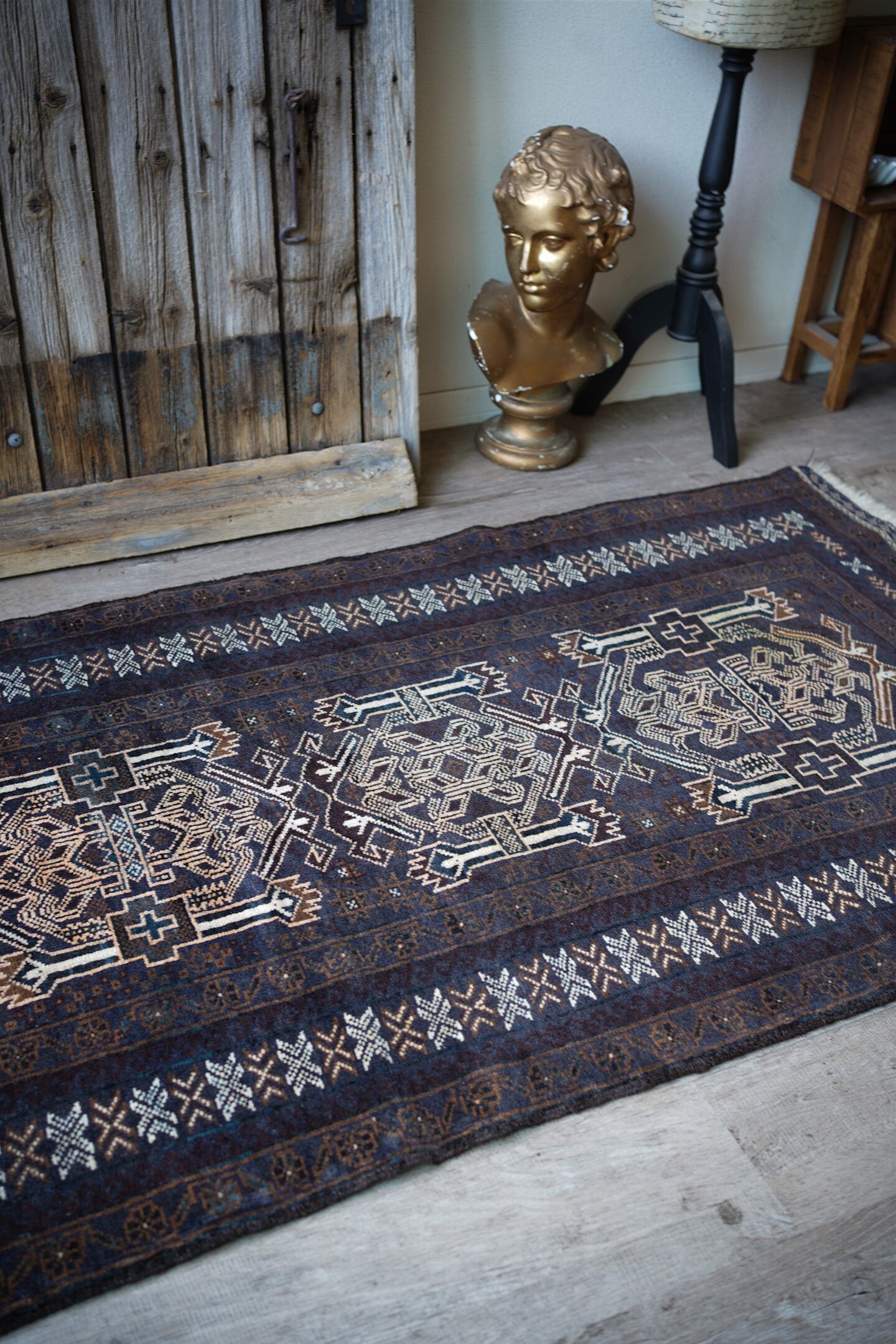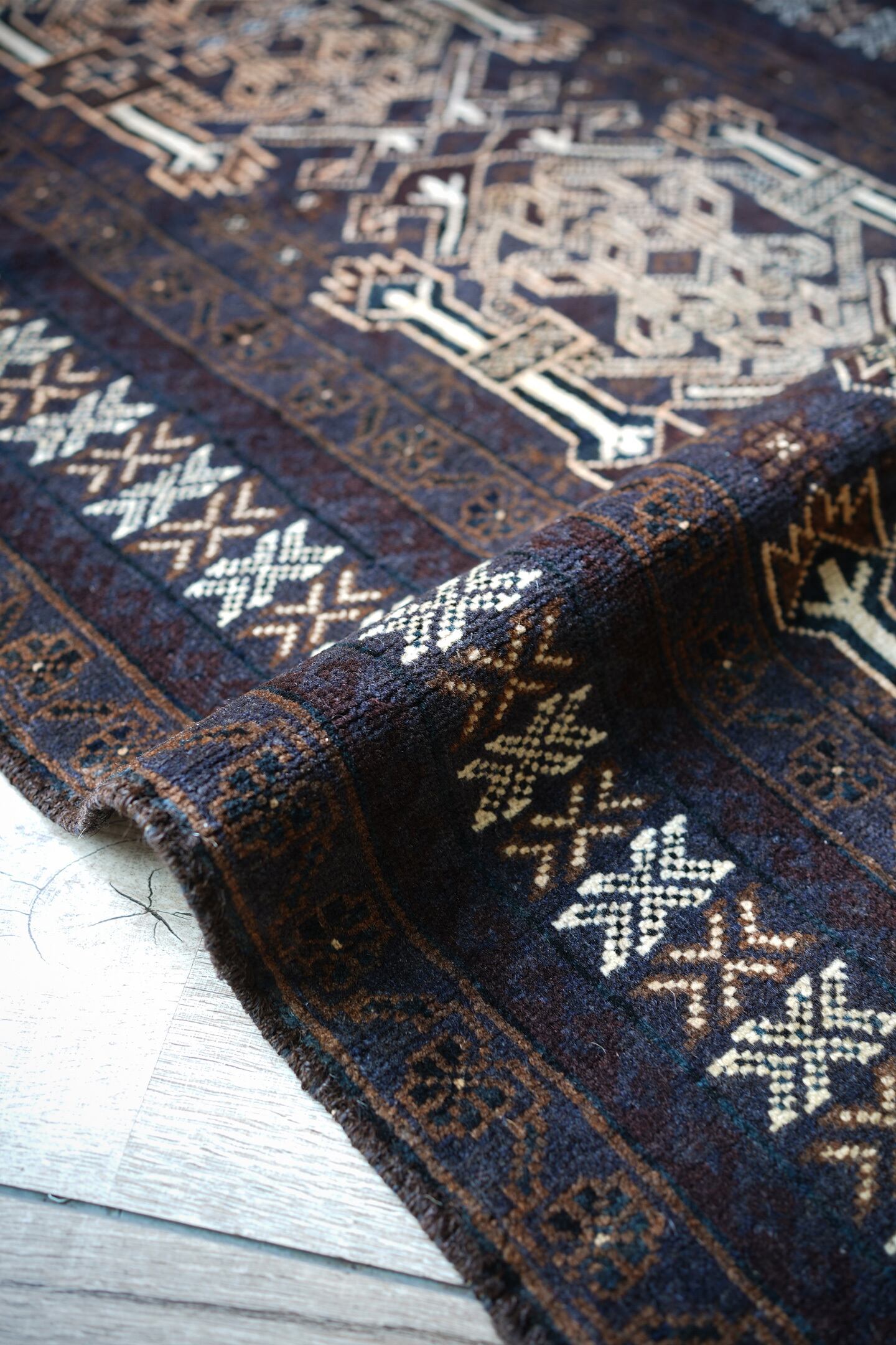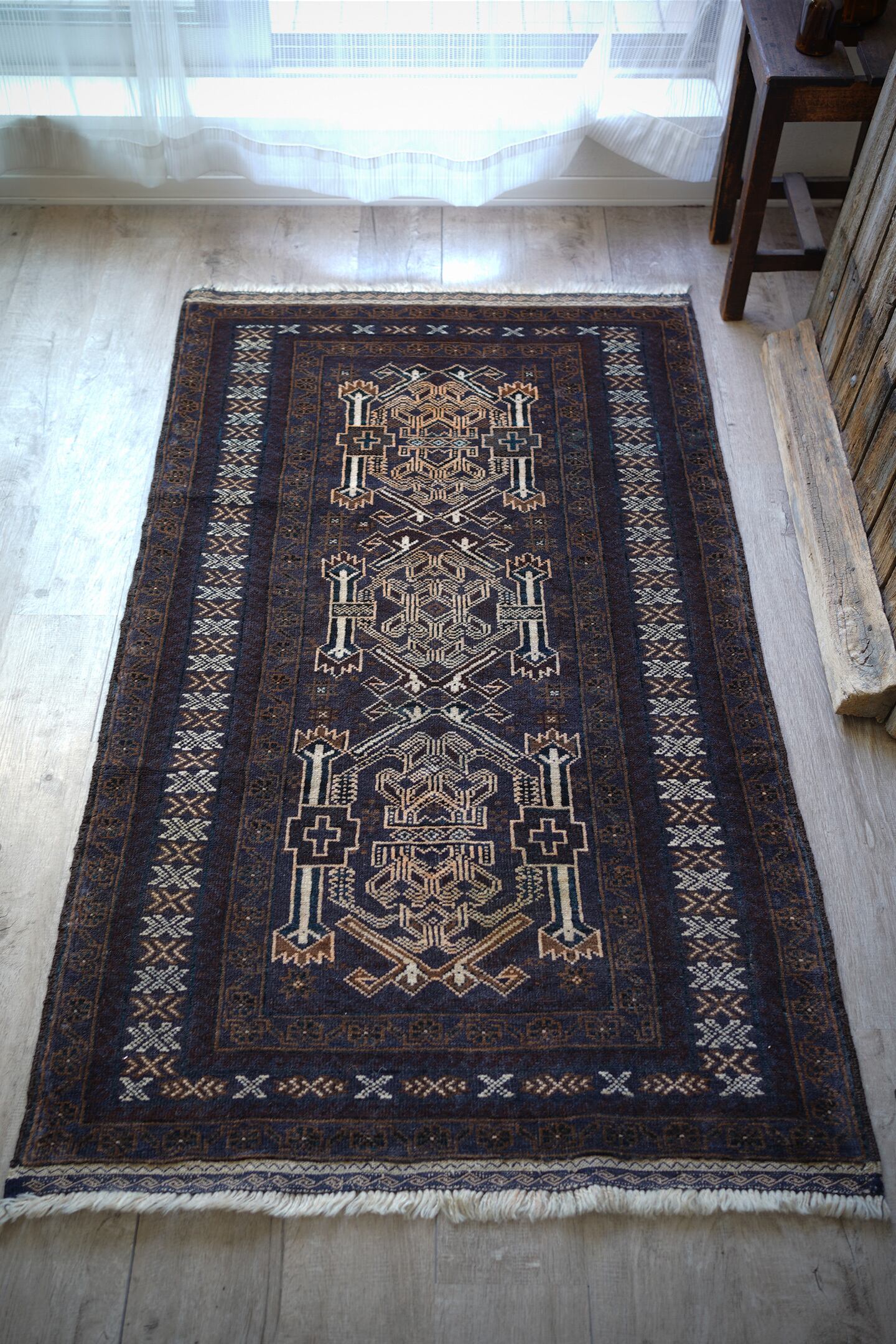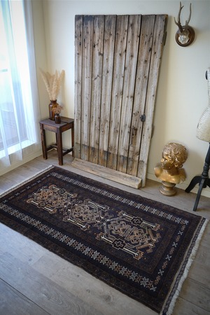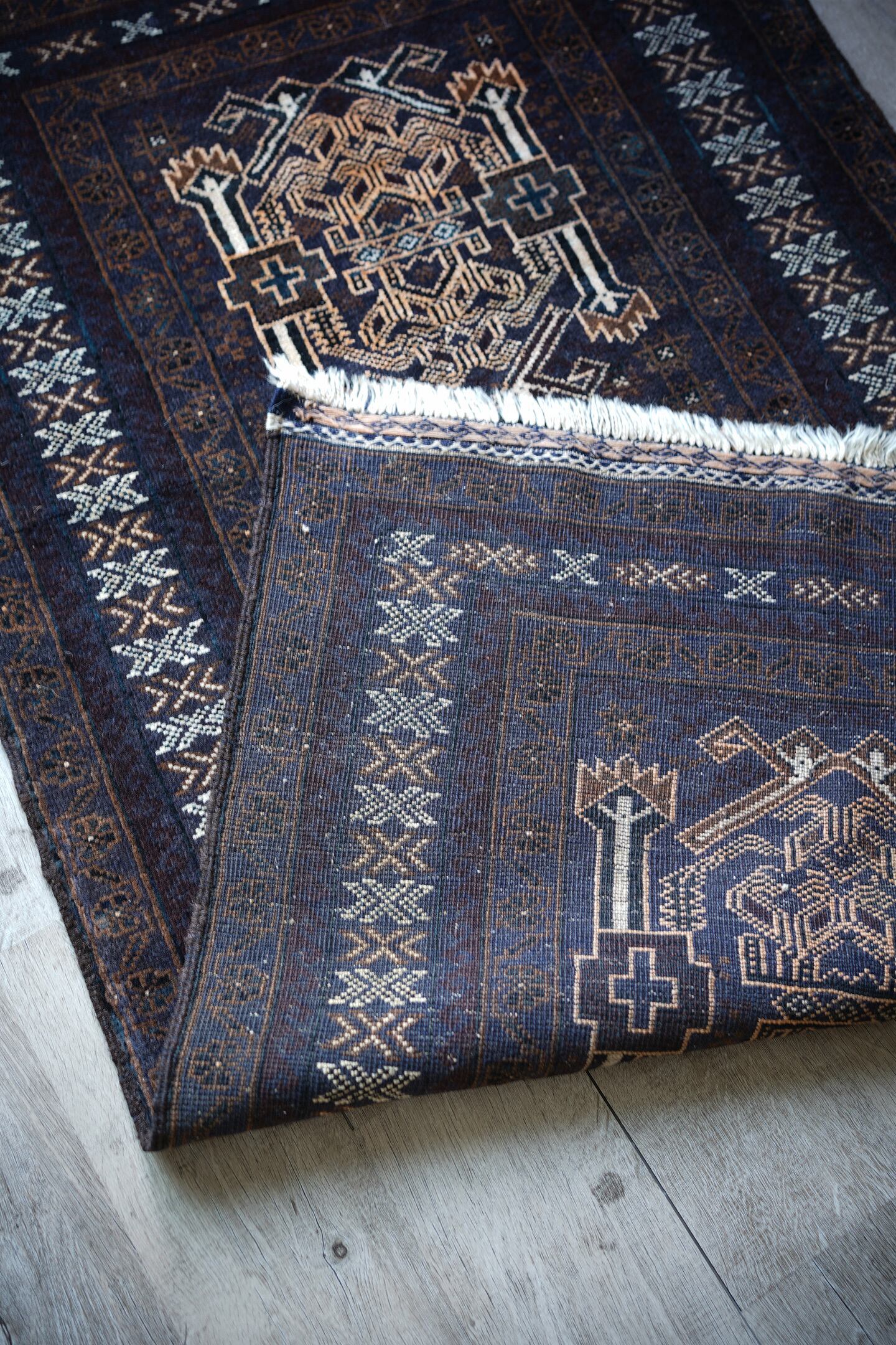 経年約40年のアフガニスタン産のバルーチラグ。当店でも時々仕入れるデザインのバルーチですが、同じデザインであれど色味や質感が異なったり、キリムエンドのデザインも異なったりと色んなバリエーションがある印象の一枚。なんと言ってもこのラグの注目ポイントはフリンジ部分のキリムエンド。珍しい配色でネイビーとホワイトで非常に可愛いです。全体の色構成は濃紺、ブラウン、ホワイト、ベージュ、薄いオレンジなど。うっすらと見えるブルーグリーンが店主の好きなポイントです。表面のパイルはサラッと滑らかな優しい肌触りで、厚みは5mm〜6mm程度。目立ったダメージや補修跡もなく、状態も大変良好です。リビングをはじめ、書斎や寝室などお好きなスペースにどうぞ。