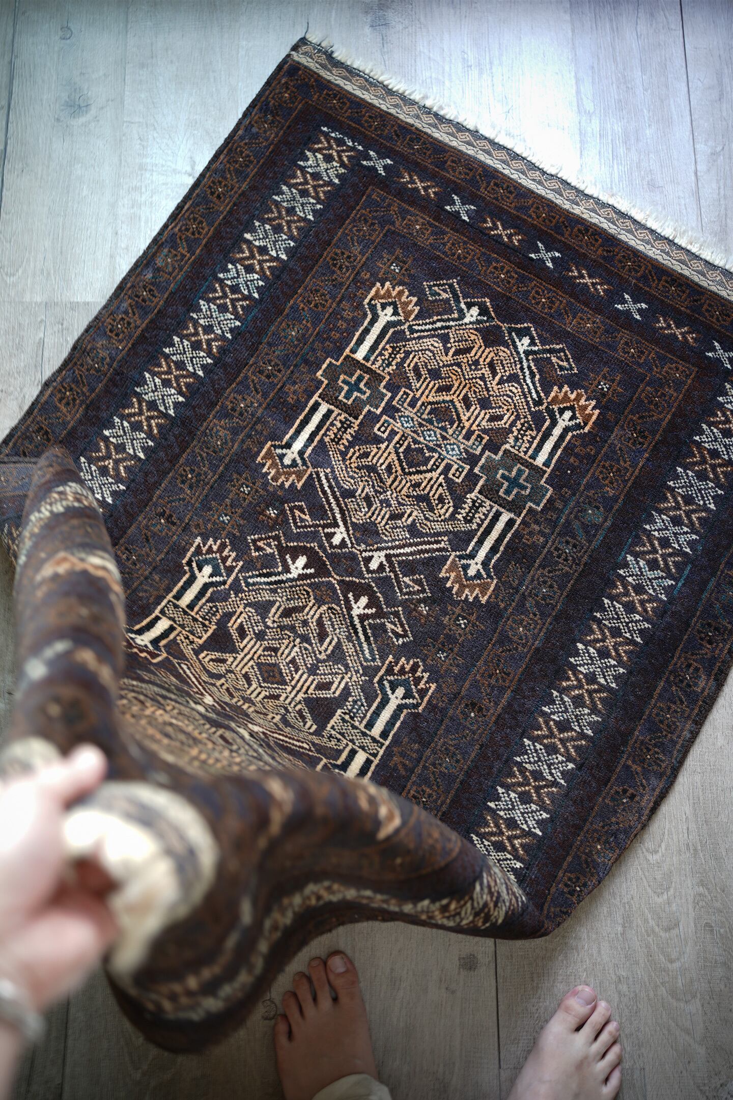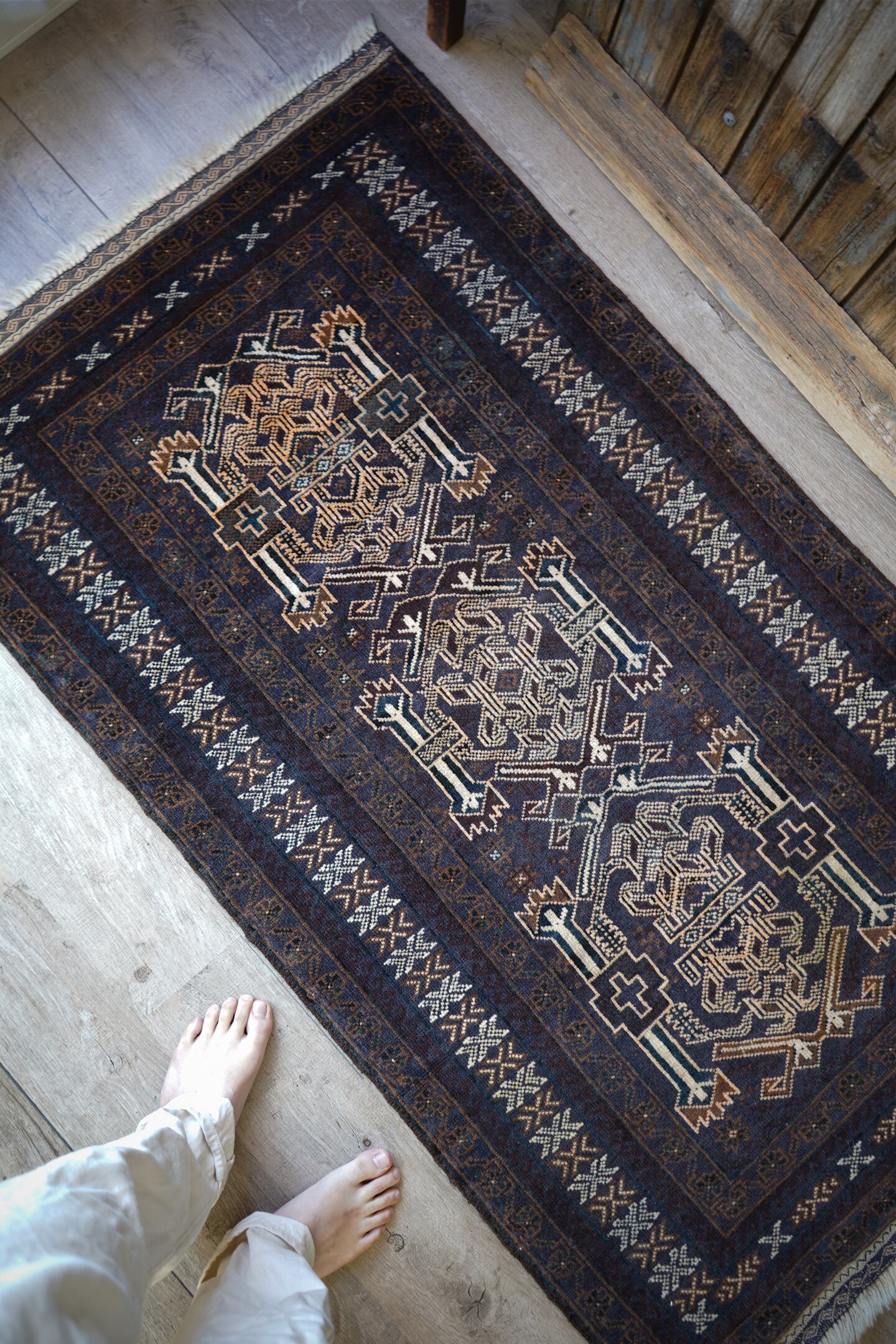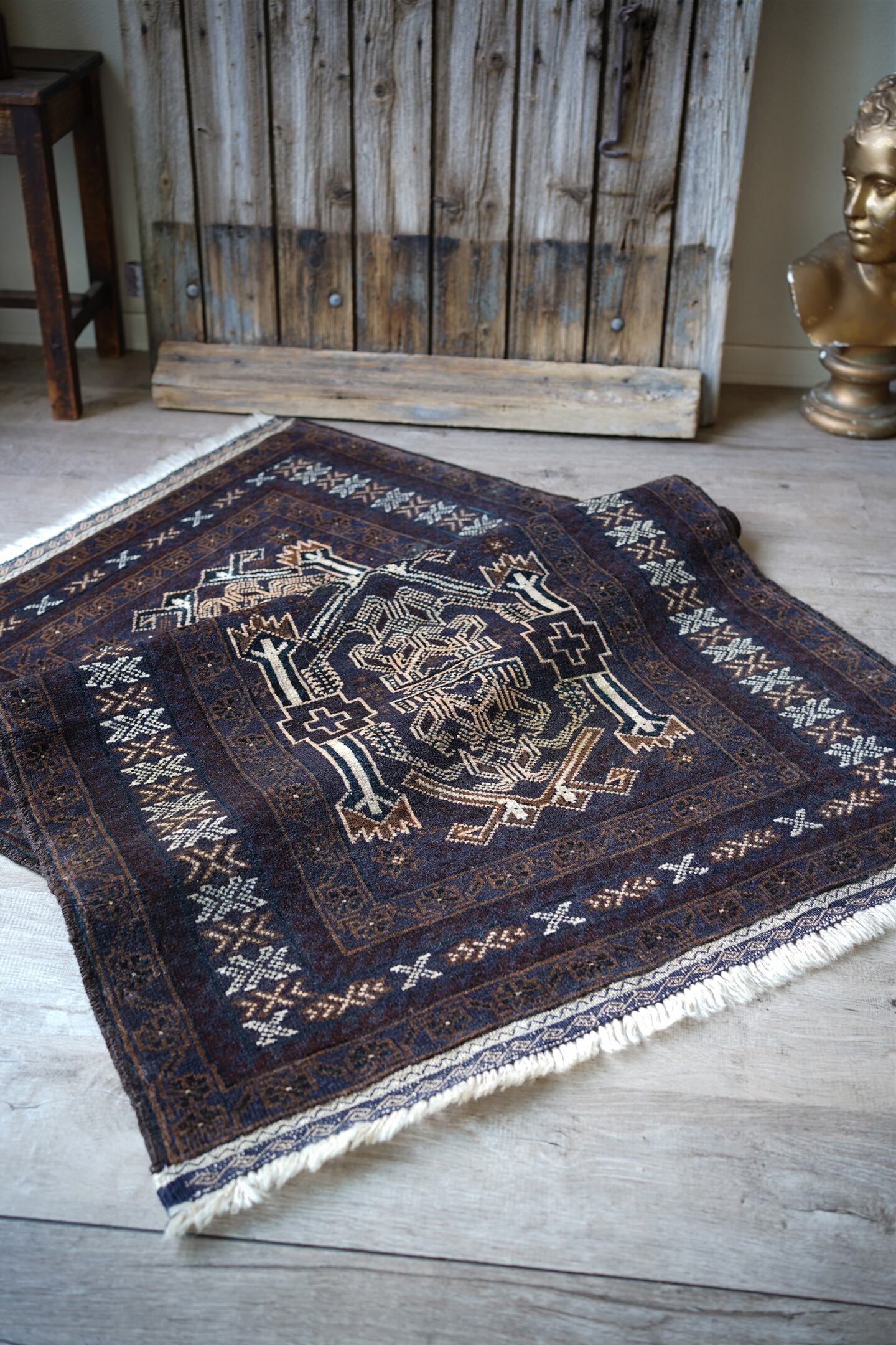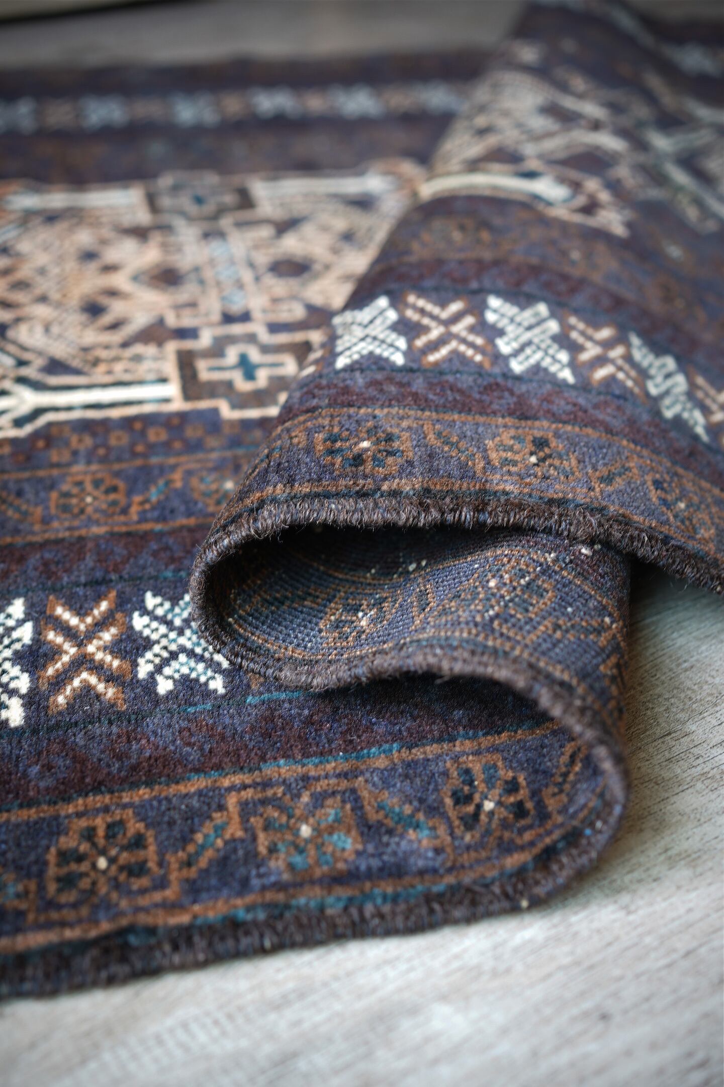 経年約40年のアフガニスタン産のバルーチラグ。当店でも時々仕入れるデザインのバルーチですが、同じデザインであれど色味や質感が異なったり、キリムエンドのデザインも異なったりと色んなバリエーションがある印象の一枚。なんと言ってもこのラグの注目ポイントはフリンジ部分のキリムエンド。珍しい配色でネイビーとホワイトで非常に可愛いです。全体の色構成は濃紺、ブラウン、ホワイト、ベージュ、薄いオレンジなど。うっすらと見えるブルーグリーンが店主の好きなポイントです。表面のパイルはサラッと滑らかな優しい肌触りで、厚みは5mm〜6mm程度。目立ったダメージや補修跡もなく、状態も大変良好です。リビングをはじめ、書斎や寝室などお好きなスペースにどうぞ。