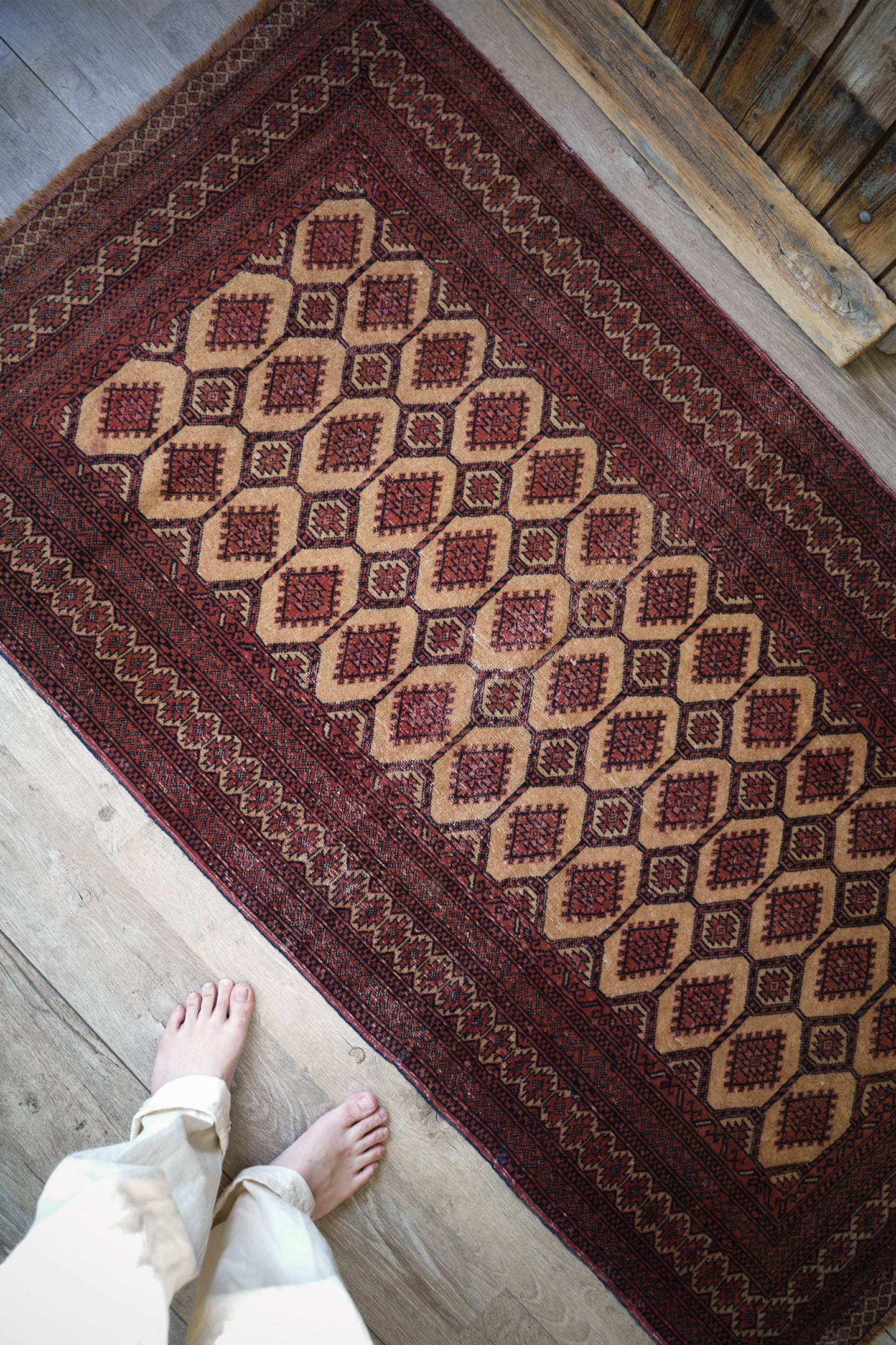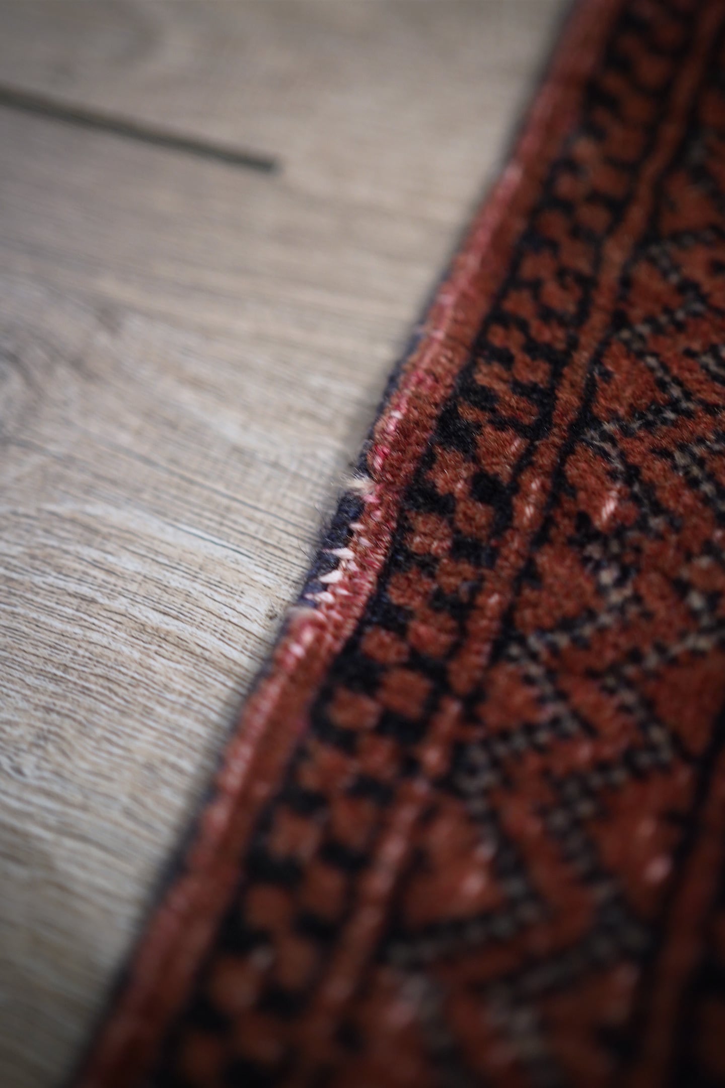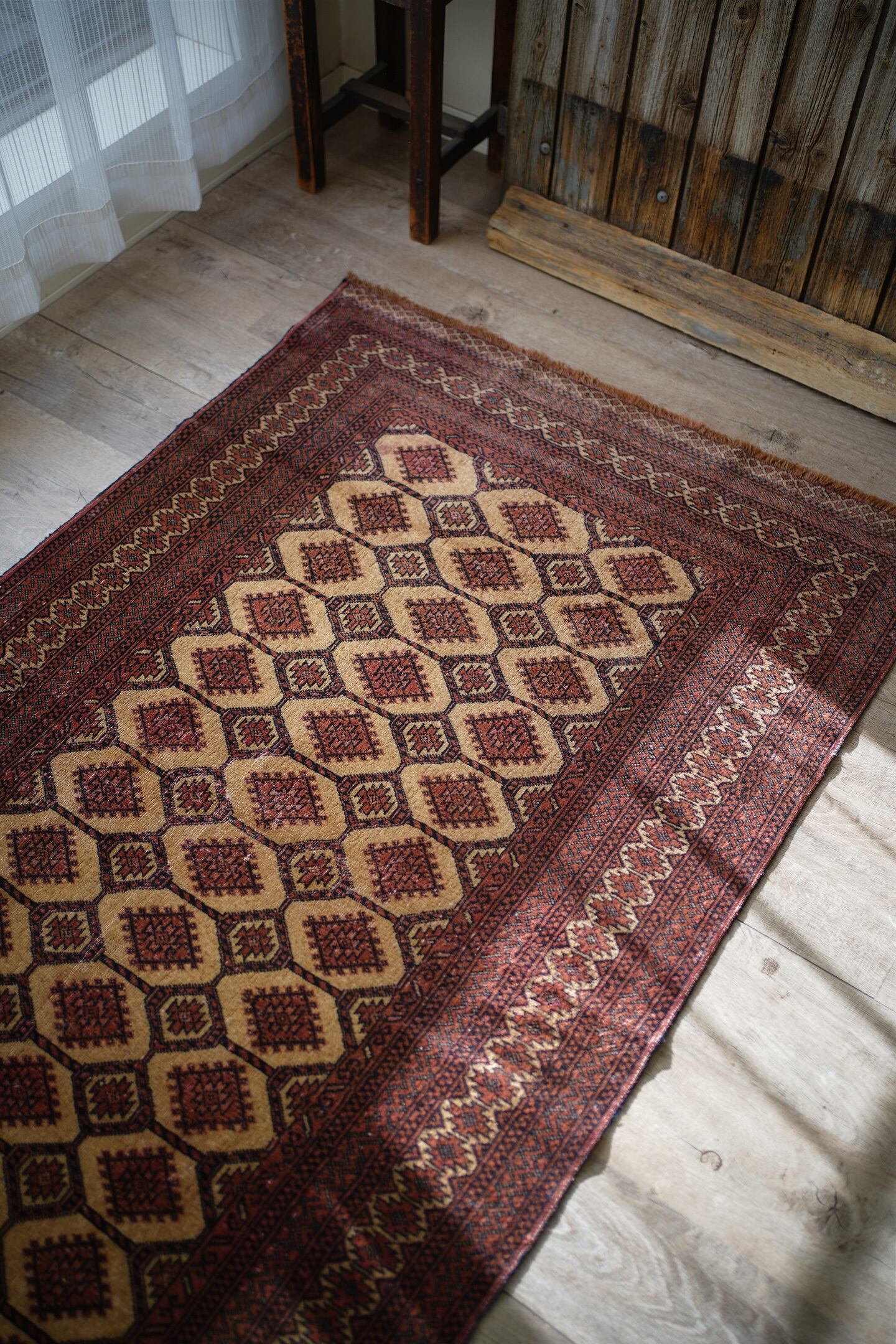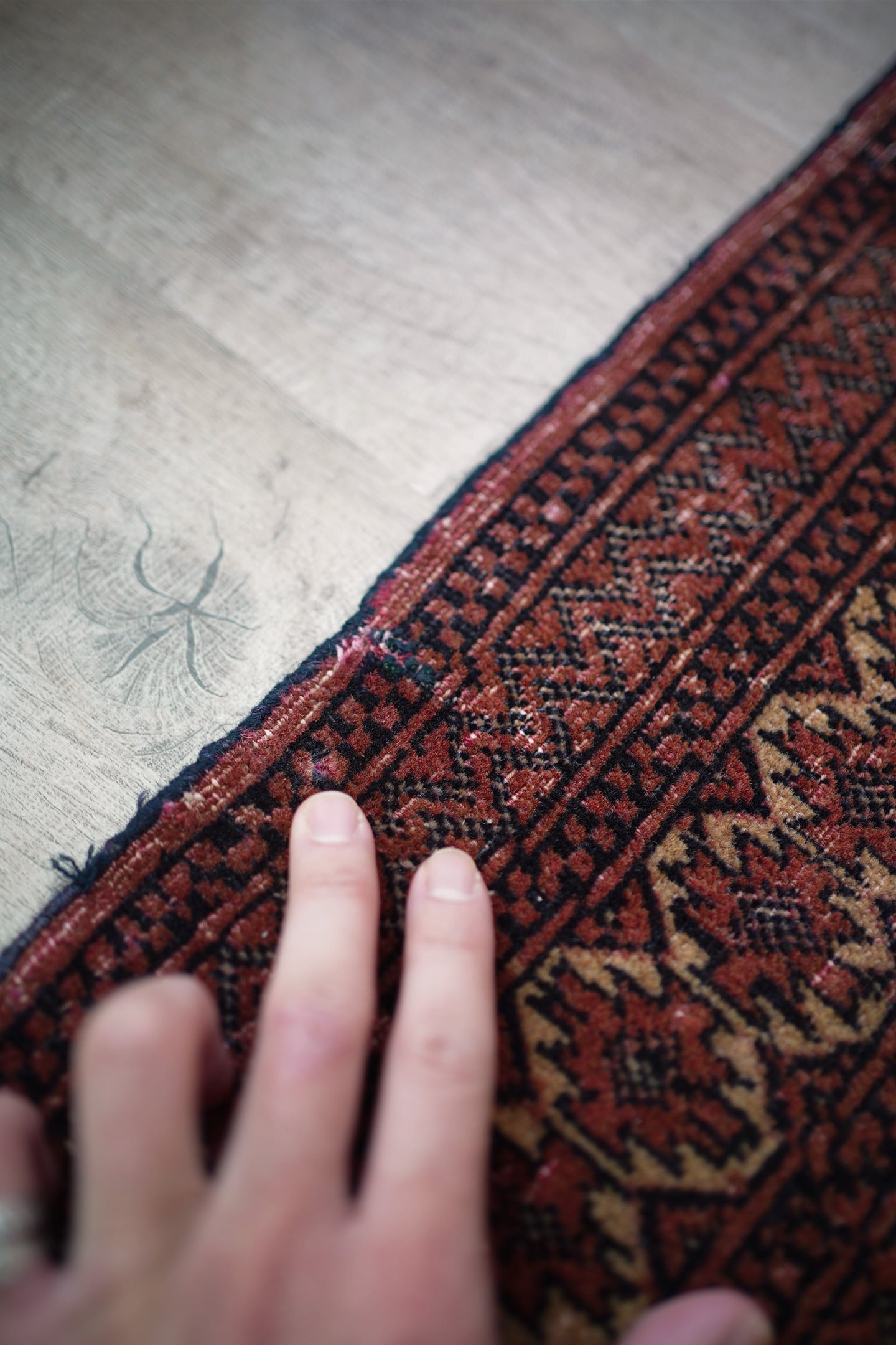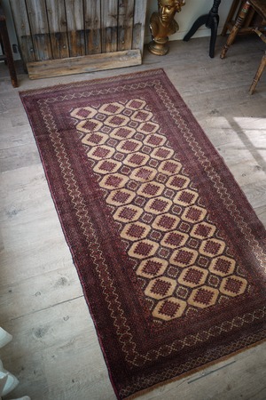アフガニスタンの元国王の名前が付けられた Zahir shah(ザーヒル・シャー)と呼ばれるデザインのバルーチラグです。経年約70年のラグで、所々擦れや補修跡などが見受けられ、ラグ全体も退色した薄らと褪せたような色味のため、ヴィンテージの渋い風合いを感じれられる一枚です。配色は退色した赤茶とベージュの柔らかい雰囲気。厚みは4mm〜5mm程度で、表面はサラふわっと柔らかく、優しい肌触りをしています。補修跡などのお写真をご確認の上、お求めいただければと思います。ベッドサイドやリビングのセカンドラグなどにどうぞ♫