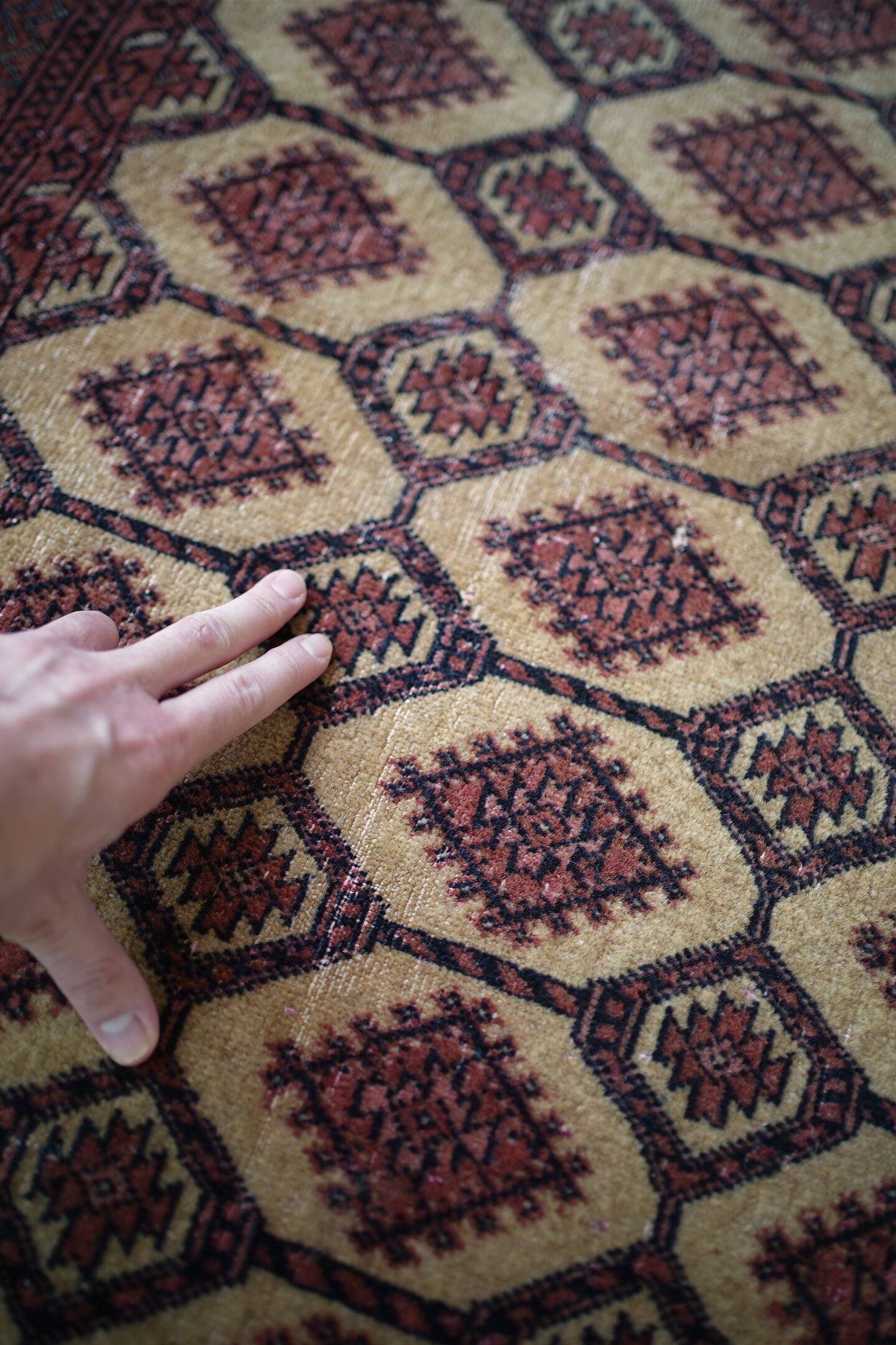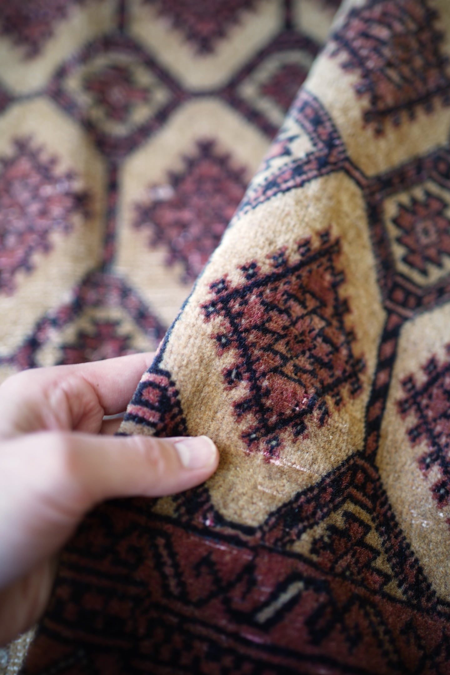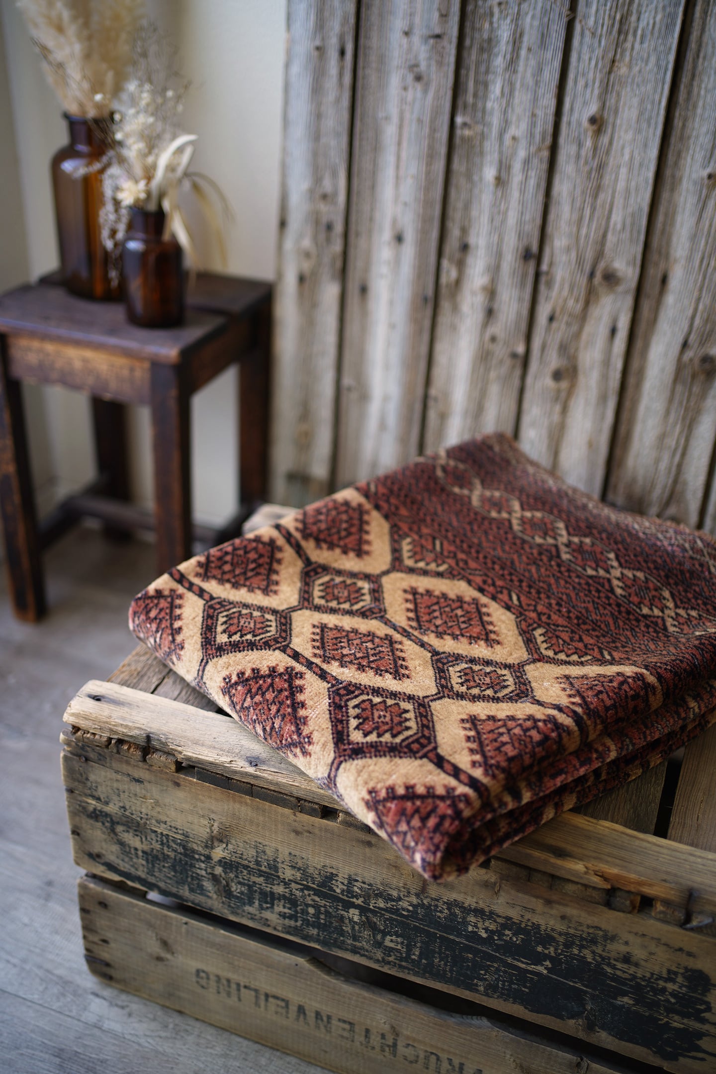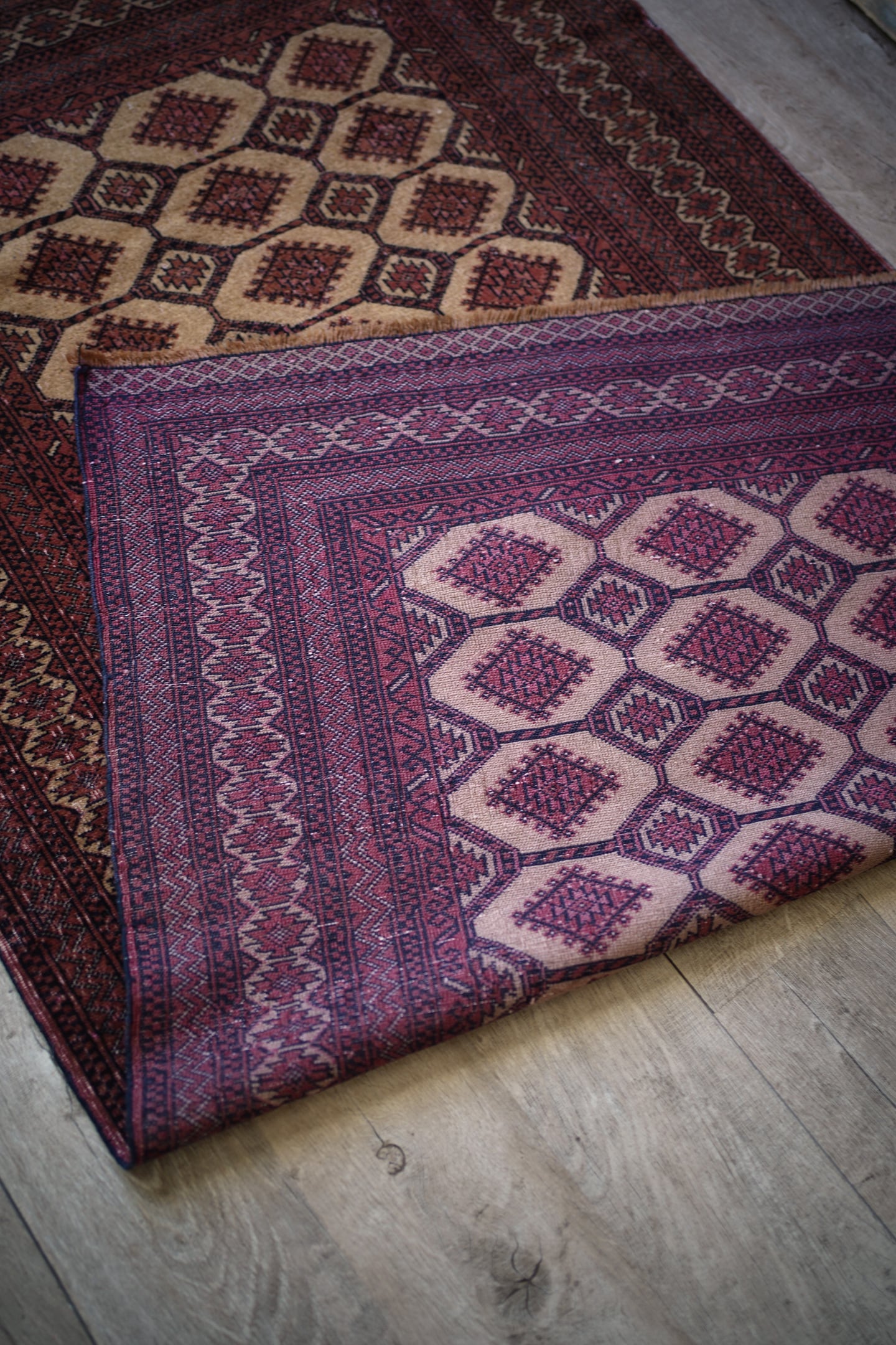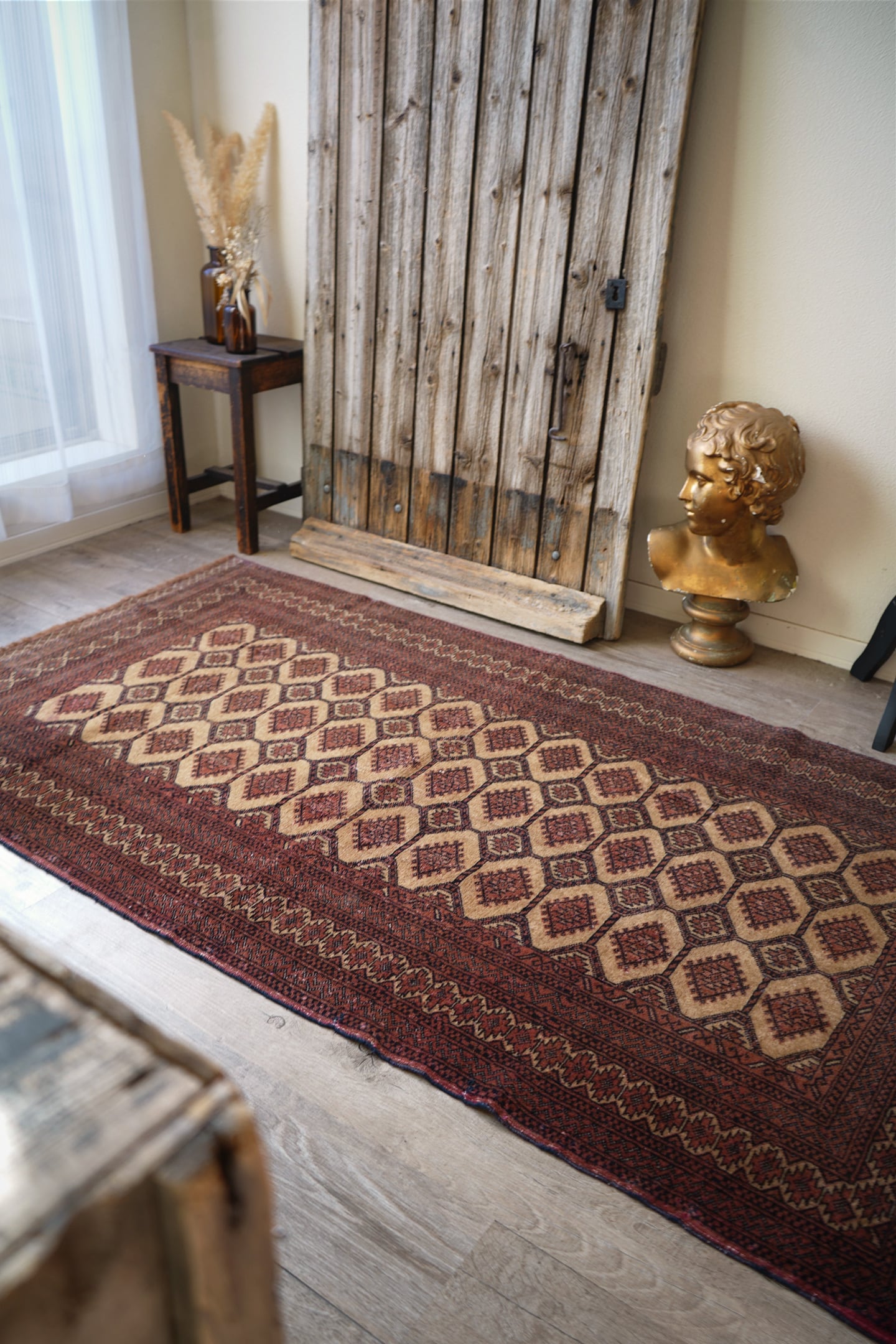 アフガニスタンの元国王の名前が付けられた Zahir shah(ザーヒル・シャー)と呼ばれるデザインのバルーチラグです。経年約70年のラグで、所々擦れや補修跡などが見受けられ、ラグ全体も退色した薄らと褪せたような色味のため、ヴィンテージの渋い風合いを感じれられる一枚です。配色は退色した赤茶とベージュの柔らかい雰囲気。厚みは4mm〜5mm程度で、表面はサラふわっと柔らかく、優しい肌触りをしています。補修跡などのお写真をご確認の上、お求めいただければと思います。ベッドサイドやリビングのセカンドラグなどにどうぞ♫