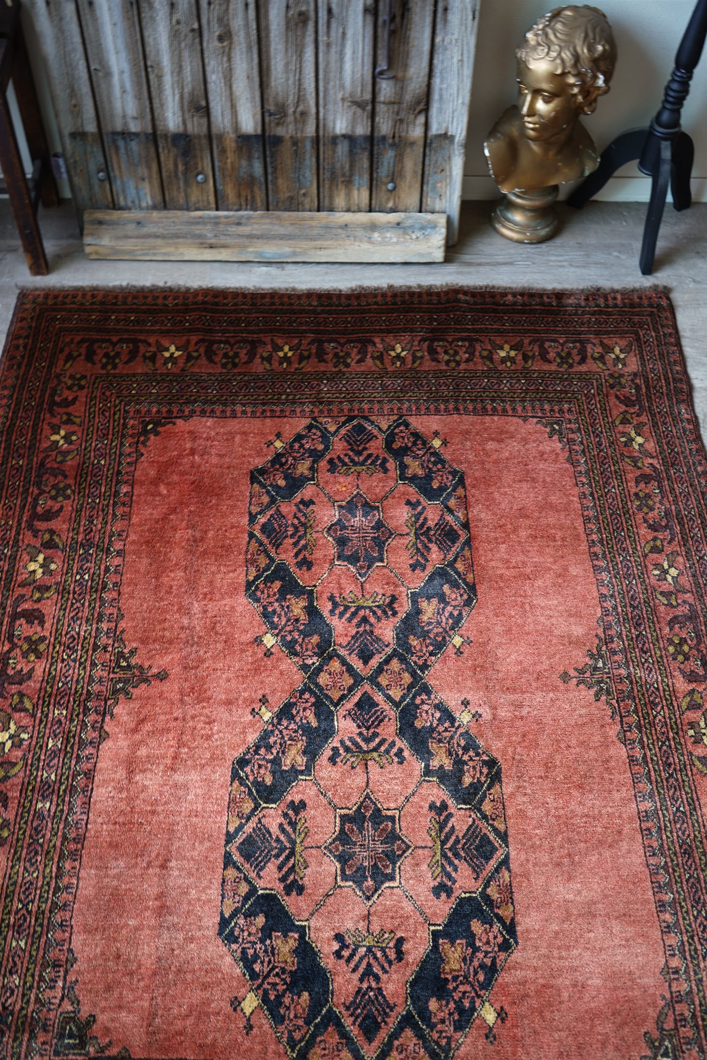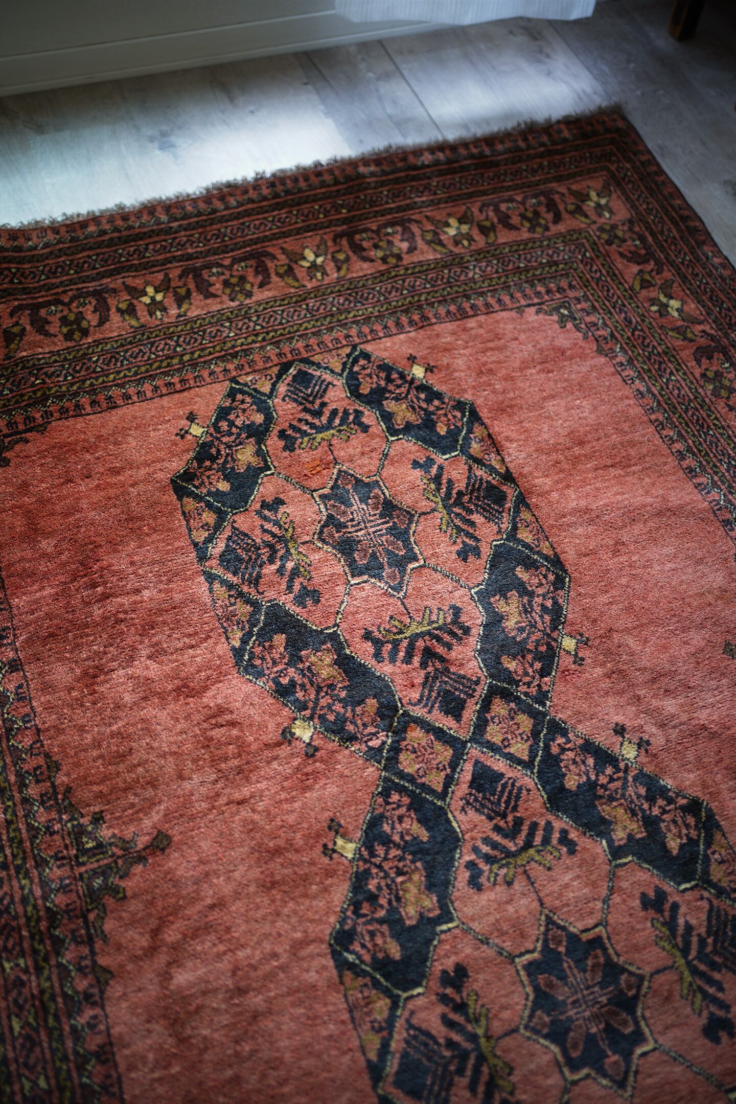 2つの美しいフォルムのメダリオンが特徴的なトルクメンラグ。ボーダーやメダリオンなど、フローラルなデザインで、メリハリのある洗練された構成が素敵な一枚。色味は退色した柔らかい雰囲気の赤をベースに、ブラック、ブラウン、焦茶など。重量感のあるしっかりとした作りで、厚みは7mm程度です。艶を感じるパイルで、表面はふわっと滑らかで優しい肌触り。ほとんど目立ちませんが一部補修跡がありますので、お写真最後をご確認ください。リビングのソファ前やベッドサイドなど寛ぎの際のスペースにぜひ。店主オススメの一枚です♫