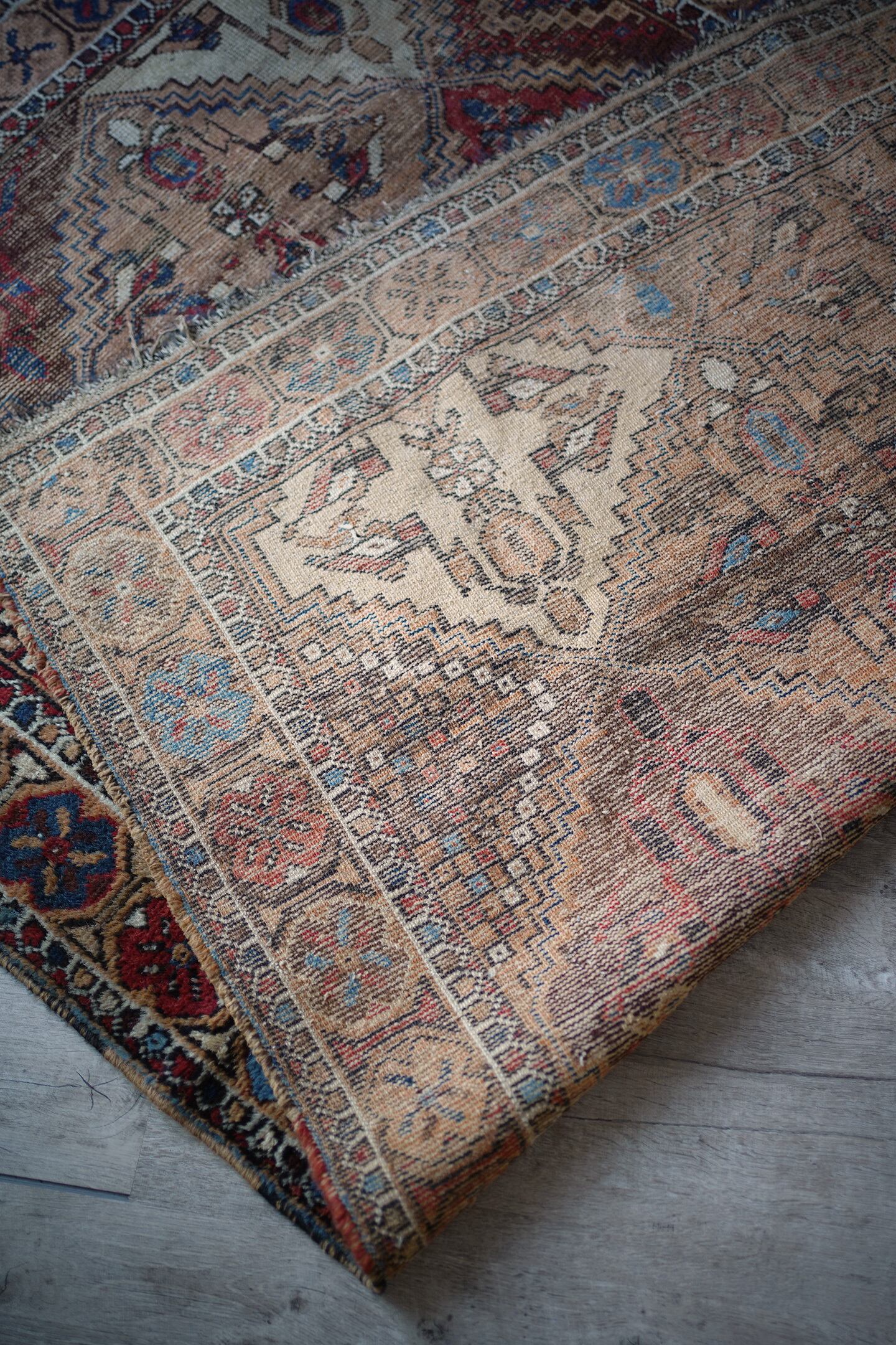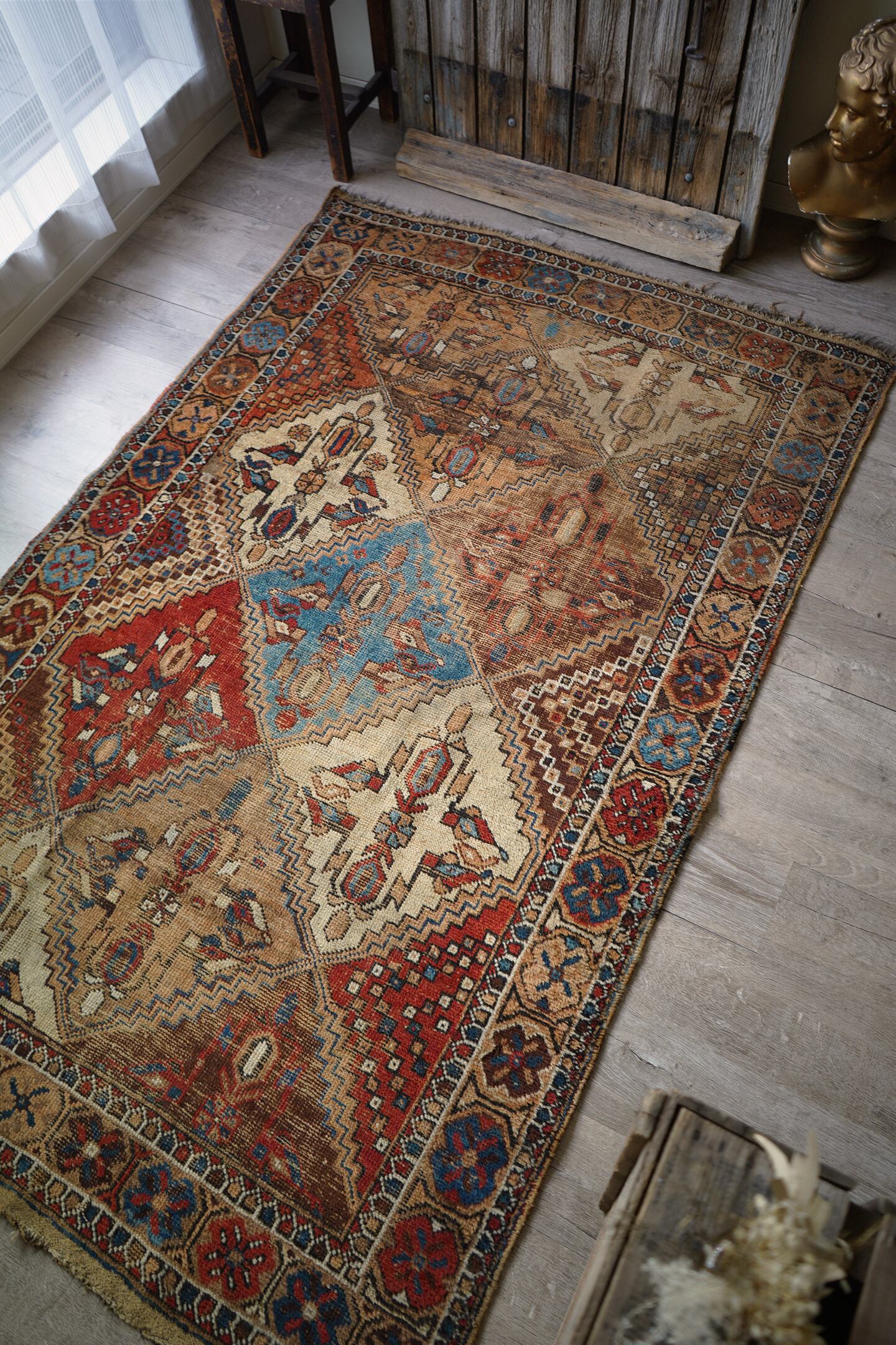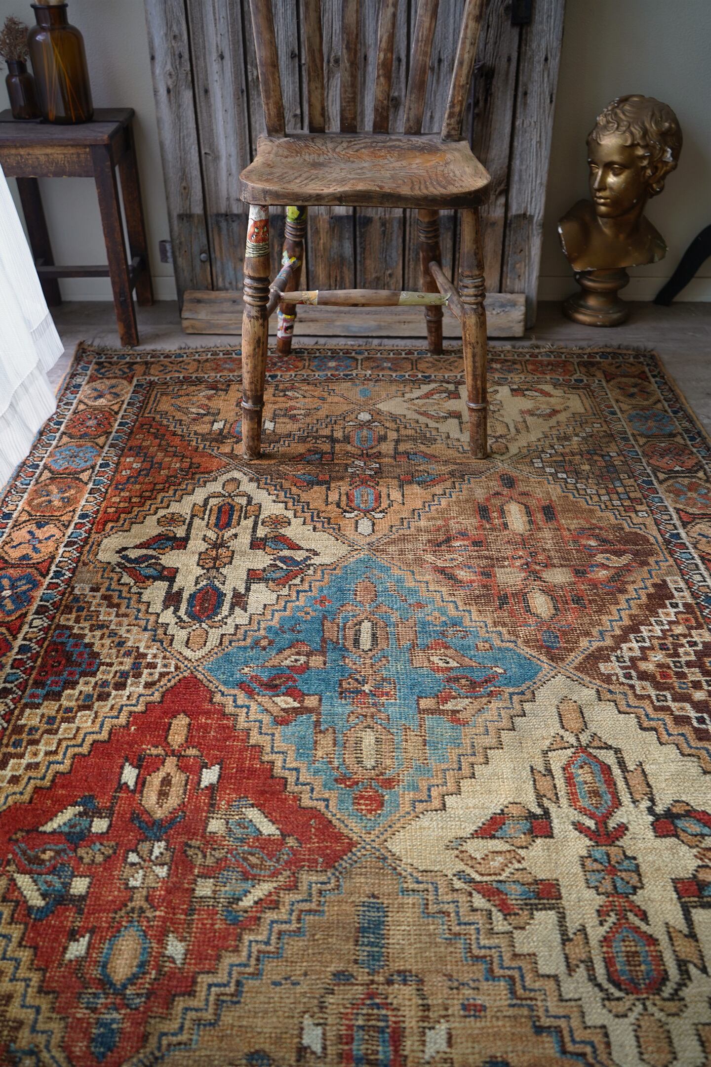 おおよそ100年前にアフシャール族によって織られたアンティークラグ。多くの擦れやフリンジの損傷により非常に年季の入った渋い風合いでありながら、カラフルな菱形デザインで可愛らしさも兼ね備えた素敵な一枚。全体的にくすんだ色合いで、ベージュ、ブラウン、レッド、焦茶などが使われており、中央の菱形だけくすんだライトブルーでアクセントカラーになっています。コンディションとしては風合いを活かすため、下部のフリンジ部分は新たに作らずそのままにしております(房止め処理が施されていますが、ほつれなども見られますので、アンティークの風合いとしてお楽しみいただけましたら幸いです)。また所々補修したような跡はありますが、目立ったものはなく馴染んでおりほとんどわからない程度です。表面のパイルはフィールド部分はパイルは残っておらず、サラッとした肌触り。ボーダー部分は比較的残っている箇所もあり、ふわっと滑らかな肌触りをしています。厚みは6mm程度。唯一無二の歴史を感じる風合いのラグがお好きな方にお迎えいただければと思います。