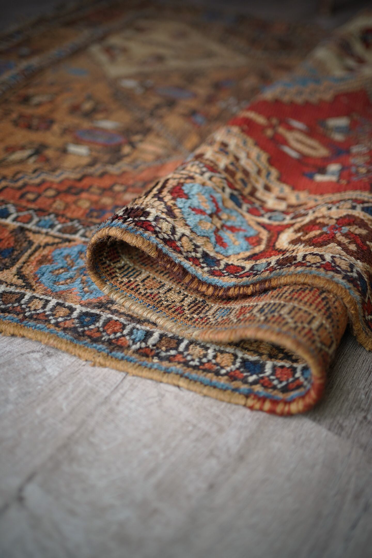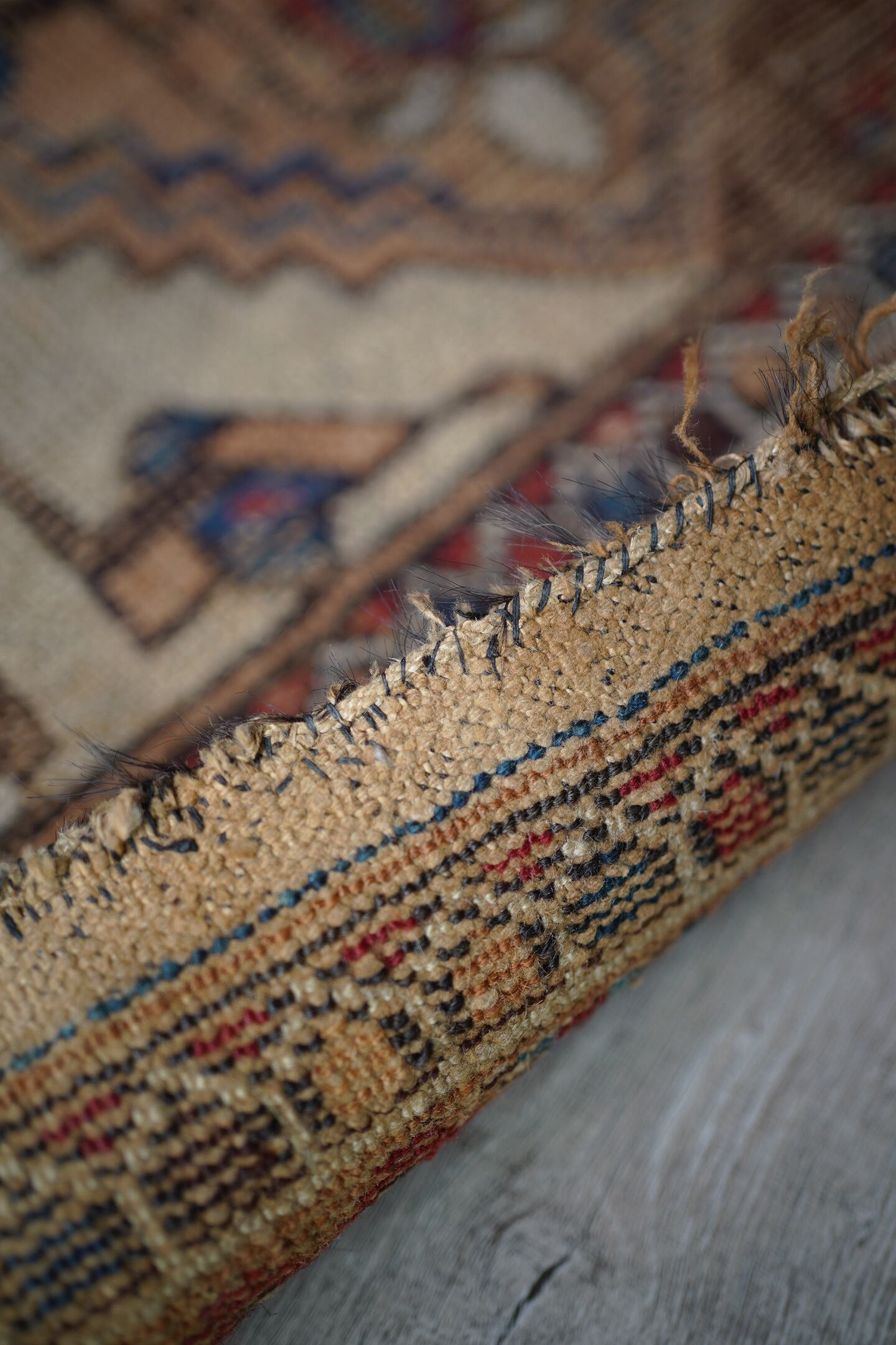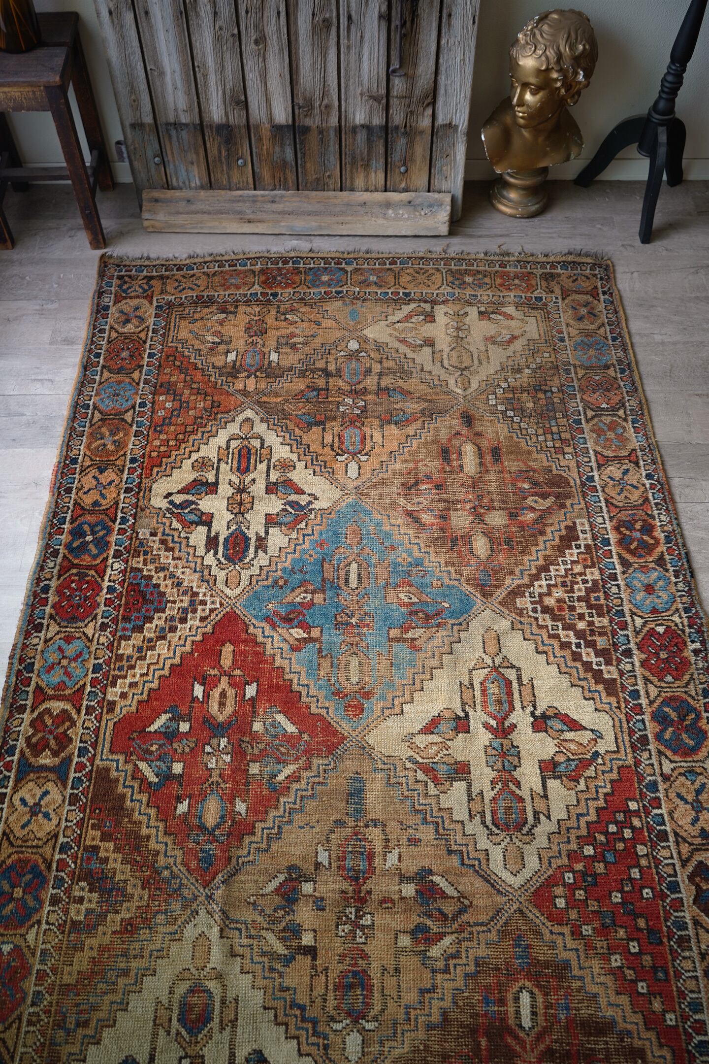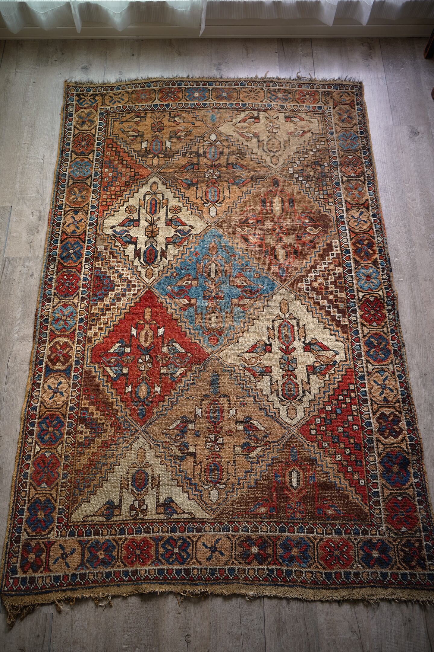 おおよそ100年前にアフシャール族によって織られたアンティークラグ。多くの擦れやフリンジの損傷により非常に年季の入った渋い風合いでありながら、カラフルな菱形デザインで可愛らしさも兼ね備えた素敵な一枚。全体的にくすんだ色合いで、ベージュ、ブラウン、レッド、焦茶などが使われており、中央の菱形だけくすんだライトブルーでアクセントカラーになっています。コンディションとしては風合いを活かすため、下部のフリンジ部分は新たに作らずそのままにしております(房止め処理が施されていますが、ほつれなども見られますので、アンティークの風合いとしてお楽しみいただけましたら幸いです)。また所々補修したような跡はありますが、目立ったものはなく馴染んでおりほとんどわからない程度です。表面のパイルはフィールド部分はパイルは残っておらず、サラッとした肌触り。ボーダー部分は比較的残っている箇所もあり、ふわっと滑らかな肌触りをしています。厚みは6mm程度。唯一無二の歴史を感じる風合いのラグがお好きな方にお迎えいただければと思います。