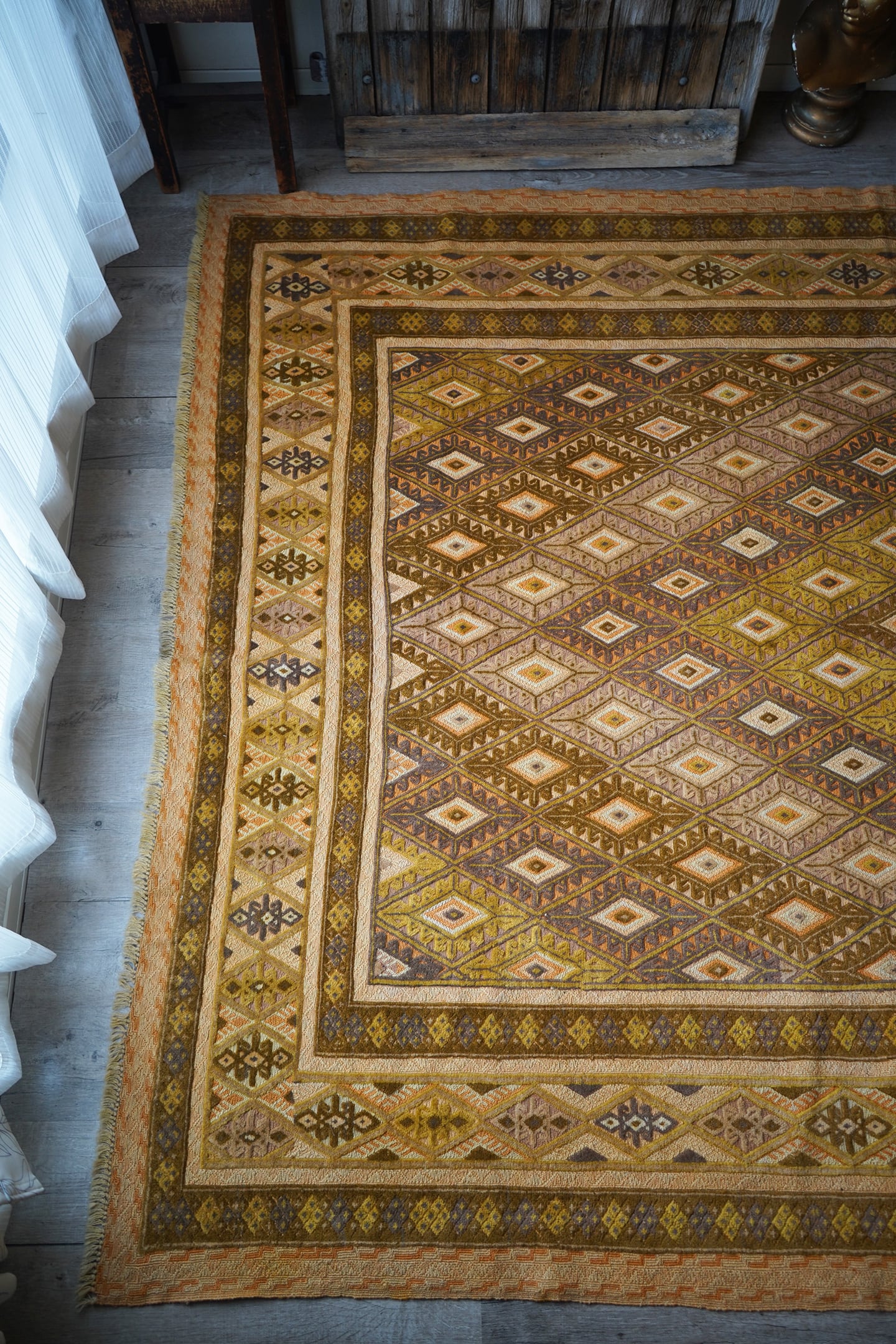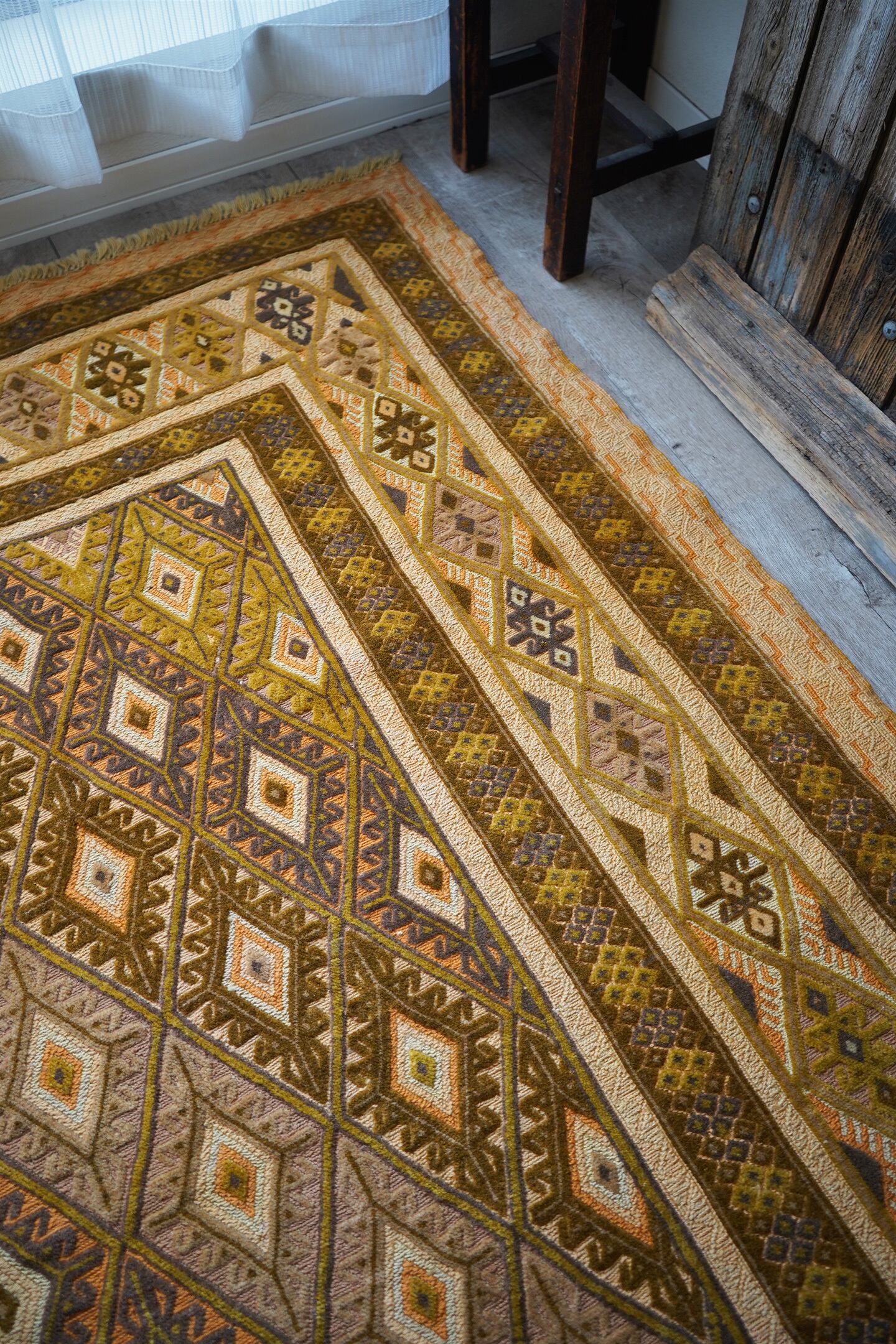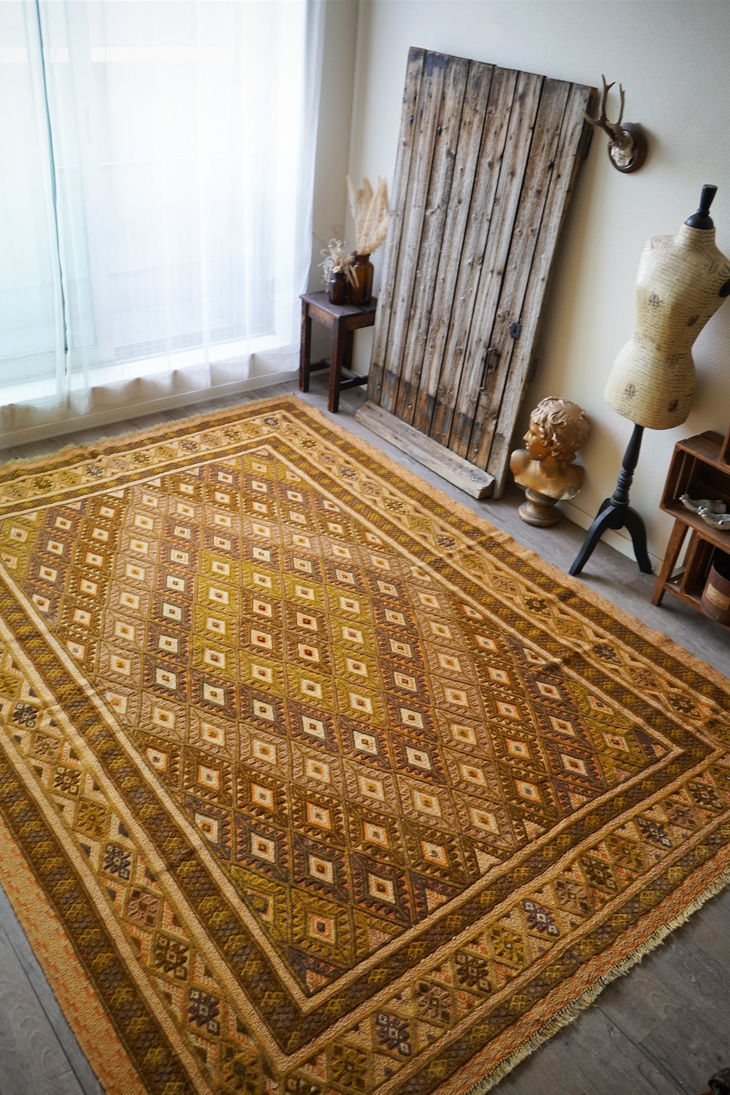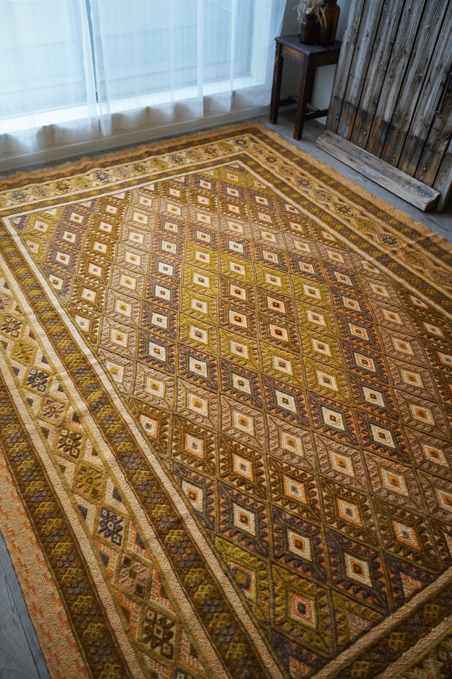 アフガニスタン北西部の都市ヘラート地域で織られた大判のマシュワニラグ。マシュワニラグは平織り(キリム)とパイル織り(絨毯)をミックスした技法で織られているため、ポコポコとした凹凸が特徴的です。美しい配列で織り込まれた菱形文様はまさに圧巻の一言。配色は黄土色、ブラウン、焦茶、ベージュ、オレンジベージュ、オレンジなど。肉眼で見るとお写真よりもオレンジが少々強く見える印象がございます。表面はサラふわっとした肌触り。厚みは5mm〜6mm程度となります。補修跡やダメージも見られず、大変良好なコンディション。大きいサイズ感のためリビングをはじめ、ダイニングテーブルの下などにオススメです。