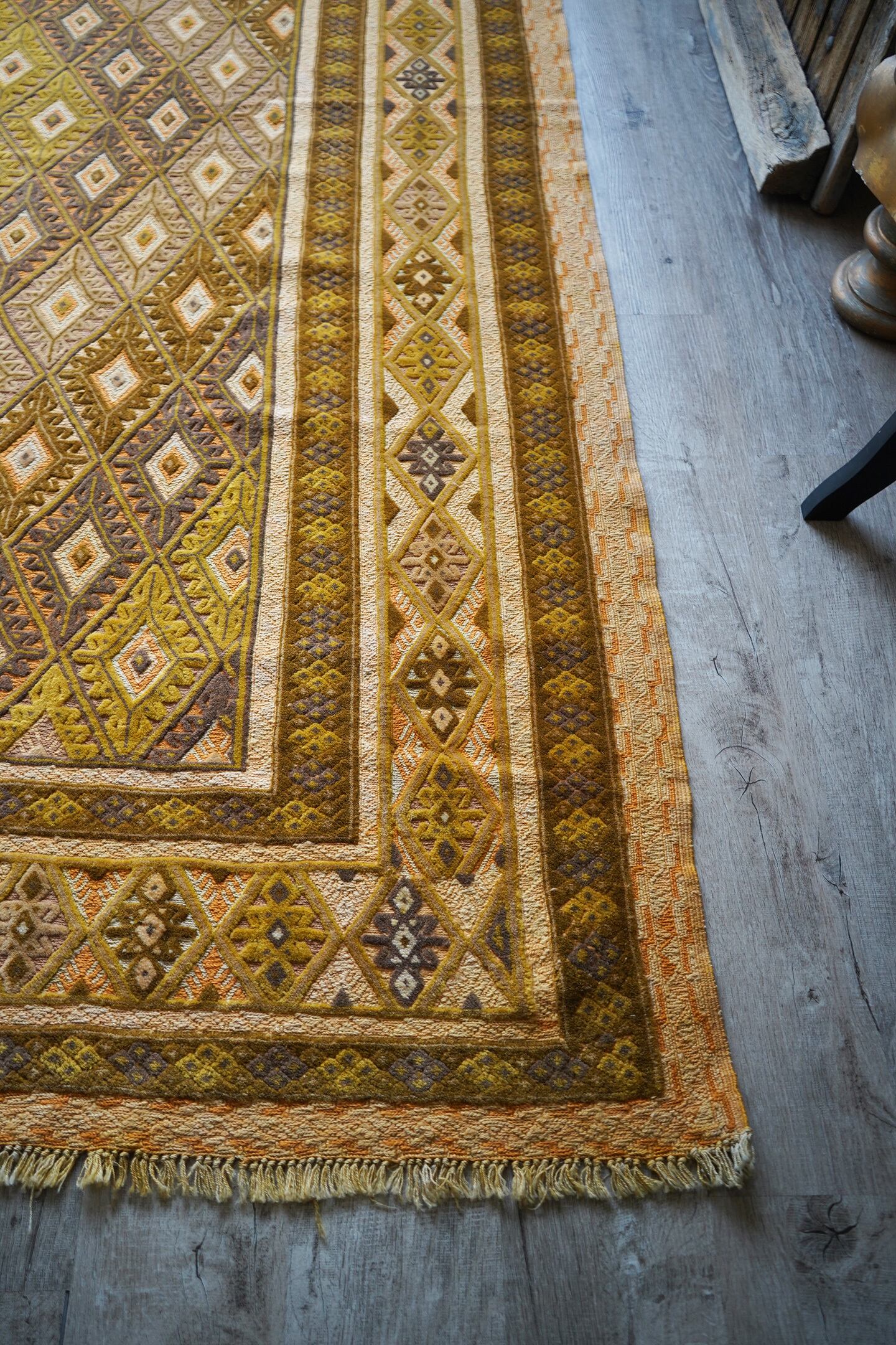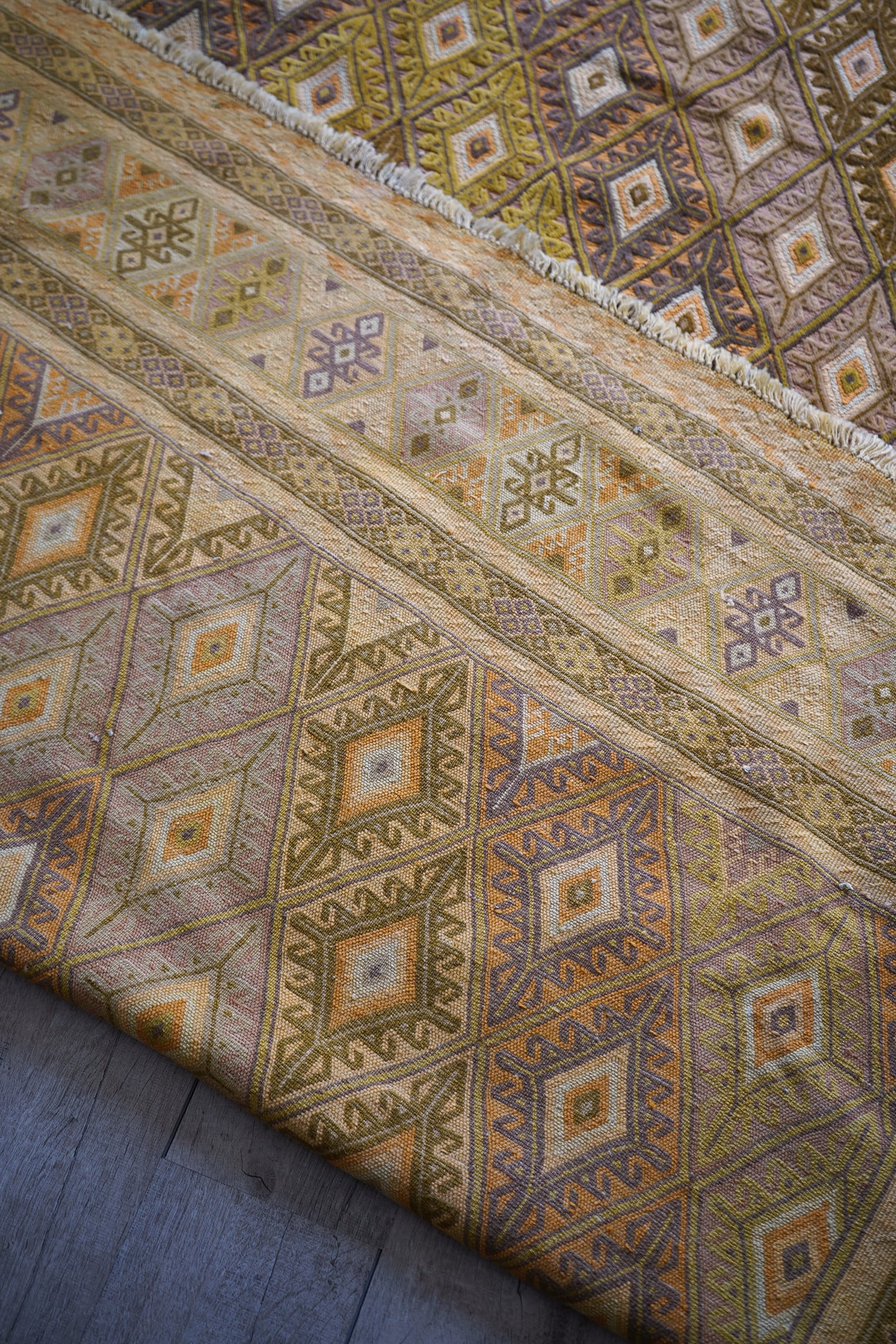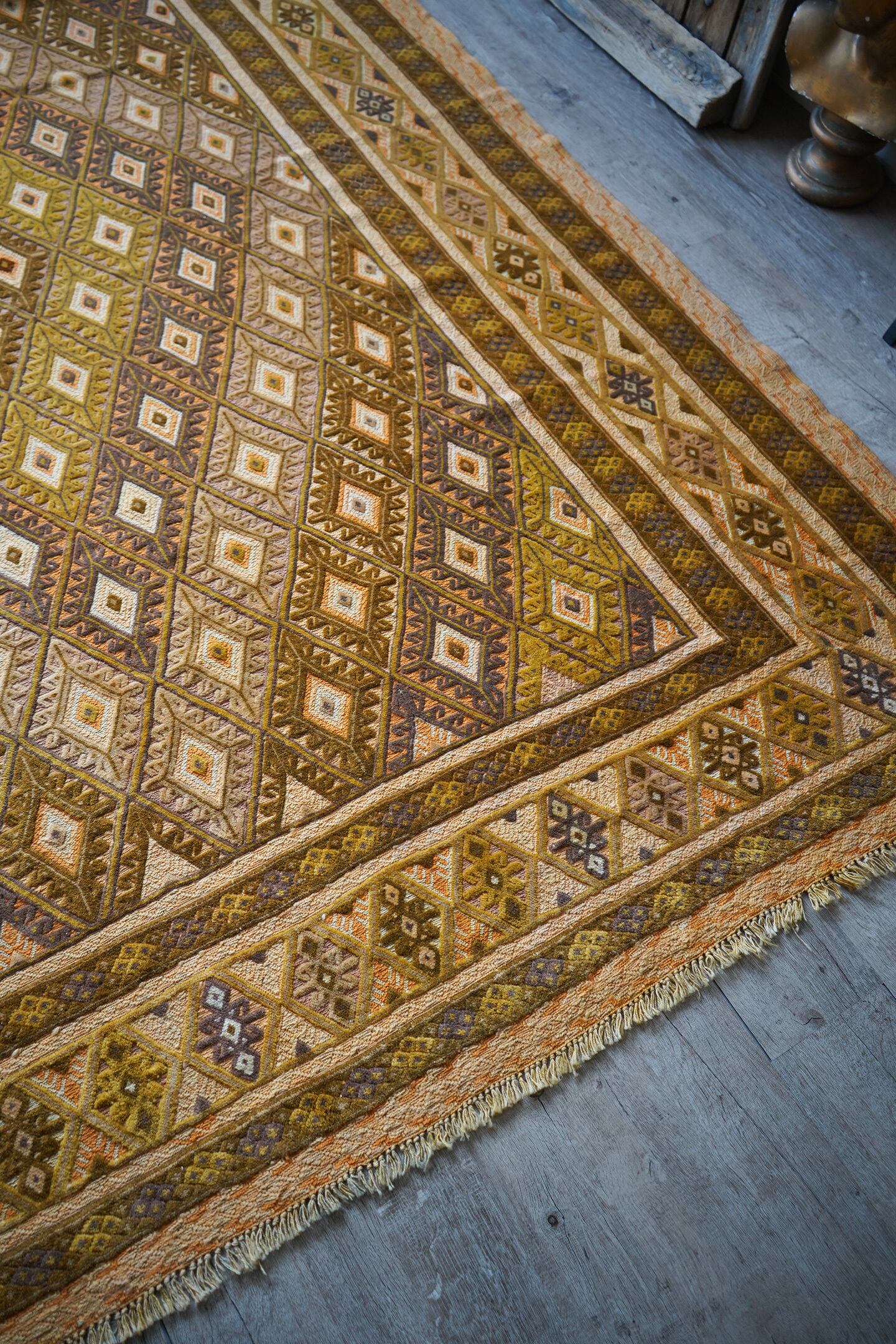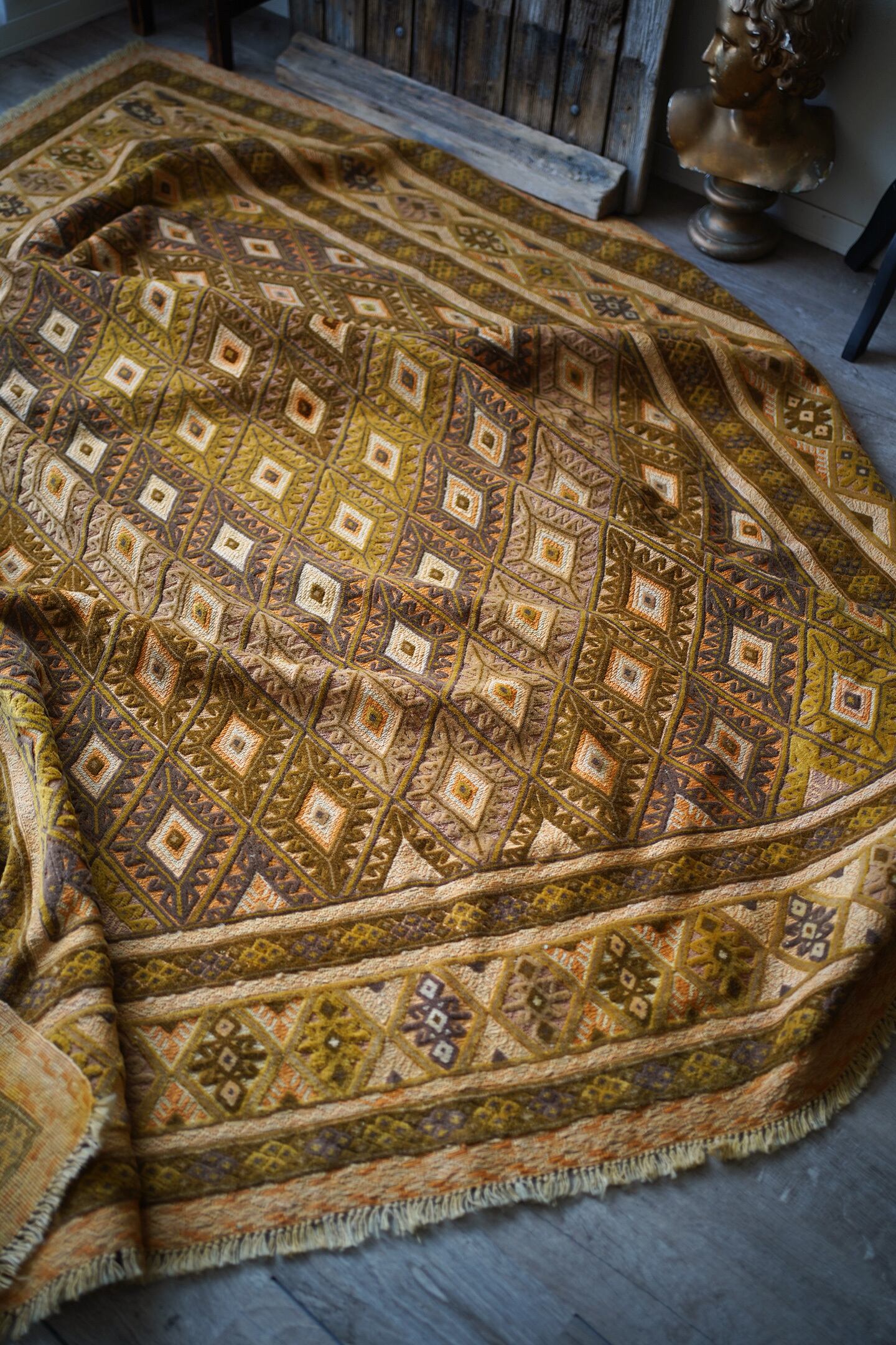 アフガニスタン北西部の都市ヘラート地域で織られた大判のマシュワニラグ。マシュワニラグは平織り(キリム)とパイル織り(絨毯)をミックスした技法で織られているため、ポコポコとした凹凸が特徴的です。美しい配列で織り込まれた菱形文様はまさに圧巻の一言。配色は黄土色、ブラウン、焦茶、ベージュ、オレンジベージュ、オレンジなど。肉眼で見るとお写真よりもオレンジが少々強く見える印象がございます。表面はサラふわっとした肌触り。厚みは5mm〜6mm程度となります。補修跡やダメージも見られず、大変良好なコンディション。大きいサイズ感のためリビングをはじめ、ダイニングテーブルの下などにオススメです。