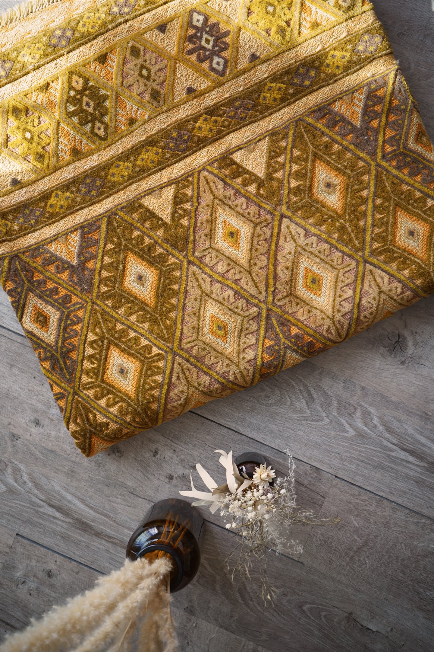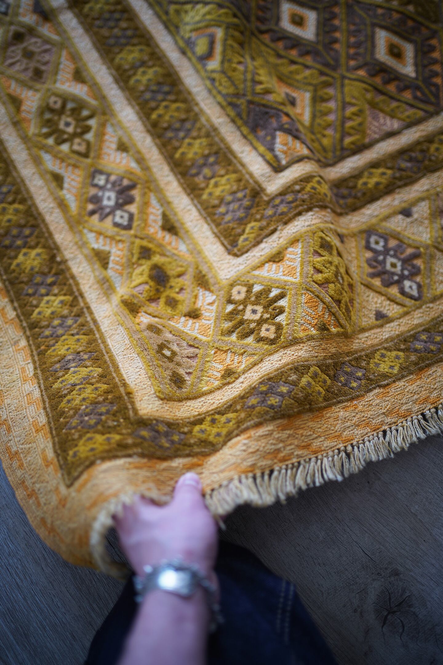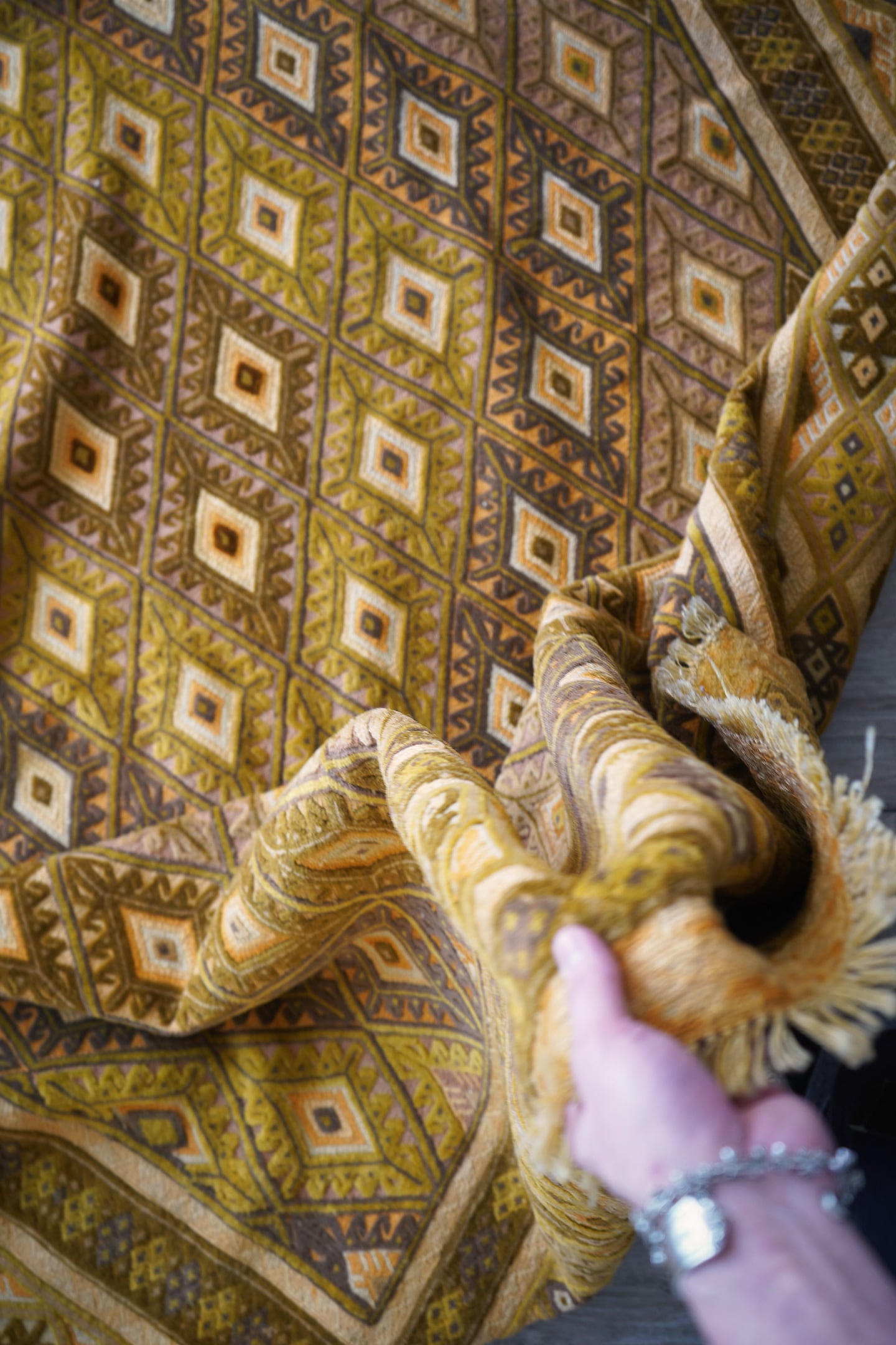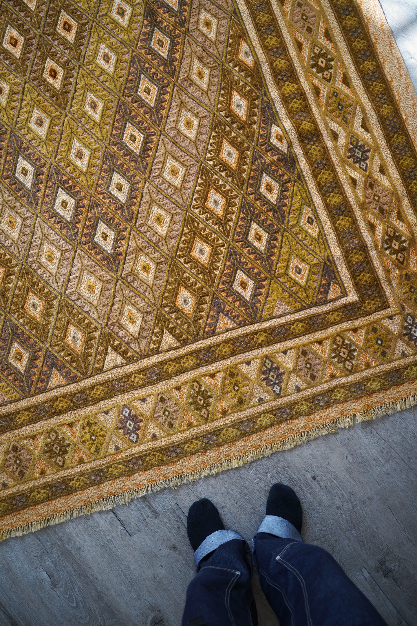 アフガニスタン北西部の都市ヘラート地域で織られた大判のマシュワニラグ。マシュワニラグは平織り(キリム)とパイル織り(絨毯)をミックスした技法で織られているため、ポコポコとした凹凸が特徴的です。美しい配列で織り込まれた菱形文様はまさに圧巻の一言。配色は黄土色、ブラウン、焦茶、ベージュ、オレンジベージュ、オレンジなど。肉眼で見るとお写真よりもオレンジが少々強く見える印象がございます。表面はサラふわっとした肌触り。厚みは5mm〜6mm程度となります。補修跡やダメージも見られず、大変良好なコンディション。大きいサイズ感のためリビングをはじめ、ダイニングテーブルの下などにオススメです。