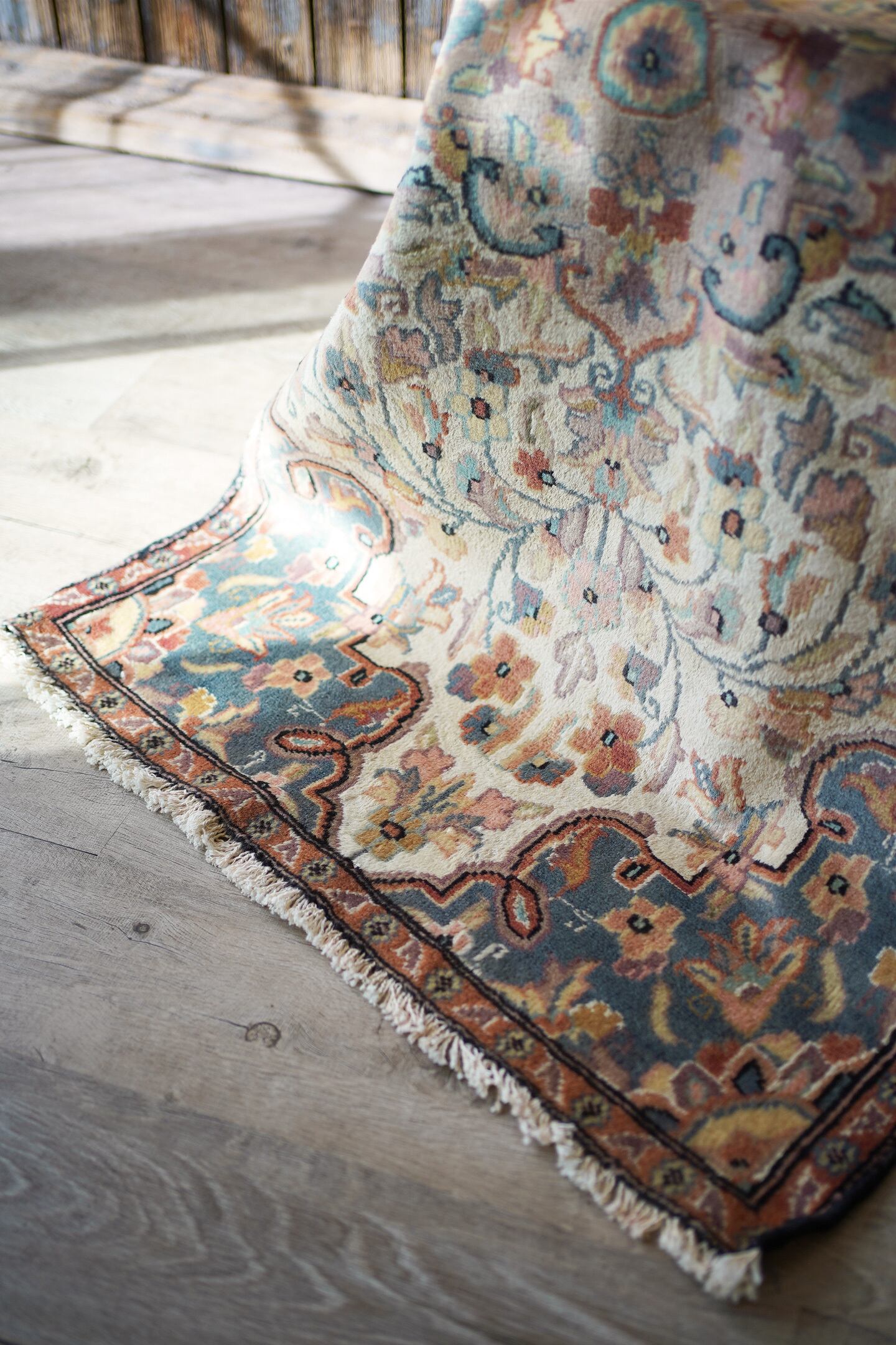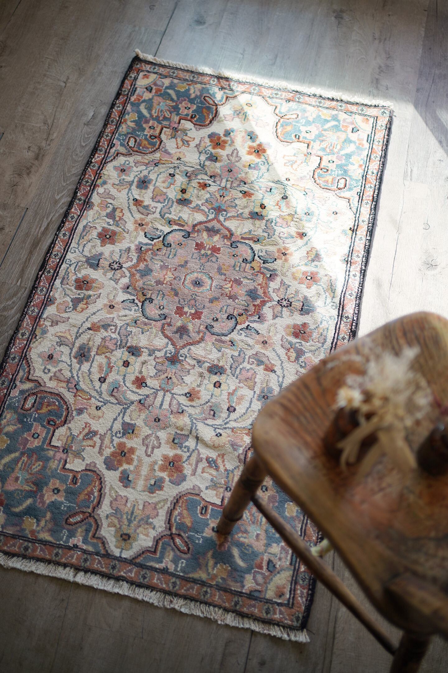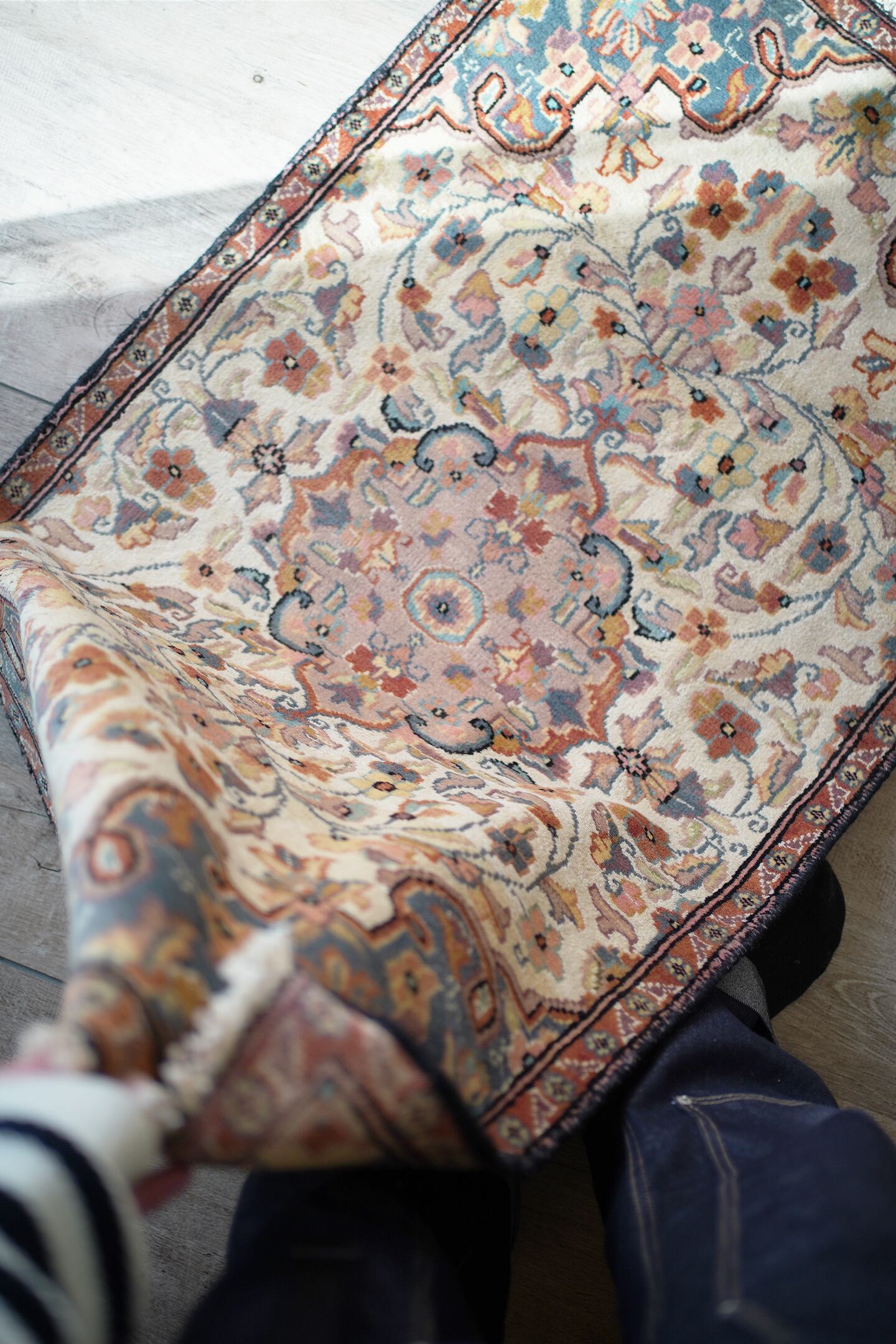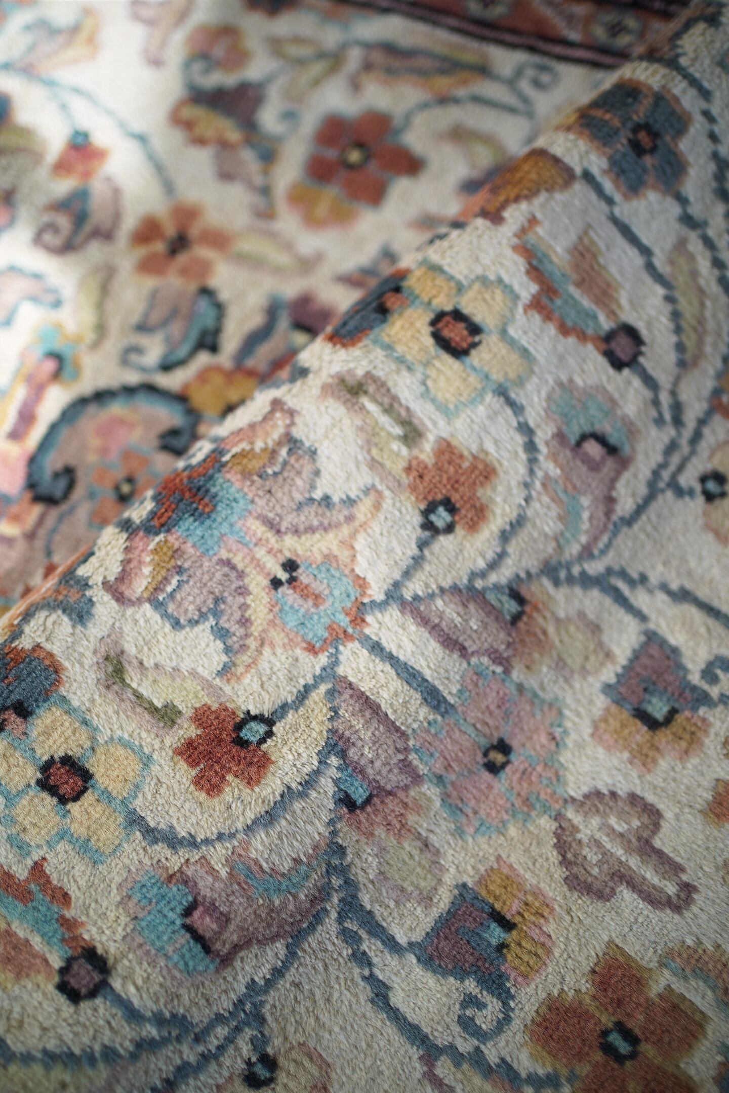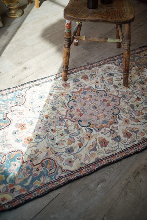 インド北部とパキスタン北東部のカシミール地方で織られたラグです。柔らかい雰囲気の色味とフローラルなデザインが可愛らしい一枚。クリーム色、淡いピンク、薄いブラウン、薄いエメラルドグリーンなどの優しいカラーリングです。柔らかくクタッとした質感のラグで、表面はふわっとサラッと滑らかな肌触りをしています。厚みは5mm程度。目立った補修跡やダメージもなく、グッドコンディション。長めのラック前に敷いたり、ウォーキングクローゼットなどにもオススメです。