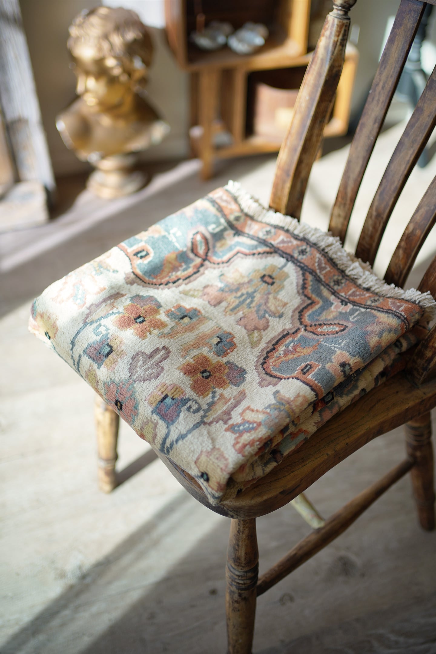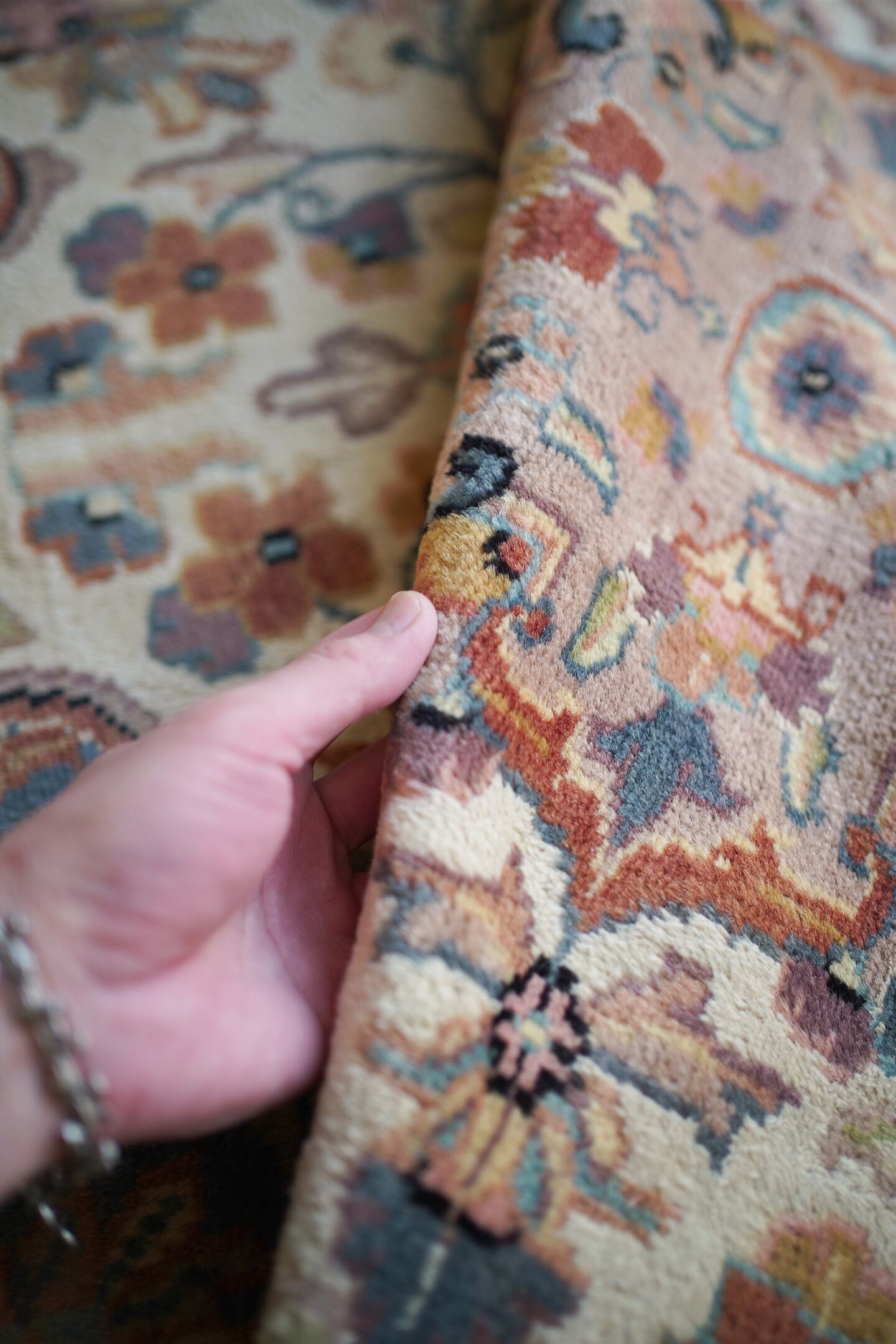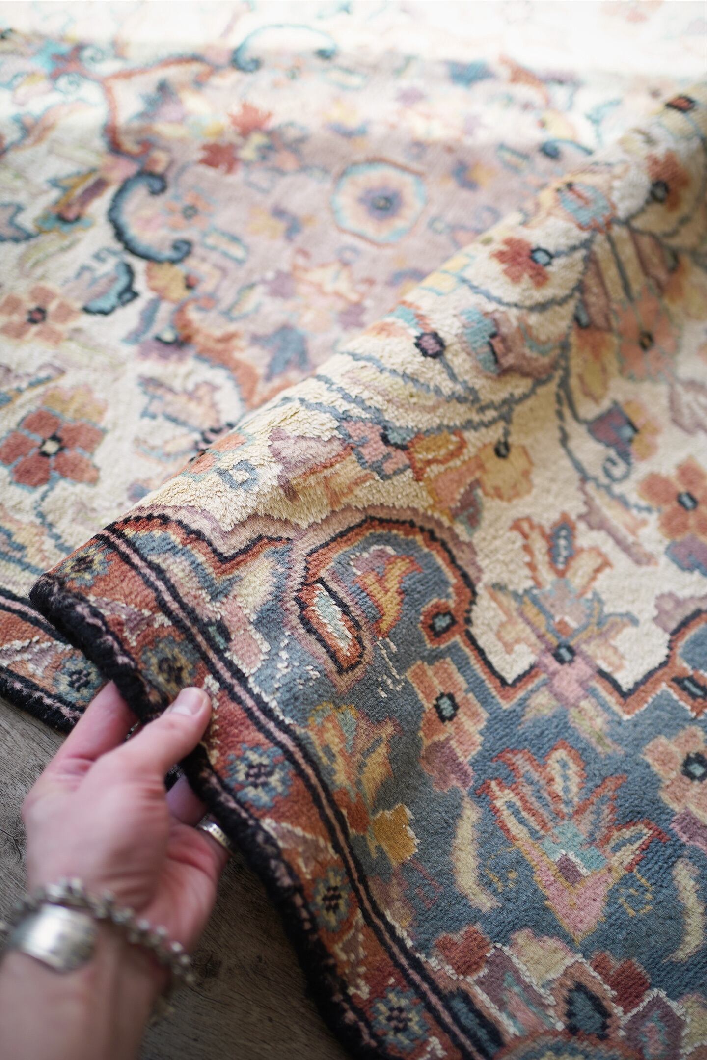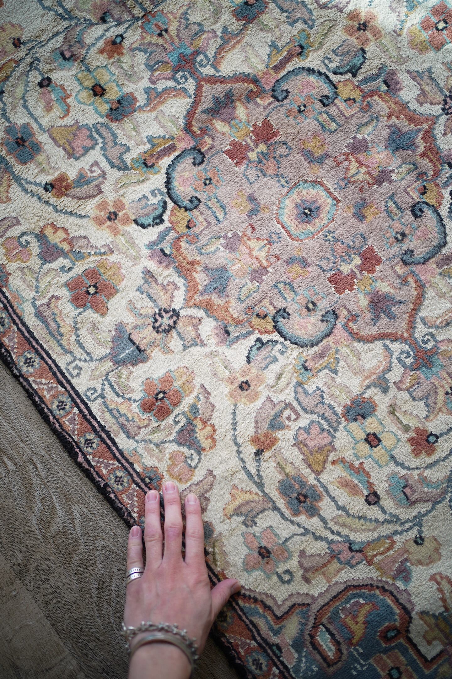 インド北部とパキスタン北東部のカシミール地方で織られたラグです。柔らかい雰囲気の色味とフローラルなデザインが可愛らしい一枚。クリーム色、淡いピンク、薄いブラウン、薄いエメラルドグリーンなどの優しいカラーリングです。柔らかくクタッとした質感のラグで、表面はふわっとサラッと滑らかな肌触りをしています。厚みは5mm程度。目立った補修跡やダメージもなく、グッドコンディション。長めのラック前に敷いたり、ウォーキングクローゼットなどにもオススメです。