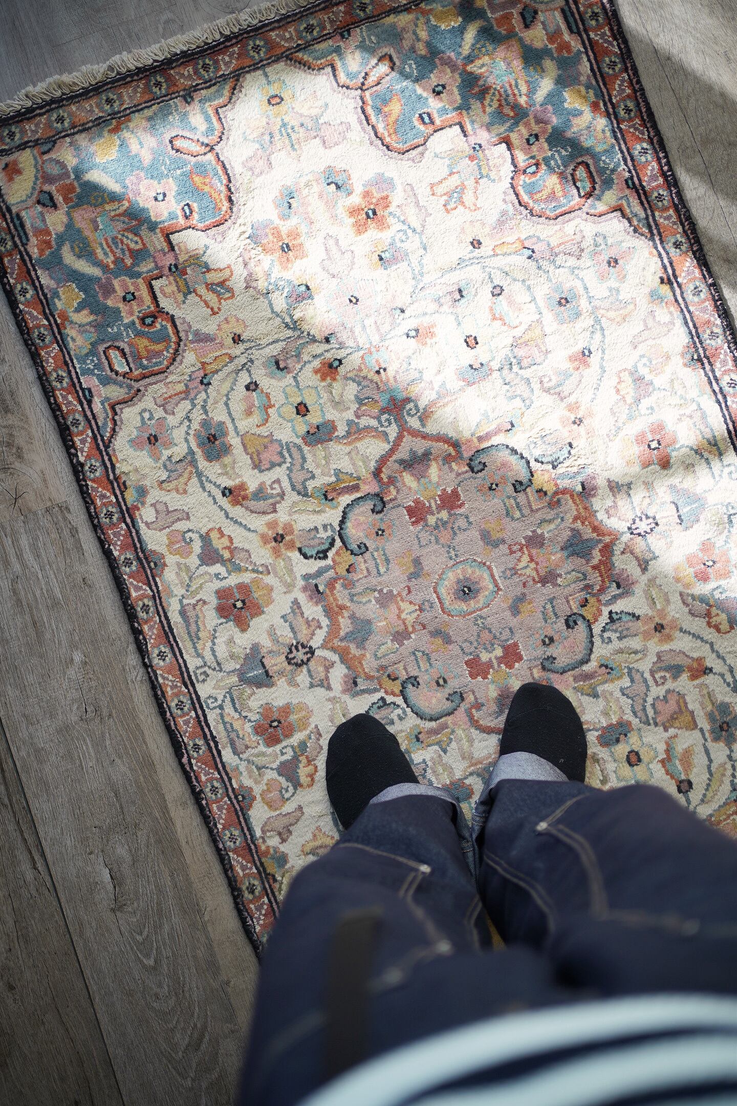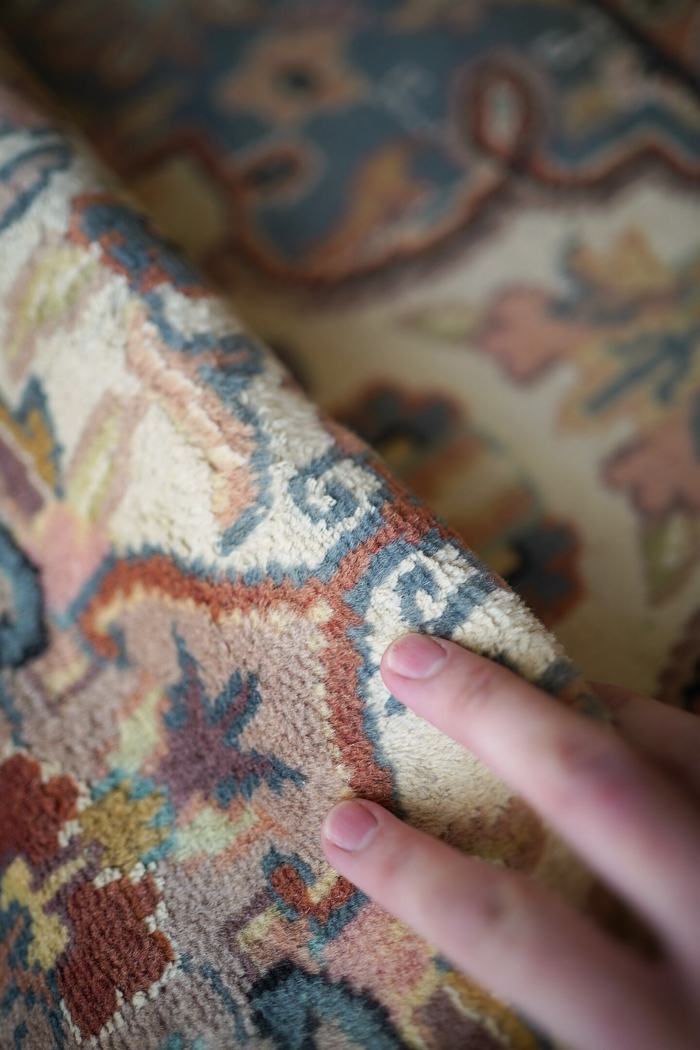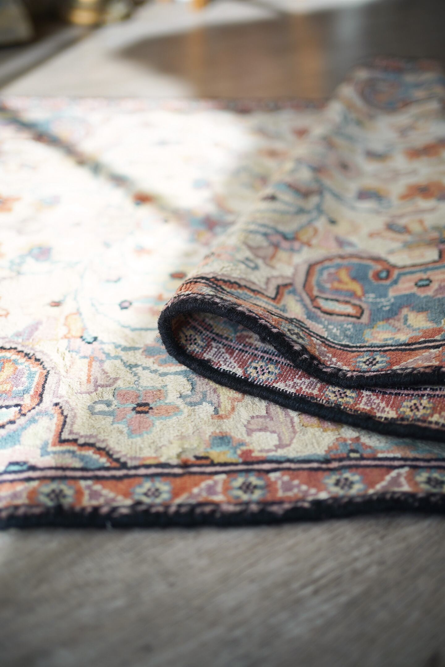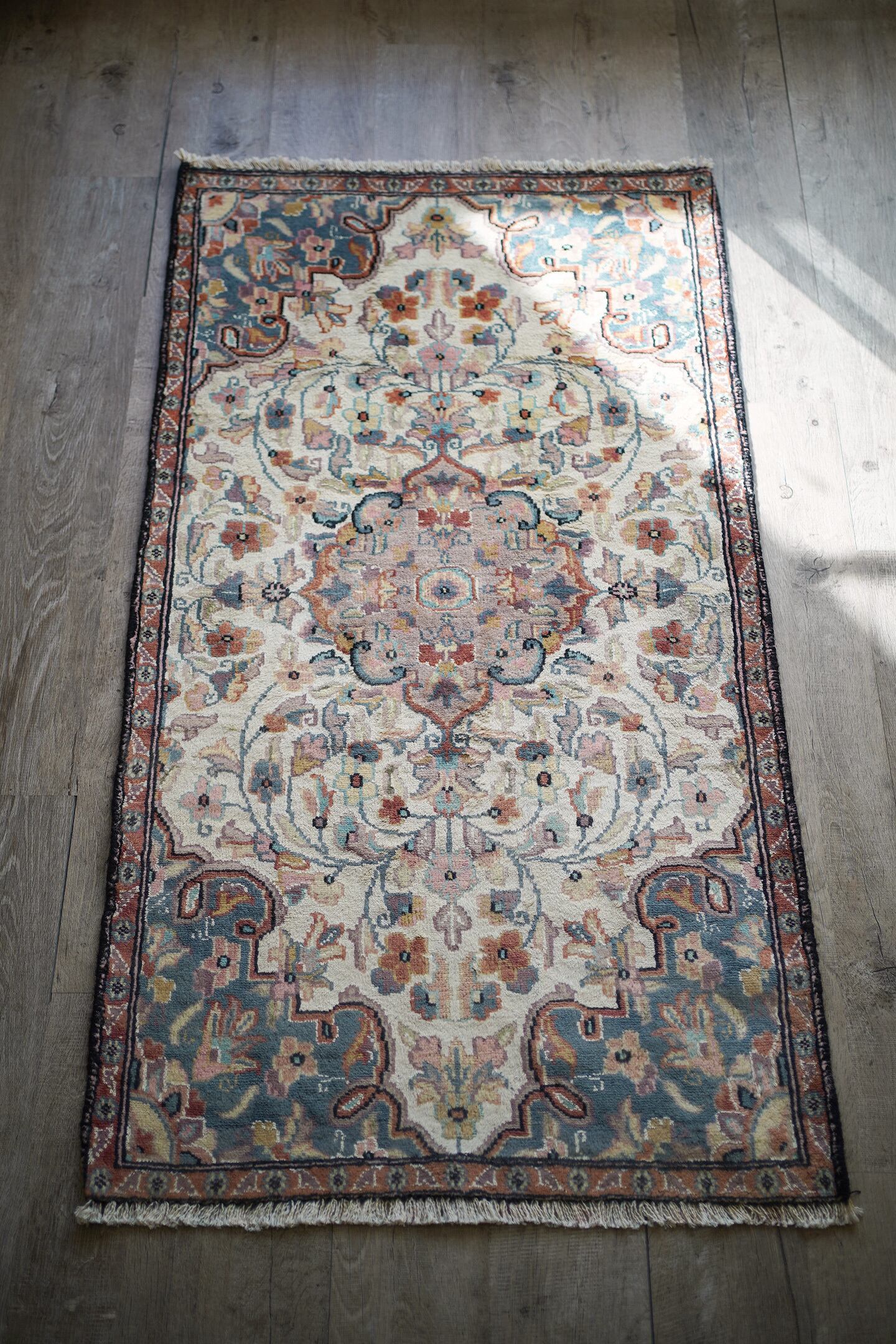 インド北部とパキスタン北東部のカシミール地方で織られたラグです。柔らかい雰囲気の色味とフローラルなデザインが可愛らしい一枚。クリーム色、淡いピンク、薄いブラウン、薄いエメラルドグリーンなどの優しいカラーリングです。柔らかくクタッとした質感のラグで、表面はふわっとサラッと滑らかな肌触りをしています。厚みは5mm程度。目立った補修跡やダメージもなく、グッドコンディション。長めのラック前に敷いたり、ウォーキングクローゼットなどにもオススメです。