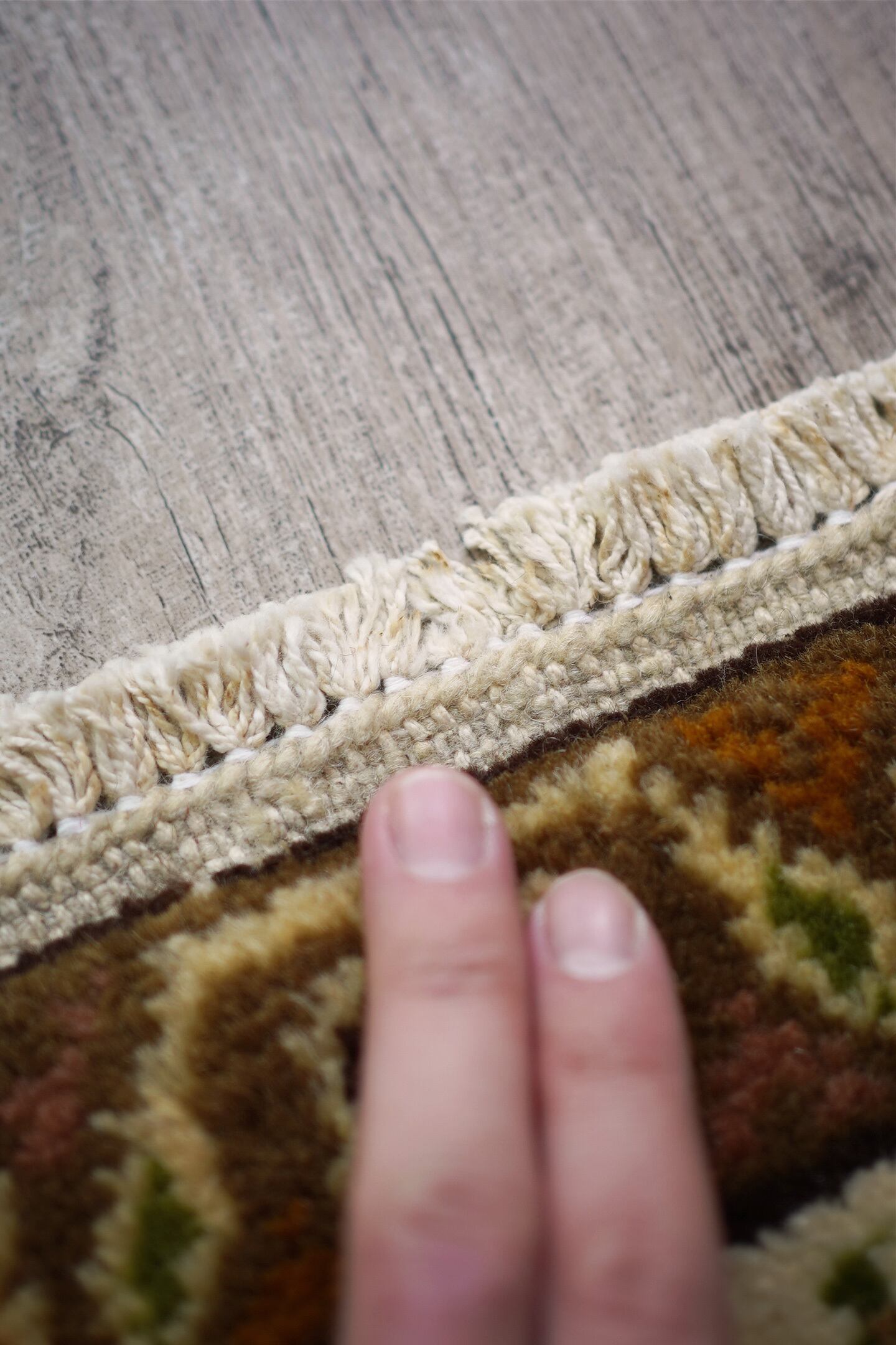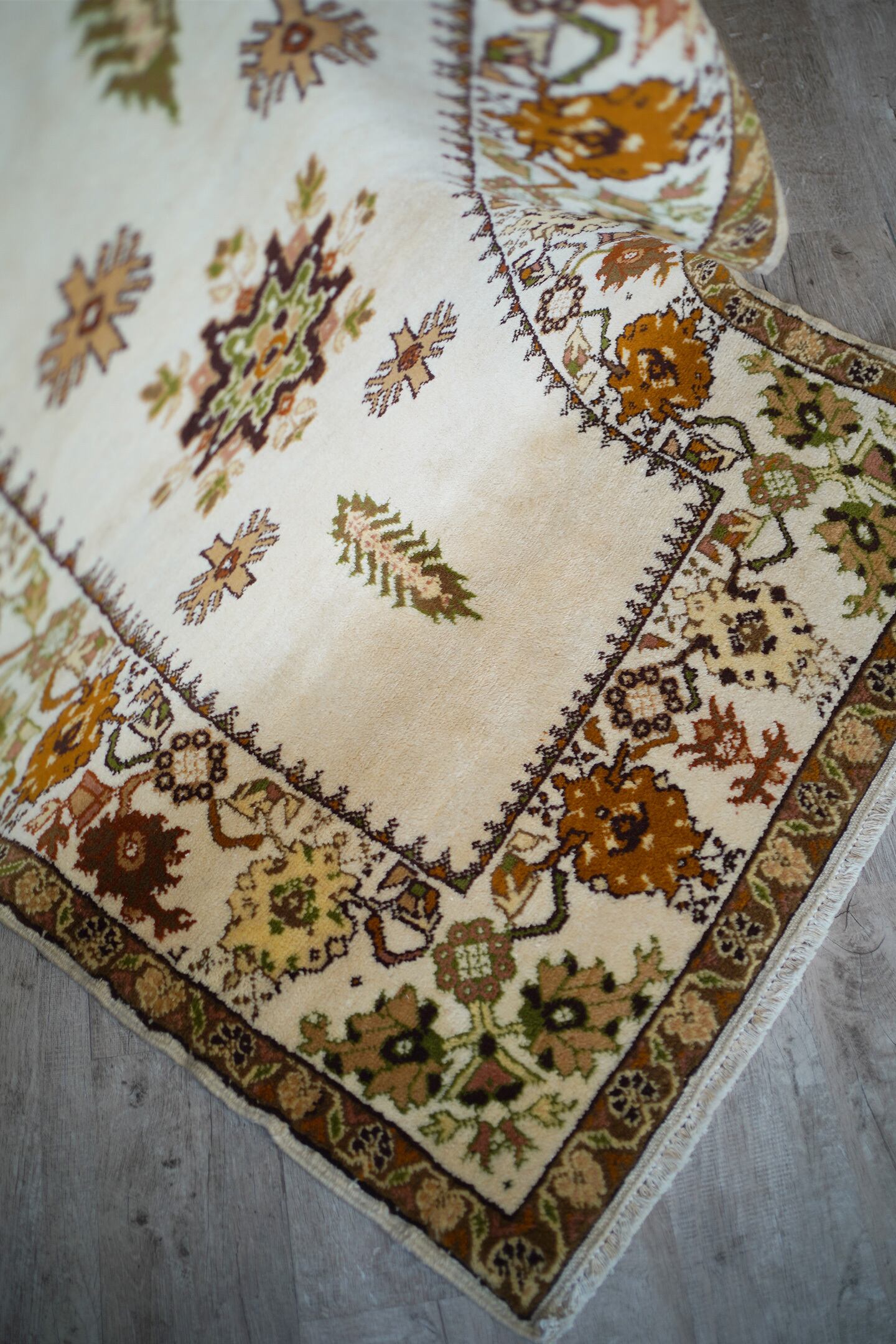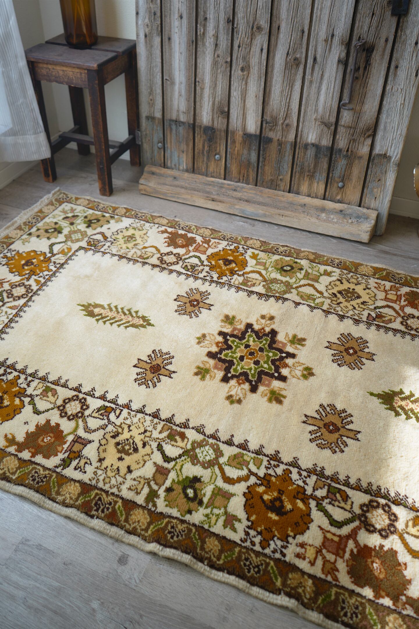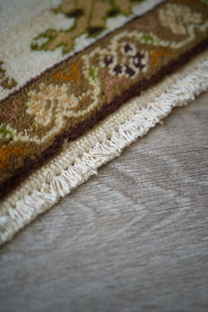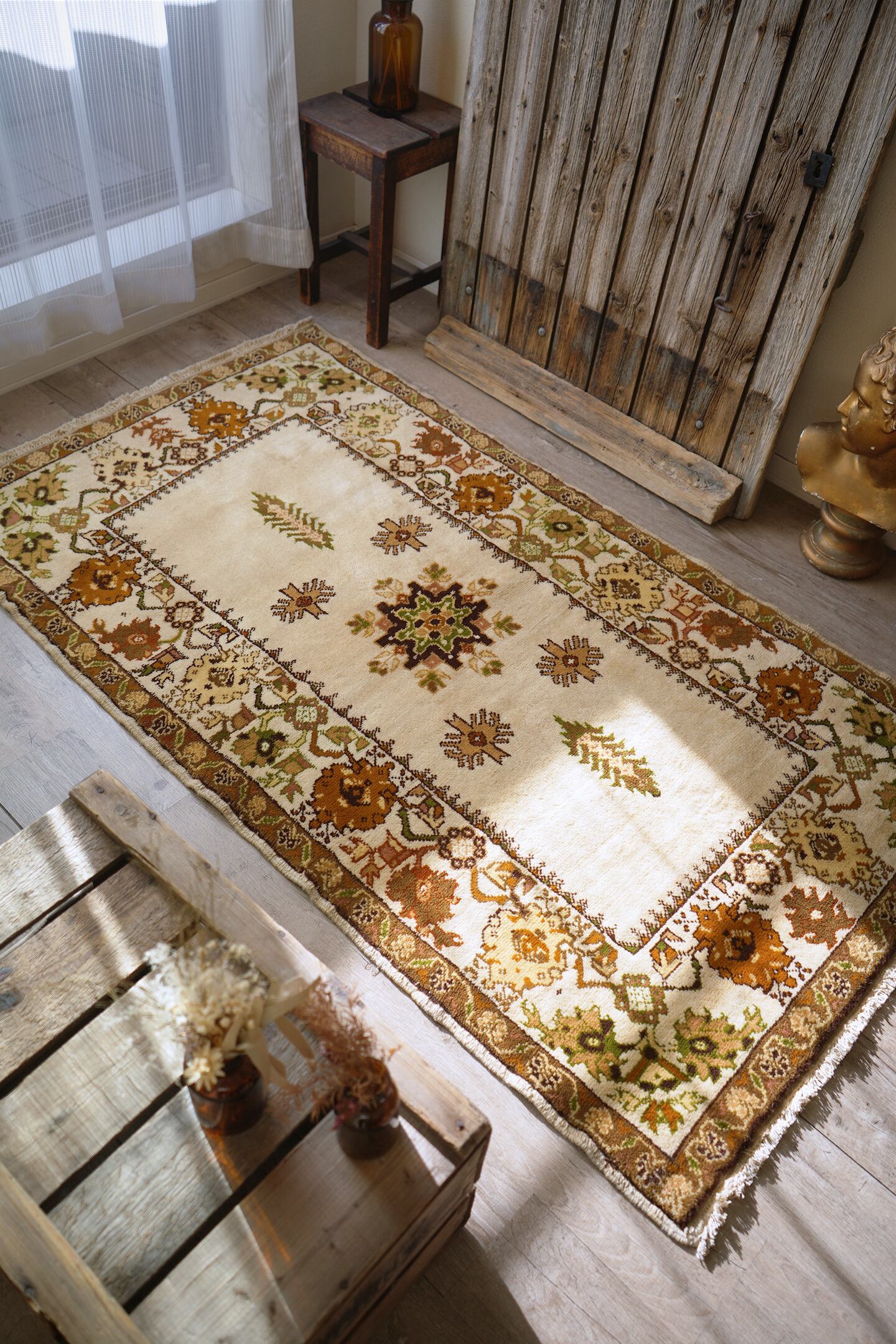 経年約30年ほどのトルコ産のヴィンテージラグ。草花モチーフのデザインで、フィールド中央の紋様と周りの余白のバランスが大変美しい一枚。ベージュ、オリーブ、ブラウン、焦茶などの柔らかい雰囲気の色味もまた非常に素敵です。このラグの魅力はなんといってもパイルが長めで、ふわふわなところ。柔らかく優しい肌触りで、絨毯の上でゆったり寛げる質感です。また、厚みが9mm程度で裏面にもハリがあり、重量感のある堅牢な作りをしています。1カ所フリンジが短くなっている箇所がありますが、それ以外はコンディションもパーフェクトな一枚です(フリンジが短くなっている部分は両サイドのフリンジで隠せば全くわからない状態です。最後のお写真をご参照ください)。リビングのソファ前をはじめ、ベッドサイドなどお部屋に合いそうなスペースをぜひ探されてみてください♪