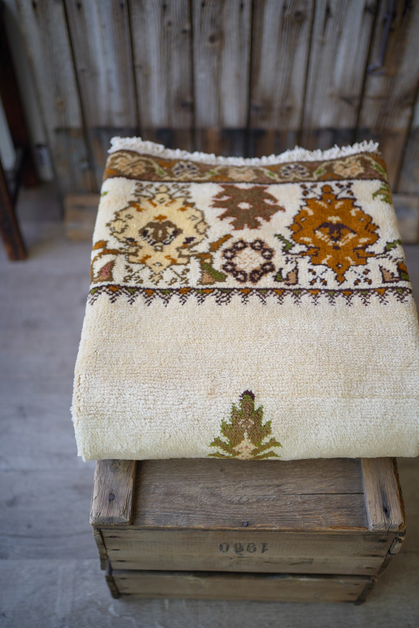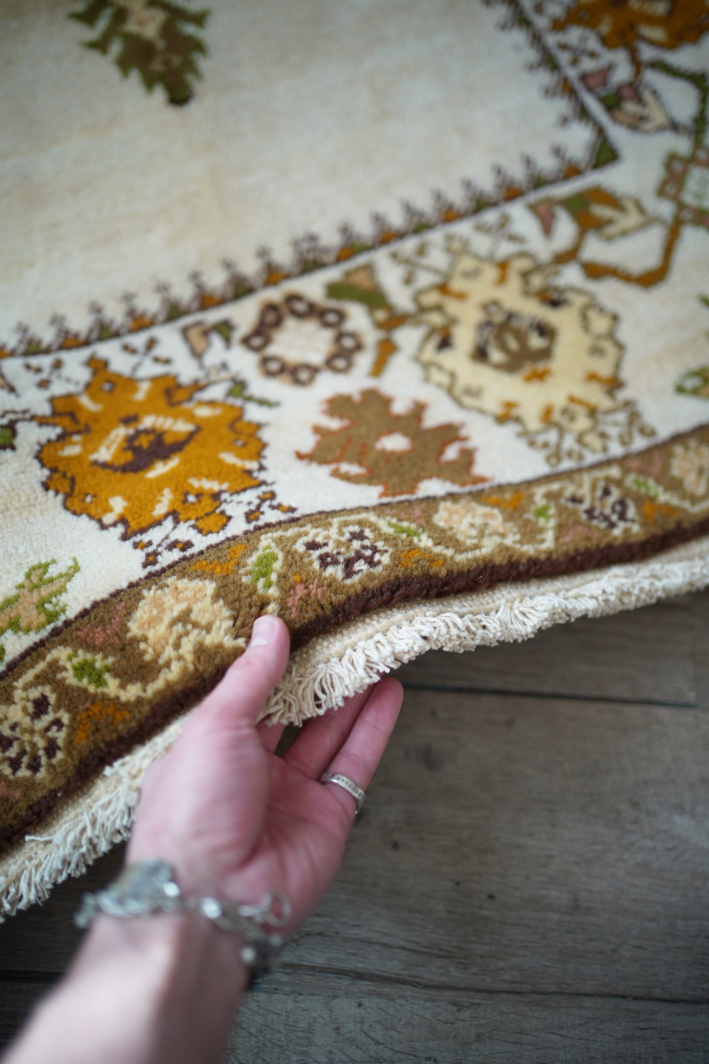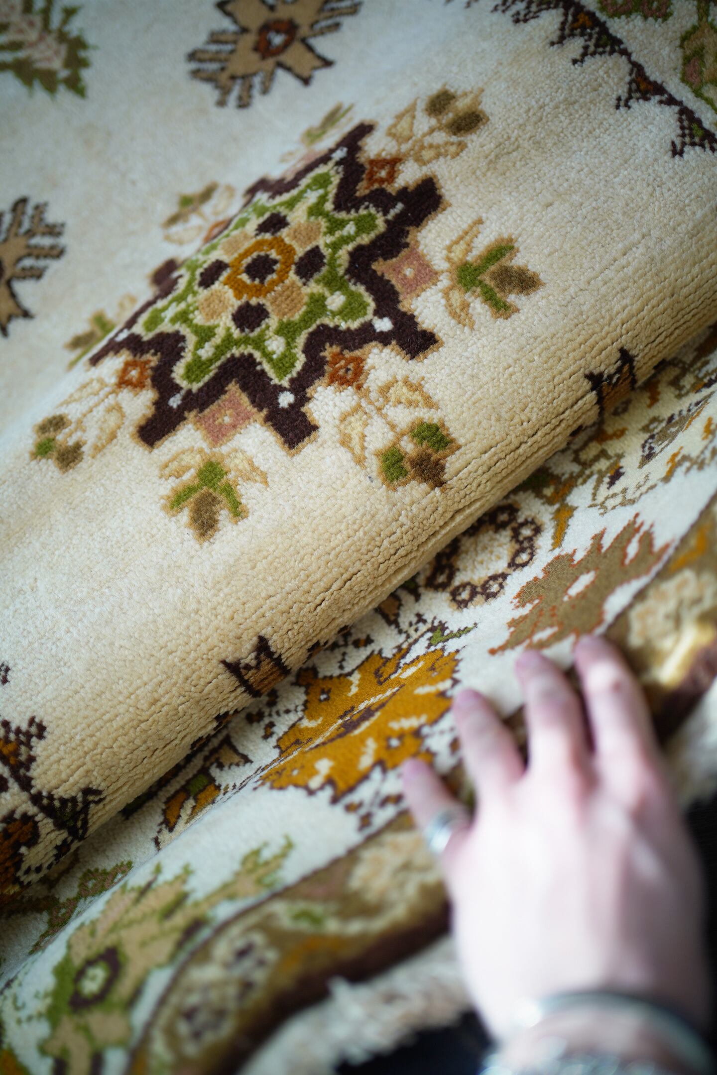 経年約30年ほどのトルコ産のヴィンテージラグ。草花モチーフのデザインで、フィールド中央の紋様と周りの余白のバランスが大変美しい一枚。ベージュ、オリーブ、ブラウン、焦茶などの柔らかい雰囲気の色味もまた非常に素敵です。このラグの魅力はなんといってもパイルが長めで、ふわふわなところ。柔らかく優しい肌触りで、絨毯の上でゆったり寛げる質感です。また、厚みが9mm程度で裏面にもハリがあり、重量感のある堅牢な作りをしています。1カ所フリンジが短くなっている箇所がありますが、それ以外はコンディションもパーフェクトな一枚です(フリンジが短くなっている部分は両サイドのフリンジで隠せば全くわからない状態です。最後のお写真をご参照ください)。リビングのソファ前をはじめ、ベッドサイドなどお部屋に合いそうなスペースをぜひ探されてみてください♪