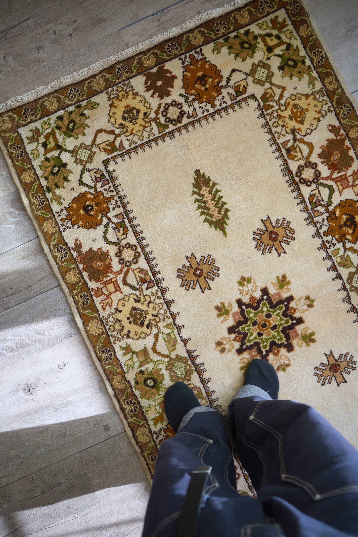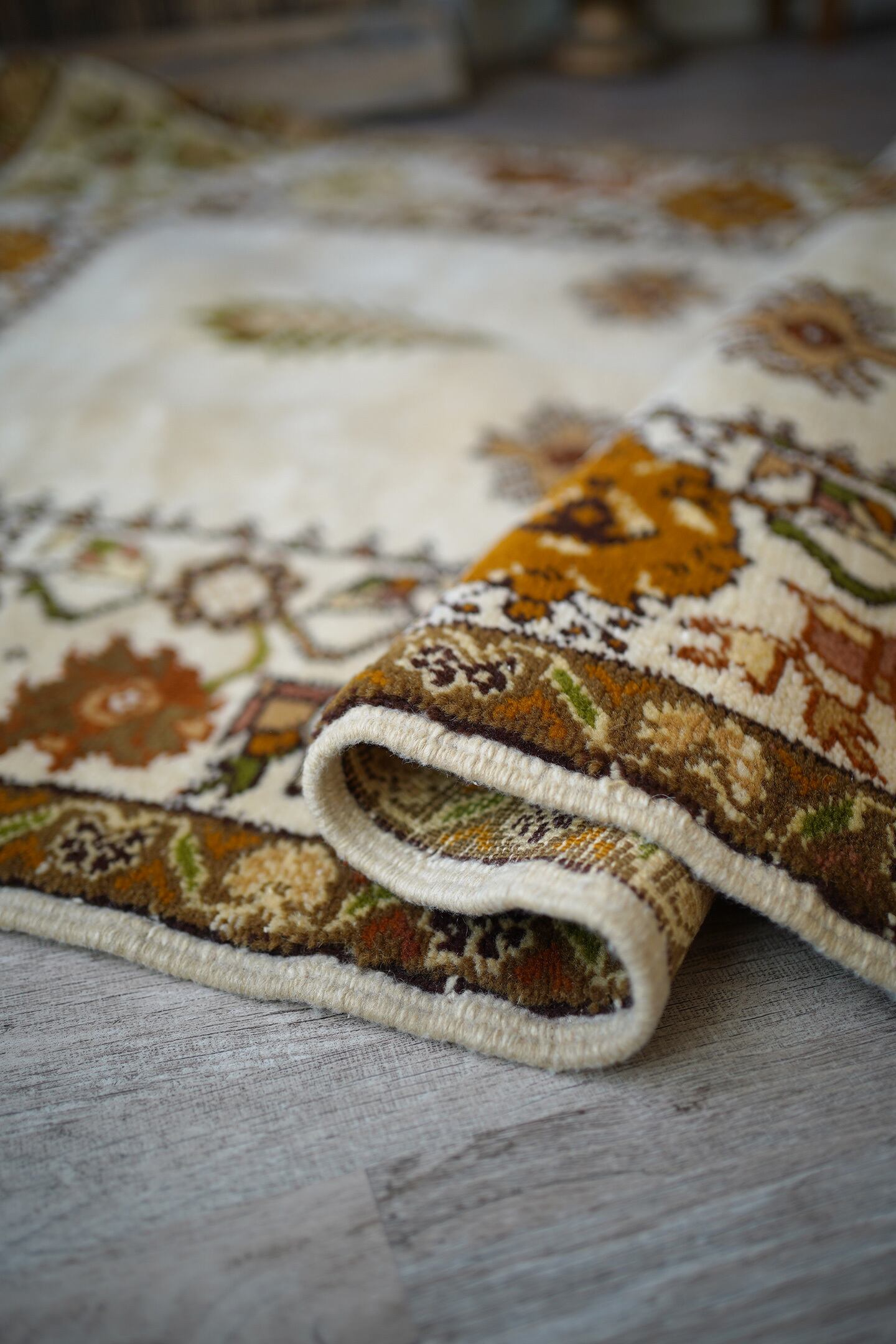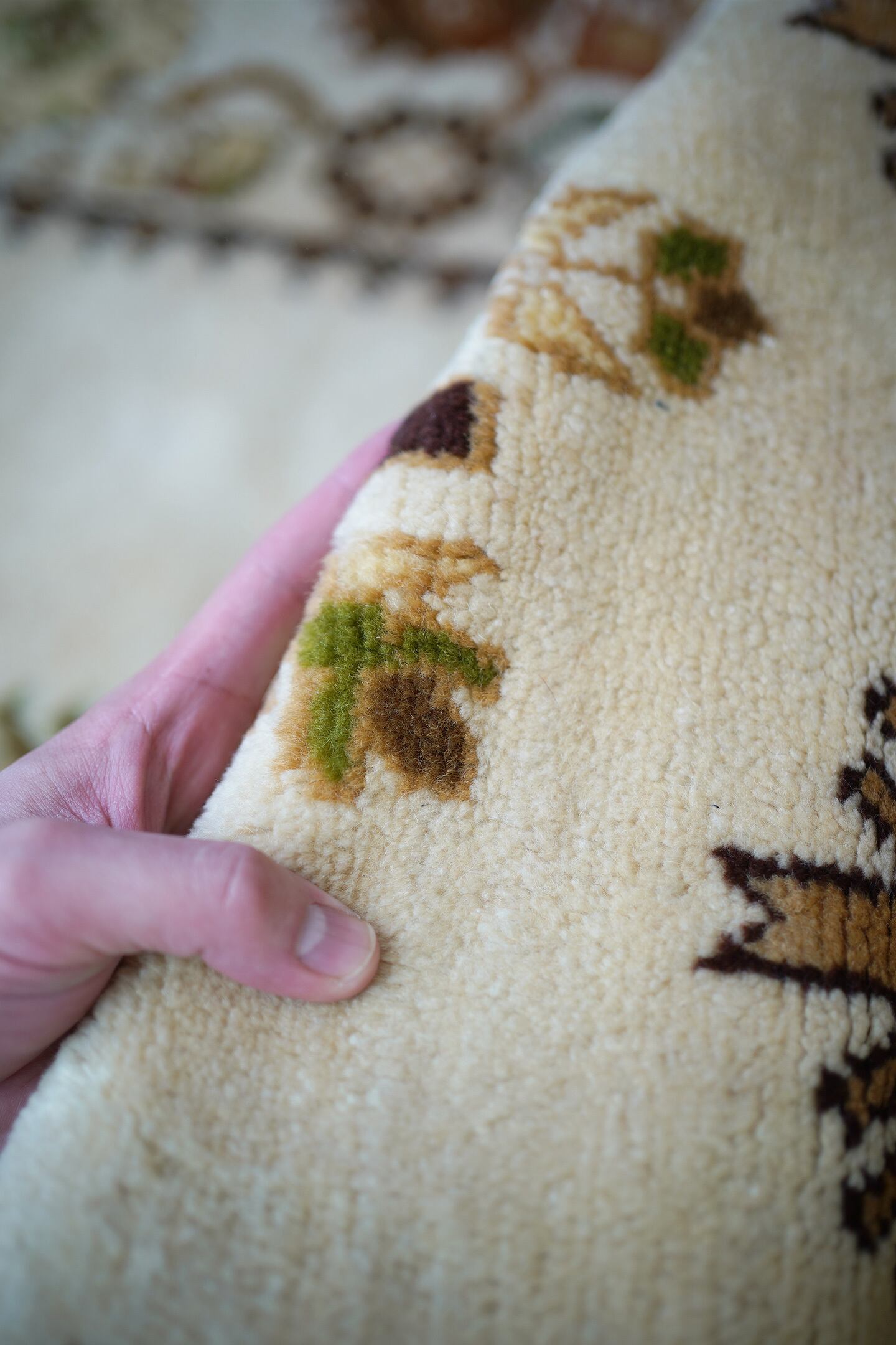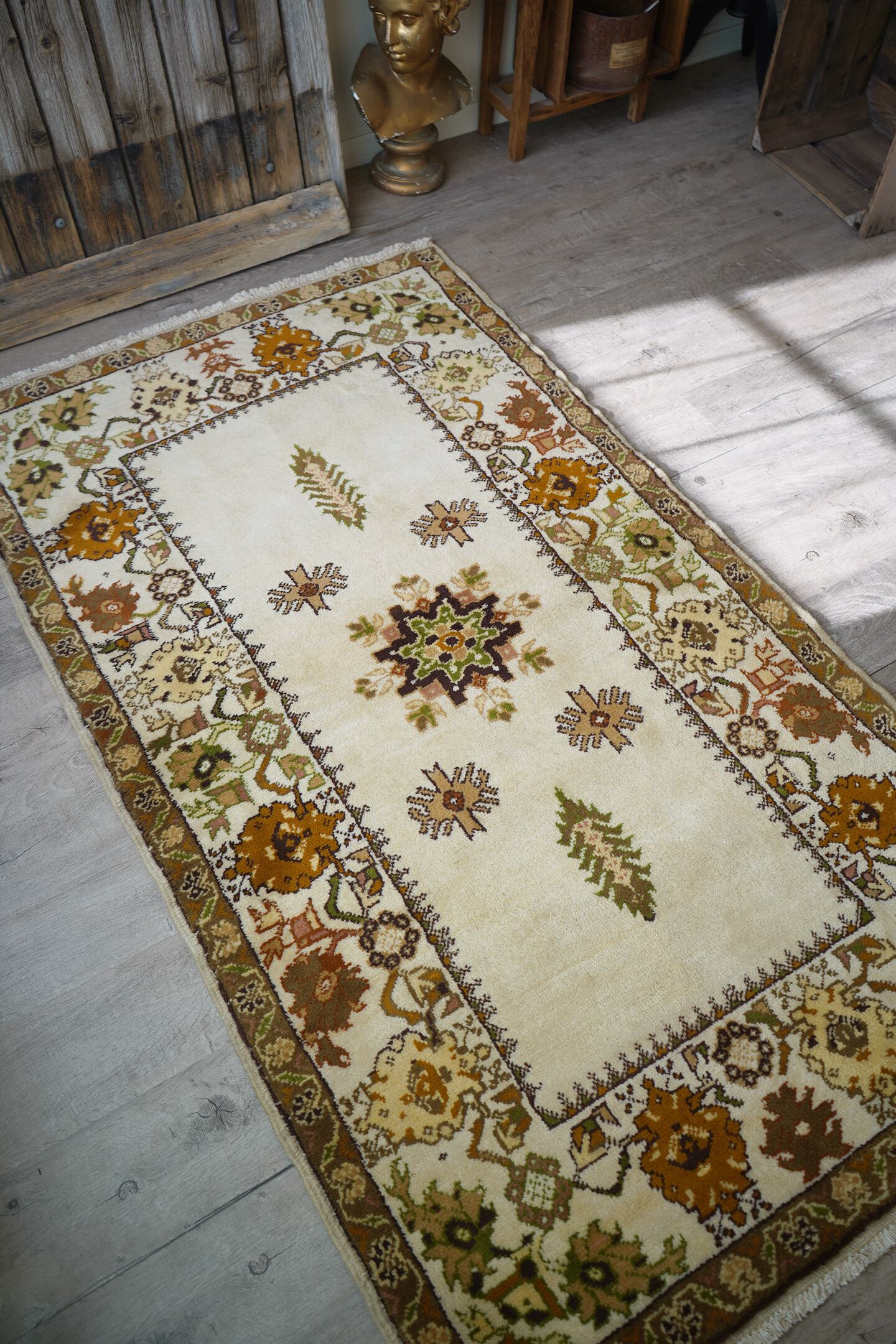 経年約30年ほどのトルコ産のヴィンテージラグ。草花モチーフのデザインで、フィールド中央の紋様と周りの余白のバランスが大変美しい一枚。ベージュ、オリーブ、ブラウン、焦茶などの柔らかい雰囲気の色味もまた非常に素敵です。このラグの魅力はなんといってもパイルが長めで、ふわふわなところ。柔らかく優しい肌触りで、絨毯の上でゆったり寛げる質感です。また、厚みが9mm程度で裏面にもハリがあり、重量感のある堅牢な作りをしています。1カ所フリンジが短くなっている箇所がありますが、それ以外はコンディションもパーフェクトな一枚です(フリンジが短くなっている部分は両サイドのフリンジで隠せば全くわからない状態です。最後のお写真をご参照ください)。リビングのソファ前をはじめ、ベッドサイドなどお部屋に合いそうなスペースをぜひ探されてみてください♪
