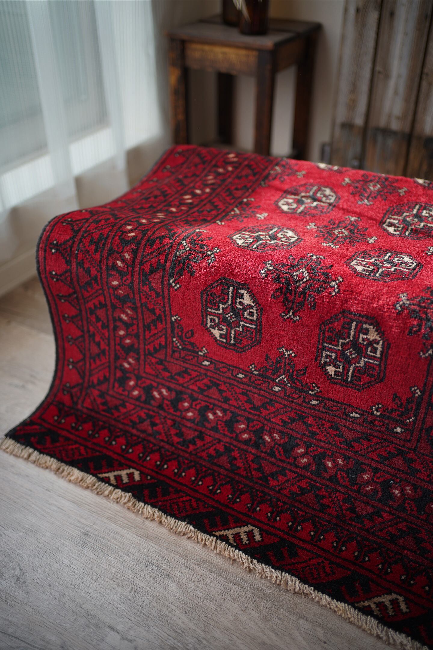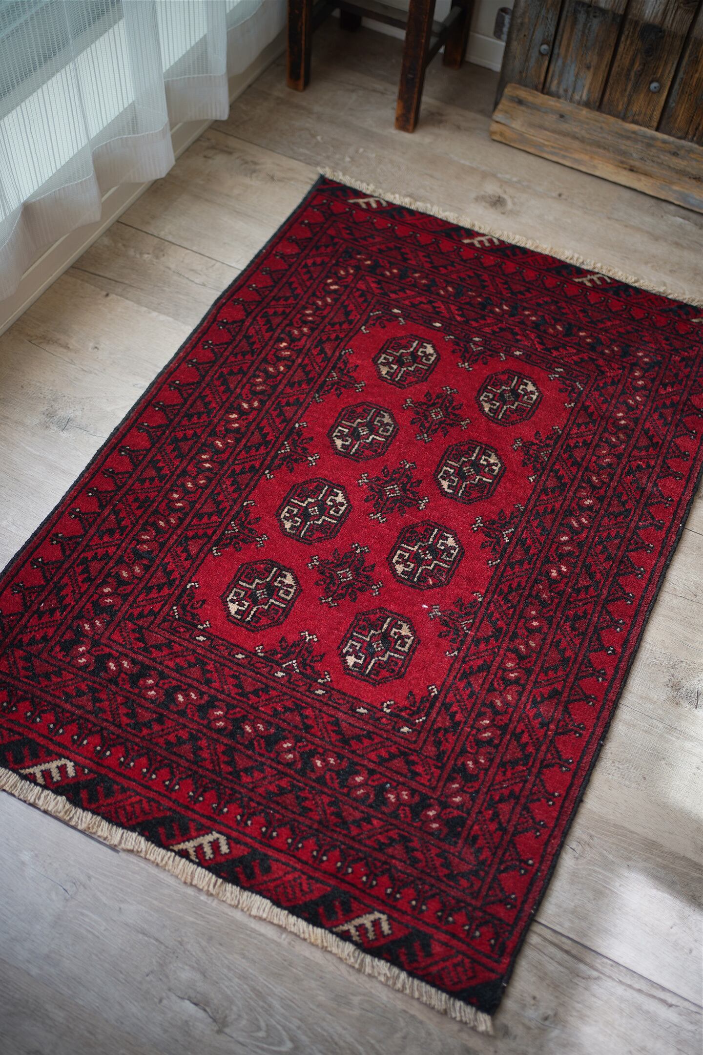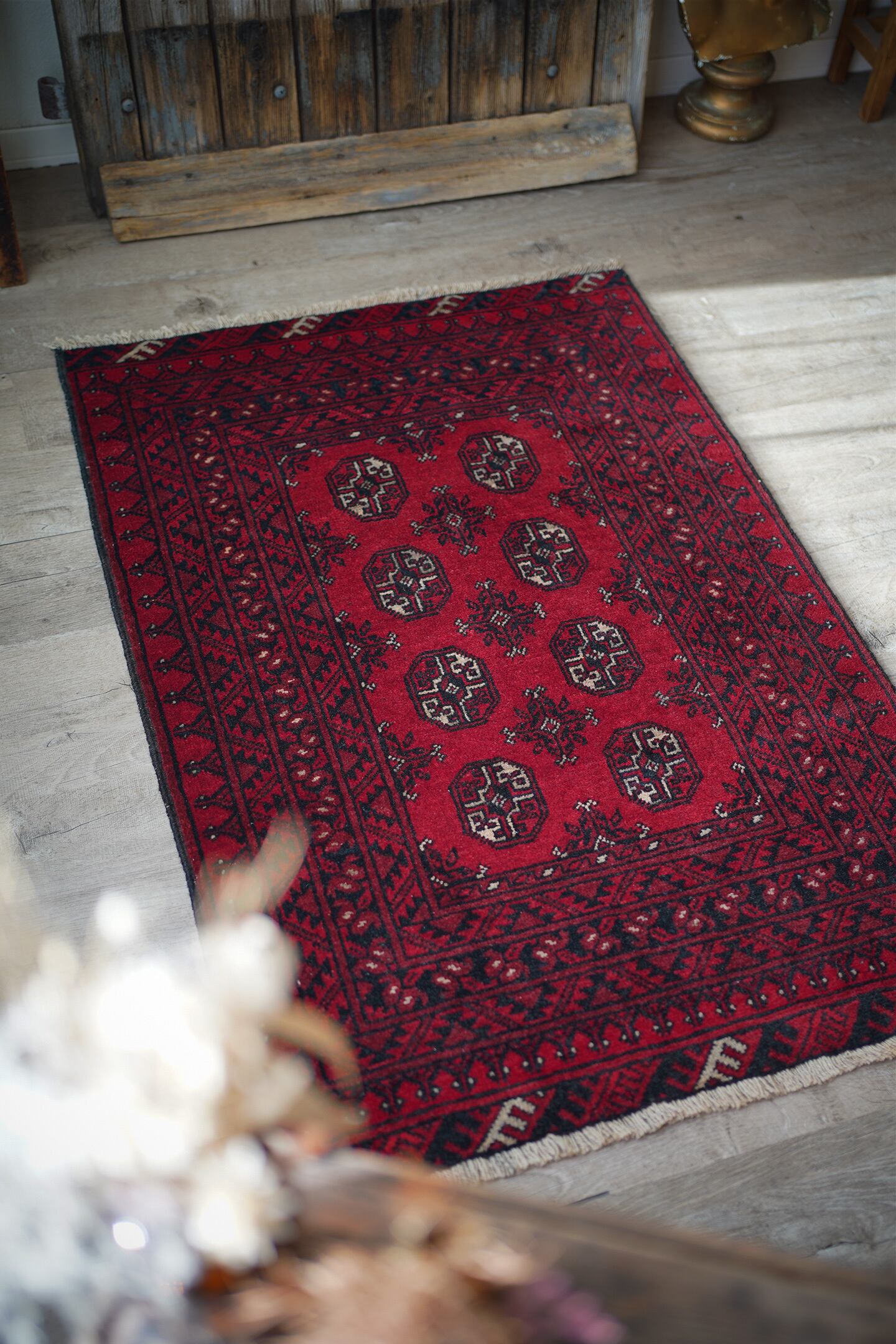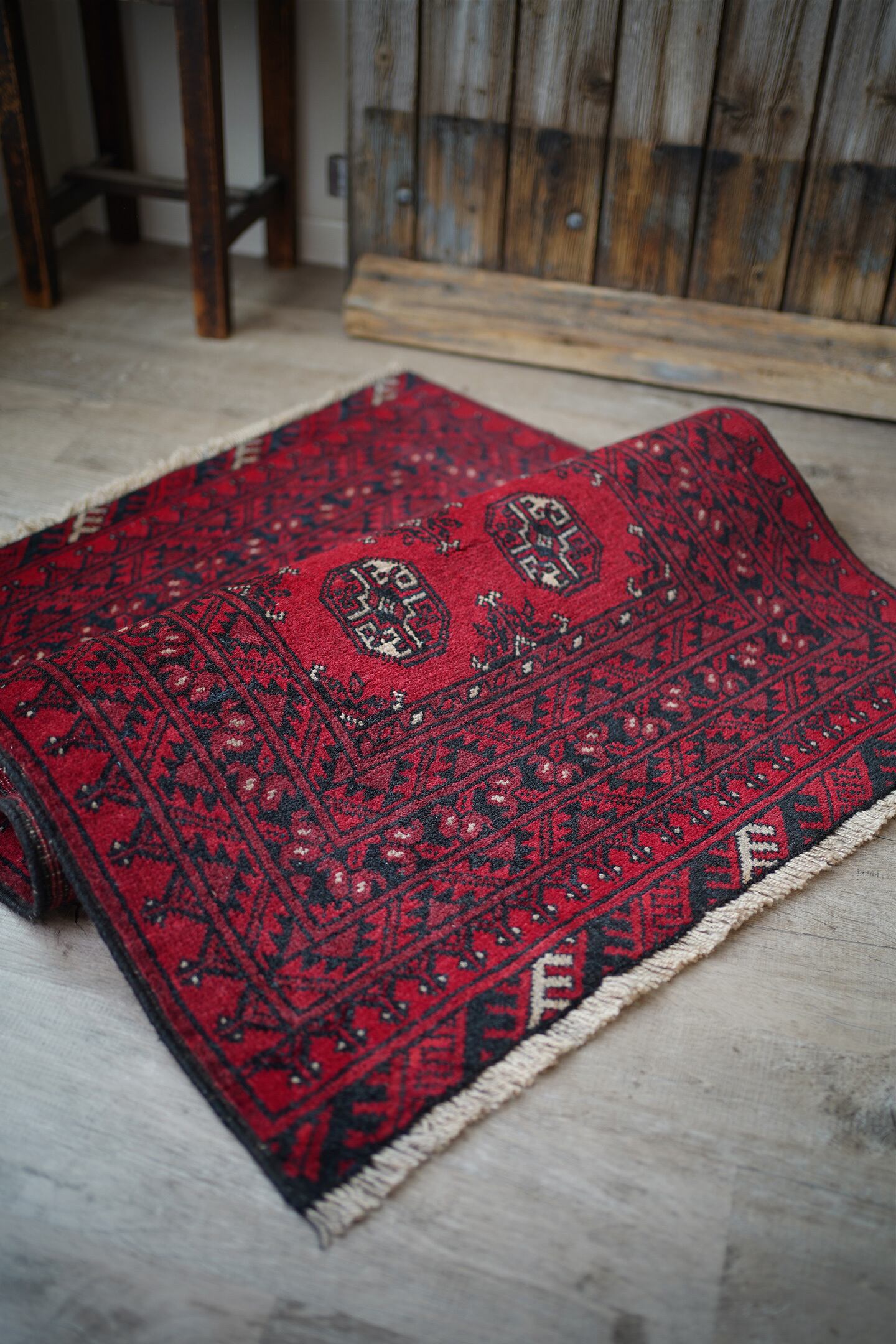 約40年前にトルクメン系の部族によってアフガニスタンで織られたヴィンテージのラグです。綺麗に配列されたギュルとボーダーのバランスが非常に良い一枚で、お色味は落ち着いた少し暗めの赤と黒のカラーリングです。お写真ではギュルの周りが比較的赤みが強く見えますが、肉眼で見ると全体的に同じ色合いに見えます。表面はふわっと柔らかく気持ちの良い肌触りで、厚みは6mm〜7mm程度。裏面はハリのある質感で、重量感もあり耐久性を感じさせる堅牢な作りをしています。コンディションも言うことなしのパーフェクト。玄関をはじめ、お好きなスペースにどうぞ♪