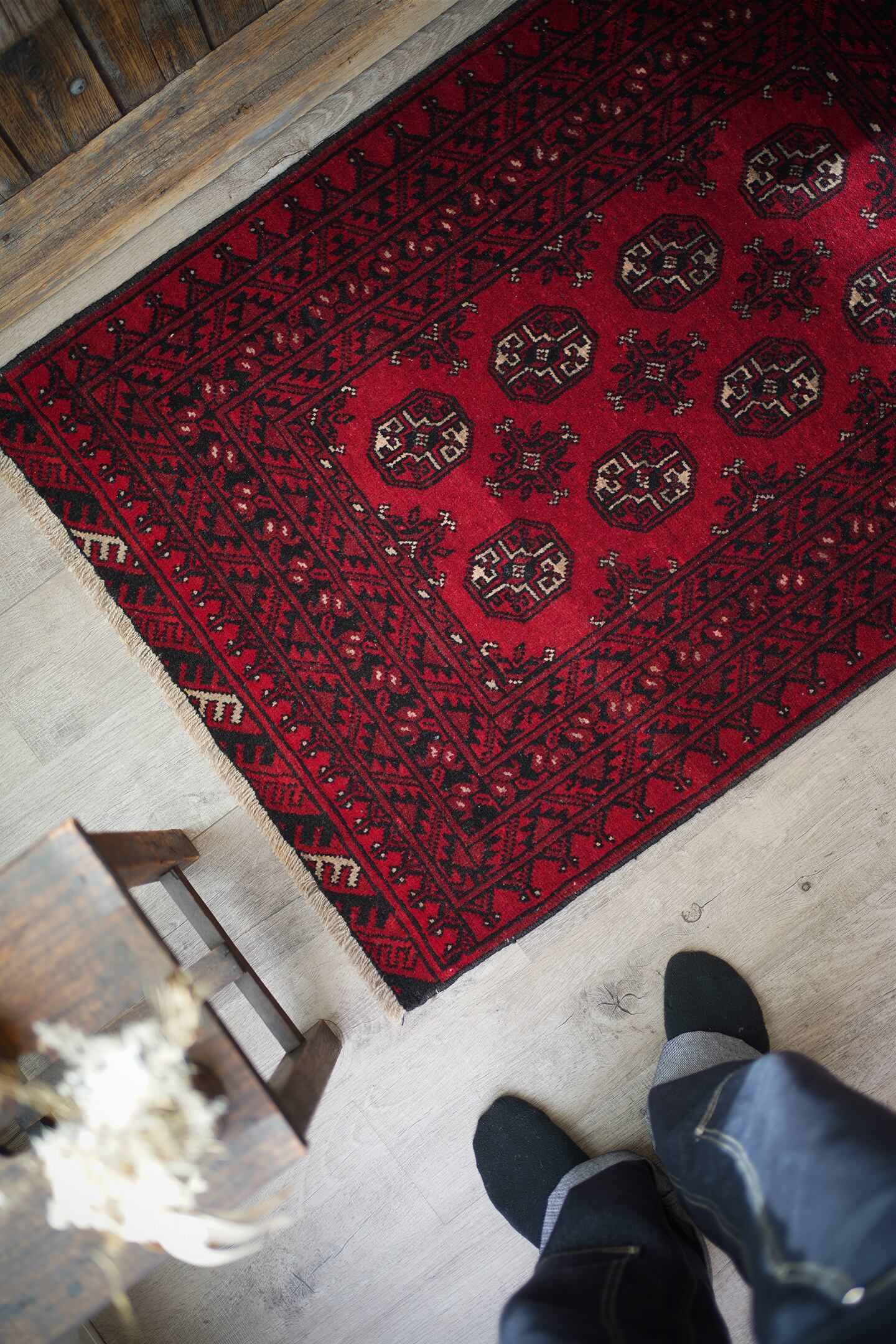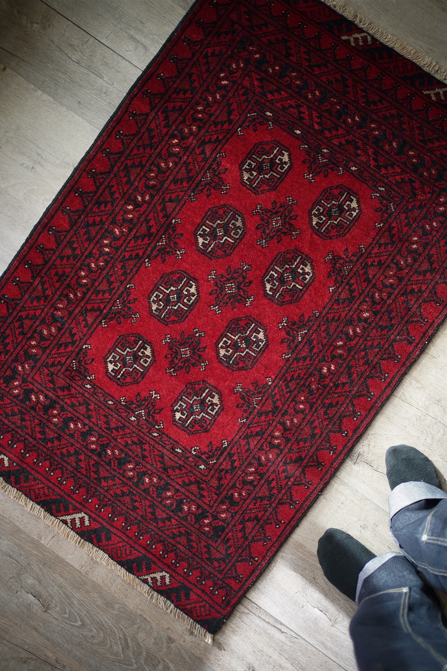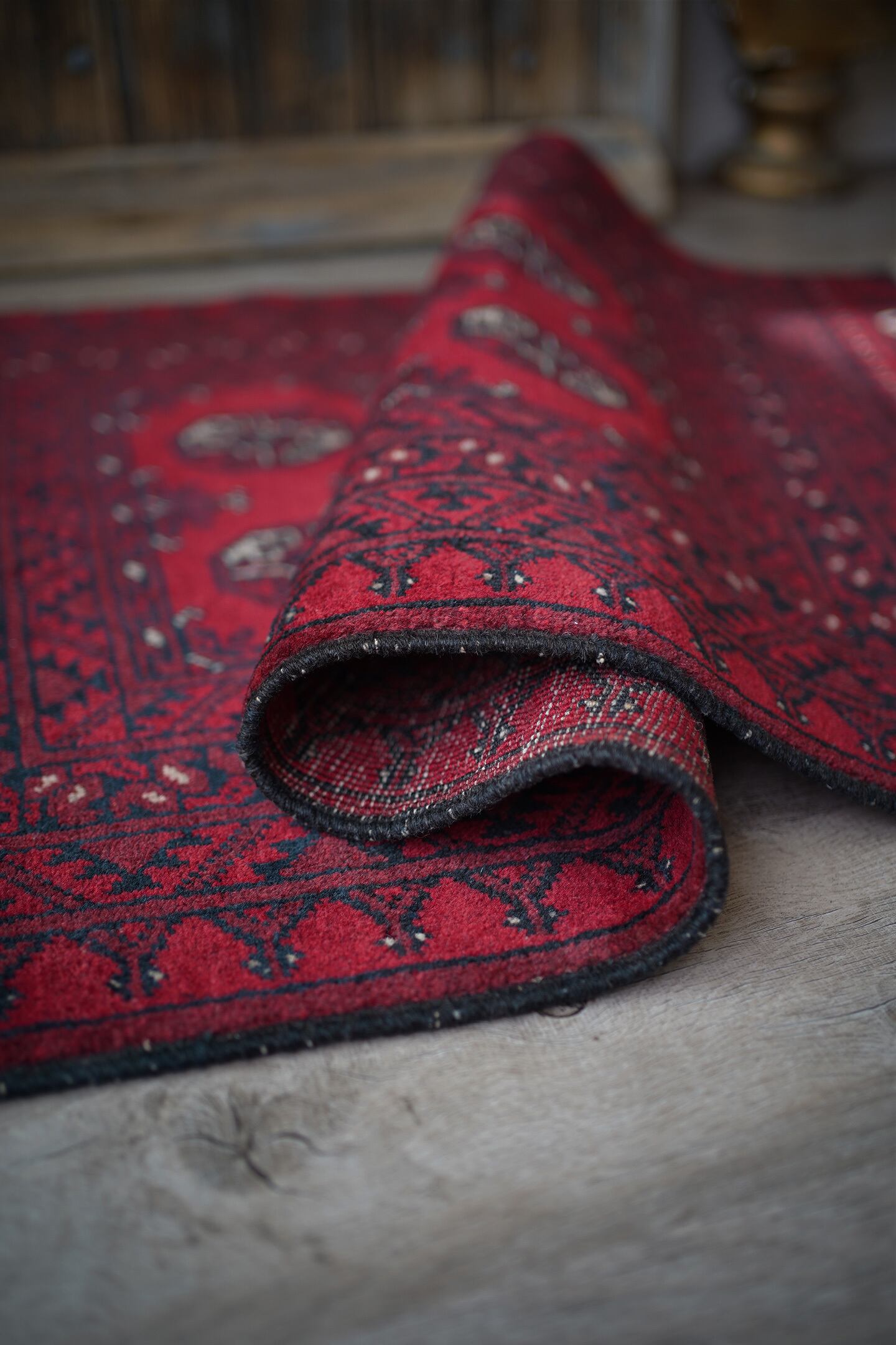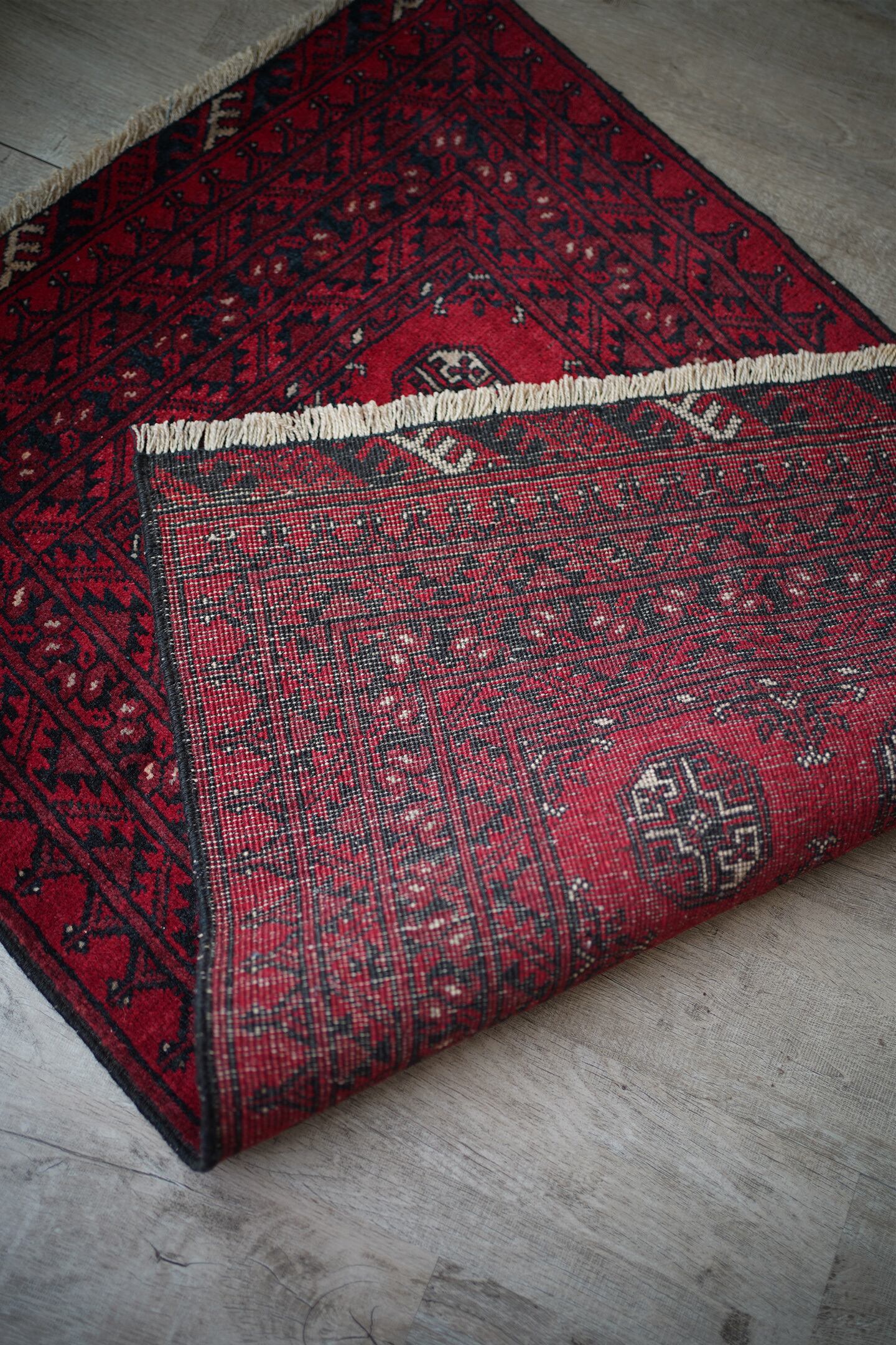 約40年前にトルクメン系の部族によってアフガニスタンで織られたヴィンテージのラグです。綺麗に配列されたギュルとボーダーのバランスが非常に良い一枚で、お色味は落ち着いた少し暗めの赤と黒のカラーリングです。お写真ではギュルの周りが比較的赤みが強く見えますが、肉眼で見ると全体的に同じ色合いに見えます。表面はふわっと柔らかく気持ちの良い肌触りで、厚みは6mm〜7mm程度。裏面はハリのある質感で、重量感もあり耐久性を感じさせる堅牢な作りをしています。コンディションも言うことなしのパーフェクト。玄関をはじめ、お好きなスペースにどうぞ♪