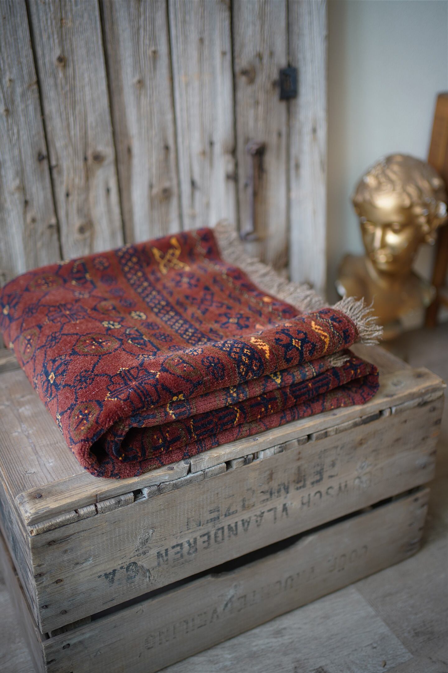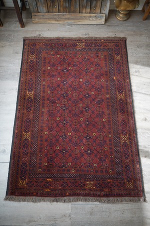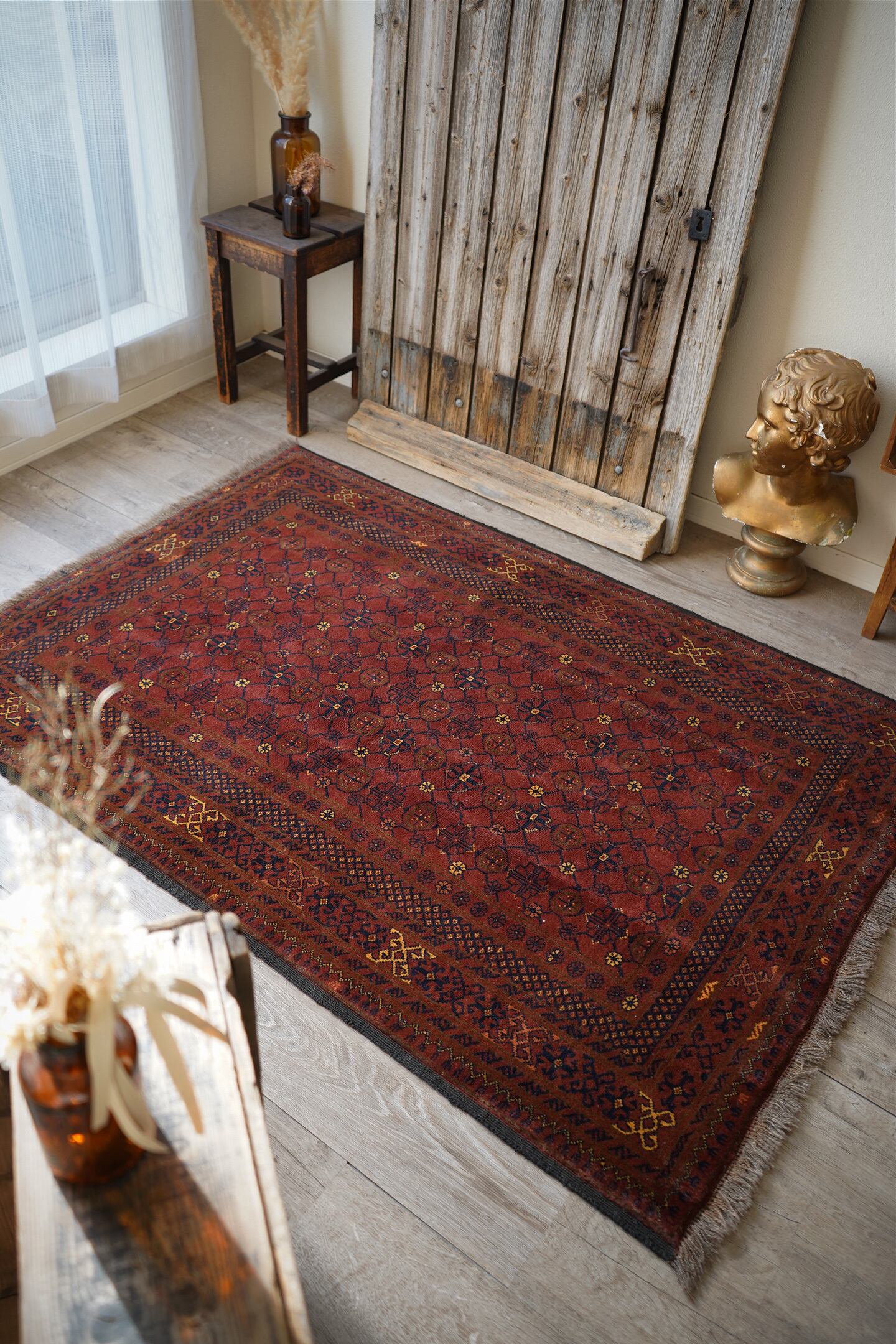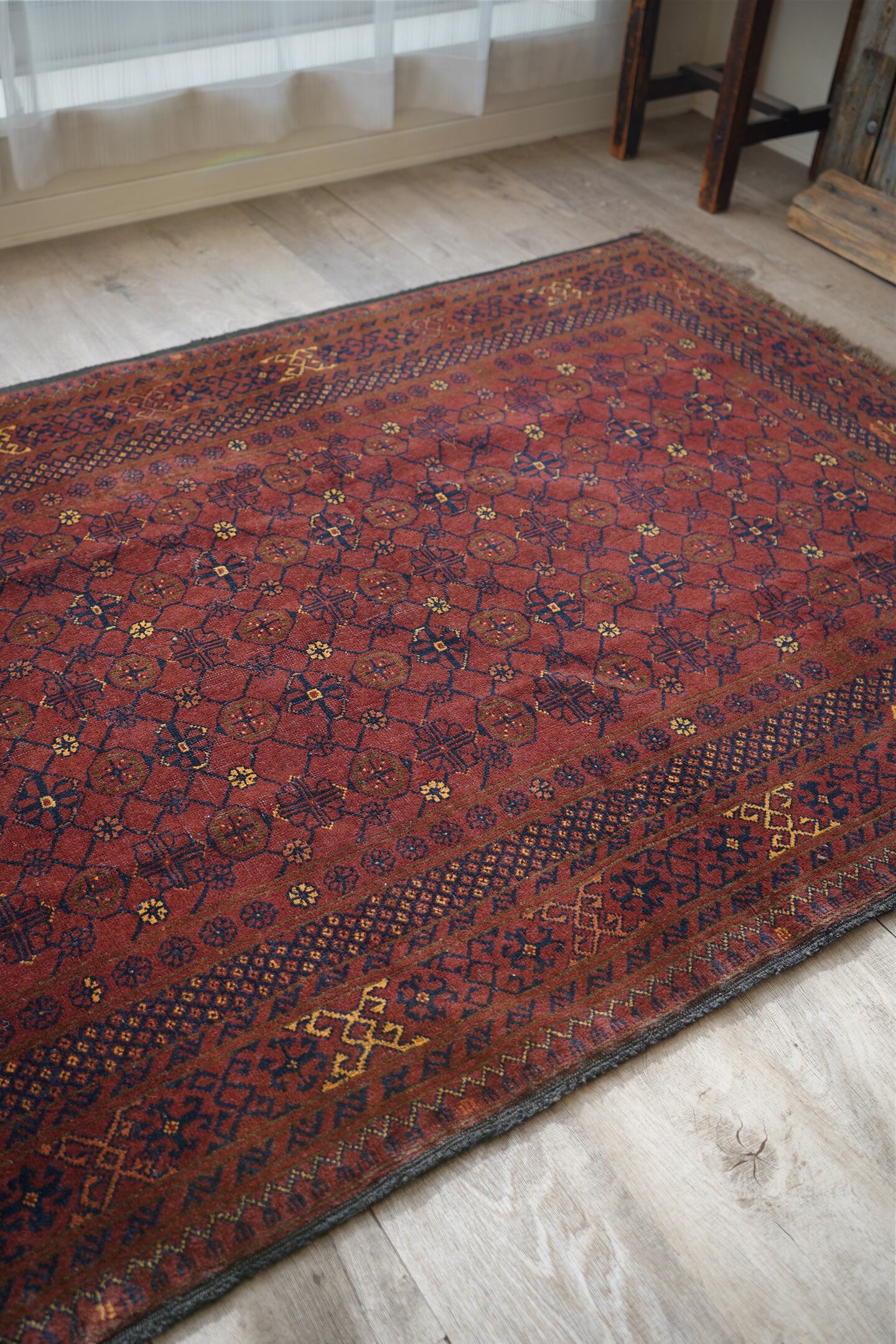 約60年前にトルクメン系の部族によってアフガニスタンで織られた"ベシール"と呼ばれるラグです。 深みのあるブラウンカラーに少し赤が入ったようなヴィンテージを感じさせる色合いで、アルマギュルというリンゴの花柄紋様が織り込まれたデザイン。パイルはしっかりとした目の詰まった質感で、表面はソフトウールで優しく滑らかな肌触り。厚みは6mm〜7mmほどで、裏面にハリもあり、重量感のある堅牢な作りをしています。中央あたりが少しパイルが薄くなっている箇所がありますが、それ以外は目立った補修跡やダメージもなく状態良好。リビングや寝室などお好みの場所にどうぞ♪