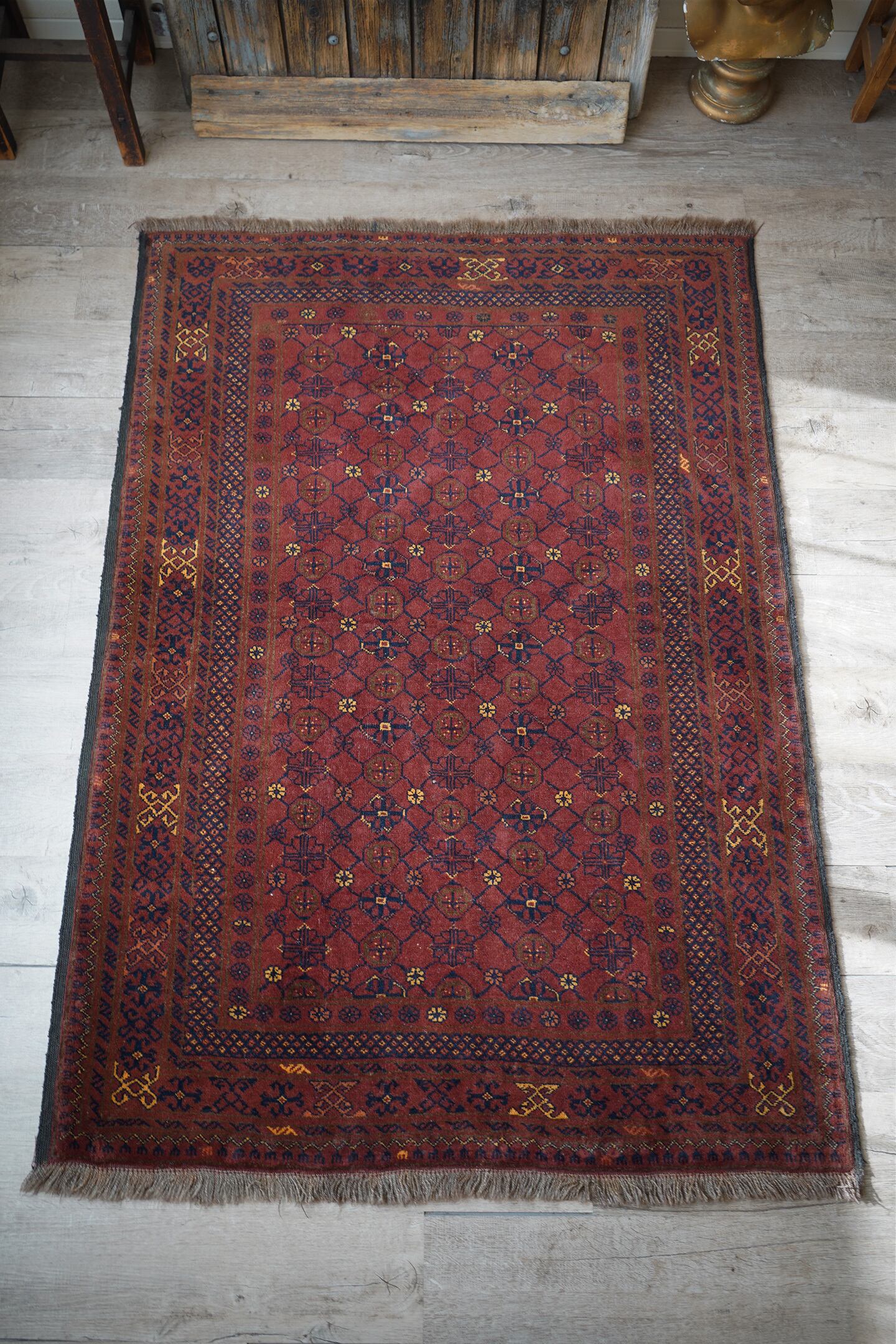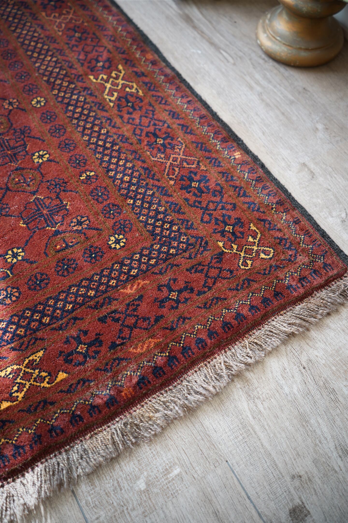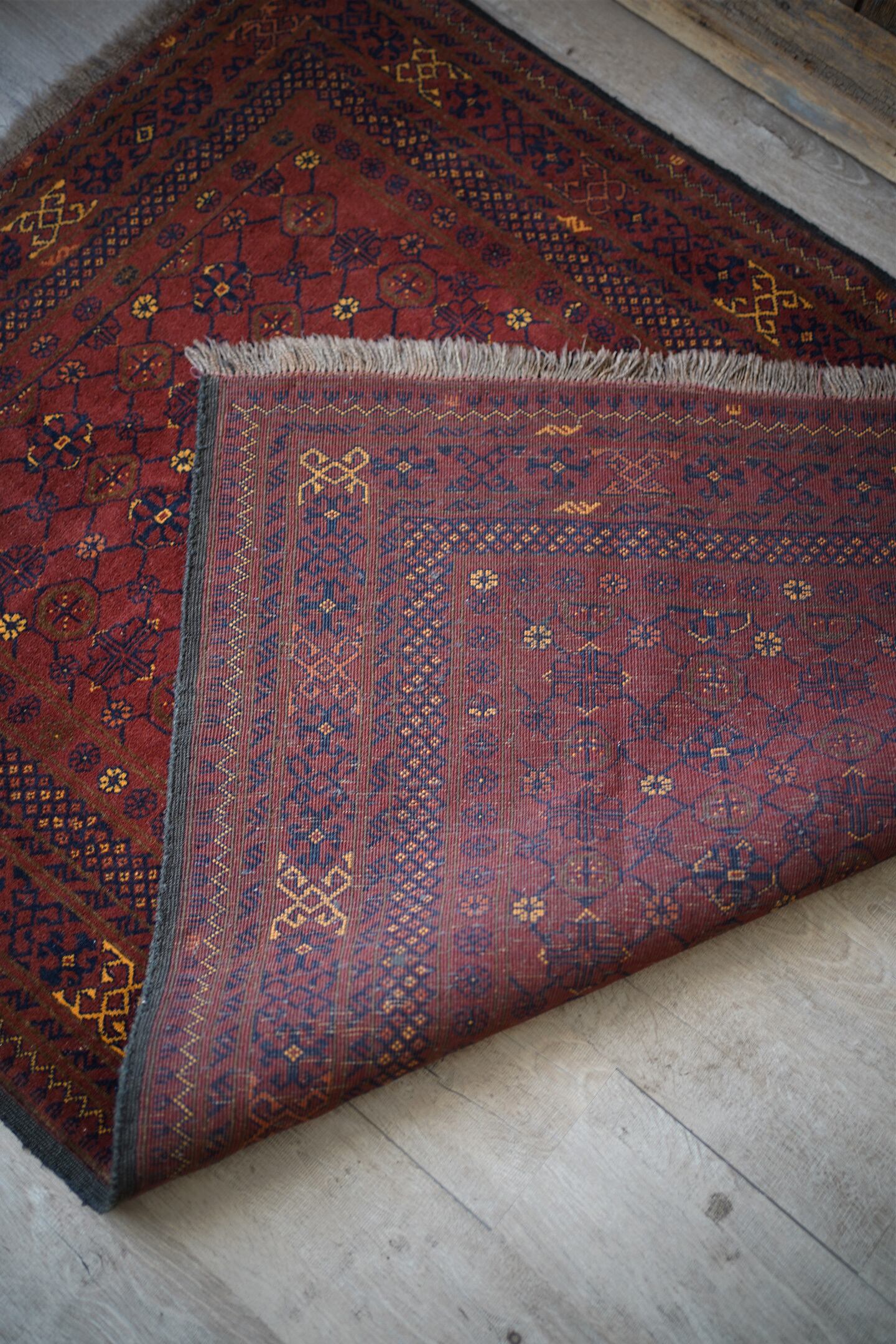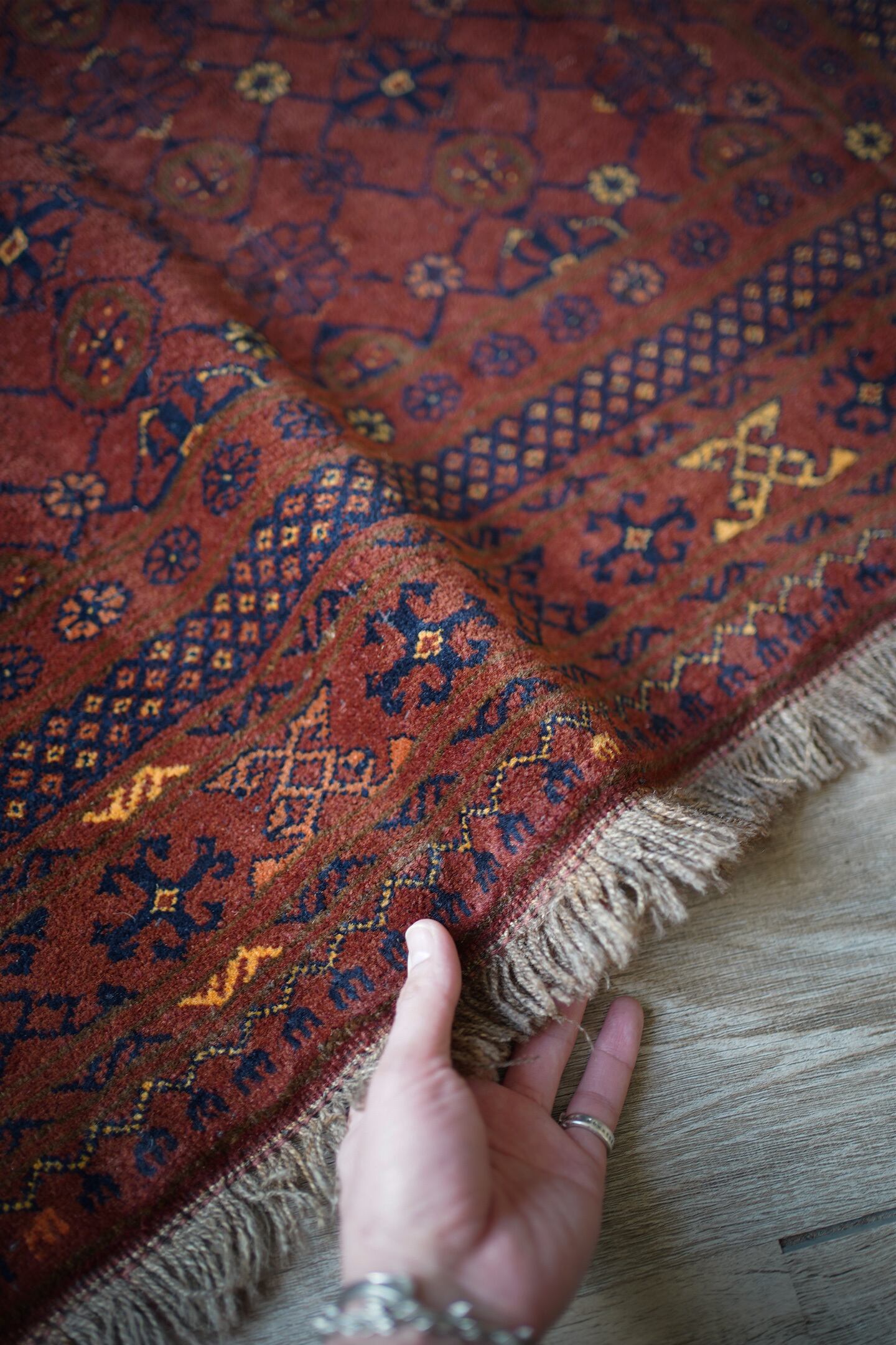 約60年前にトルクメン系の部族によってアフガニスタンで織られた"ベシール"と呼ばれるラグです。 深みのあるブラウンカラーに少し赤が入ったようなヴィンテージを感じさせる色合いで、アルマギュルというリンゴの花柄紋様が織り込まれたデザイン。パイルはしっかりとした目の詰まった質感で、表面はソフトウールで優しく滑らかな肌触り。厚みは6mm〜7mmほどで、裏面にハリもあり、重量感のある堅牢な作りをしています。中央あたりが少しパイルが薄くなっている箇所がありますが、それ以外は目立った補修跡やダメージもなく状態良好。リビングや寝室などお好みの場所にどうぞ♪