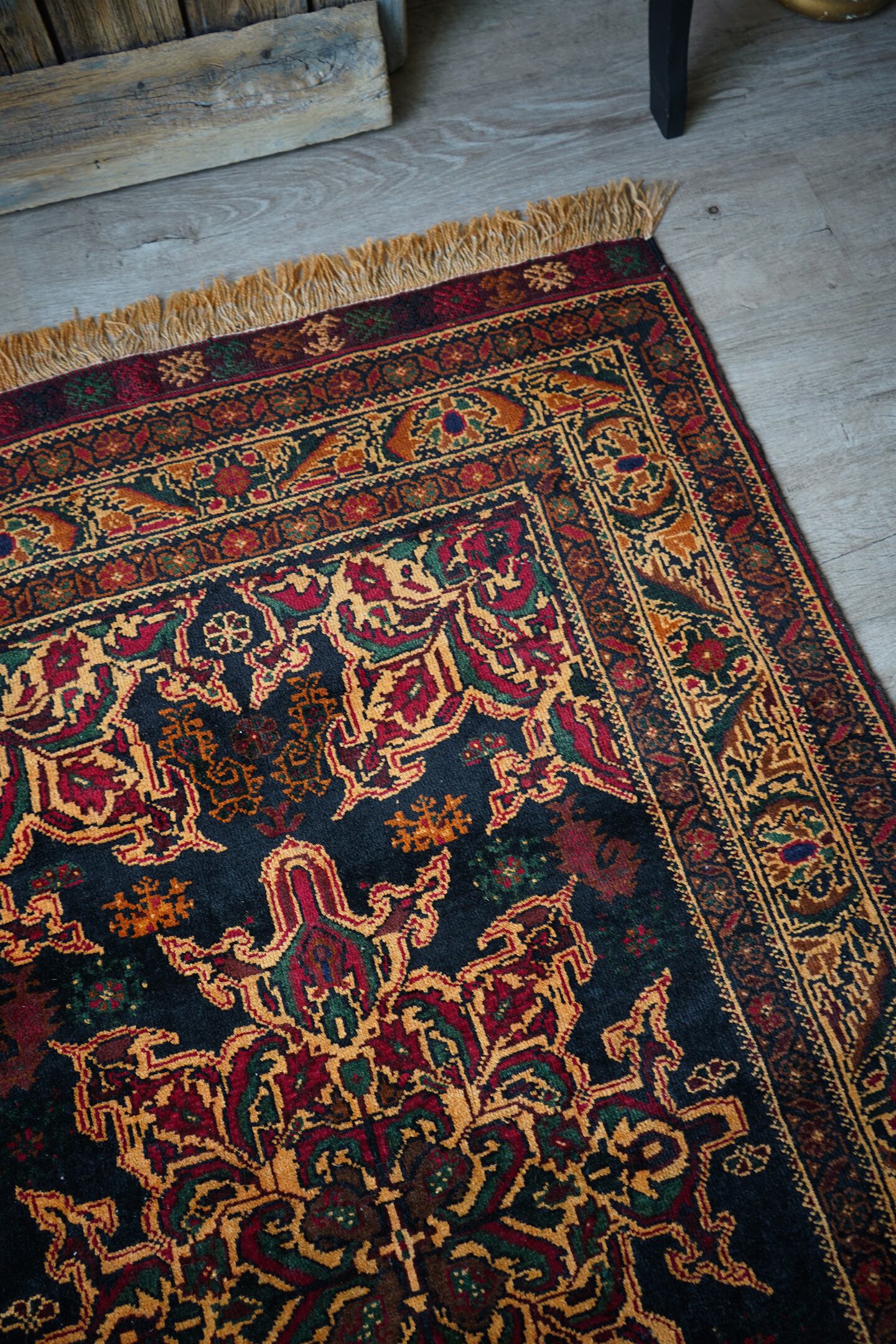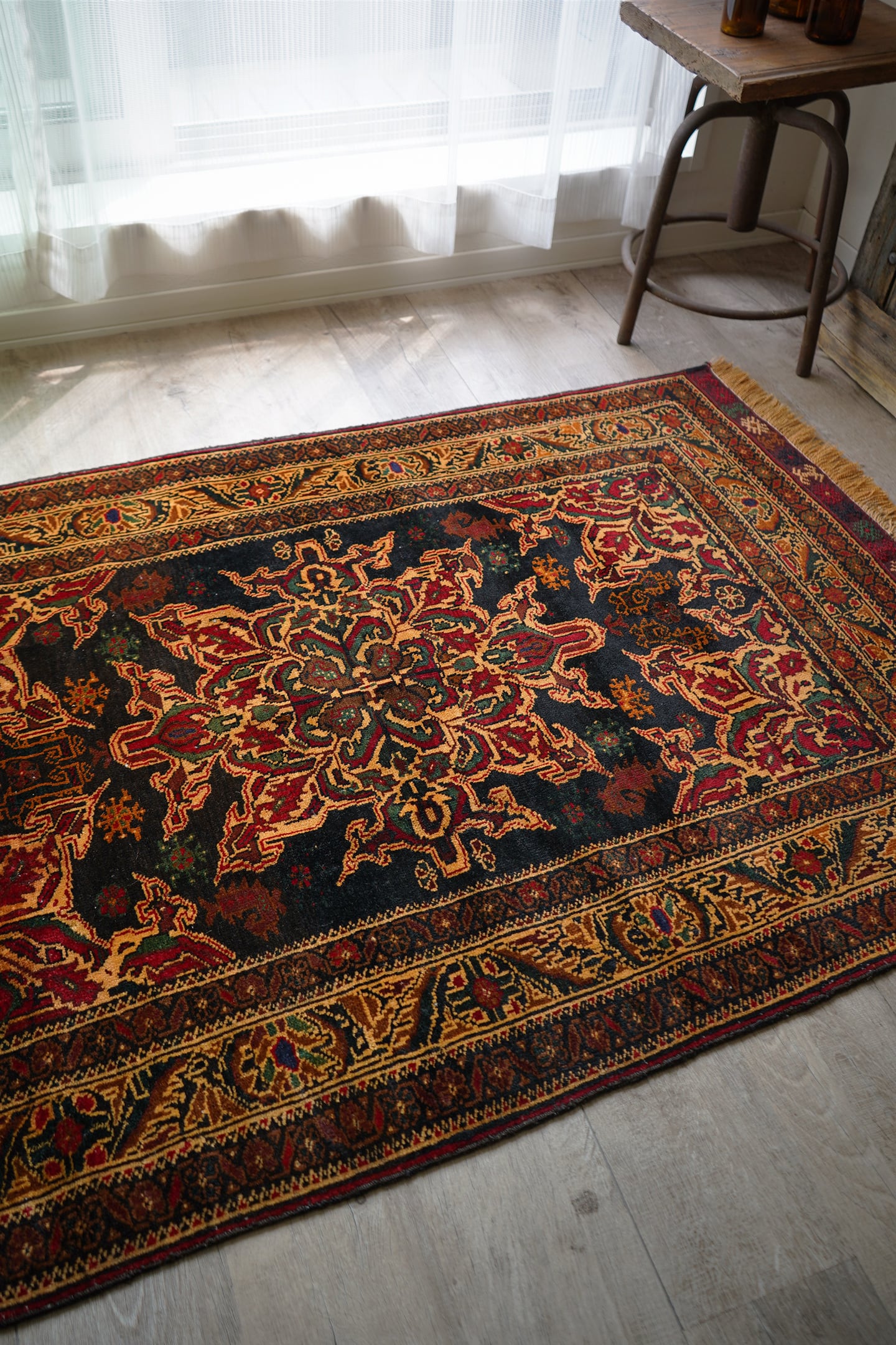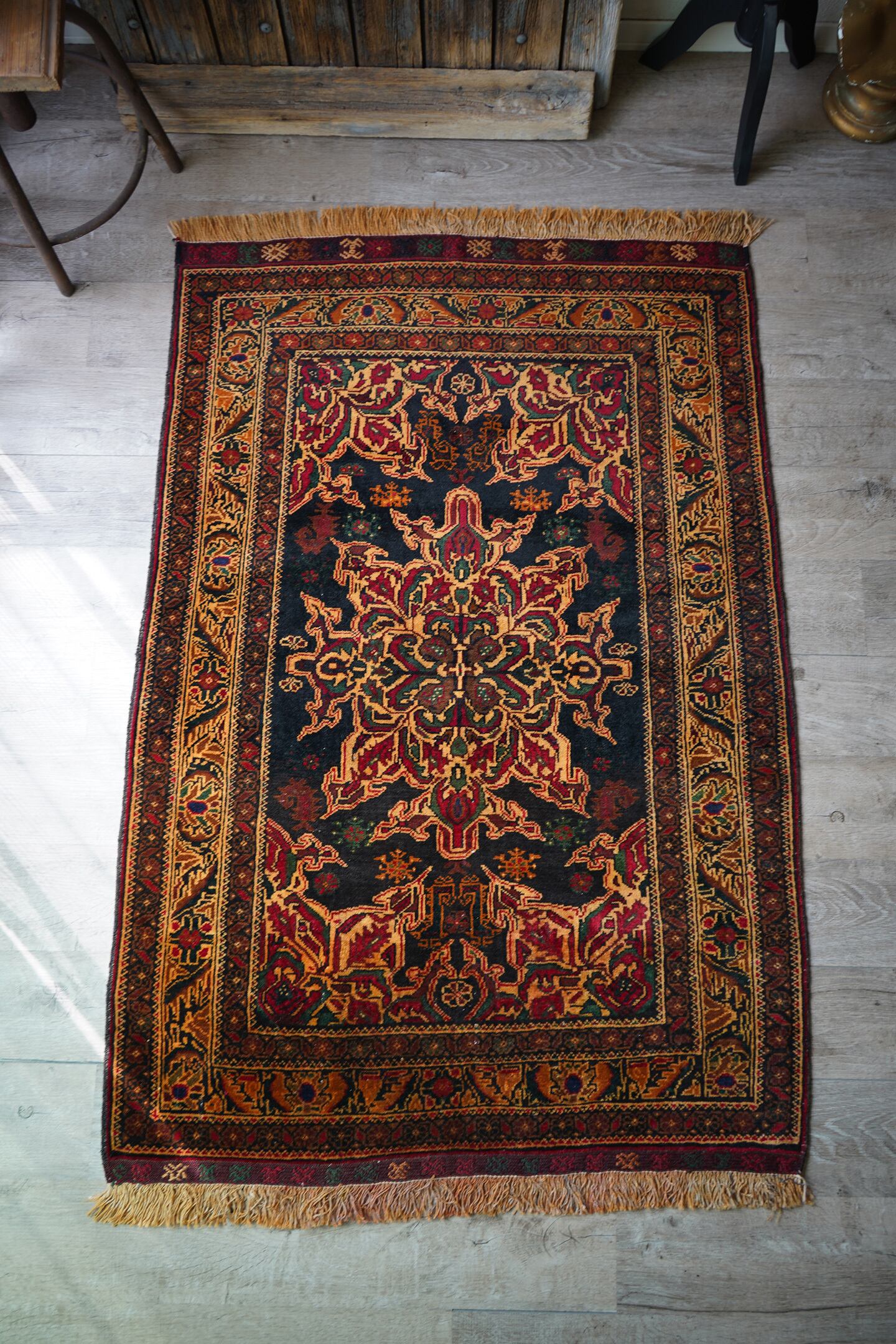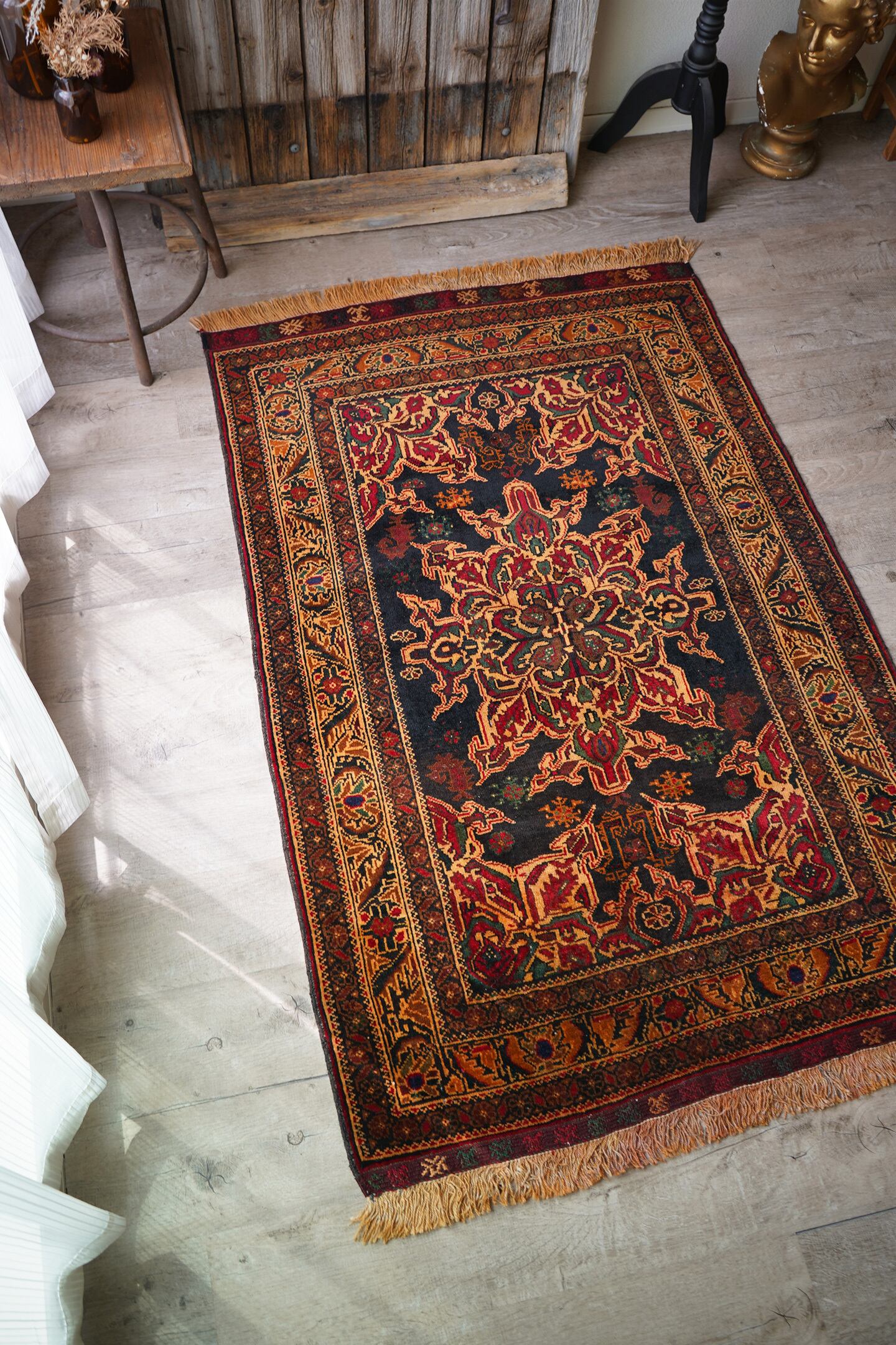 経年約30年のアフガニスタン産のマリキバルーチラグ。フローラルなデザインが素敵な、存在感のある美しい一枚。配色はオレンジベージュ、ブラック、ダークグリーン、ダークレッドなど。フリンジ部分は可愛らしいキリムエンドの作りになっています。表面はサラふわっとしたら滑らかな肌触りで、厚みは4mm〜5mm程度。ダメージや補修跡もなく、大変良好なコンディション。リビングをはじめ、書斎などにもオススメです♫