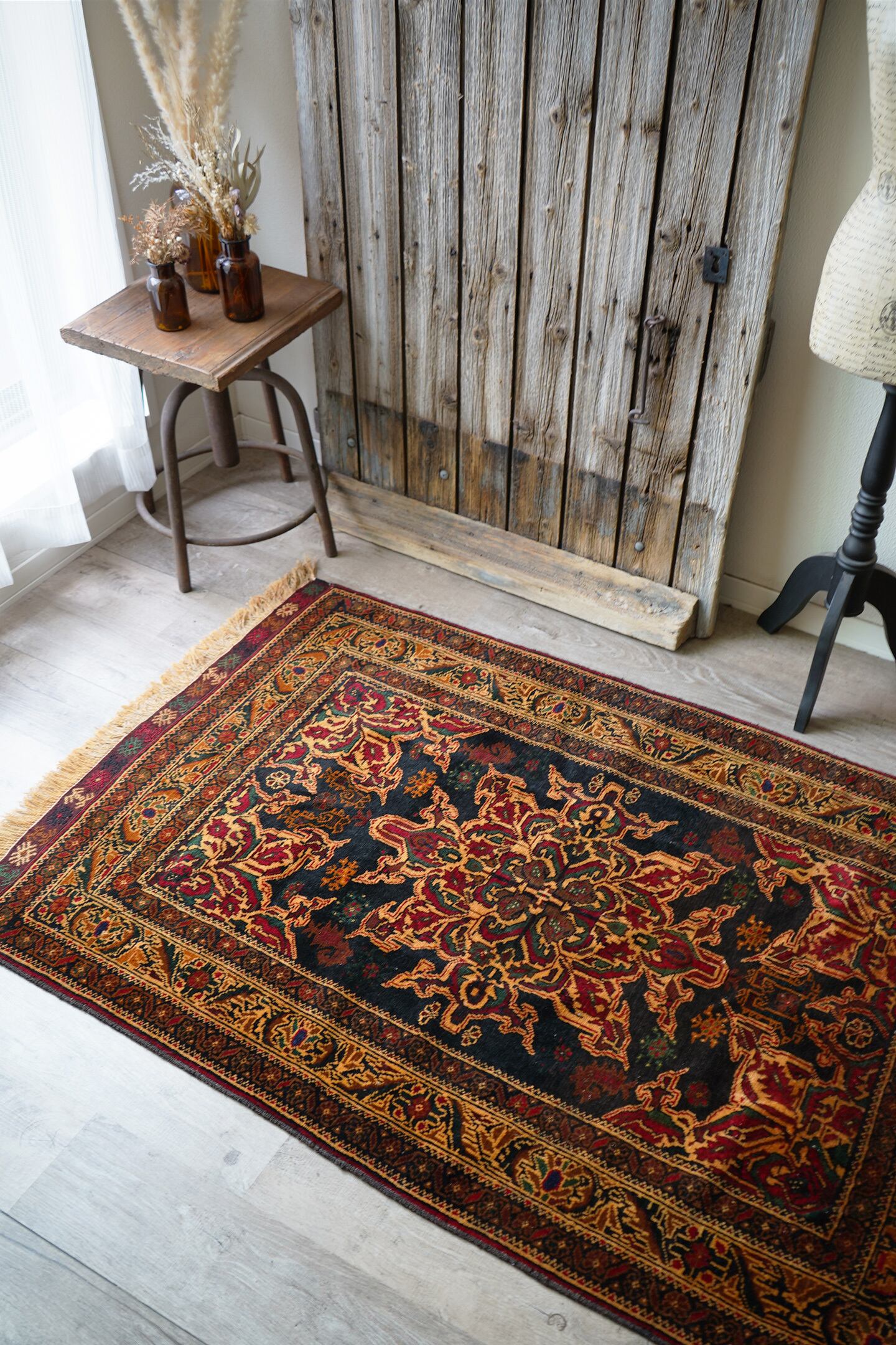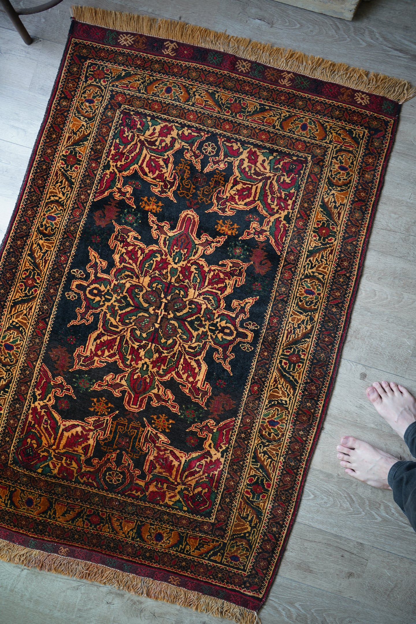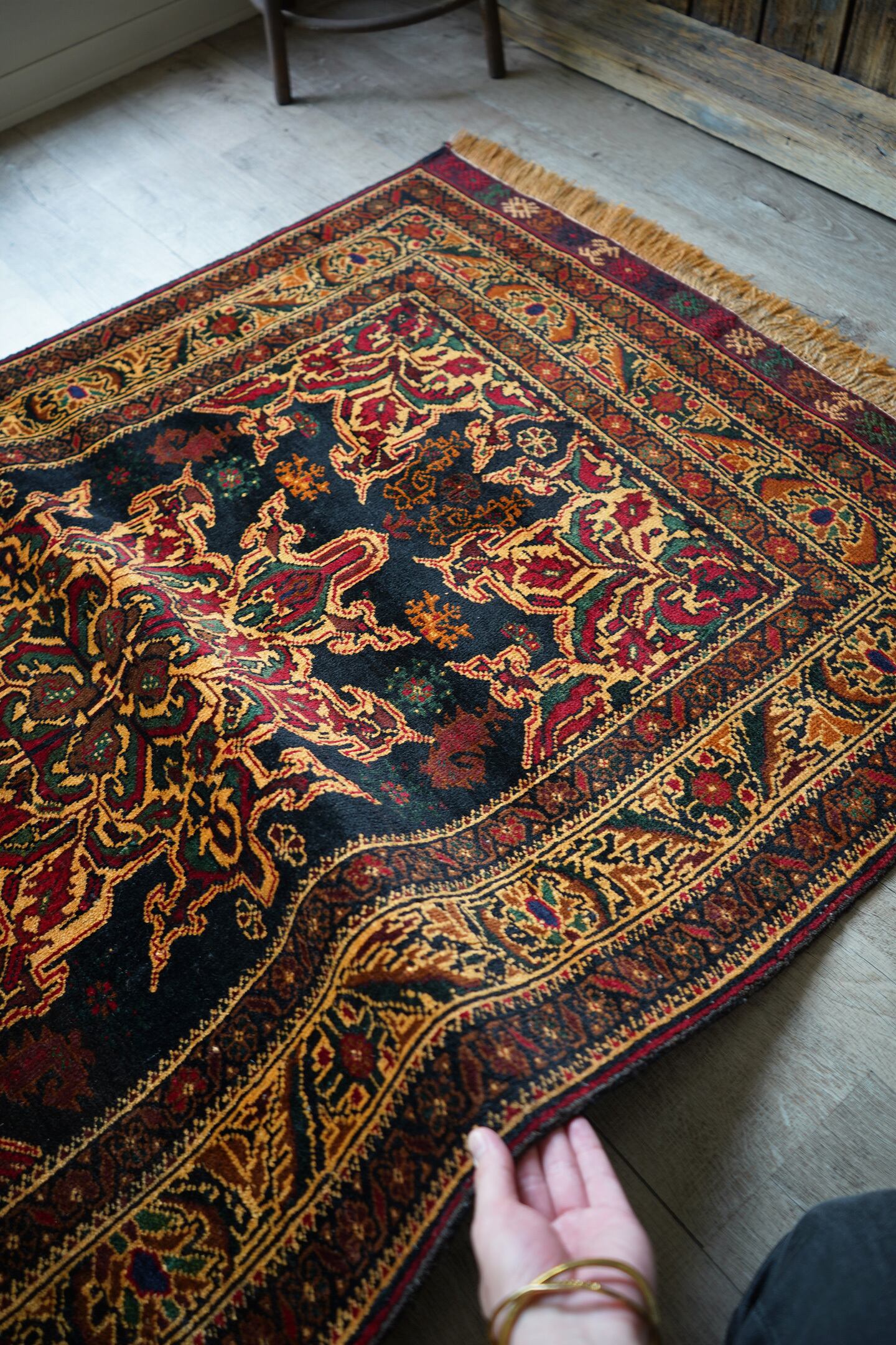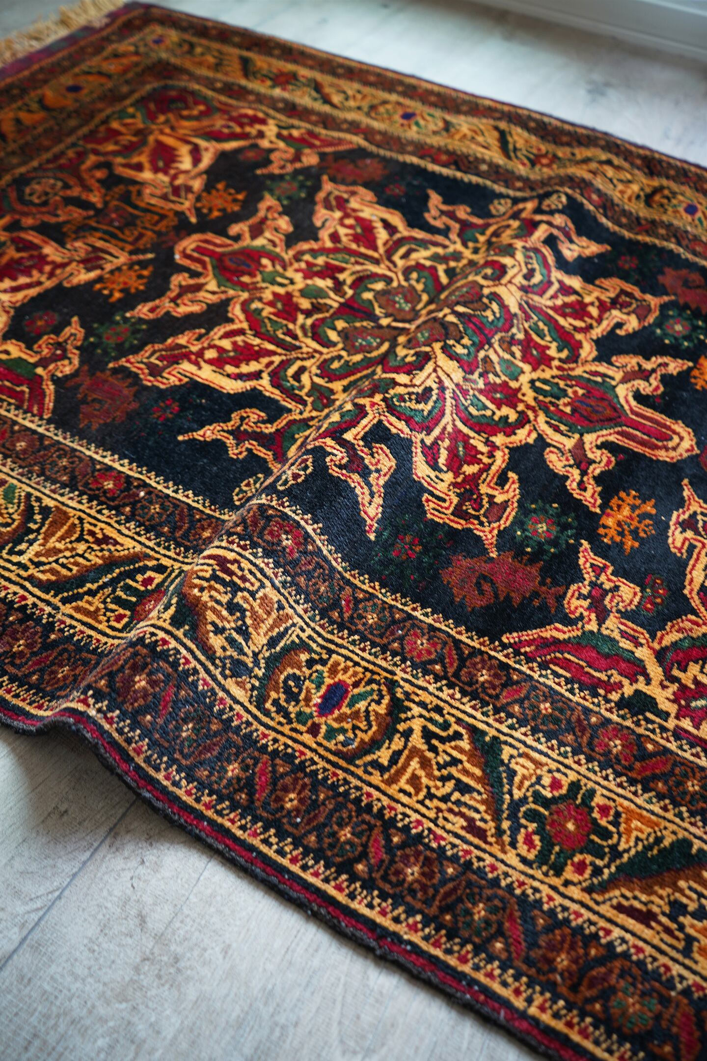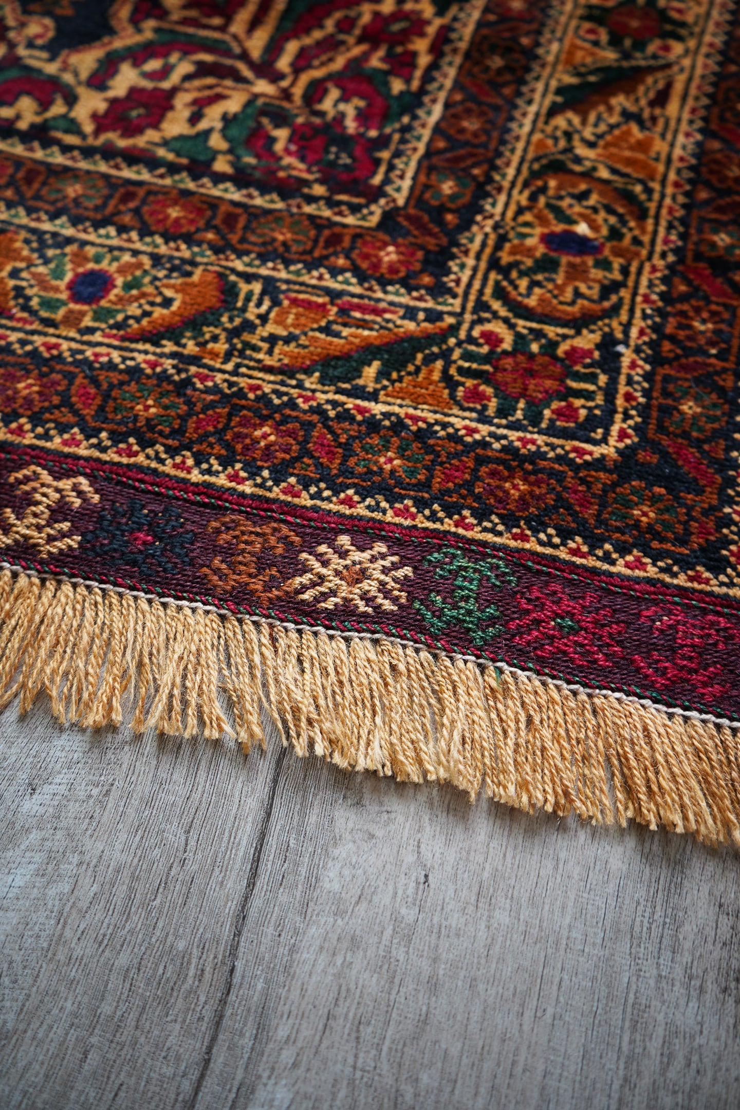 経年約30年のアフガニスタン産のマリキバルーチラグ。フローラルなデザインが素敵な、存在感のある美しい一枚。配色はオレンジベージュ、ブラック、ダークグリーン、ダークレッドなど。フリンジ部分は可愛らしいキリムエンドの作りになっています。表面はサラふわっとしたら滑らかな肌触りで、厚みは4mm〜5mm程度。ダメージや補修跡もなく、大変良好なコンディション。リビングをはじめ、書斎などにもオススメです♫