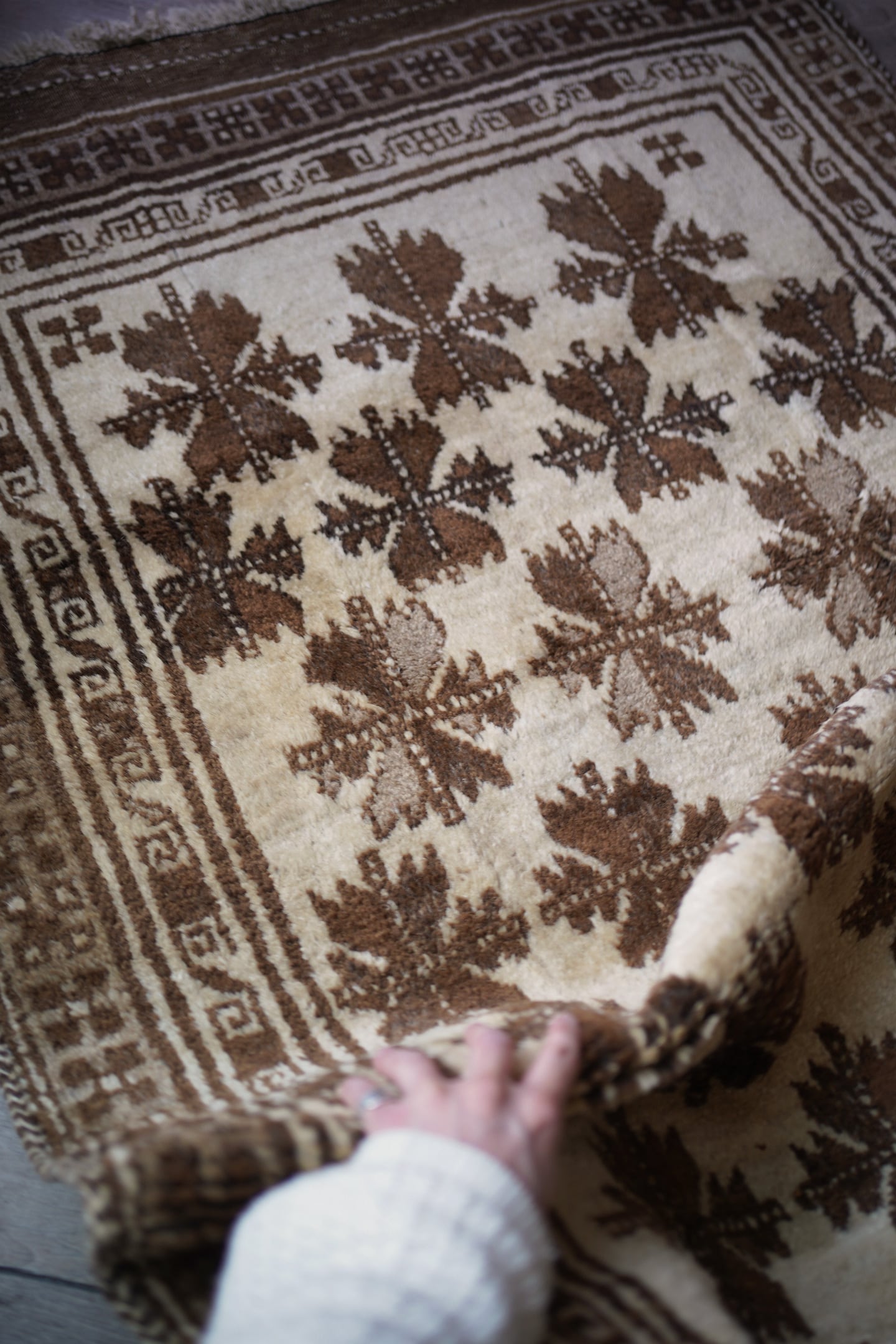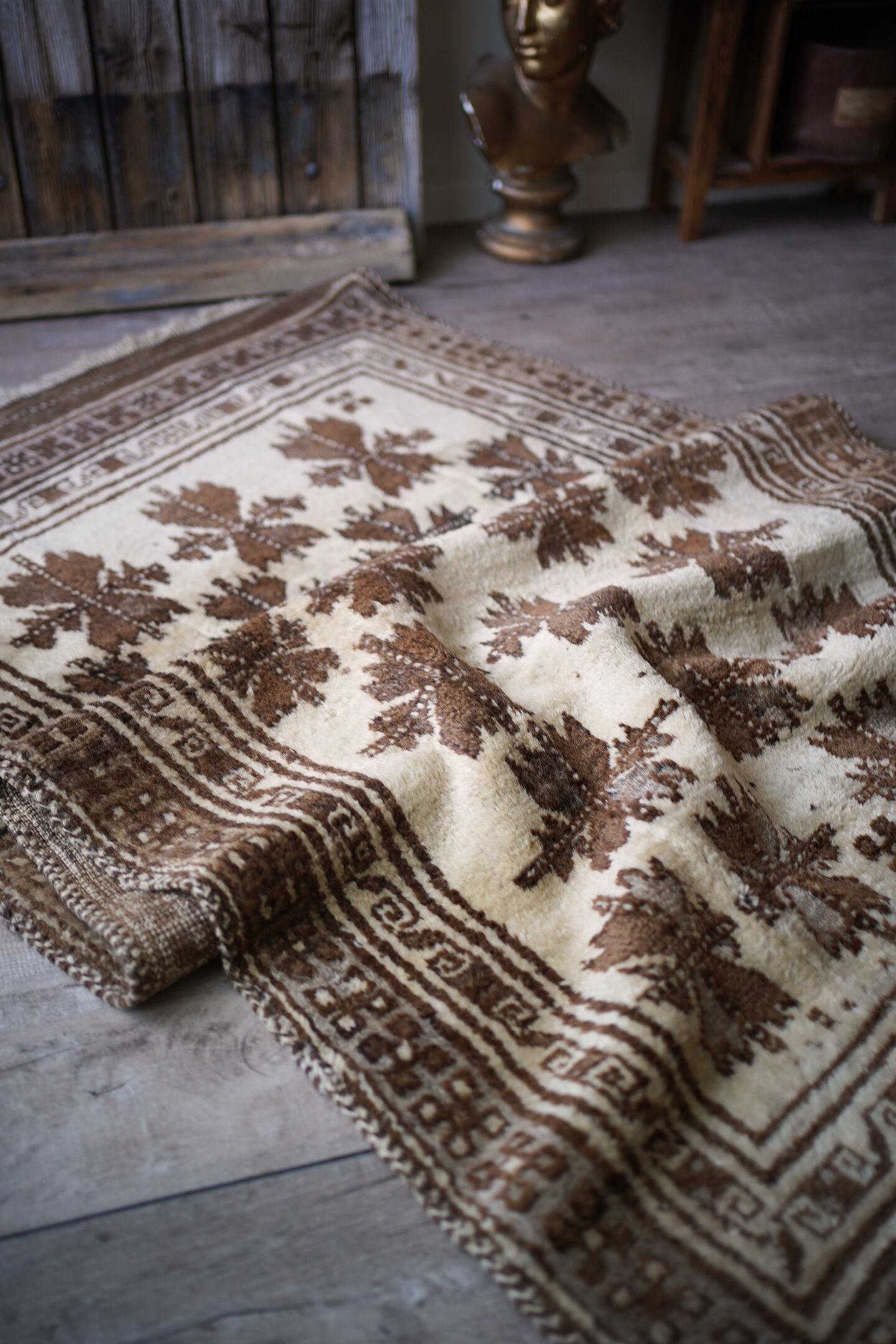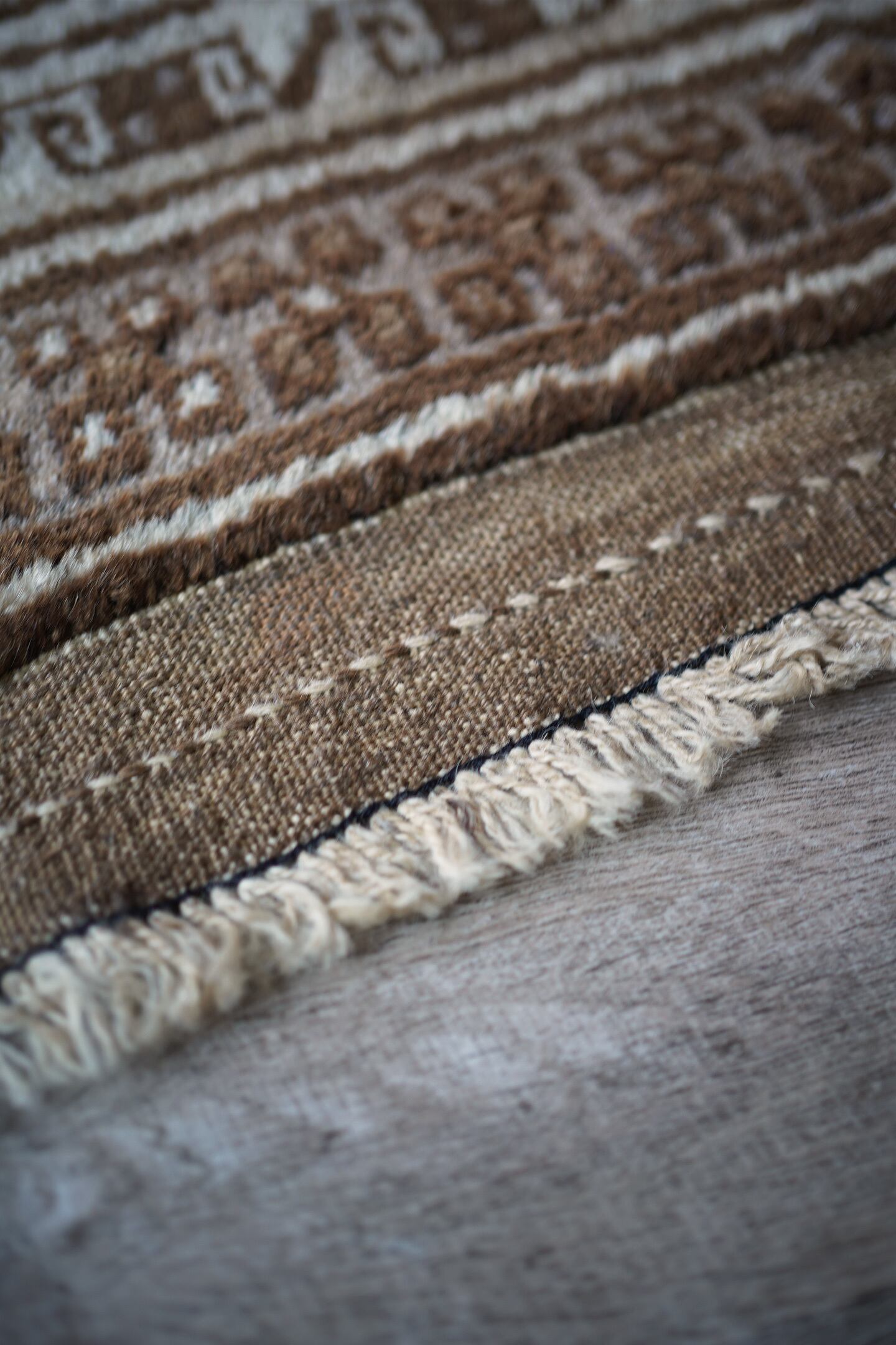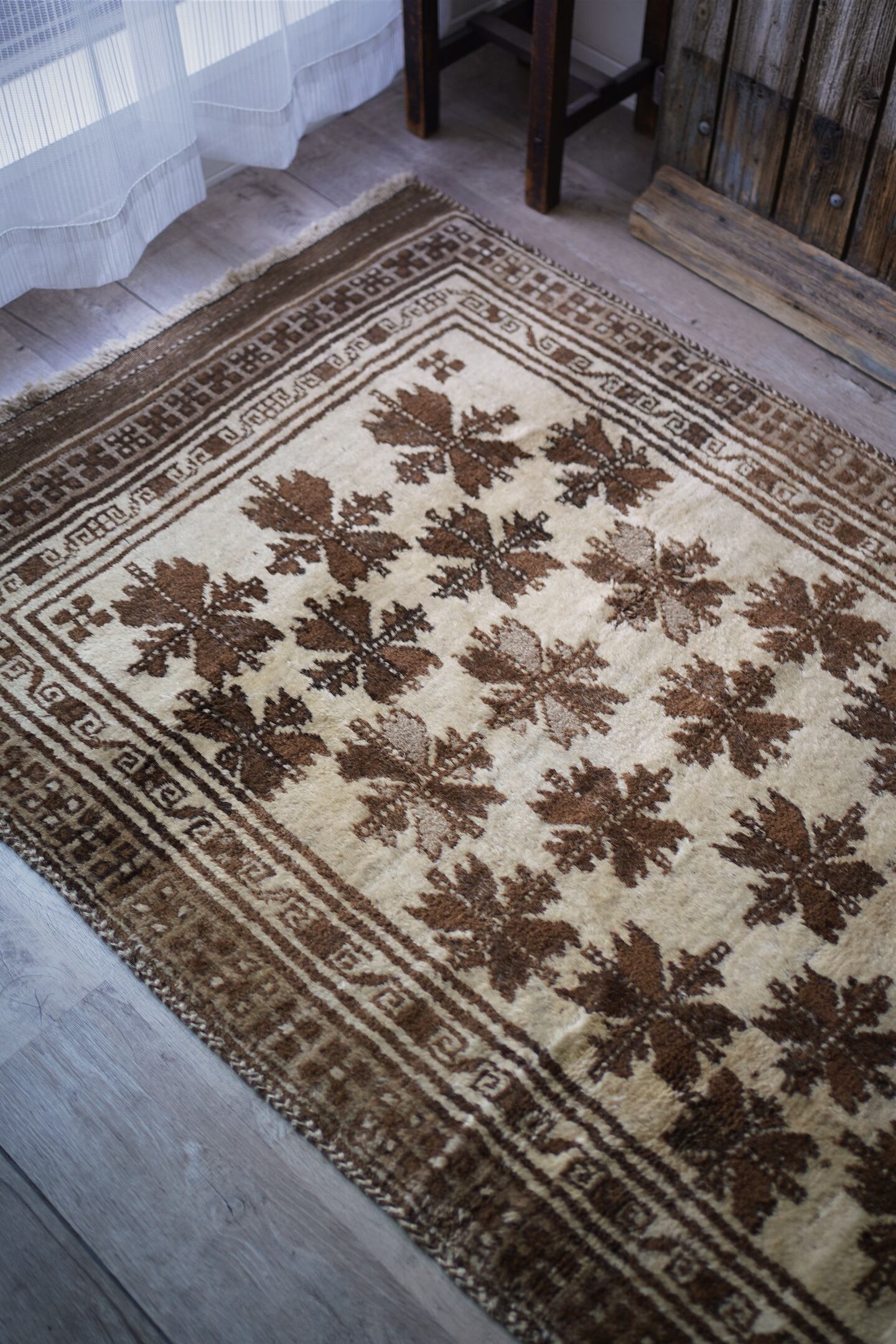 染色されていない原毛のナチュラルな色味が素敵なアフガニスタン産のタイマニラグ。不均一な配置で織り込まれた葉っぱの形をしたチナール紋様が手織りのぬくもりを感じさせます。配色はクリーム色、ベージュ、グレーベージュ、ブラウン、焦茶などの優しい色合い。毛足長めでふわっと柔らかく優しい肌触りで、ソファ前などで寝転がったり、寛ぐのに最適な質感です。フリンジ部分はシンプルなデザインのキリムエンドの作りになっています。厚みは8mm程度となります。目立ったダメージや補修跡もなく、状態良好です。お部屋に取り入れやすい色味とデザインなので、トライバルラグが初めての方にも大変オススメですよ。リビングをはじめ、ベットサイドなどにも◎