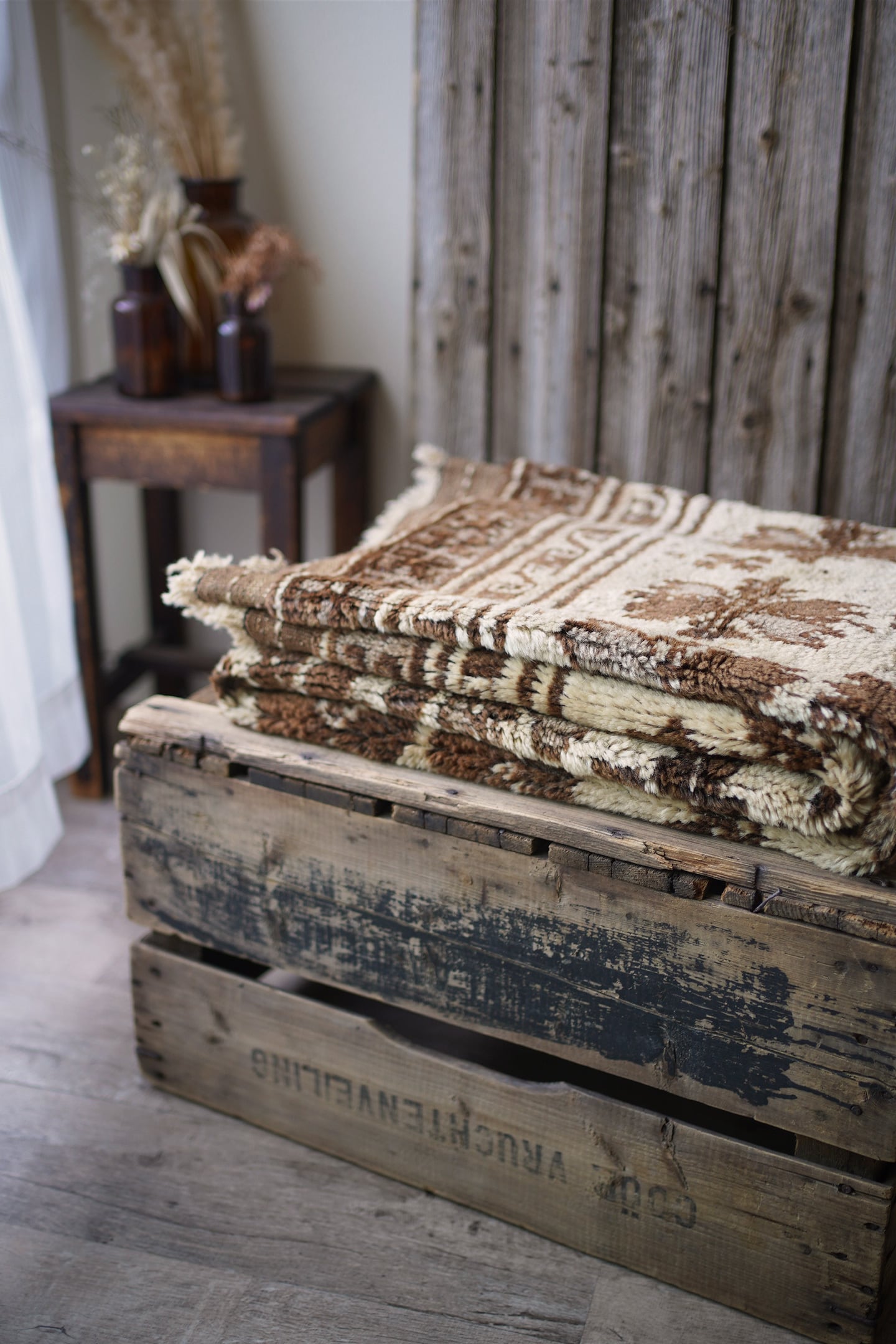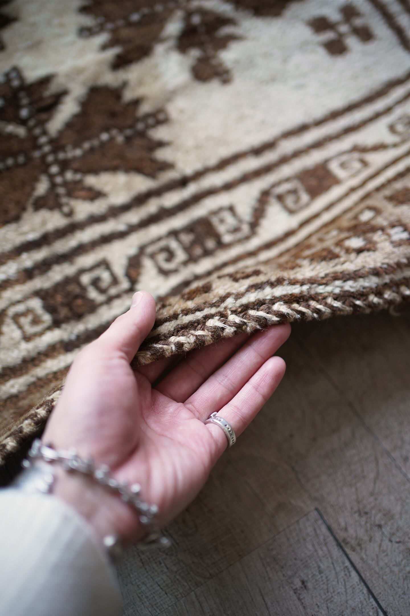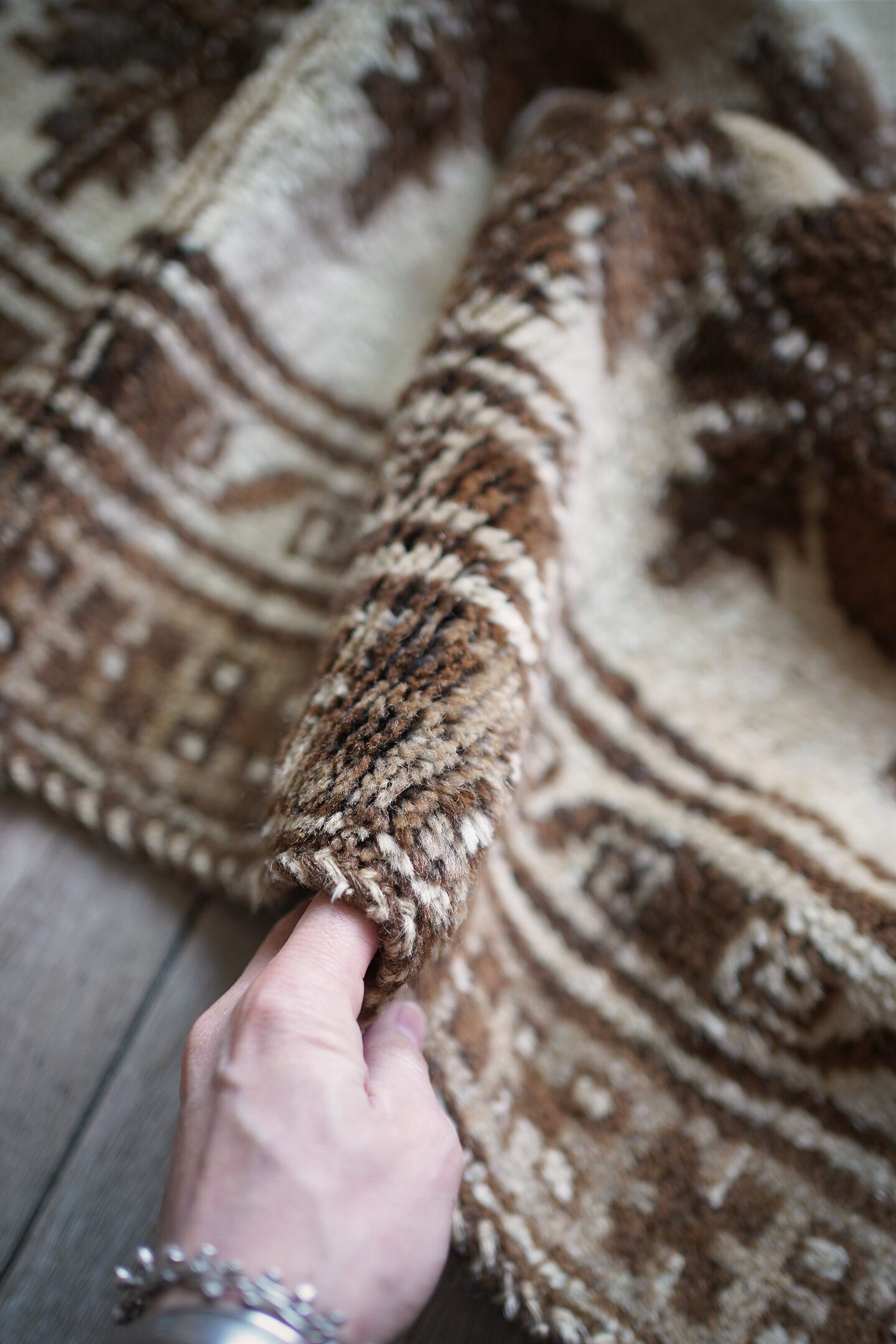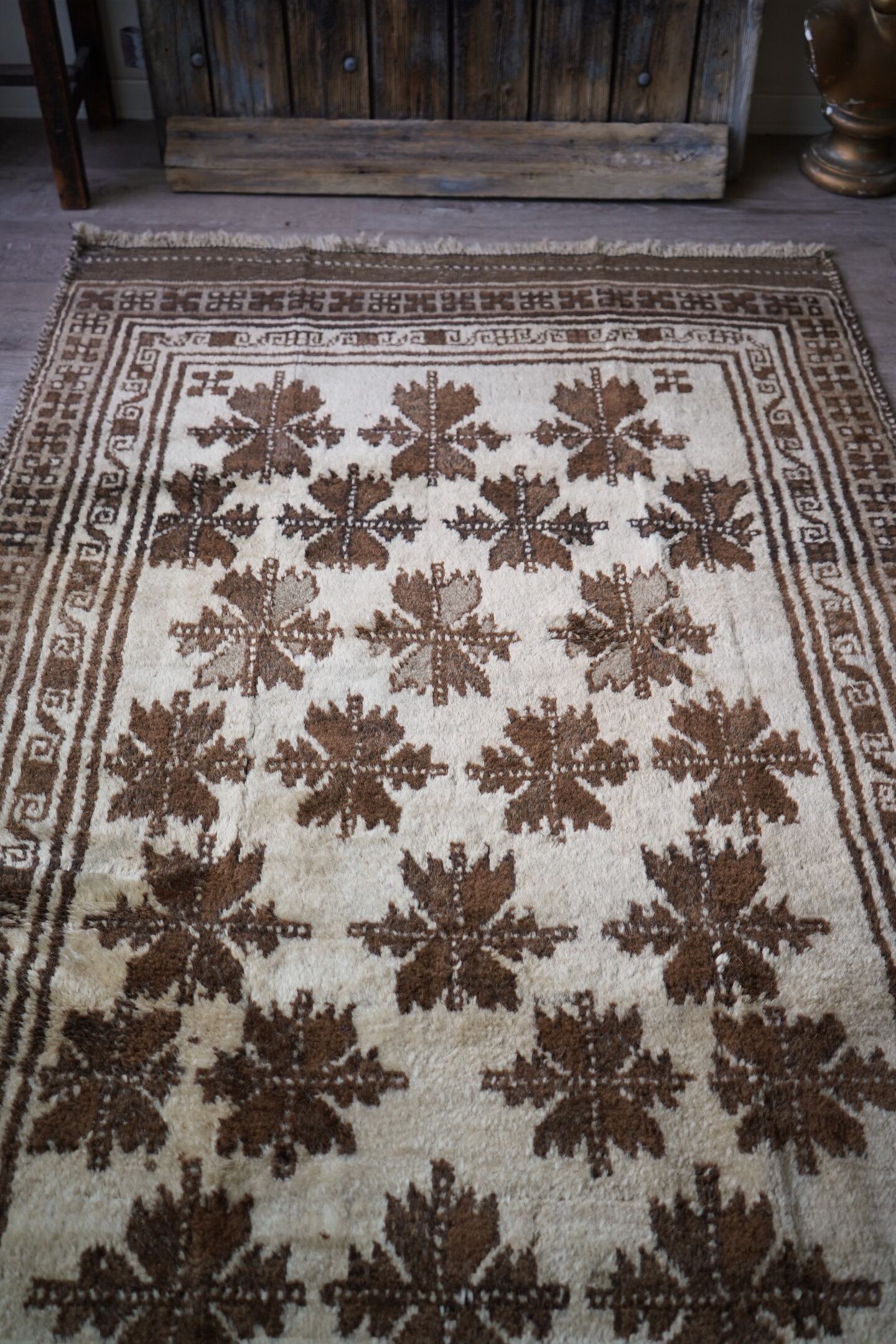 染色されていない原毛のナチュラルな色味が素敵なアフガニスタン産のタイマニラグ。不均一な配置で織り込まれた葉っぱの形をしたチナール紋様が手織りのぬくもりを感じさせます。配色はクリーム色、ベージュ、グレーベージュ、ブラウン、焦茶などの優しい色合い。毛足長めでふわっと柔らかく優しい肌触りで、ソファ前などで寝転がったり、寛ぐのに最適な質感です。フリンジ部分はシンプルなデザインのキリムエンドの作りになっています。厚みは8mm程度となります。目立ったダメージや補修跡もなく、状態良好です。お部屋に取り入れやすい色味とデザインなので、トライバルラグが初めての方にも大変オススメですよ。リビングをはじめ、ベットサイドなどにも◎