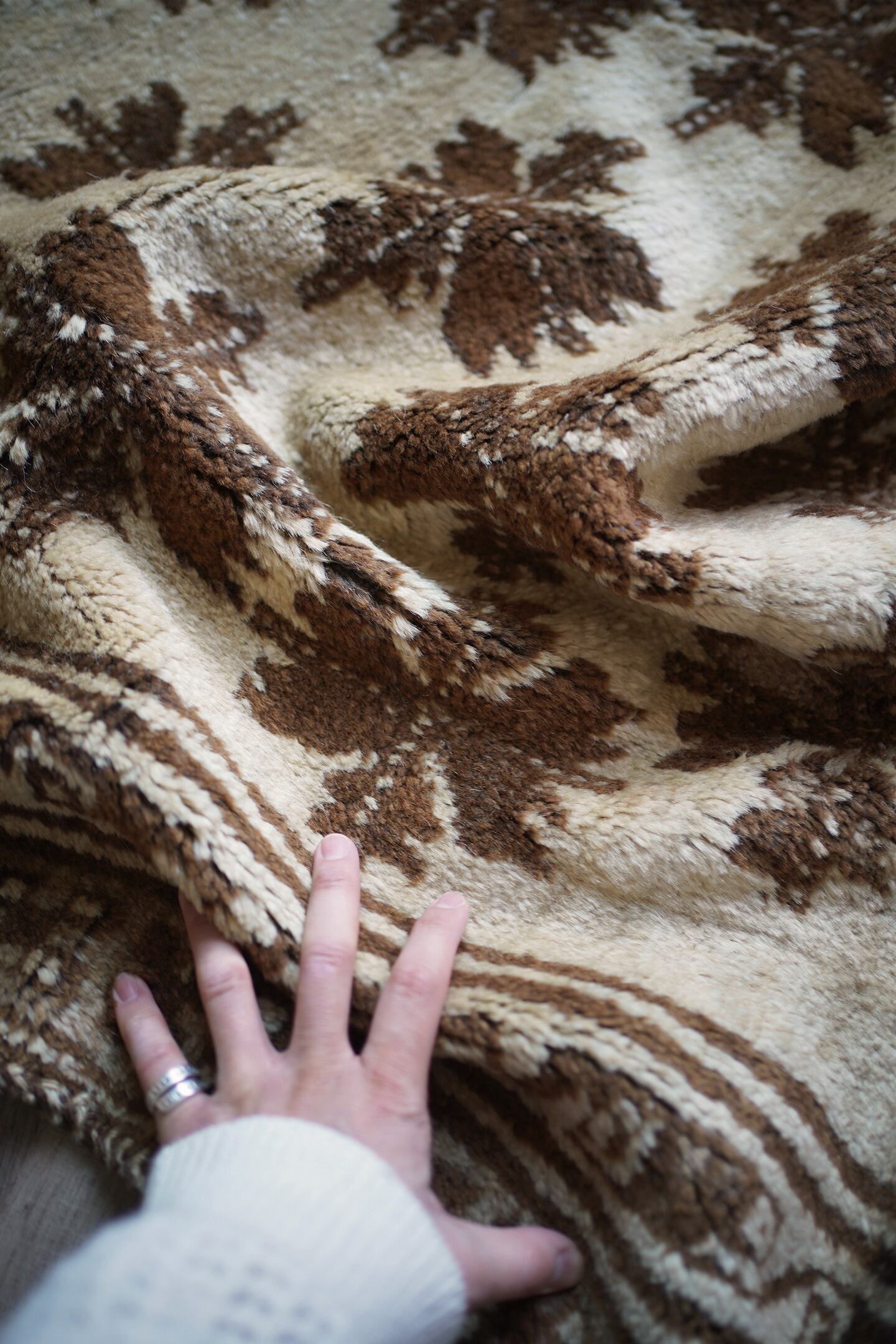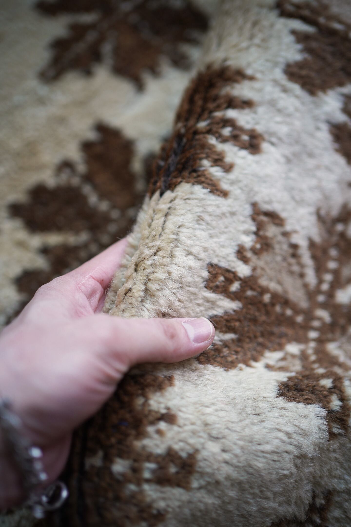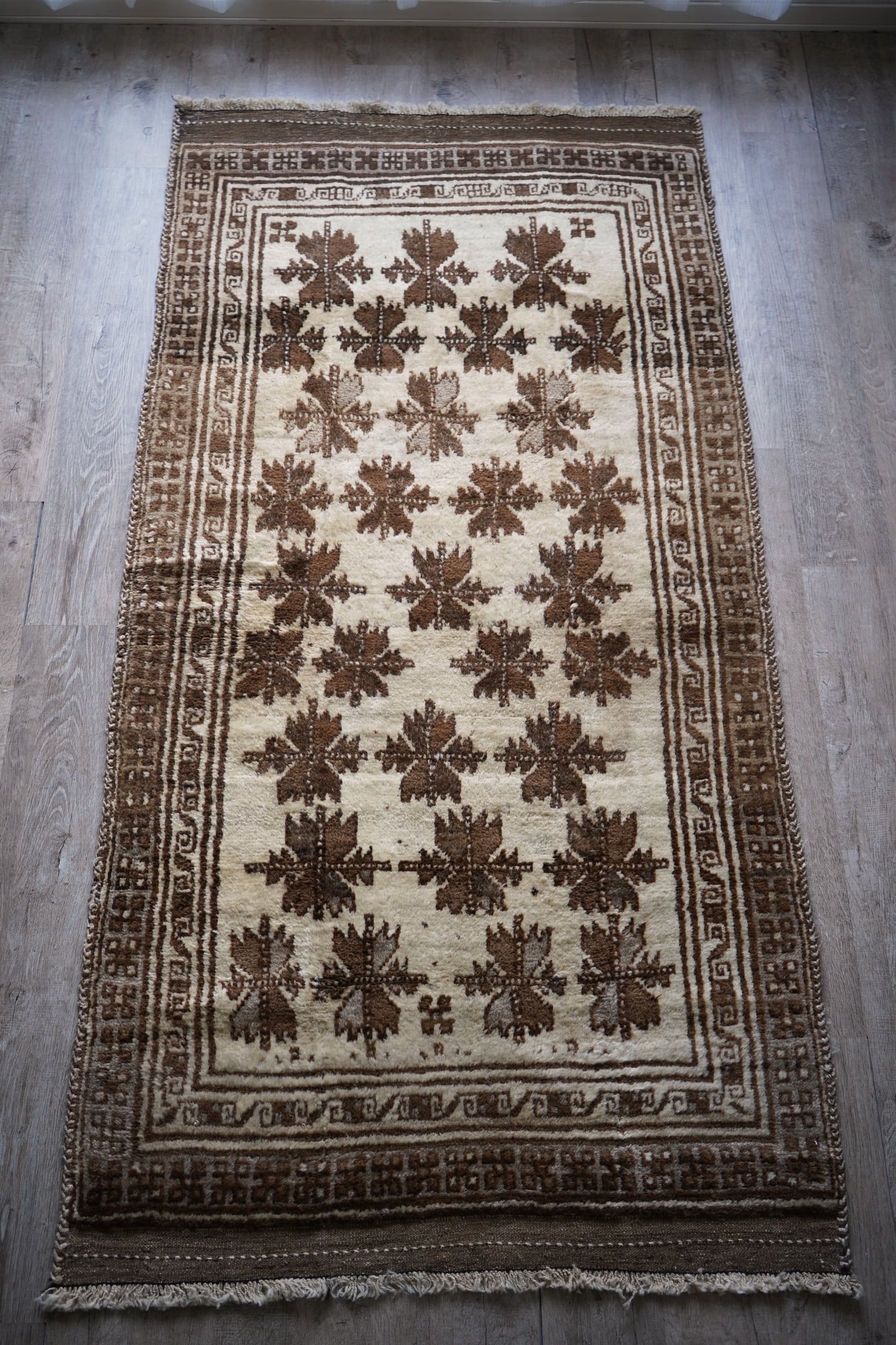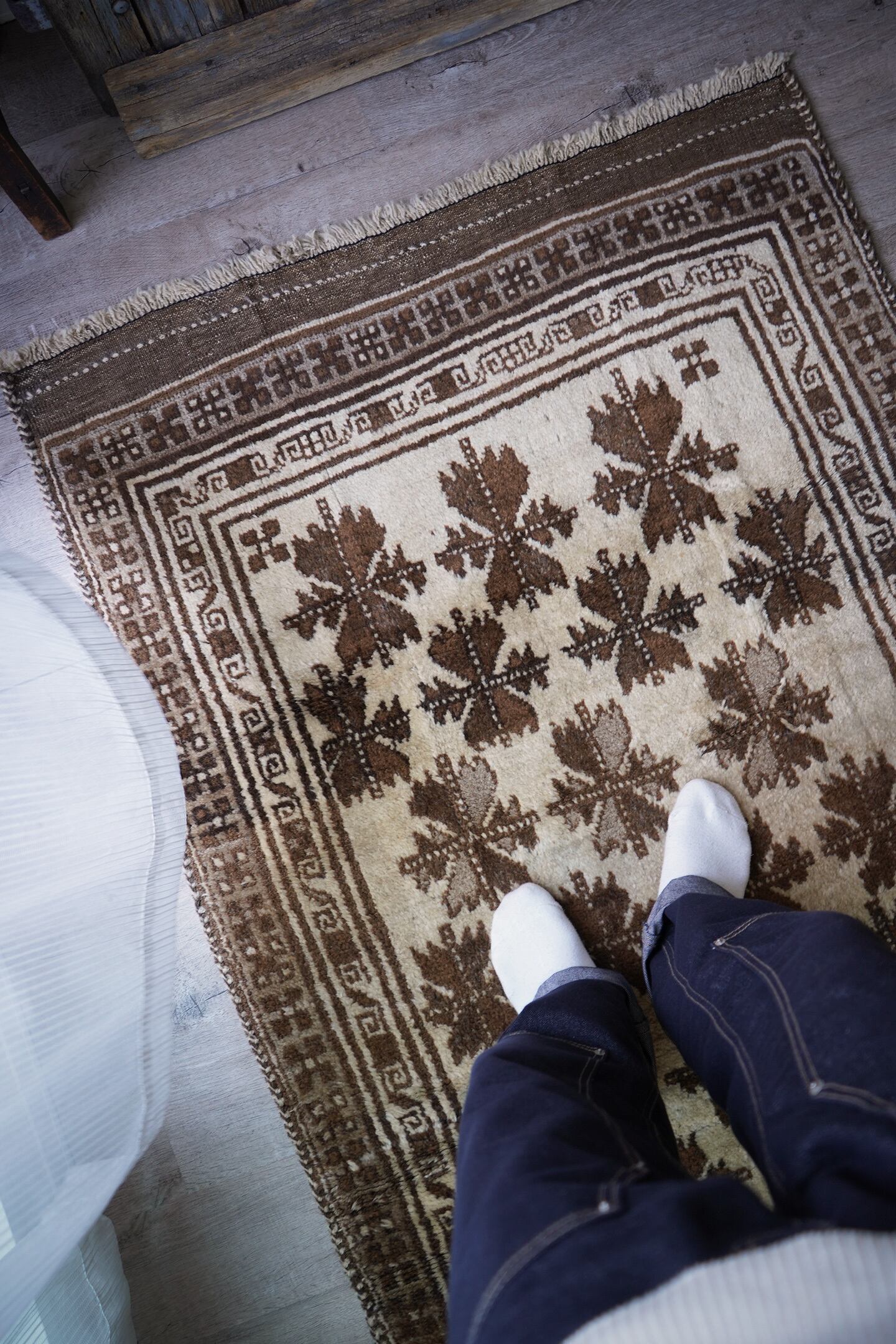 染色されていない原毛のナチュラルな色味が素敵なアフガニスタン産のタイマニラグ。不均一な配置で織り込まれた葉っぱの形をしたチナール紋様が手織りのぬくもりを感じさせます。配色はクリーム色、ベージュ、グレーベージュ、ブラウン、焦茶などの優しい色合い。毛足長めでふわっと柔らかく優しい肌触りで、ソファ前などで寝転がったり、寛ぐのに最適な質感です。フリンジ部分はシンプルなデザインのキリムエンドの作りになっています。厚みは8mm程度となります。目立ったダメージや補修跡もなく、状態良好です。お部屋に取り入れやすい色味とデザインなので、トライバルラグが初めての方にも大変オススメですよ。リビングをはじめ、ベットサイドなどにも◎
