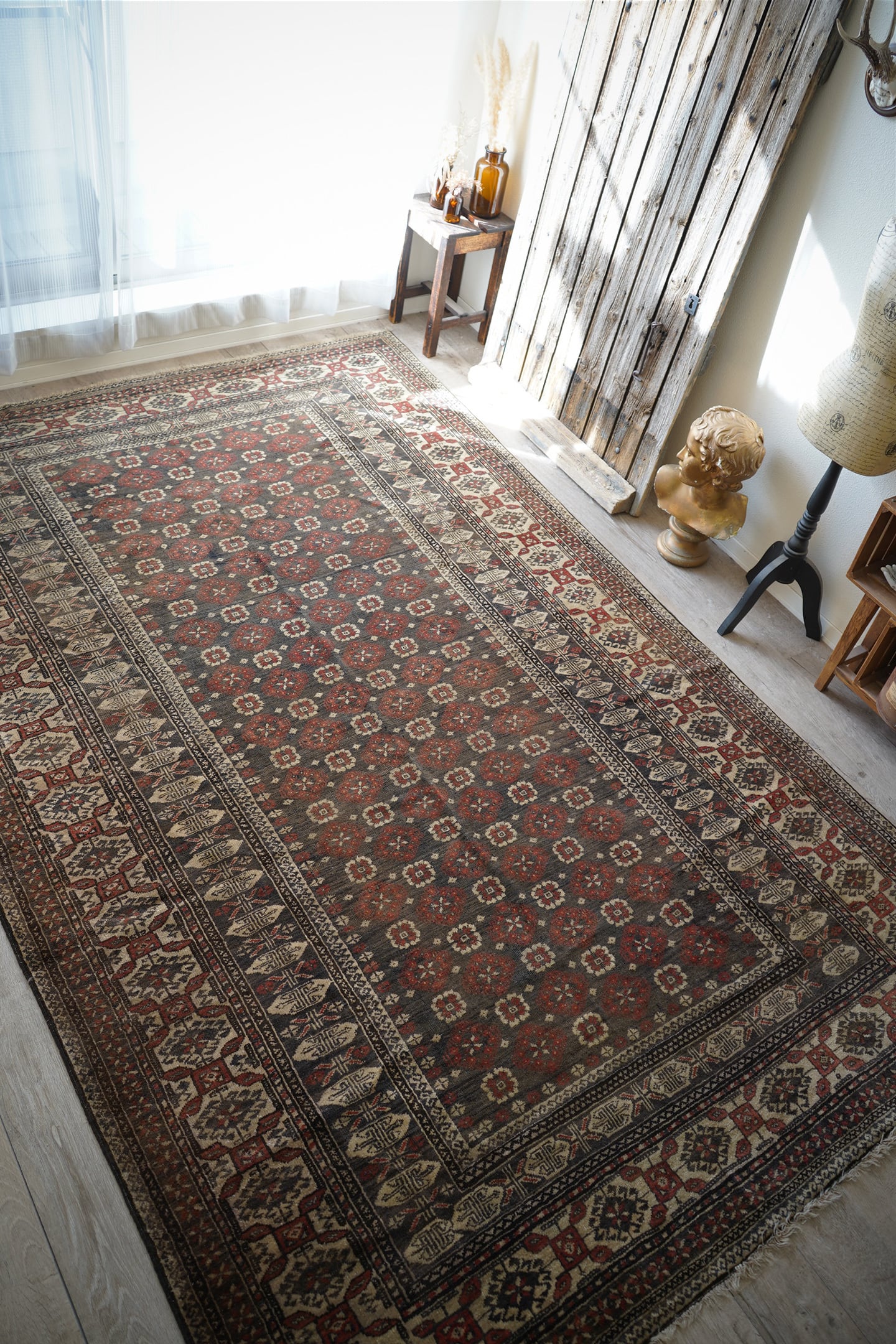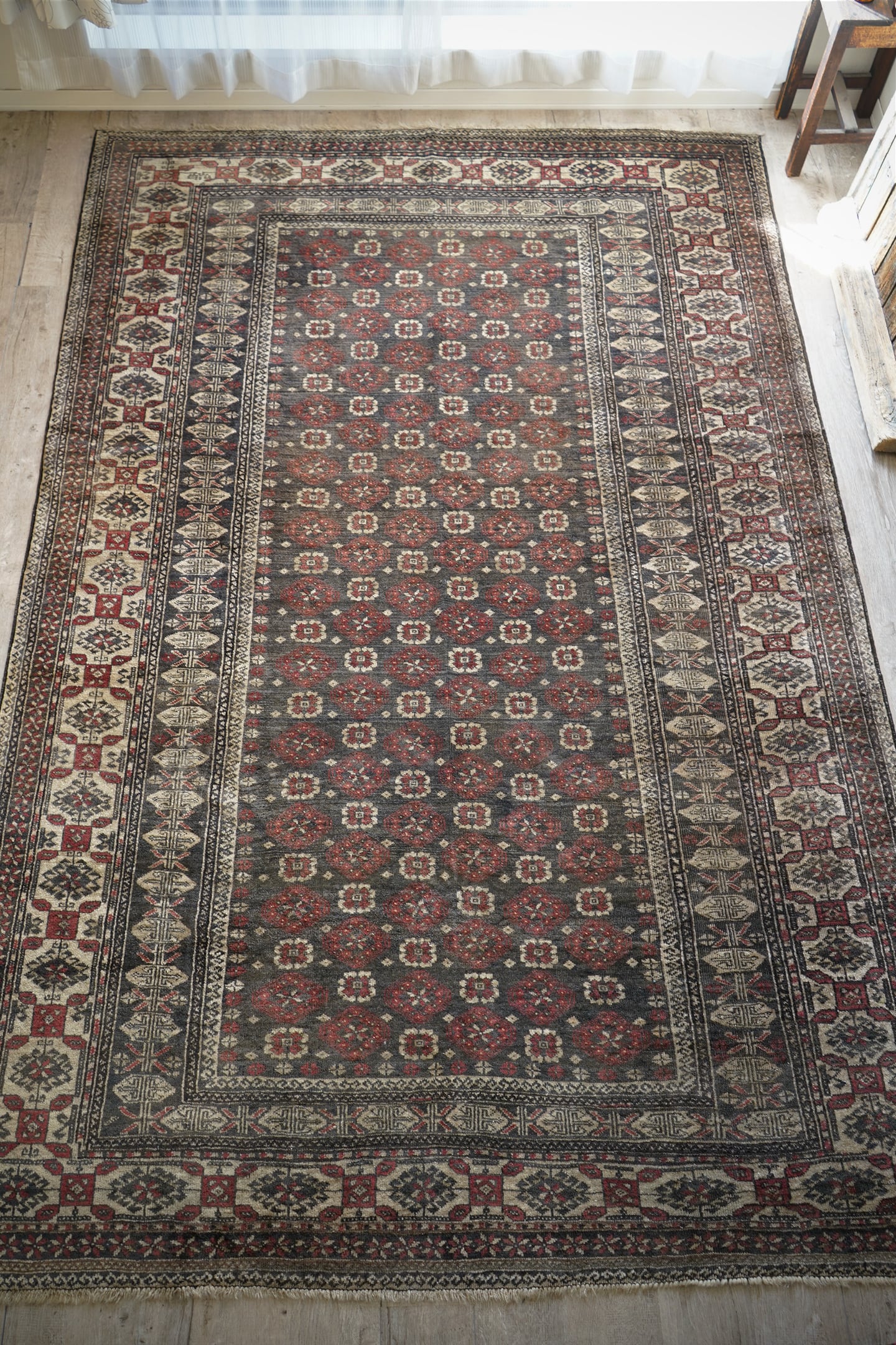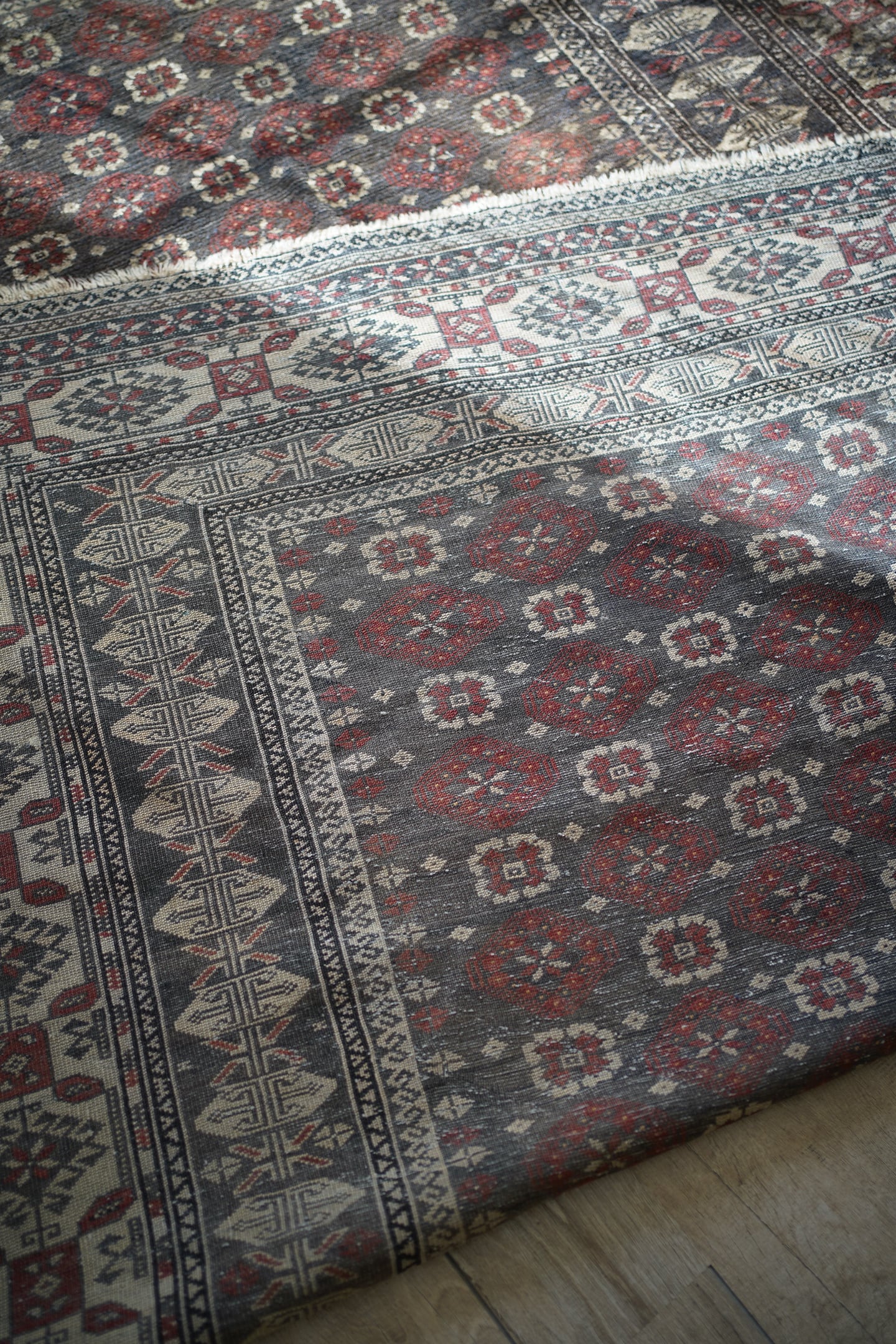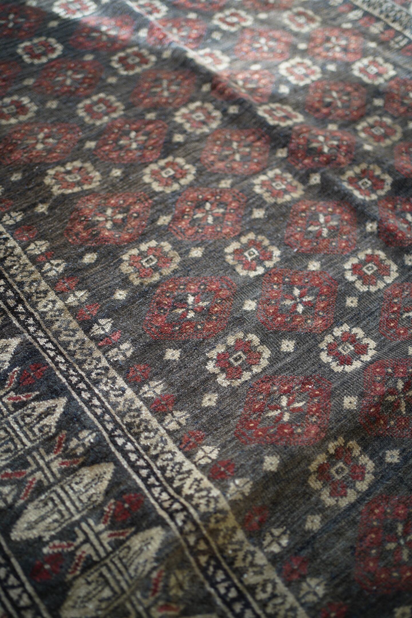 おおよそ80年前に織られたアフガニスタン産のセミアンティークラグ。全体的にくすんだ風合いで、渋くてカッコ良い雰囲気の一枚。退色した薄い黒、グークレッド、グレー寄りのベージュなどの配色です。パイルは比較的短めですが、表面はサラふわっとした滑らかな肌触りをしており、通年で敷ける万能タイプの質感です。厚みは6mm〜7mm程度。パイルが少し薄くなってところもあるものの、補修跡やダメージもなくグッドコンディション。大判サイズなので、リビングのソファ前やダイニングテーブル下などにどうぞ♪