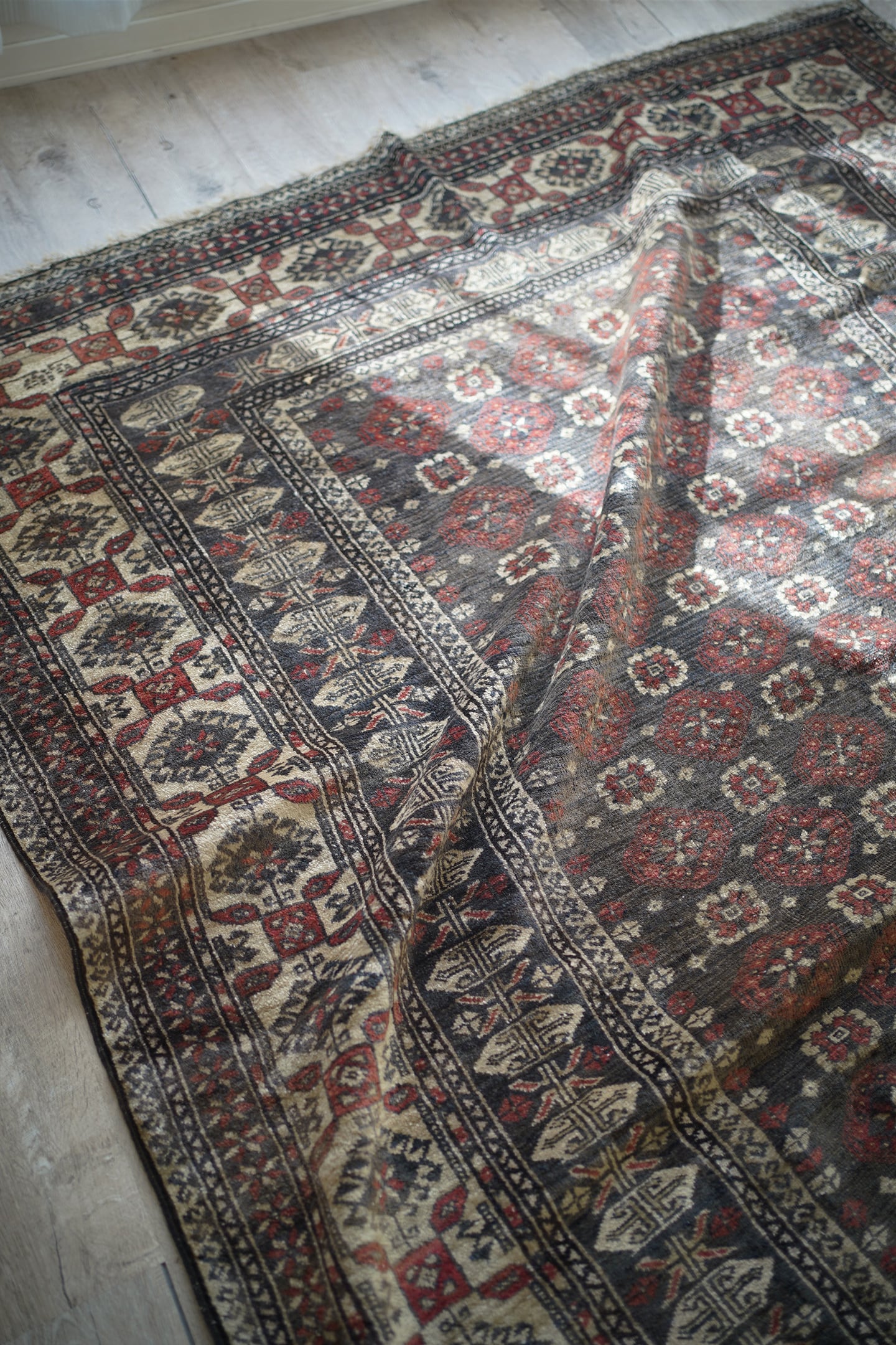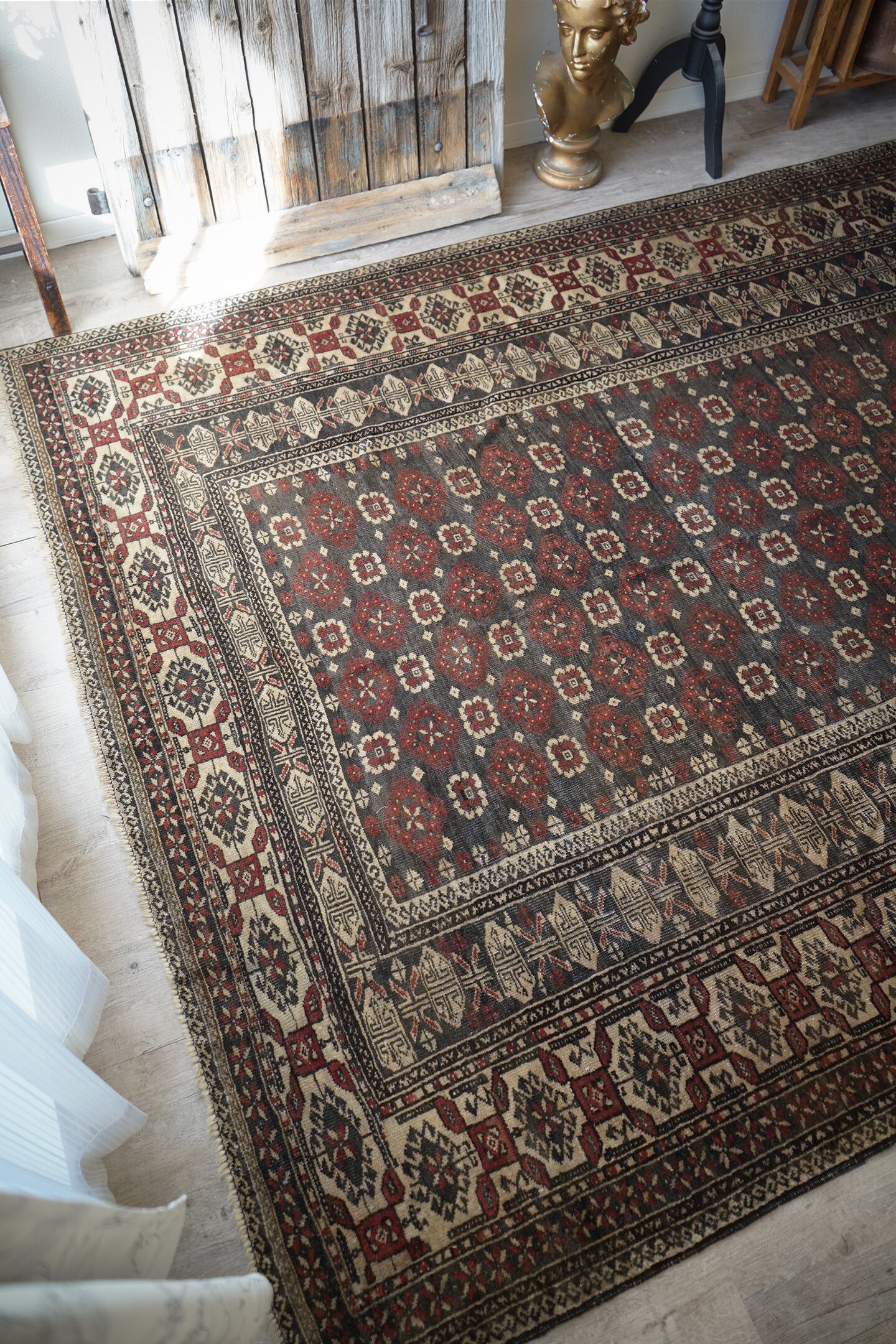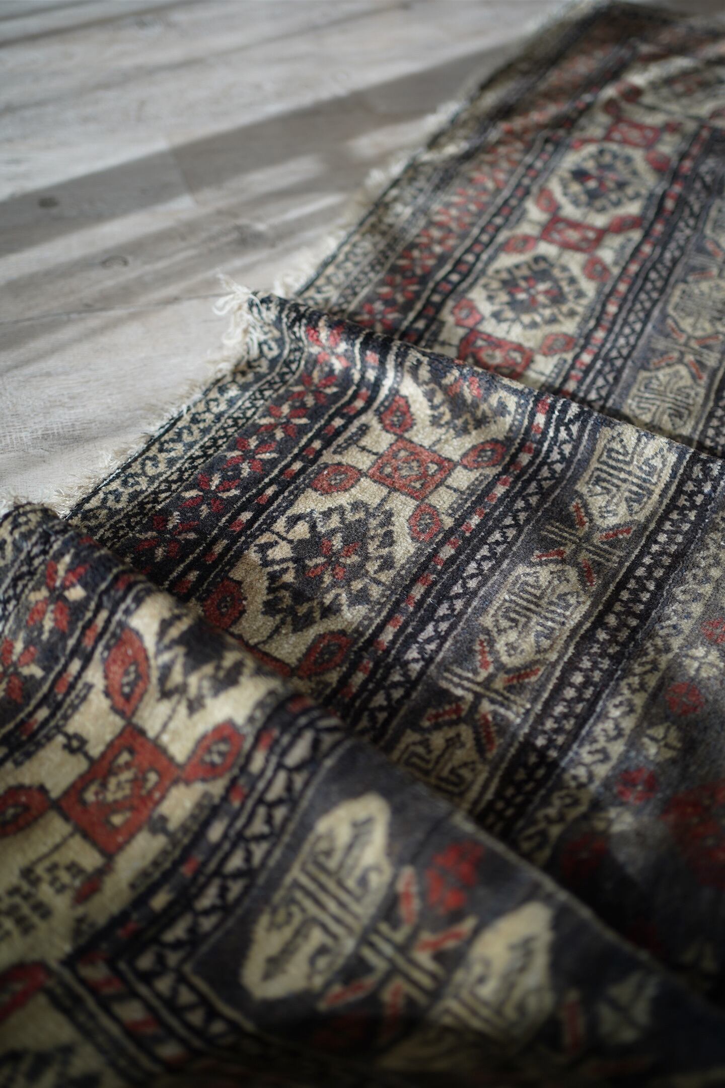 おおよそ80年前に織られたアフガニスタン産のセミアンティークラグ。全体的にくすんだ風合いで、渋くてカッコ良い雰囲気の一枚。退色した薄い黒、グークレッド、グレー寄りのベージュなどの配色です。パイルは比較的短めですが、表面はサラふわっとした滑らかな肌触りをしており、通年で敷ける万能タイプの質感です。厚みは6mm〜7mm程度。パイルが少し薄くなってところもあるものの、補修跡やダメージもなくグッドコンディション。大判サイズなので、リビングのソファ前やダイニングテーブル下などにどうぞ♪