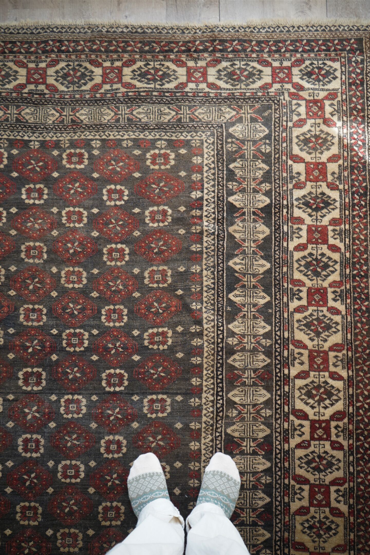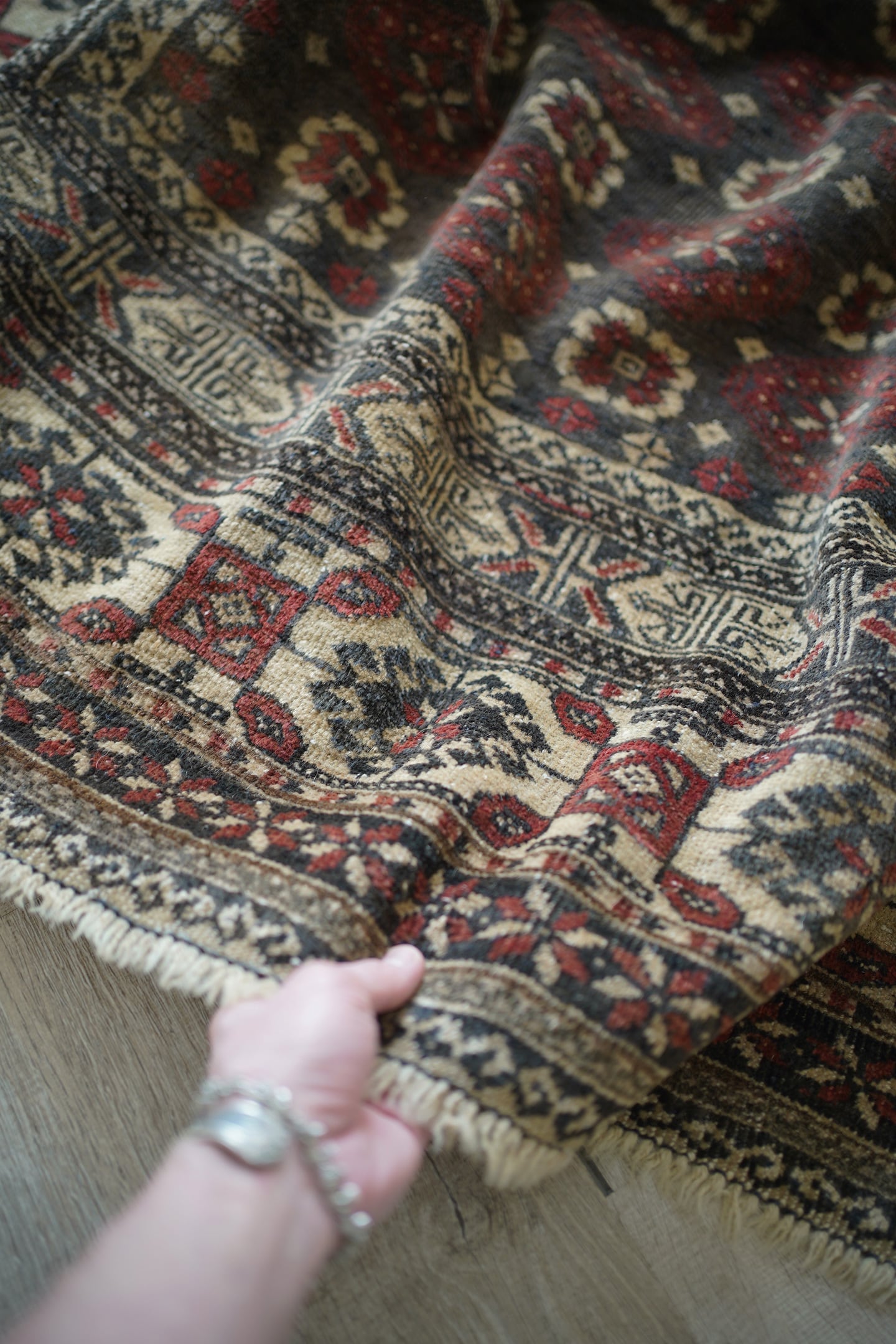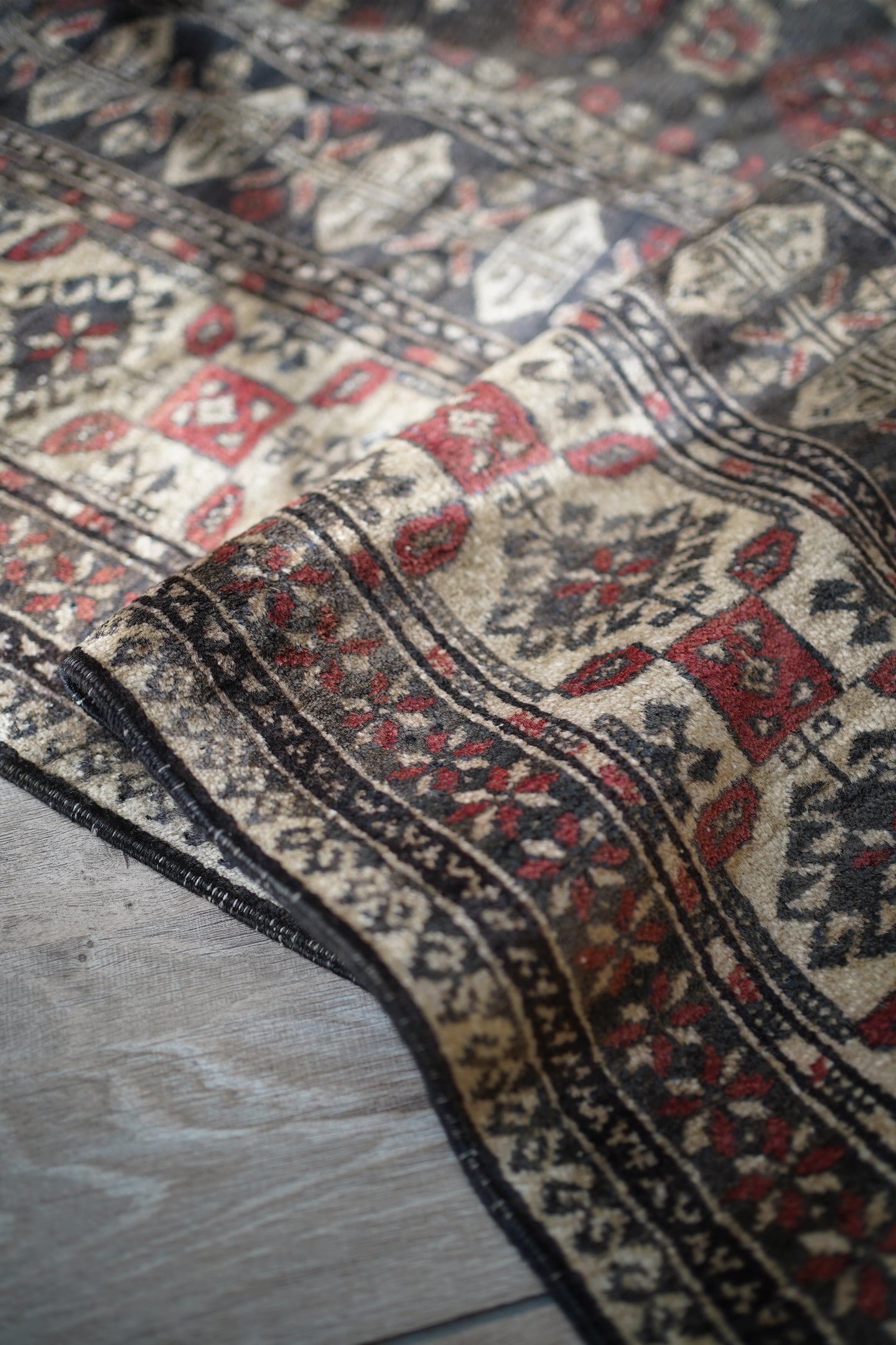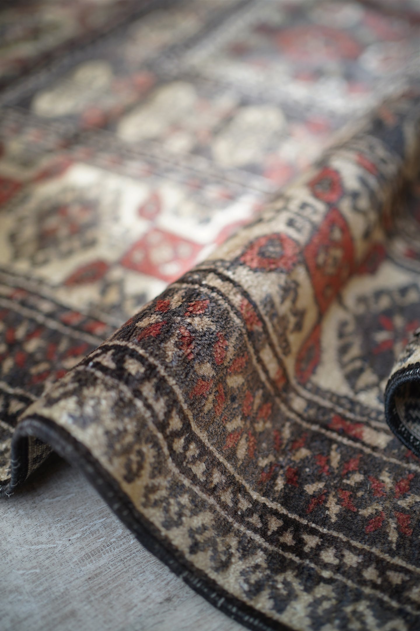 おおよそ80年前に織られたアフガニスタン産のセミアンティークラグ。全体的にくすんだ風合いで、渋くてカッコ良い雰囲気の一枚。退色した薄い黒、グークレッド、グレー寄りのベージュなどの配色です。パイルは比較的短めですが、表面はサラふわっとした滑らかな肌触りをしており、通年で敷ける万能タイプの質感です。厚みは6mm〜7mm程度。パイルが少し薄くなってところもあるものの、補修跡やダメージもなくグッドコンディション。大判サイズなので、リビングのソファ前やダイニングテーブル下などにどうぞ♪