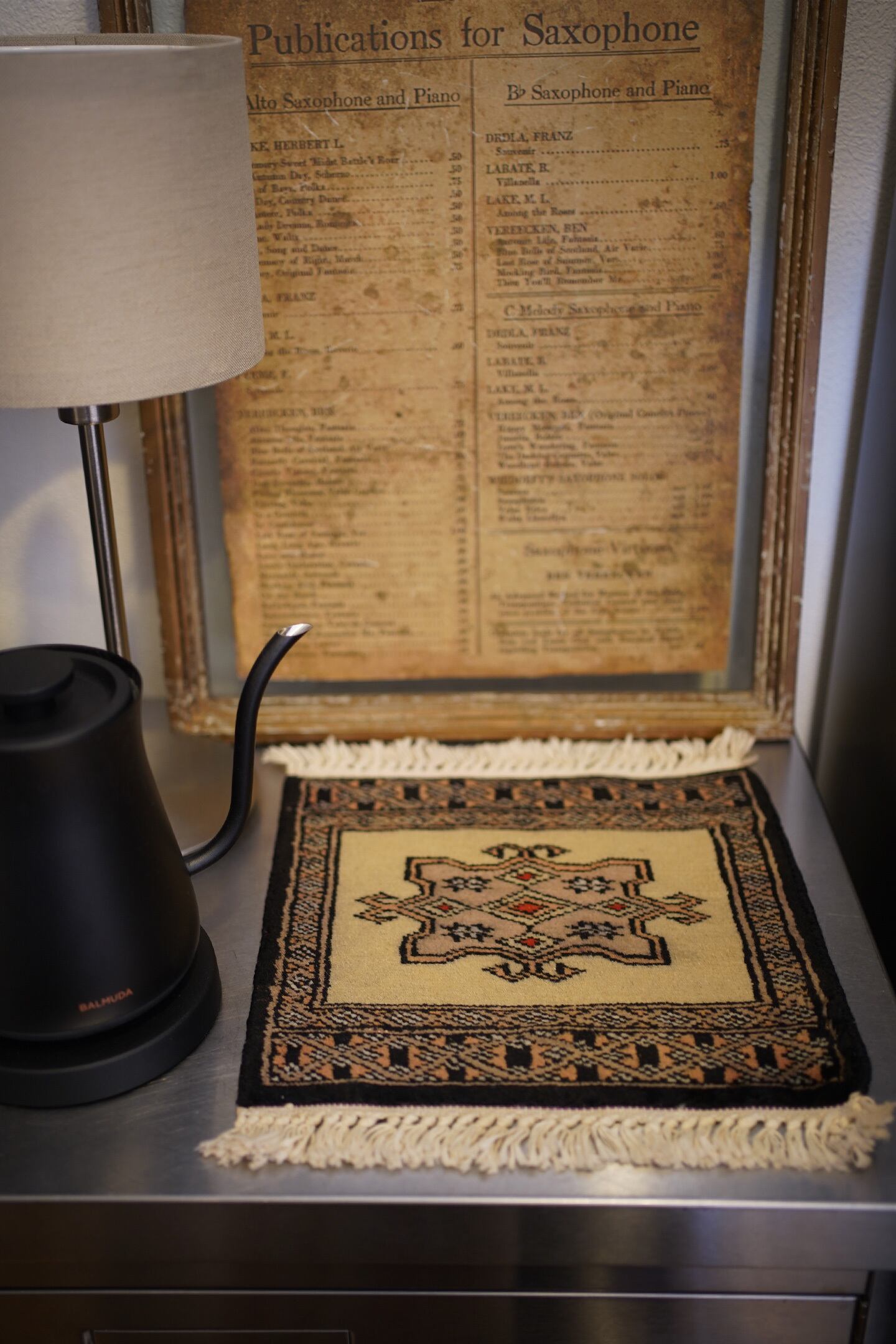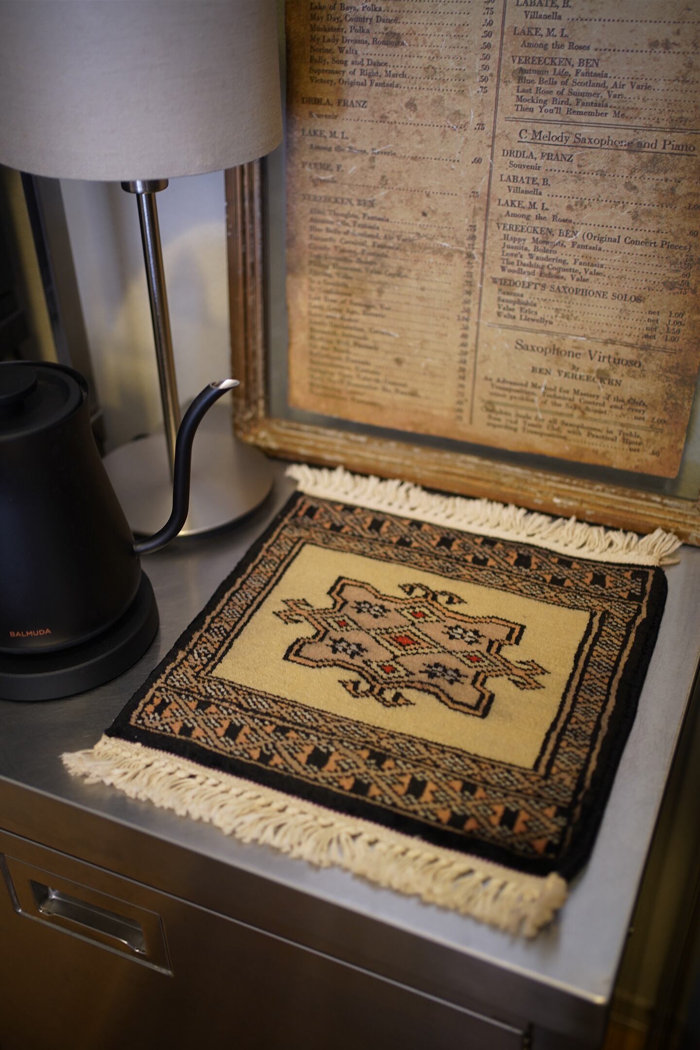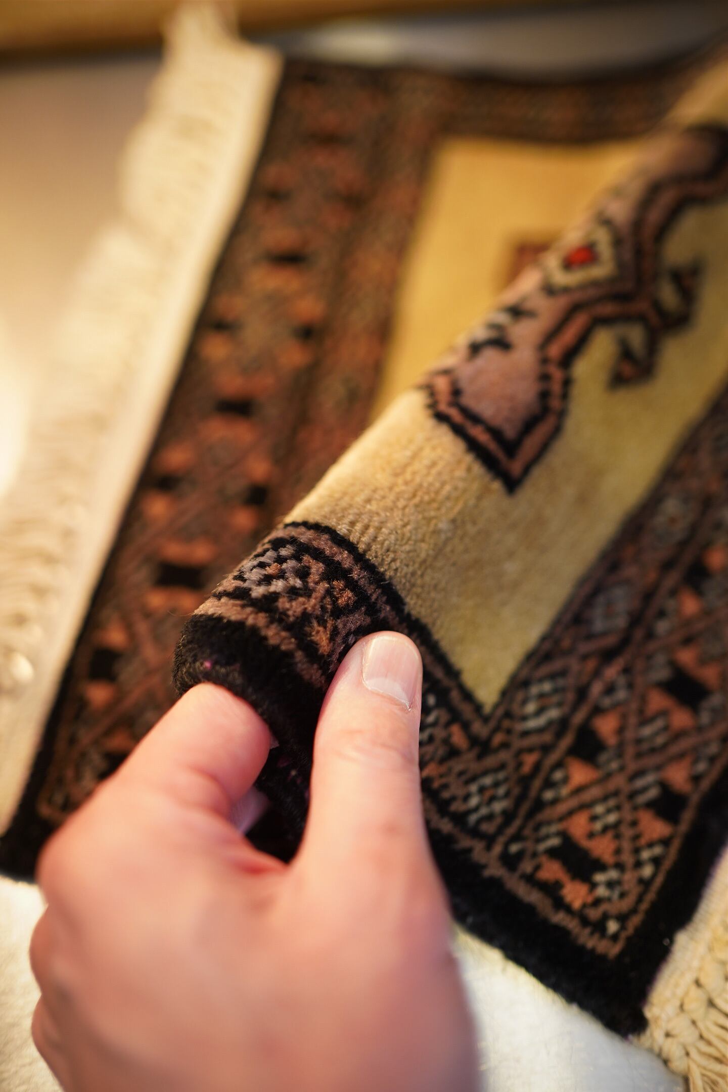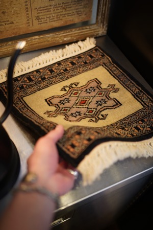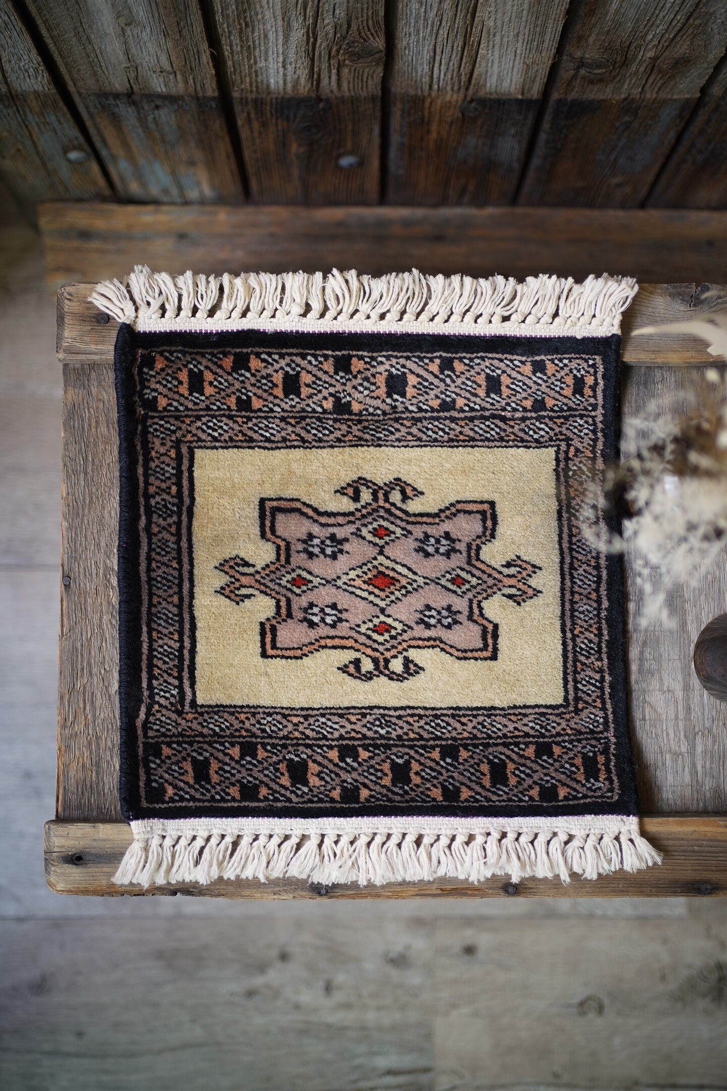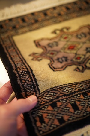 約30年前に織られたパキスタン産のミニラグです。配色はベージュ、濃紺、赤など。厚みは6mm〜7mm程度で、表面はふわっと滑らかで気持ちの良い肌触りをしています。コンディションは大変良好です。棚やテーブルの上に敷いて、小物や花瓶などを乗せればお気に入りの空間がとってもオシャレに。タペストリーとして壁に飾っても素敵かと思います♪
