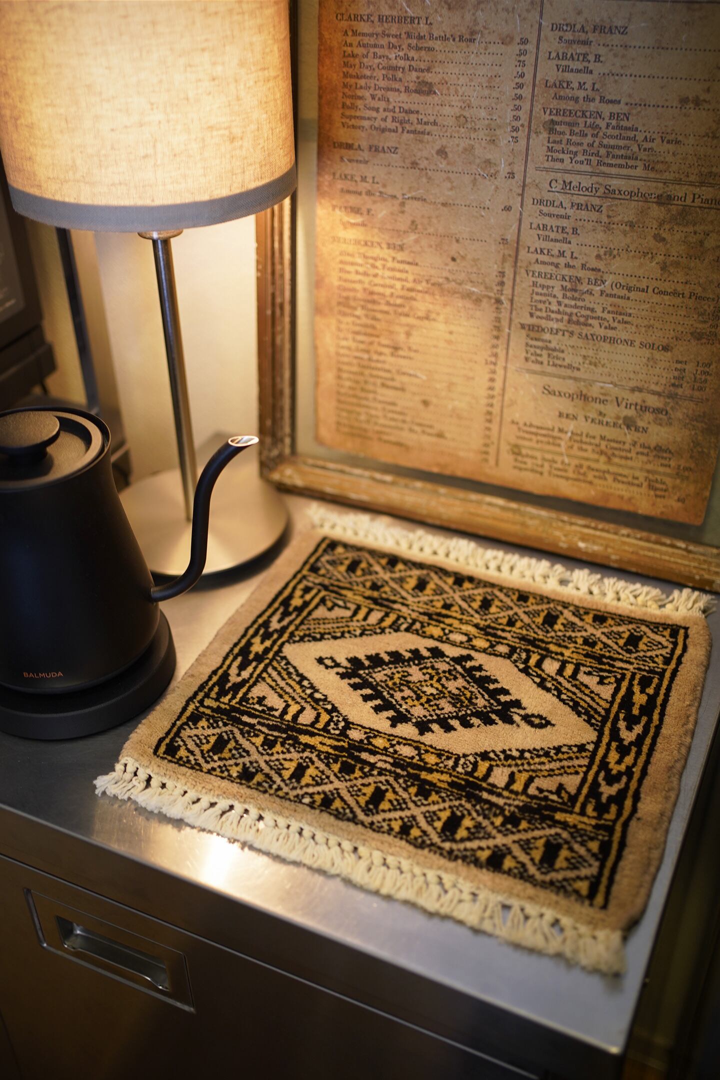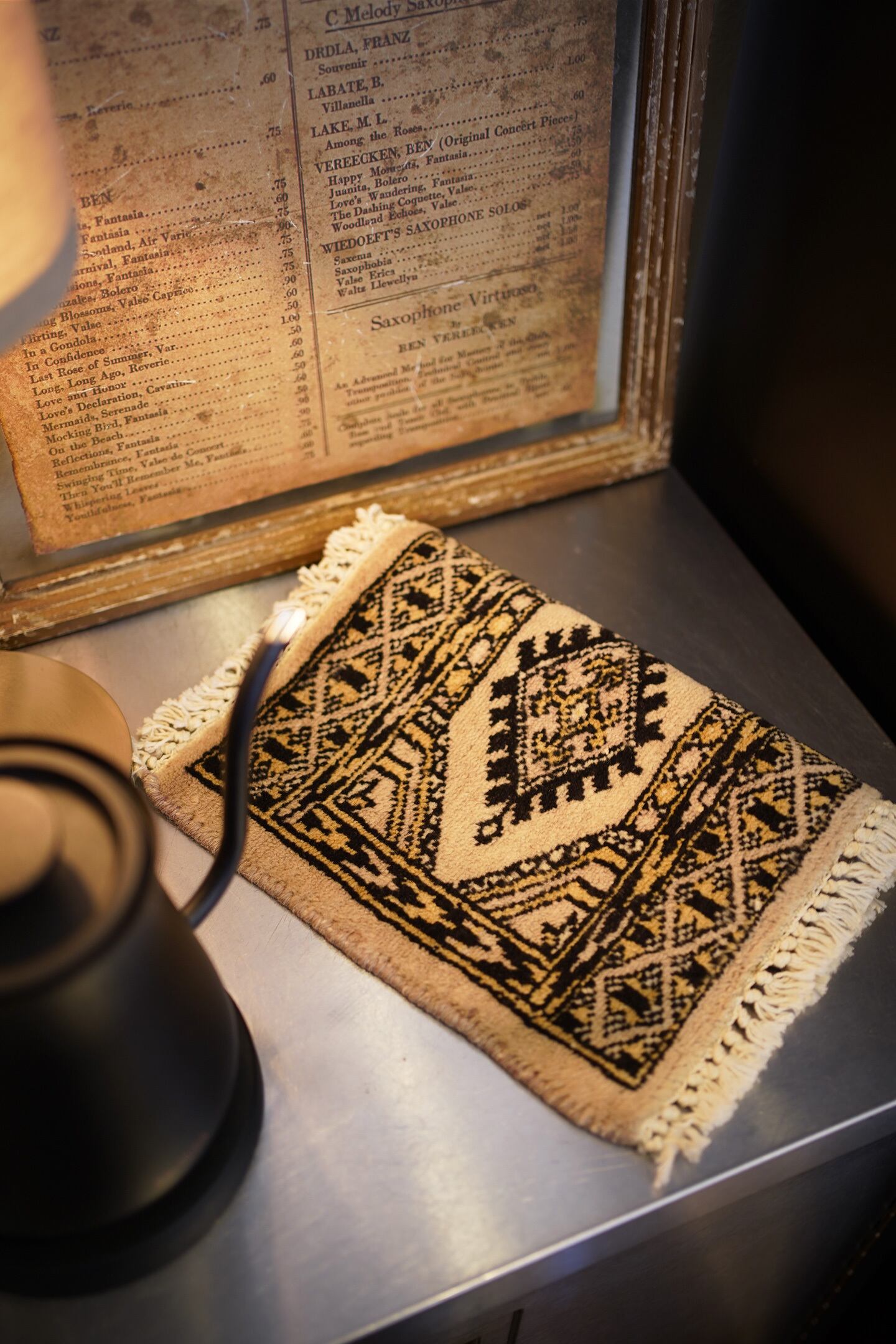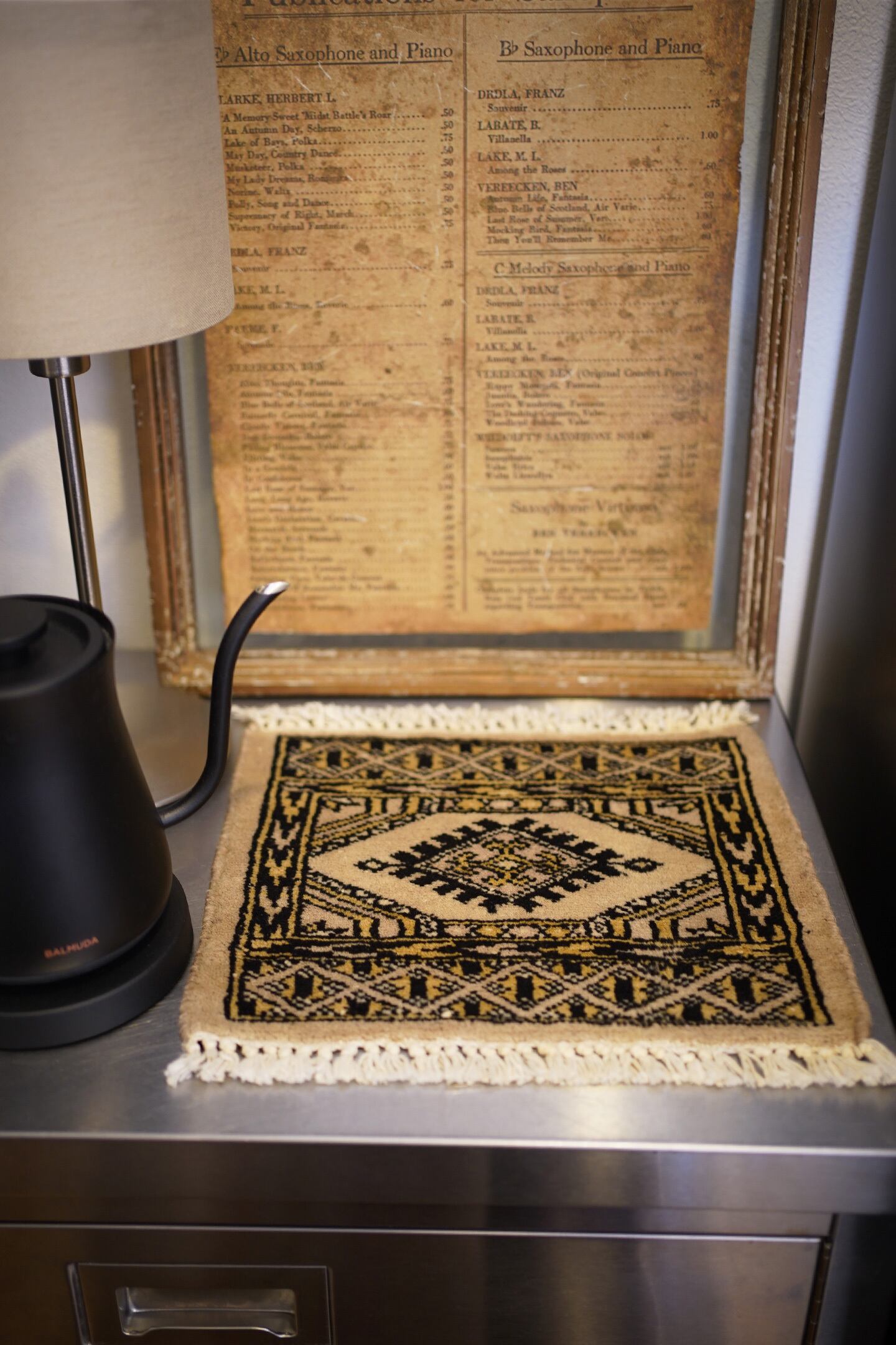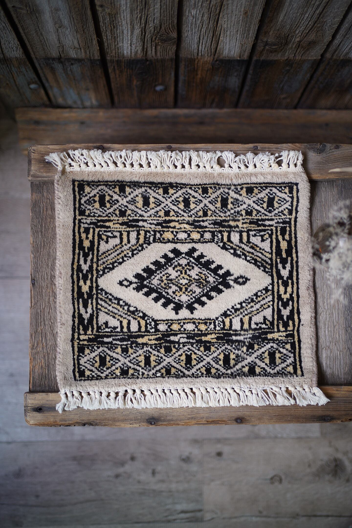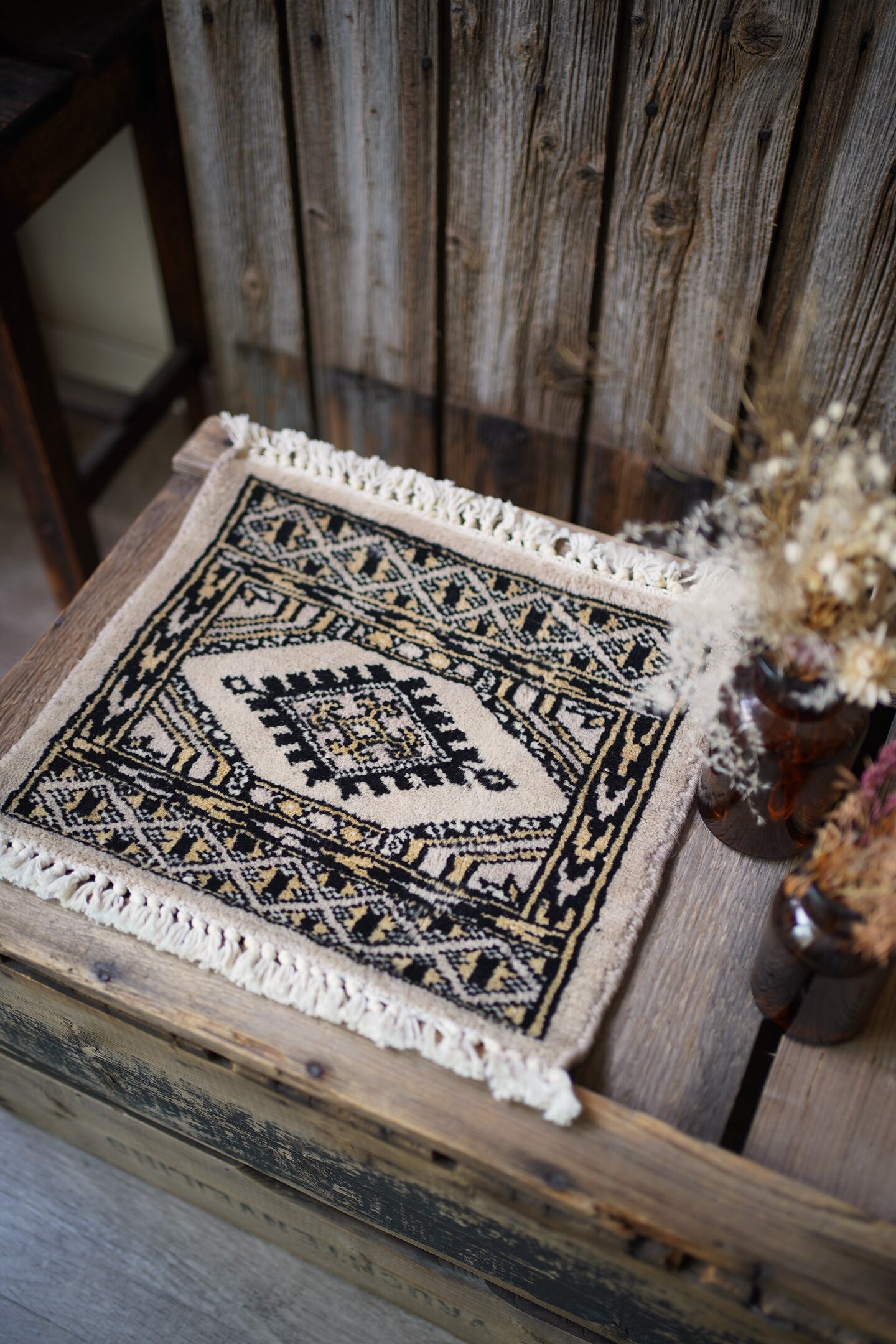 約30年前に織られたパキスタン産のミニラグです。配色はベージュ、黒など。厚みは6mm〜7mm程度で、表面はふわサラッとした優しい肌触りをしています。コンディションは良好です。棚やテーブルの上に敷いて、小物や花瓶などを乗せればお気に入りの空間がとってもオシャレに。タペストリーとして壁に飾っても素敵かと思います♪