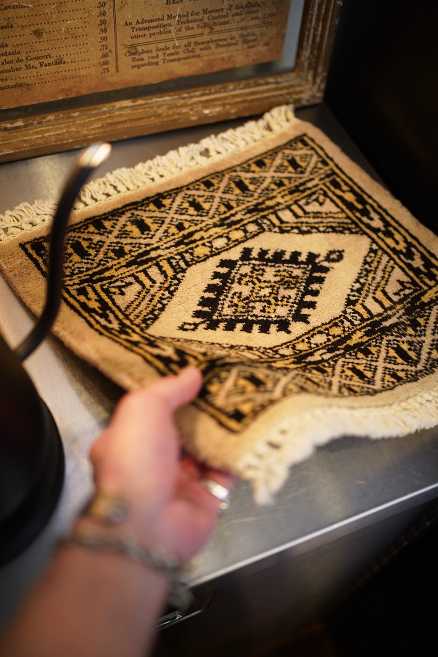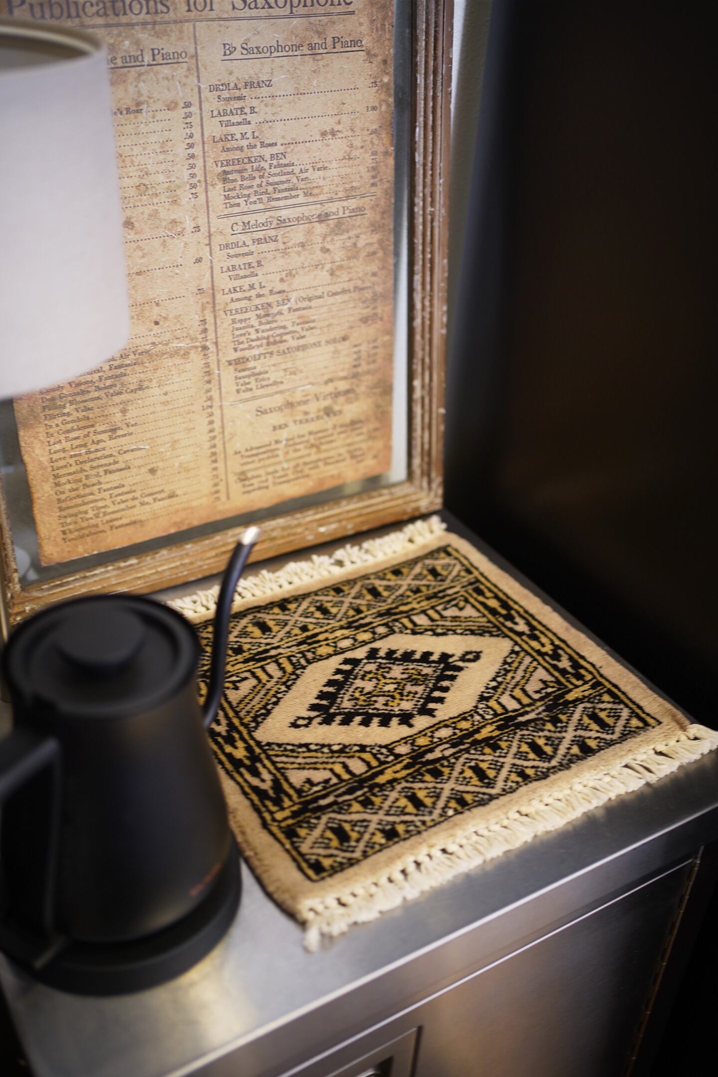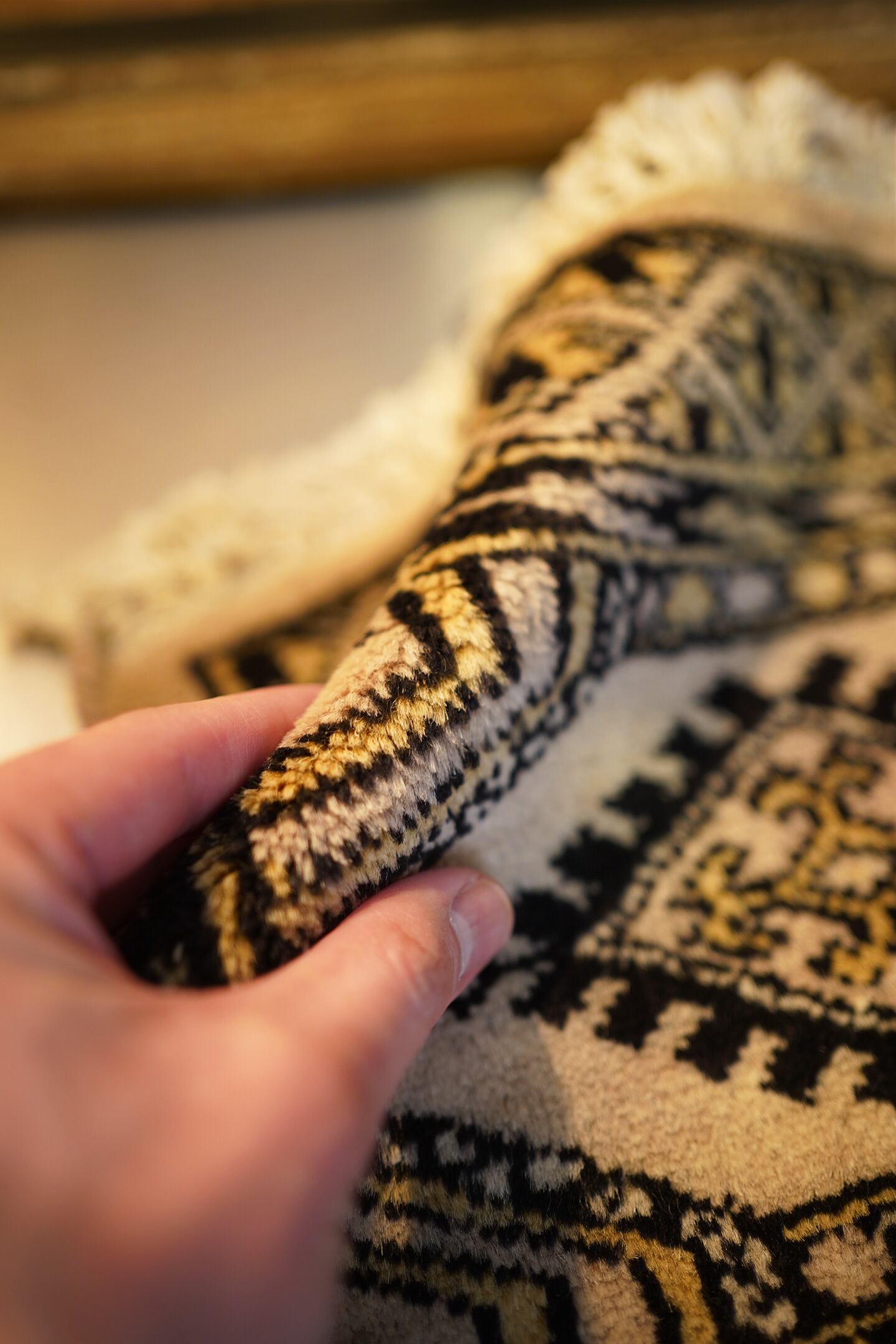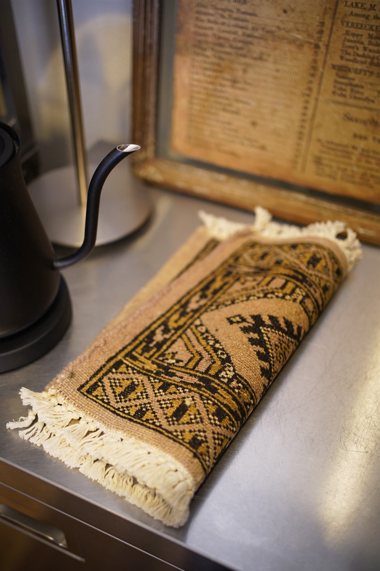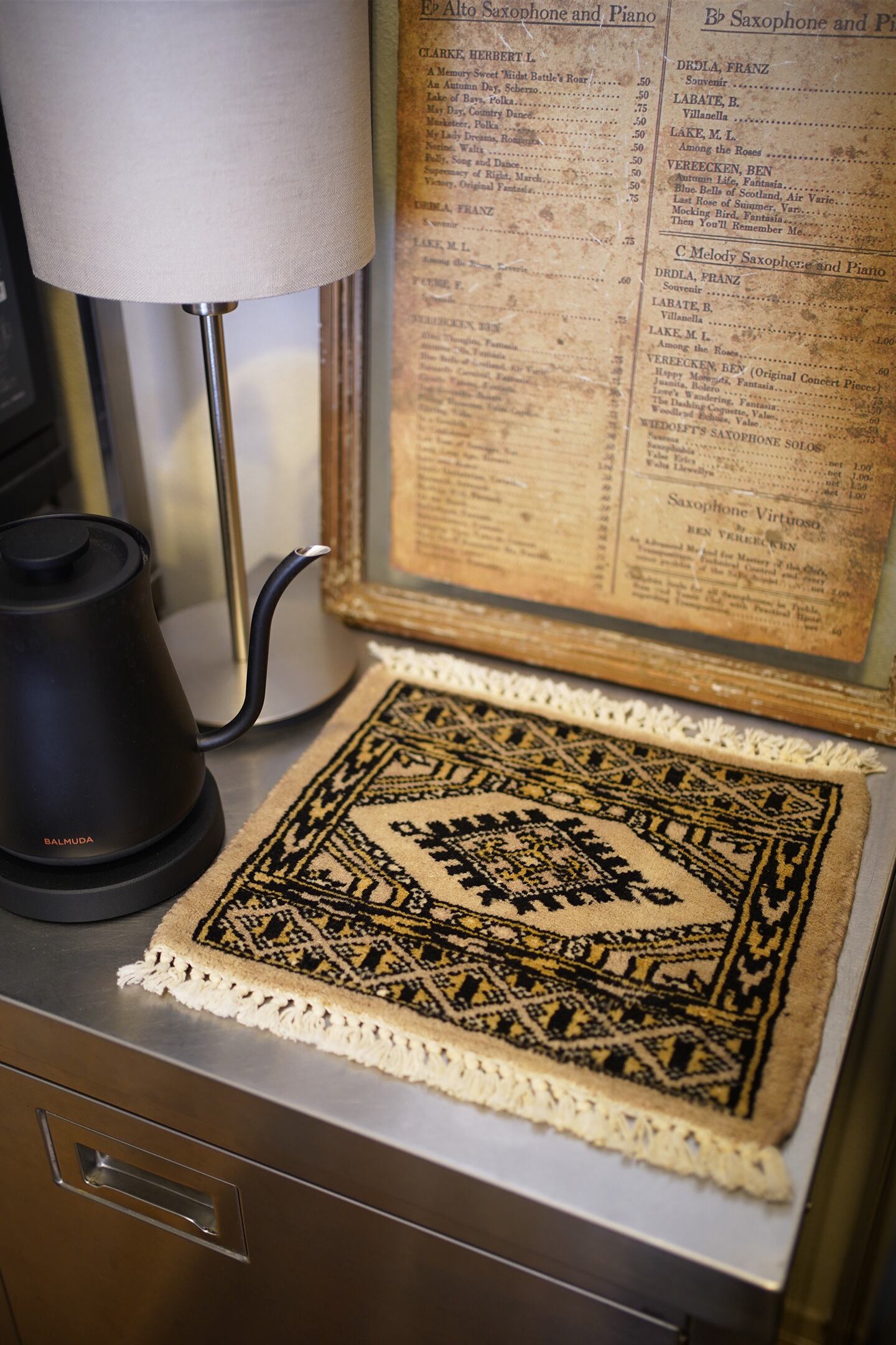約30年前に織られたパキスタン産のミニラグです。配色はベージュ、黒など。厚みは6mm〜7mm程度で、表面はふわサラッとした優しい肌触りをしています。コンディションは良好です。棚やテーブルの上に敷いて、小物や花瓶などを乗せればお気に入りの空間がとってもオシャレに。タペストリーとして壁に飾っても素敵かと思います♪