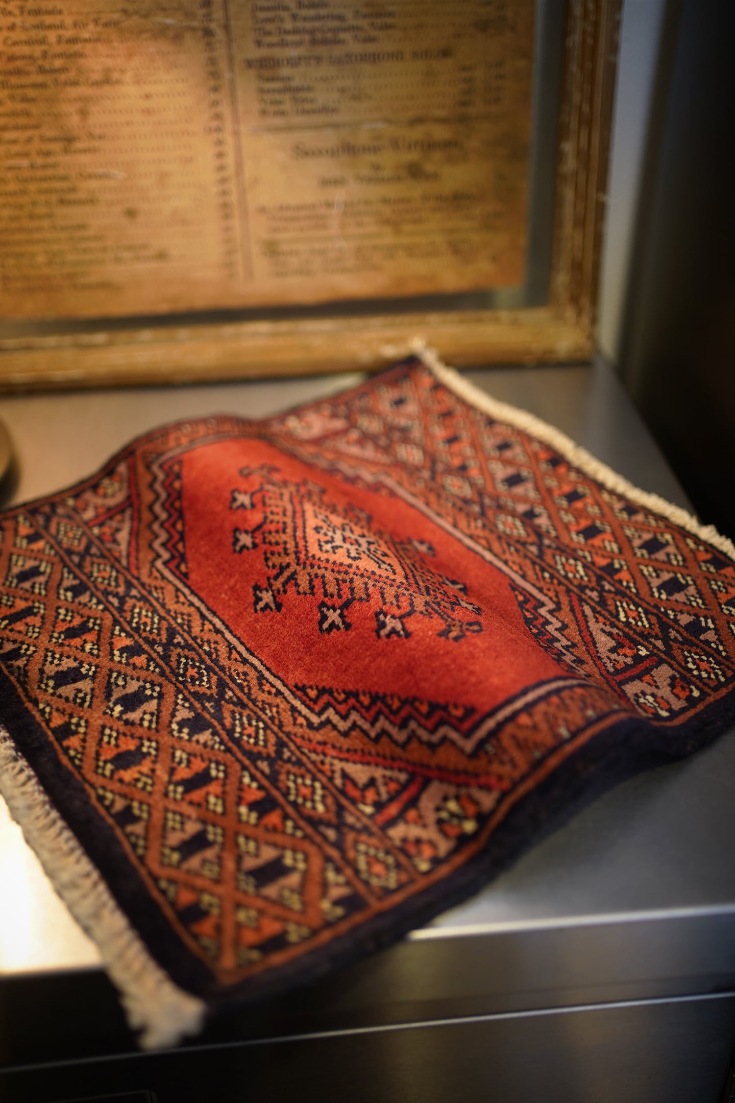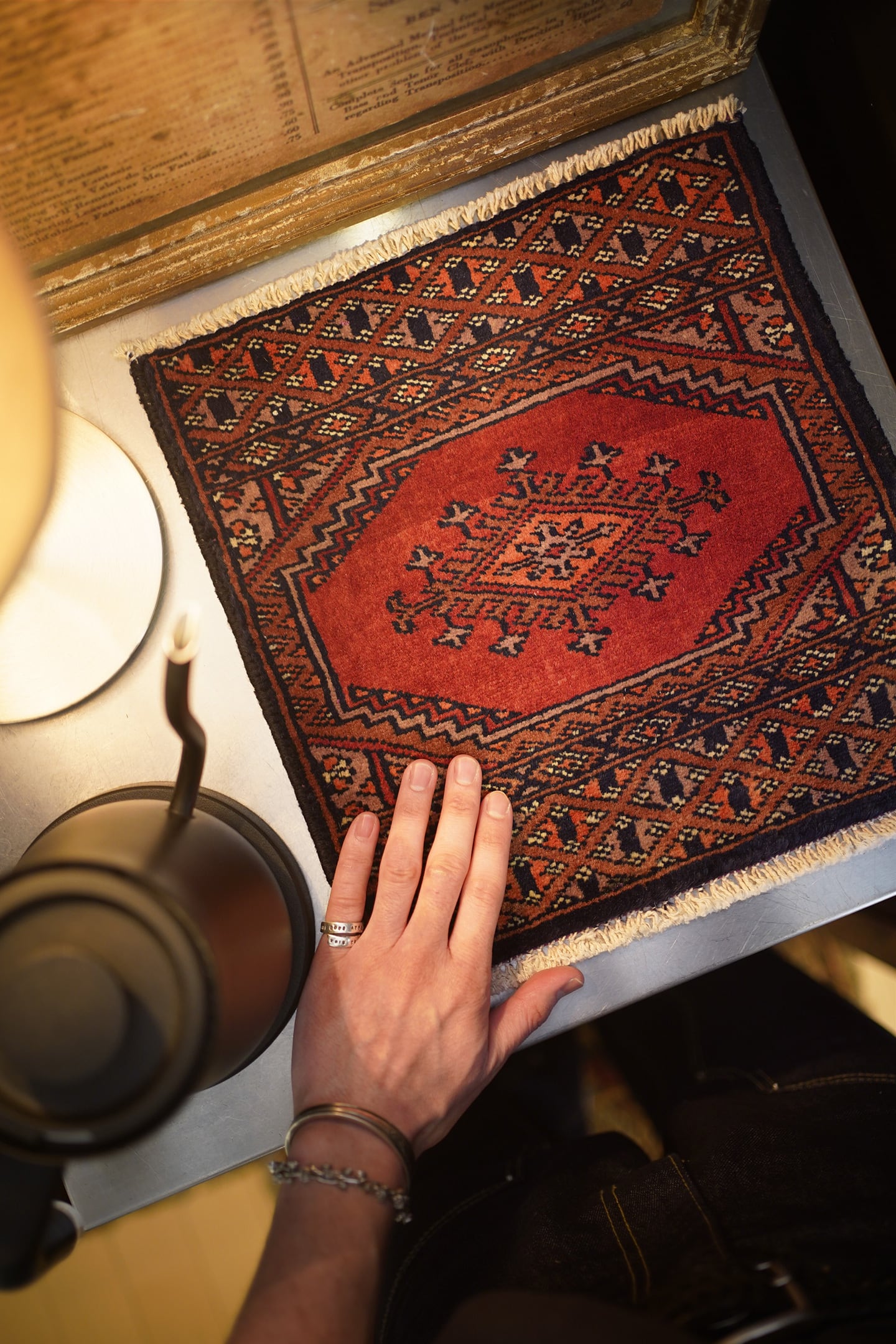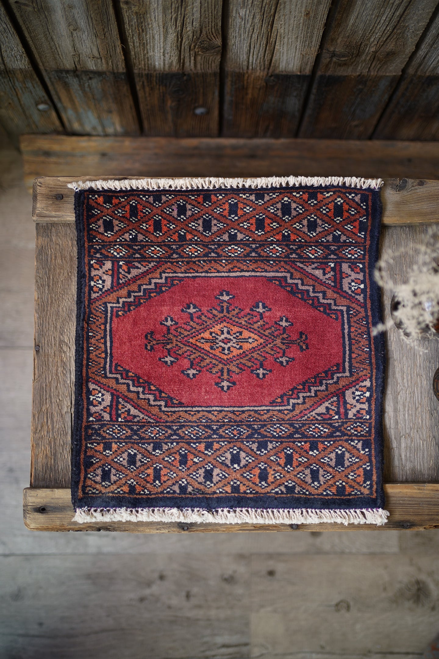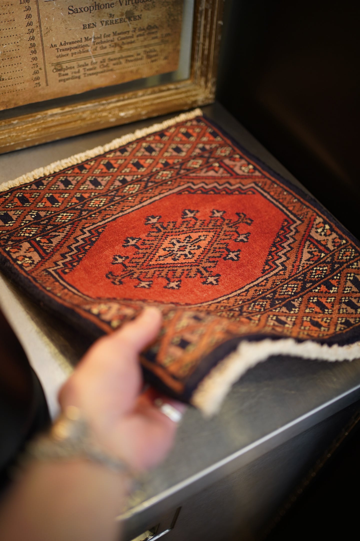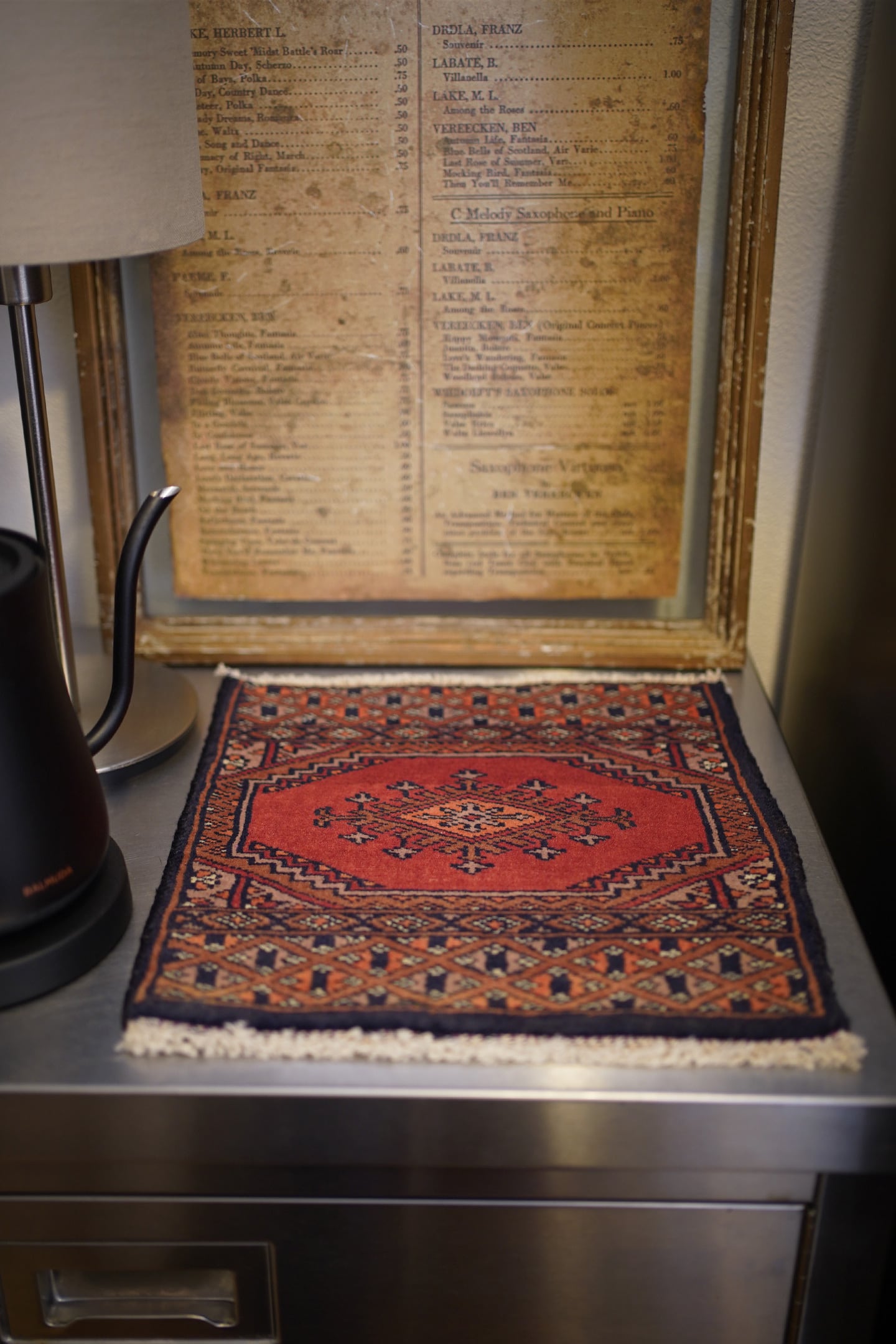 約30年前に織られたパキスタン産のミニラグです。配色はえんじ色、紺、オレンジ、ブラウンなど。厚みは5mm程度で、表面はふわっと滑らかな肌触りをしています。コンディションは大変良好です。棚やテーブルの上に敷いて、小物や花瓶などを乗せればお気に入りの空間がとってもオシャレに。タペストリーとして壁に飾っても素敵かと思います♪
