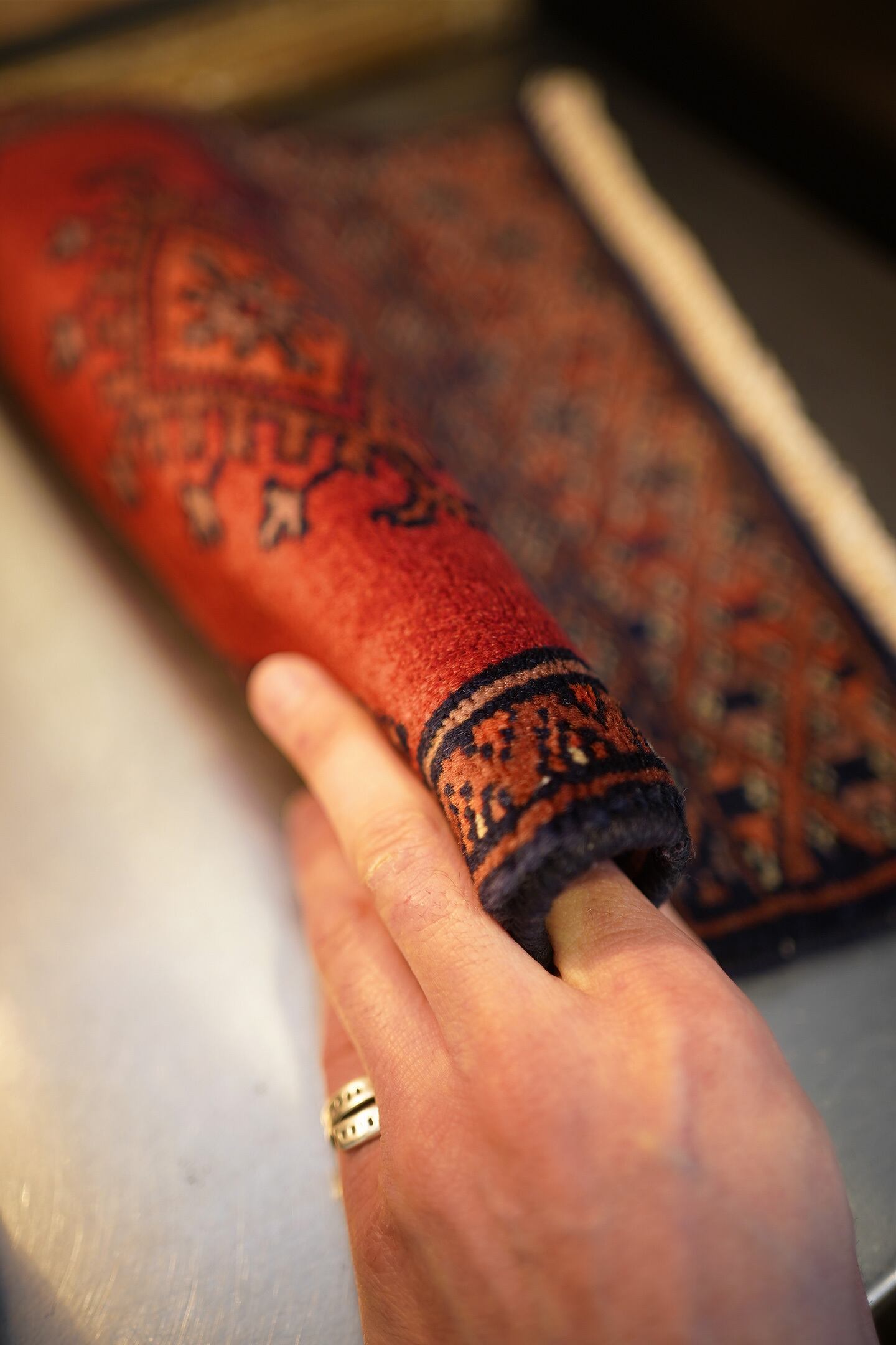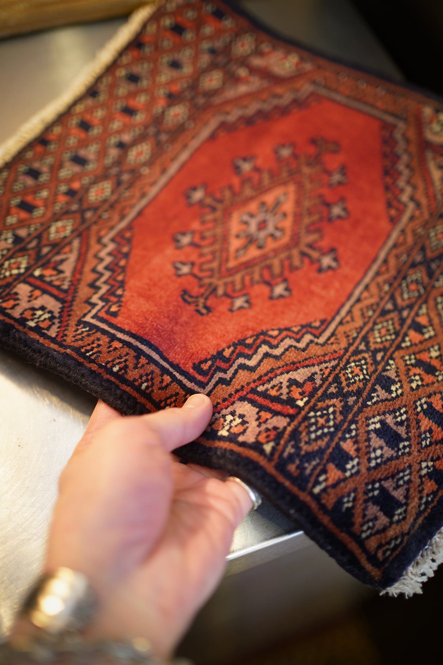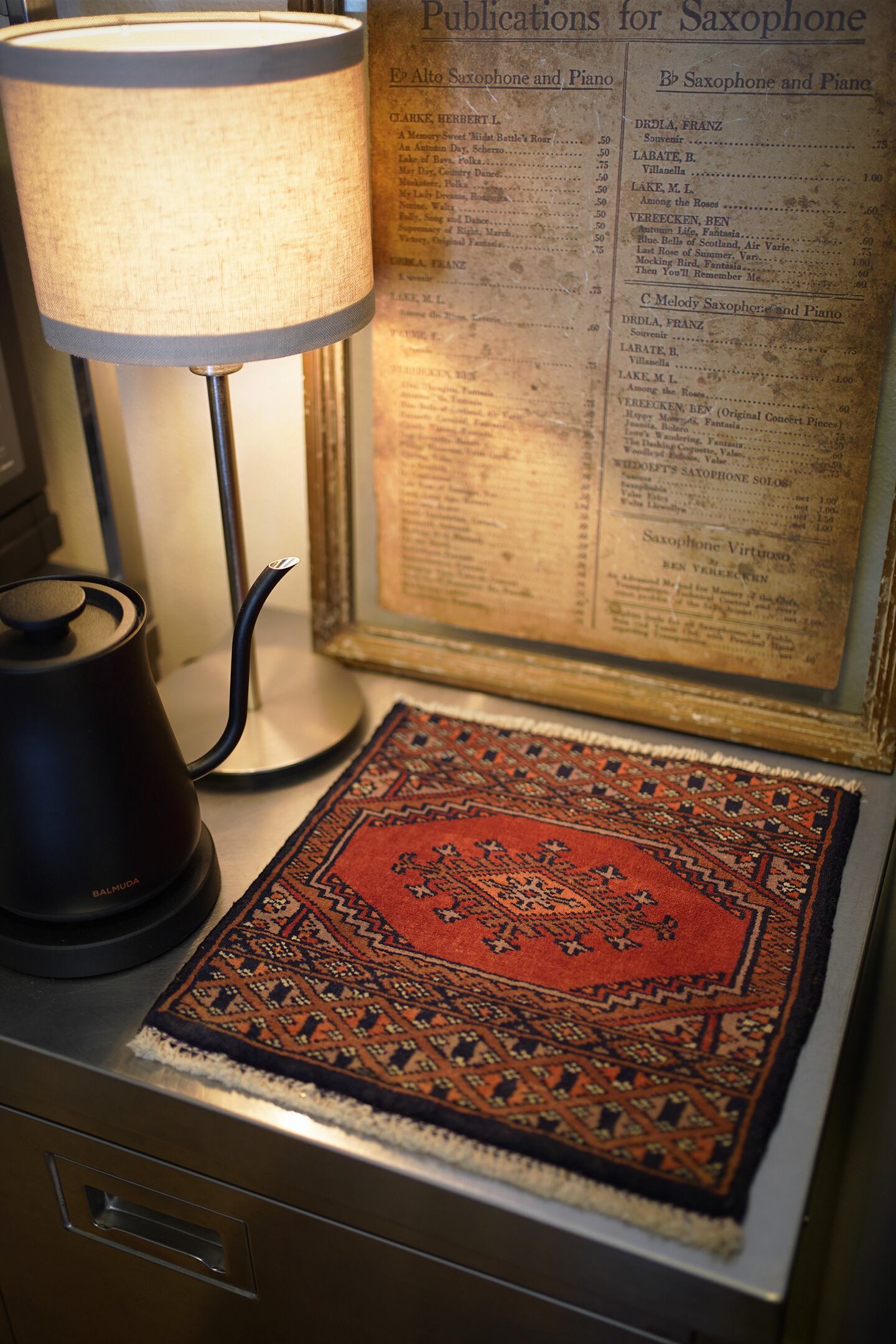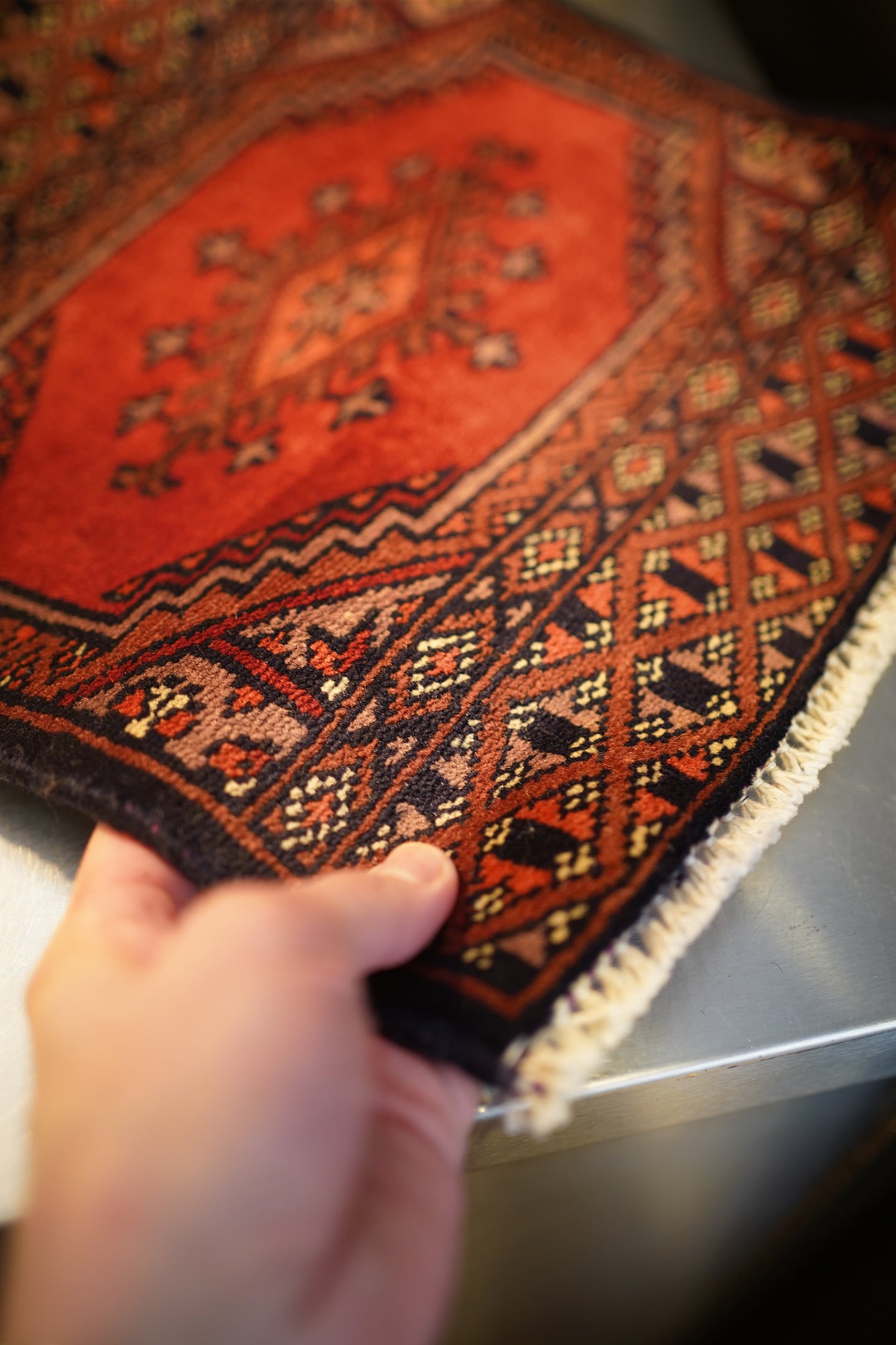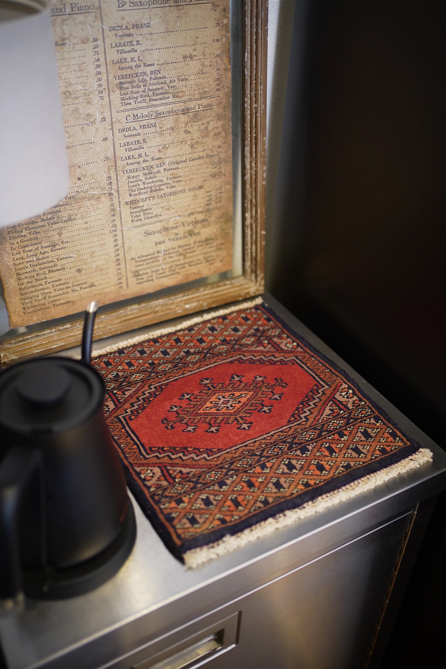 約30年前に織られたパキスタン産のミニラグです。配色はえんじ色、紺、オレンジ、ブラウンなど。厚みは5mm程度で、表面はふわっと滑らかな肌触りをしています。コンディションは大変良好です。棚やテーブルの上に敷いて、小物や花瓶などを乗せればお気に入りの空間がとってもオシャレに。タペストリーとして壁に飾っても素敵かと思います♪