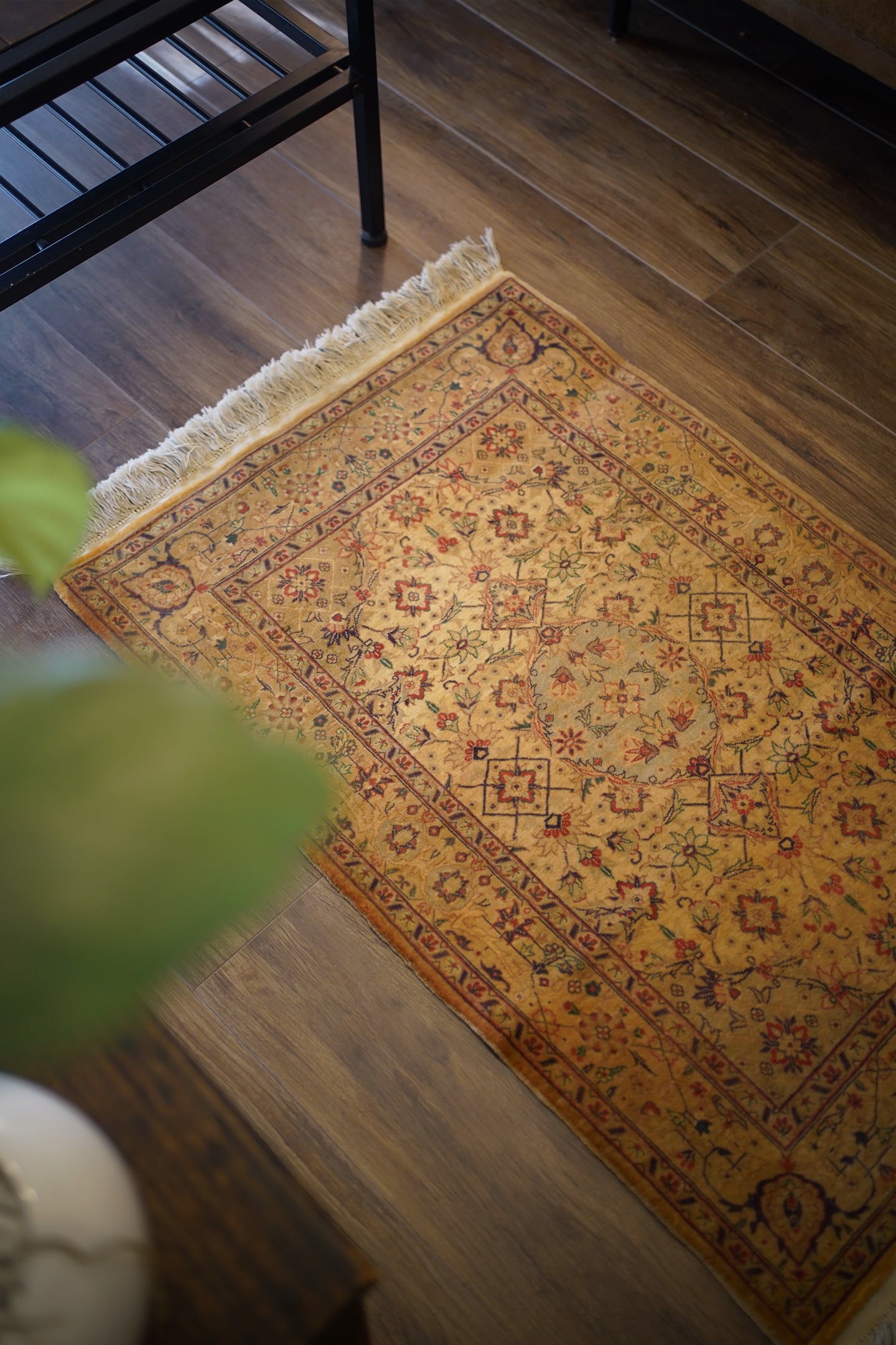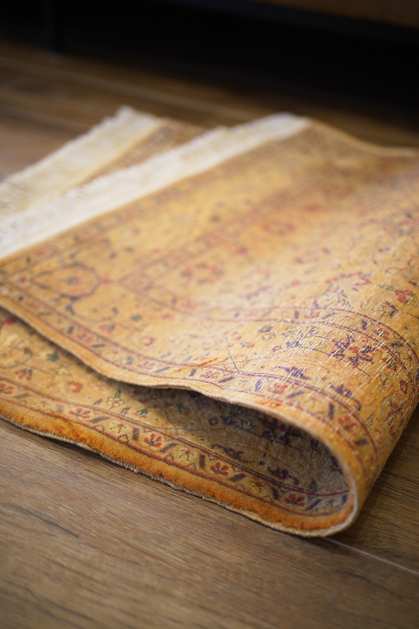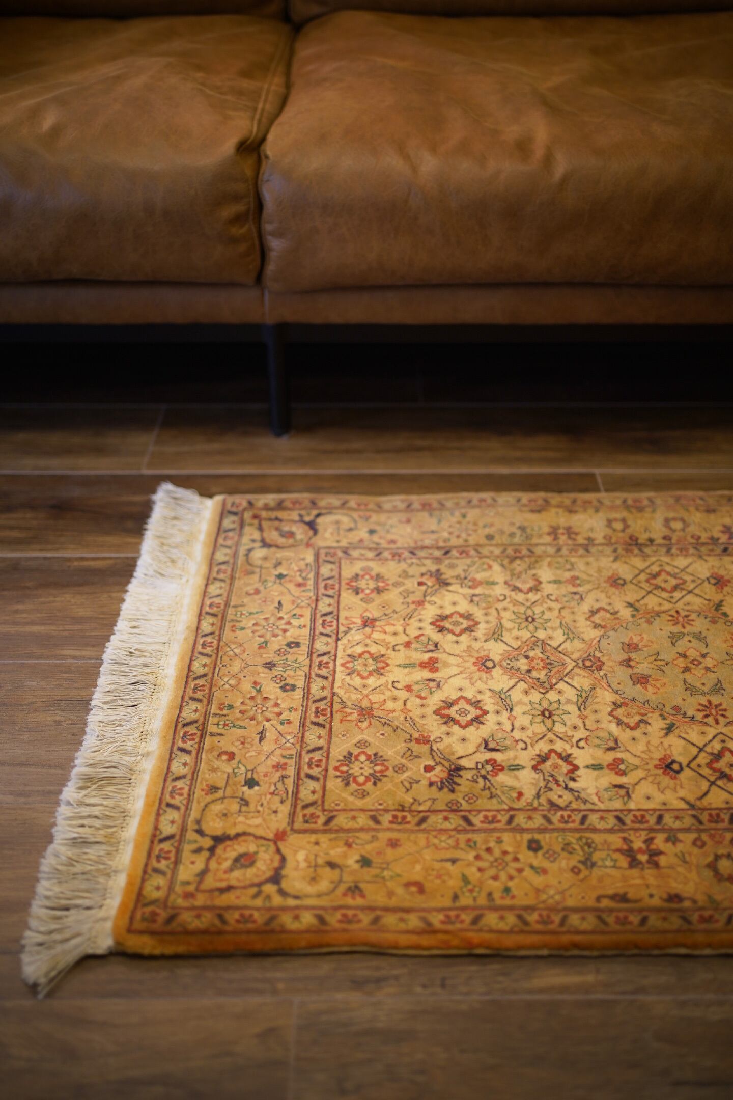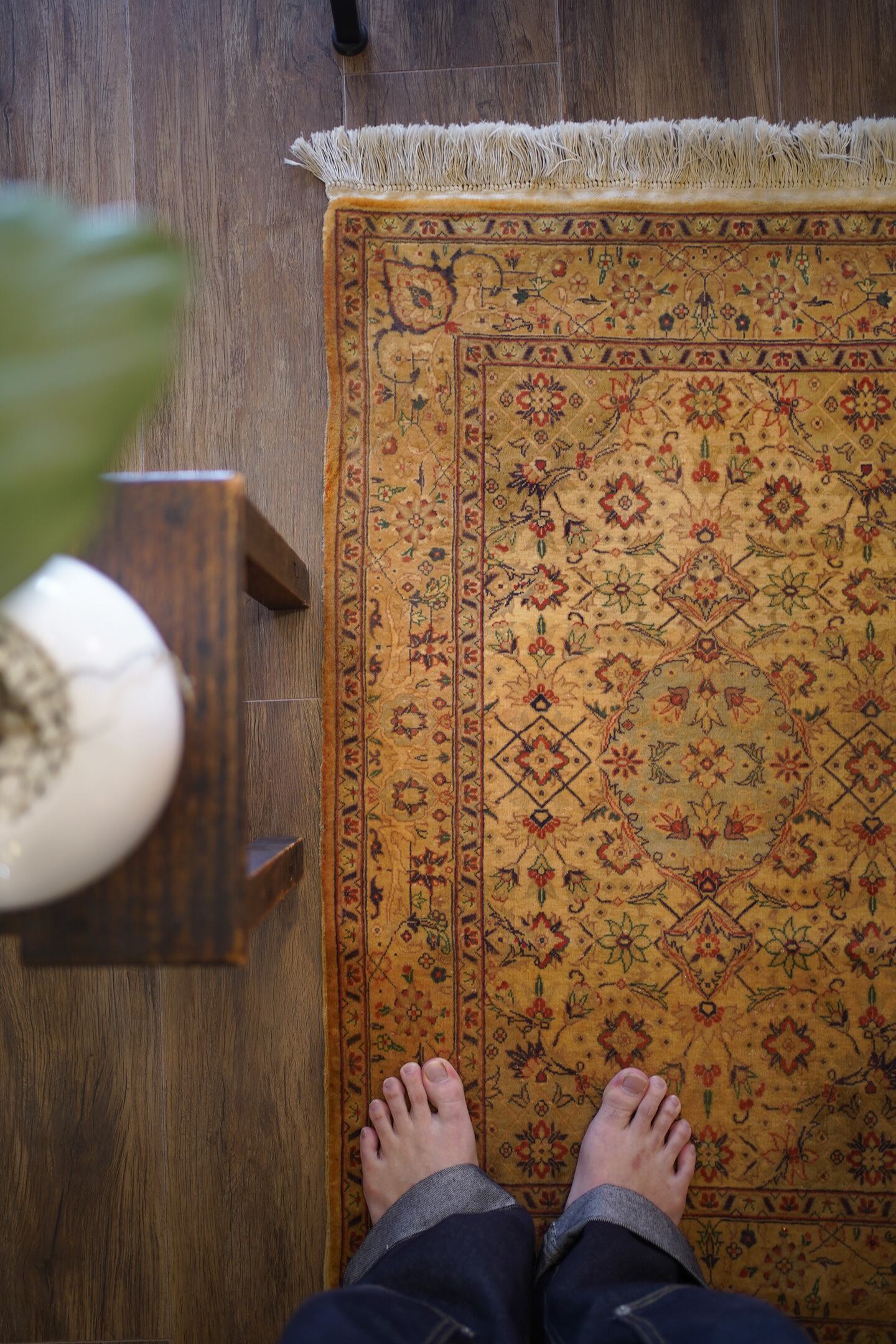 イラン中央部の都市ナインで織られた約70年前のヴィンテージラグです。花紋様が全体に散りばめられた可愛らしいデザインで、上染めにより、くすんだベージュないしキャメルやオレンジを感じさせる統一感のある渋い色合いが魅力的です。表面はサラッとしつつも、パイルの柔らかさを感じる心地よい肌触りをしています。厚みは7mm〜8mm程度。目立ったダメージや補修跡もなく状態良好です。玄関をはじめ、チェストやキャビネットの前などにもよろしいかと思います。