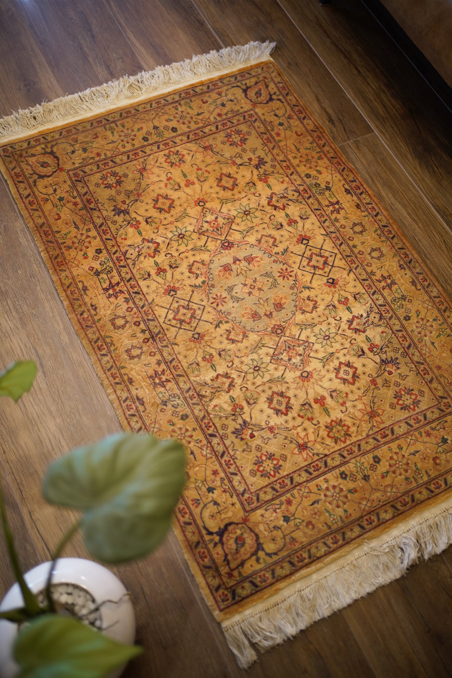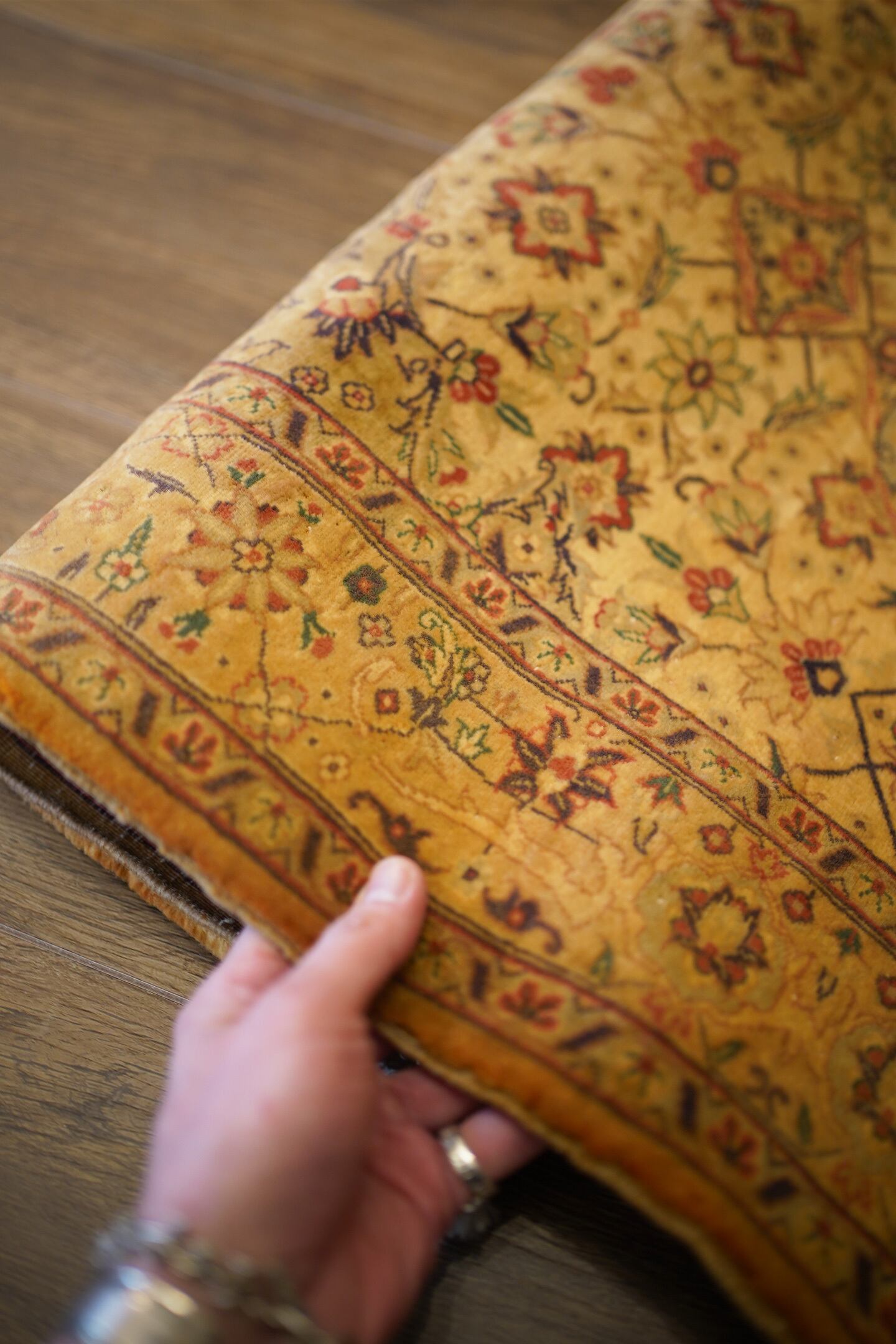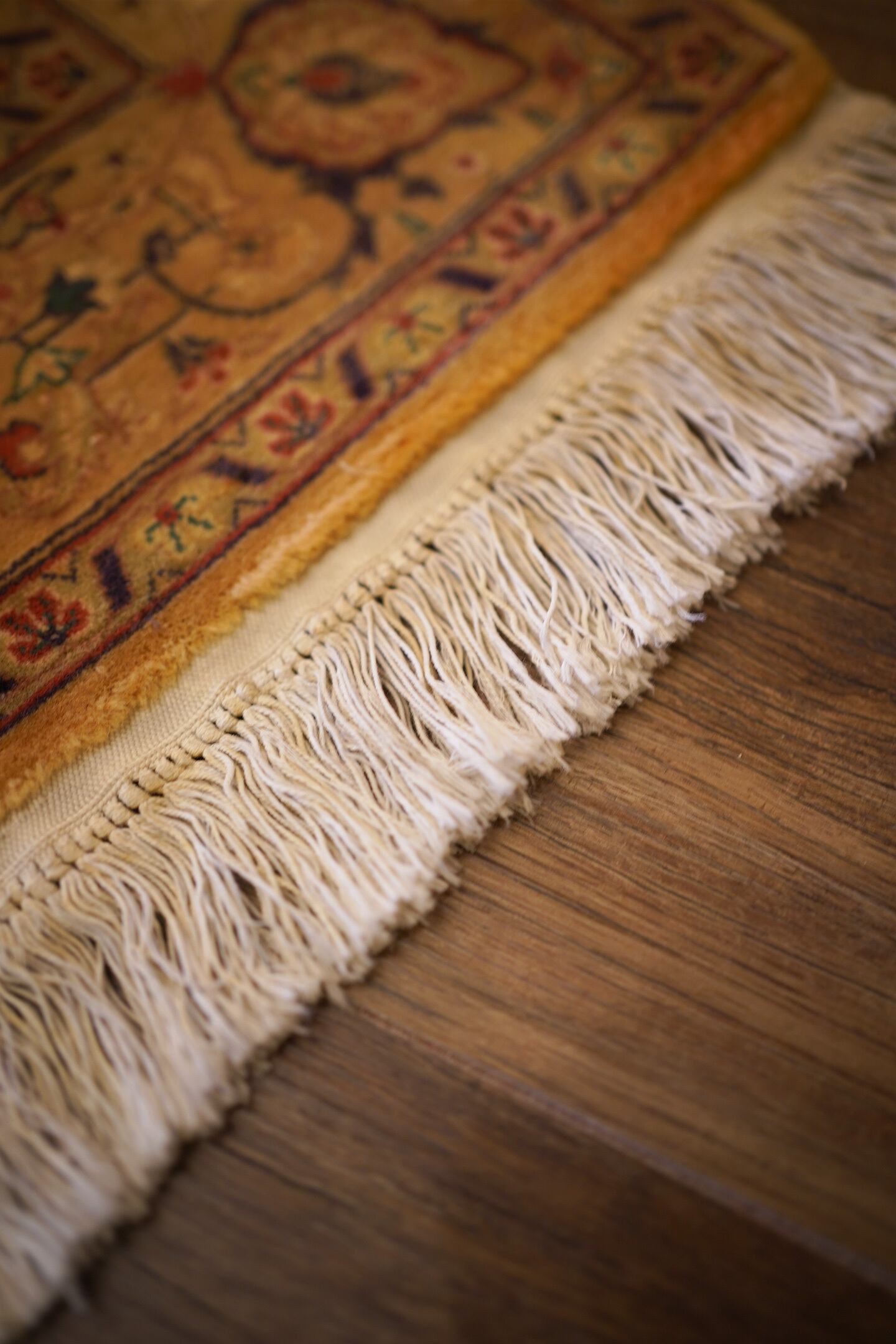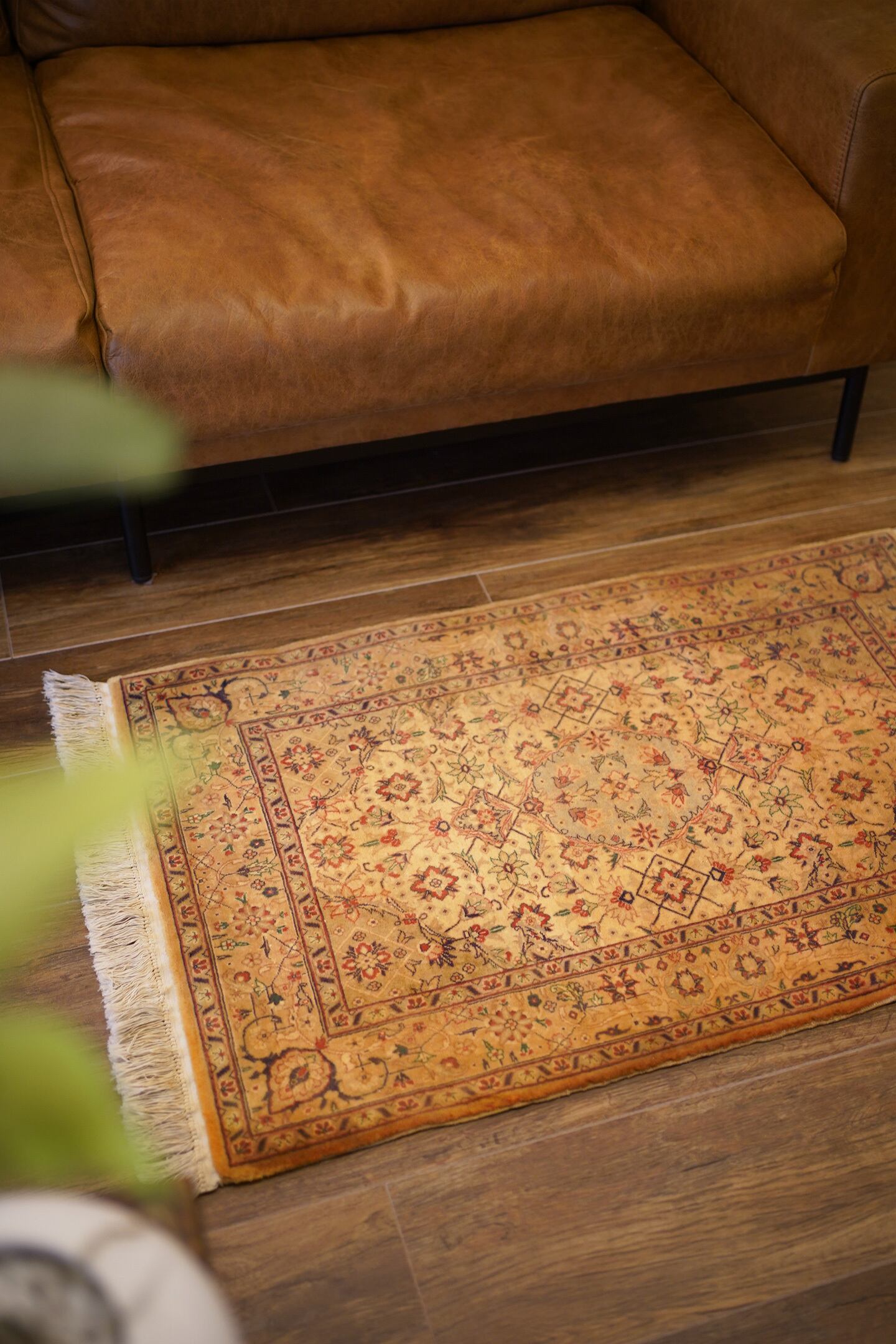 イラン中央部の都市ナインで織られた約70年前のヴィンテージラグです。花紋様が全体に散りばめられた可愛らしいデザインで、上染めにより、くすんだベージュないしキャメルやオレンジを感じさせる統一感のある渋い色合いが魅力的です。表面はサラッとしつつも、パイルの柔らかさを感じる心地よい肌触りをしています。厚みは7mm〜8mm程度。目立ったダメージや補修跡もなく状態良好です。玄関をはじめ、チェストやキャビネットの前などにもよろしいかと思います。