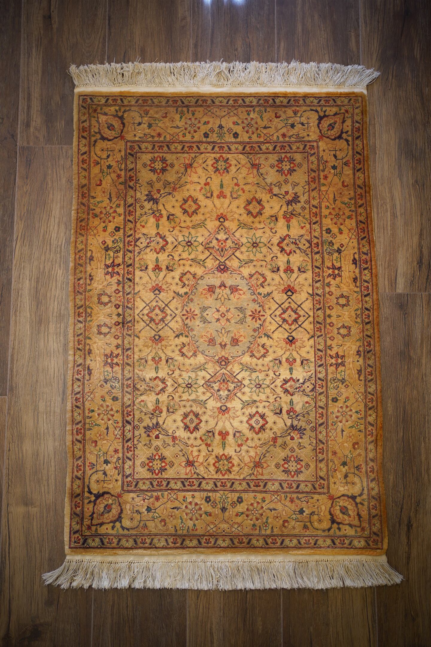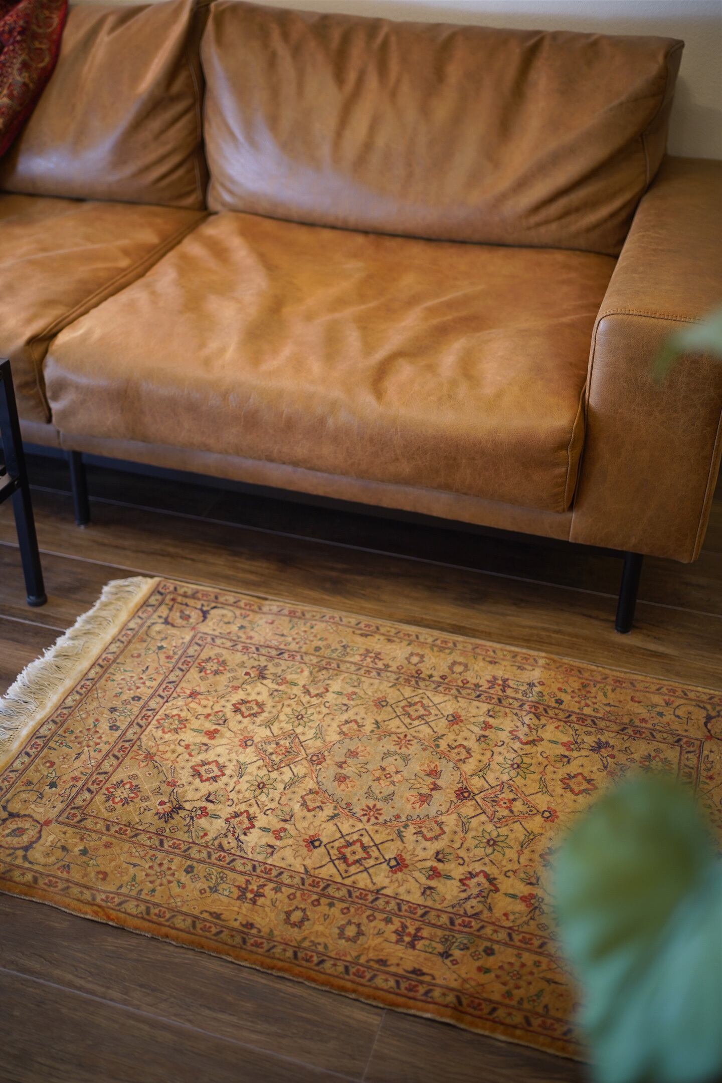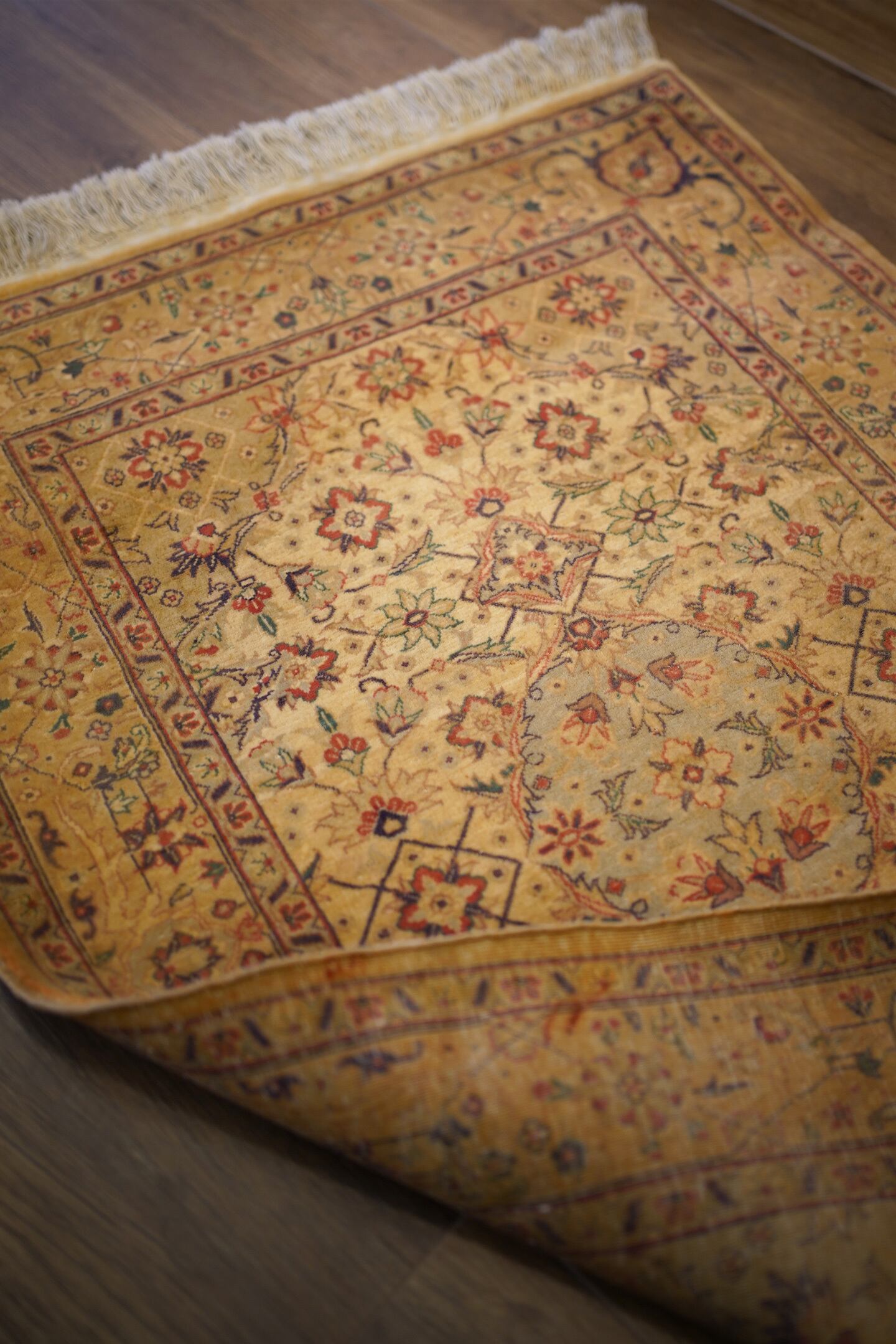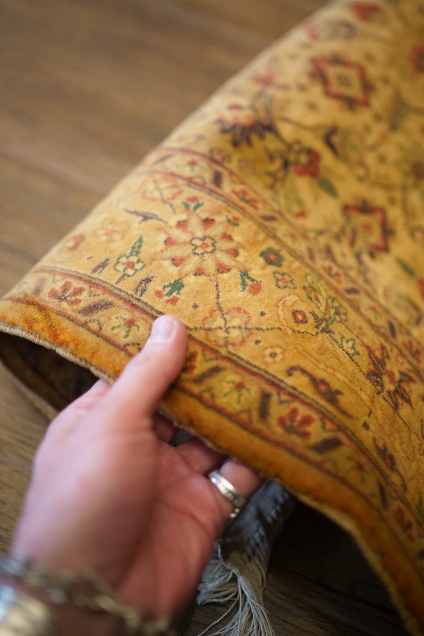 イラン中央部の都市ナインで織られた約70年前のヴィンテージラグです。花紋様が全体に散りばめられた可愛らしいデザインで、上染めにより、くすんだベージュないしキャメルやオレンジを感じさせる統一感のある渋い色合いが魅力的です。表面はサラッとしつつも、パイルの柔らかさを感じる心地よい肌触りをしています。厚みは7mm〜8mm程度。目立ったダメージや補修跡もなく状態良好です。玄関をはじめ、チェストやキャビネットの前などにもよろしいかと思います。