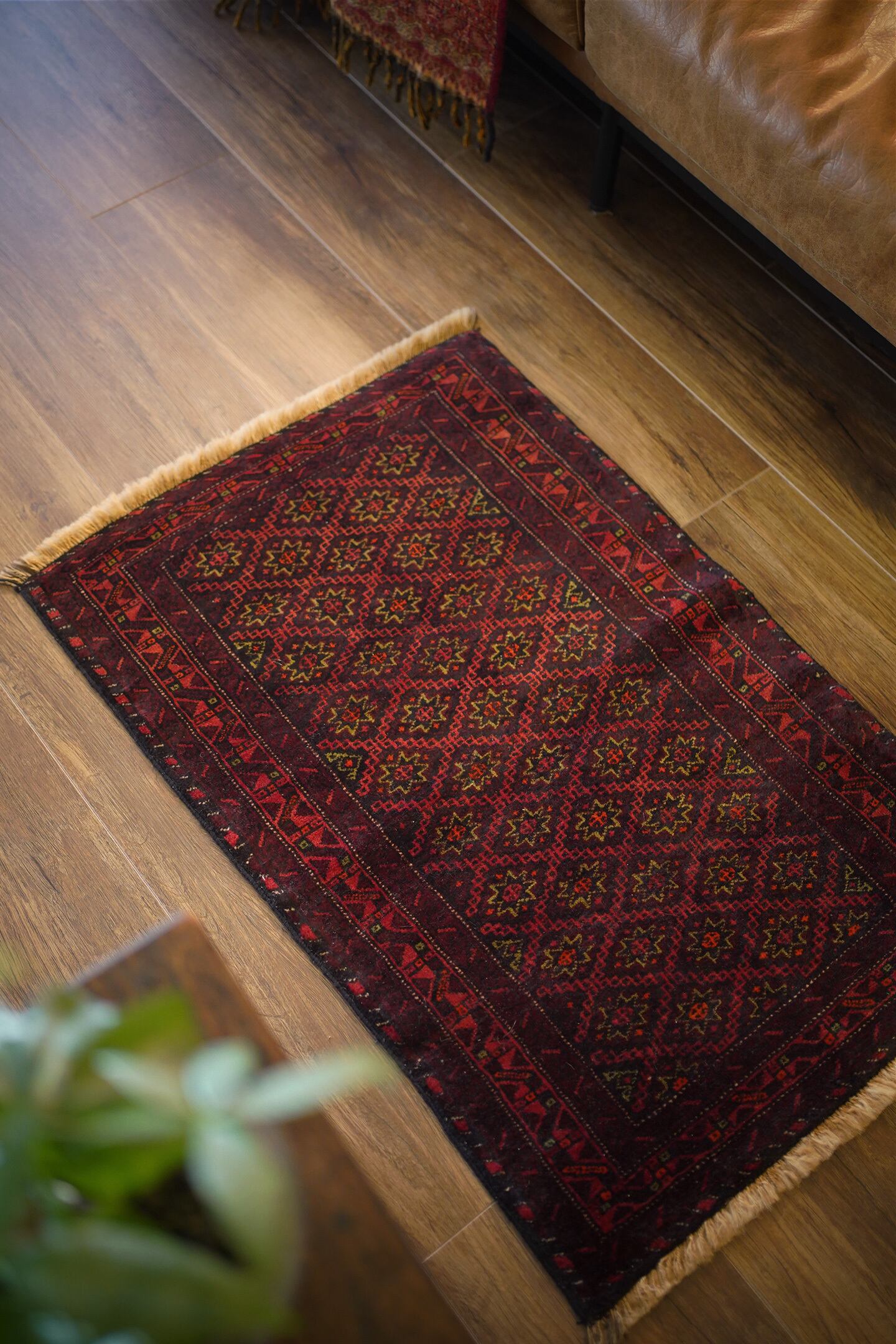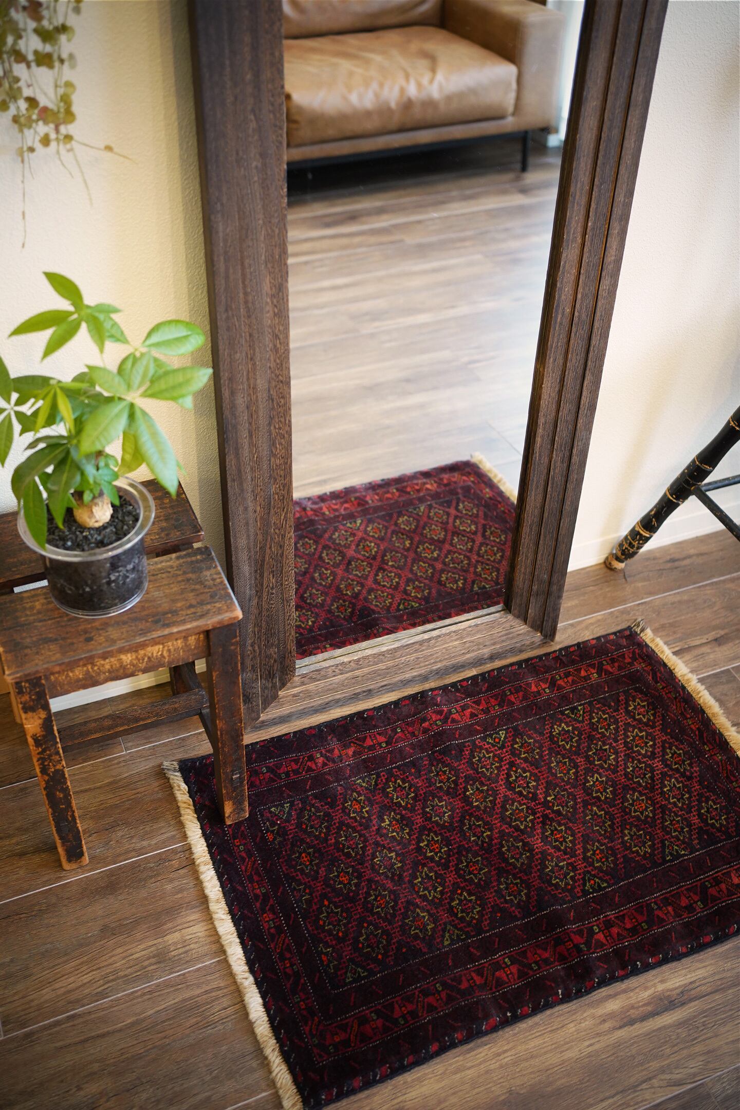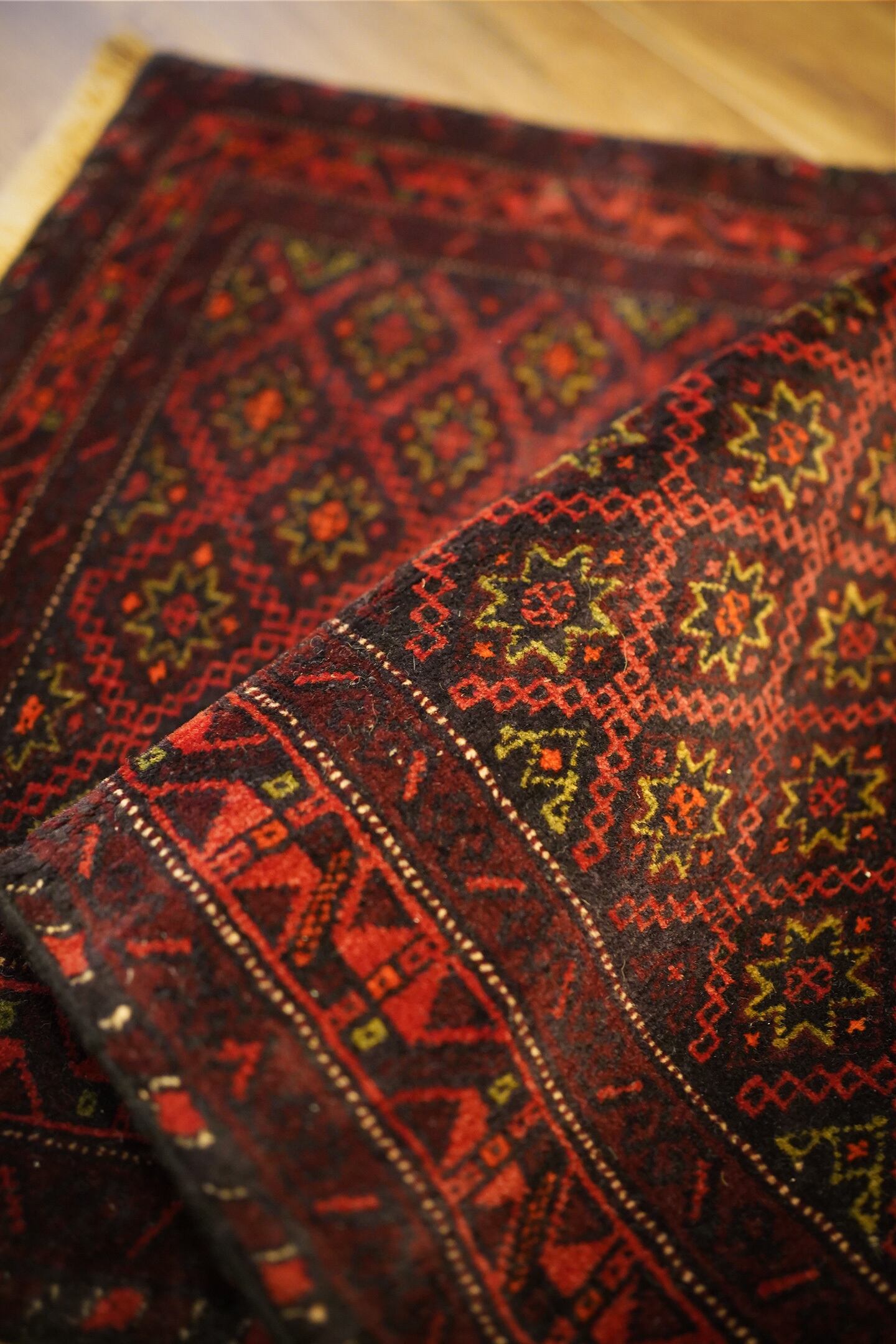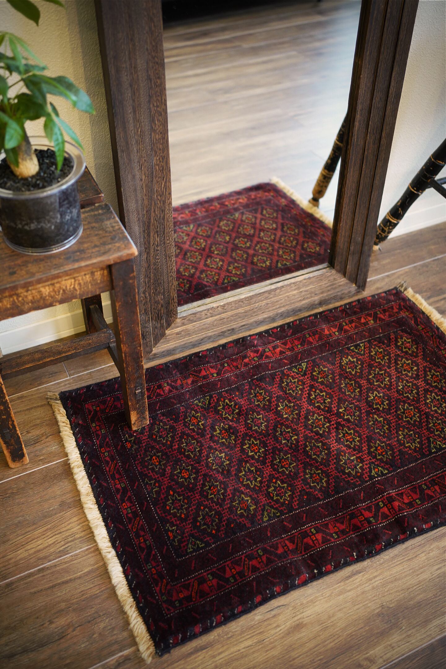 深い真紅の色味が魅力的なバルーチラグ。フィールドには"ユルドゥズ"と呼ばれる幸運の象徴である八角星が一面に織り込まれています。表面のパイルはソフトウールで柔らかく、ふわもちっとした滑らかな肌触りで、大変気持ちの良い質感です。厚みは5mm程度。大変良好なコンディション。玄関や全身鏡の前、ちょっとしたスペースにどうぞ♪
